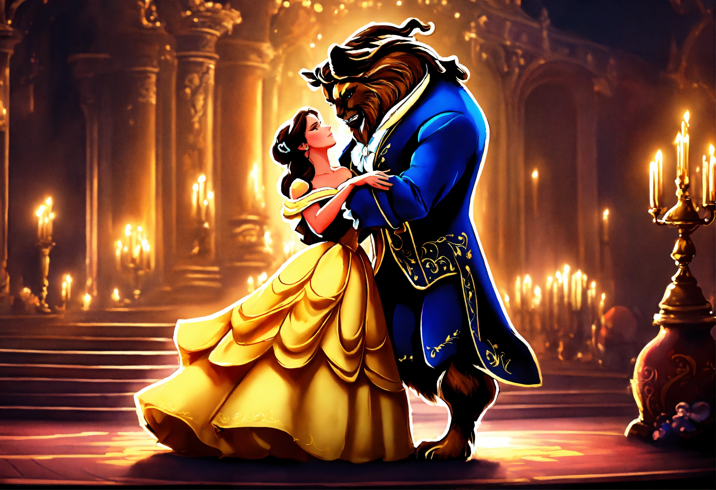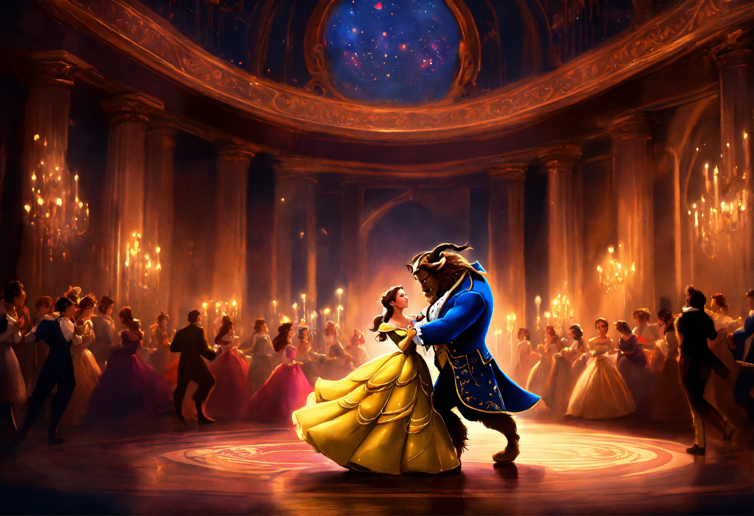 Epic beautiful shot of disneys beauty and the beast dancing, a dark background, ultra cozy, luminous, digital painting, little photorealistic, sharp focus, ultra cozy and inviting, wish to be there. very detailed, arty, should rank high on youtube for a dream trip.