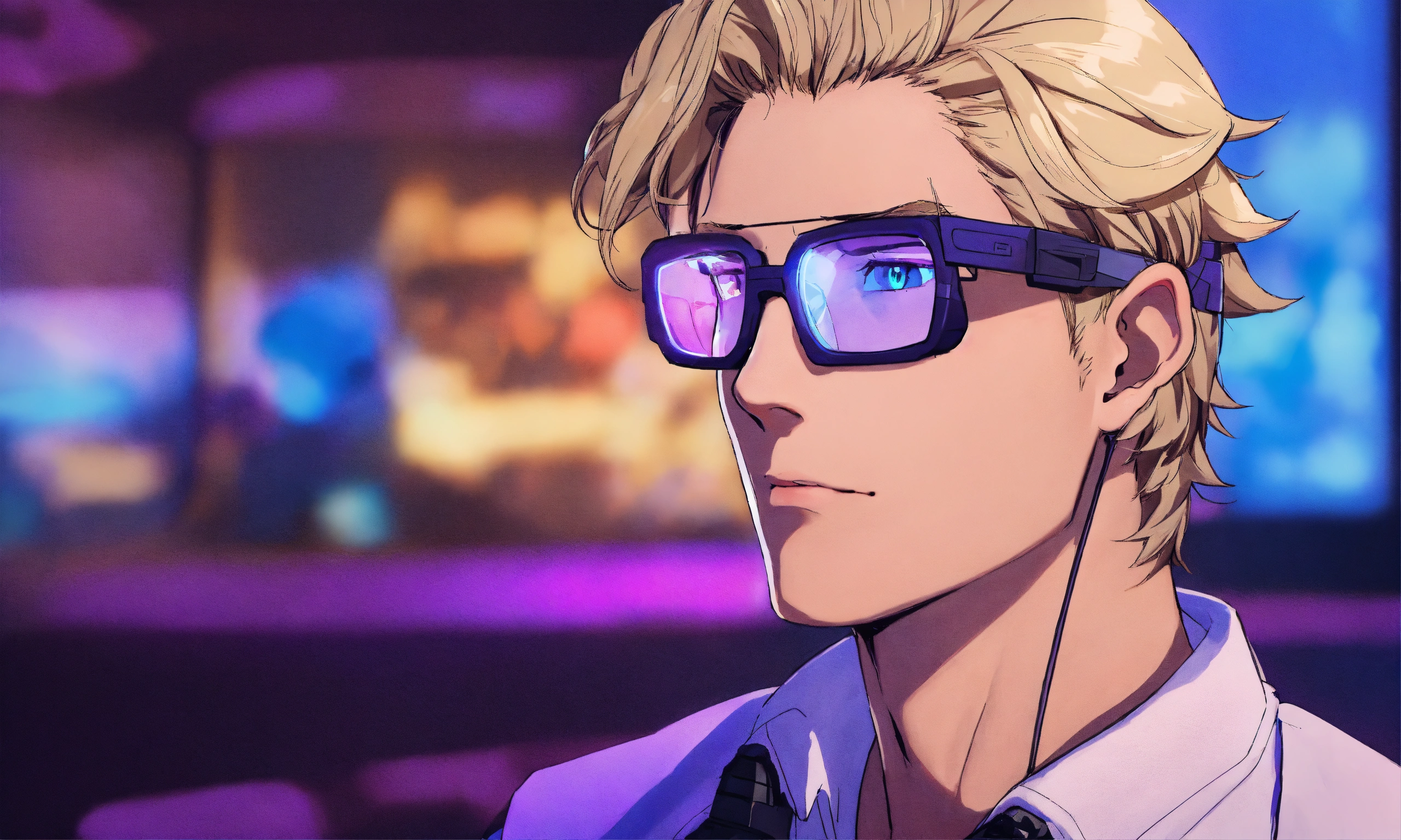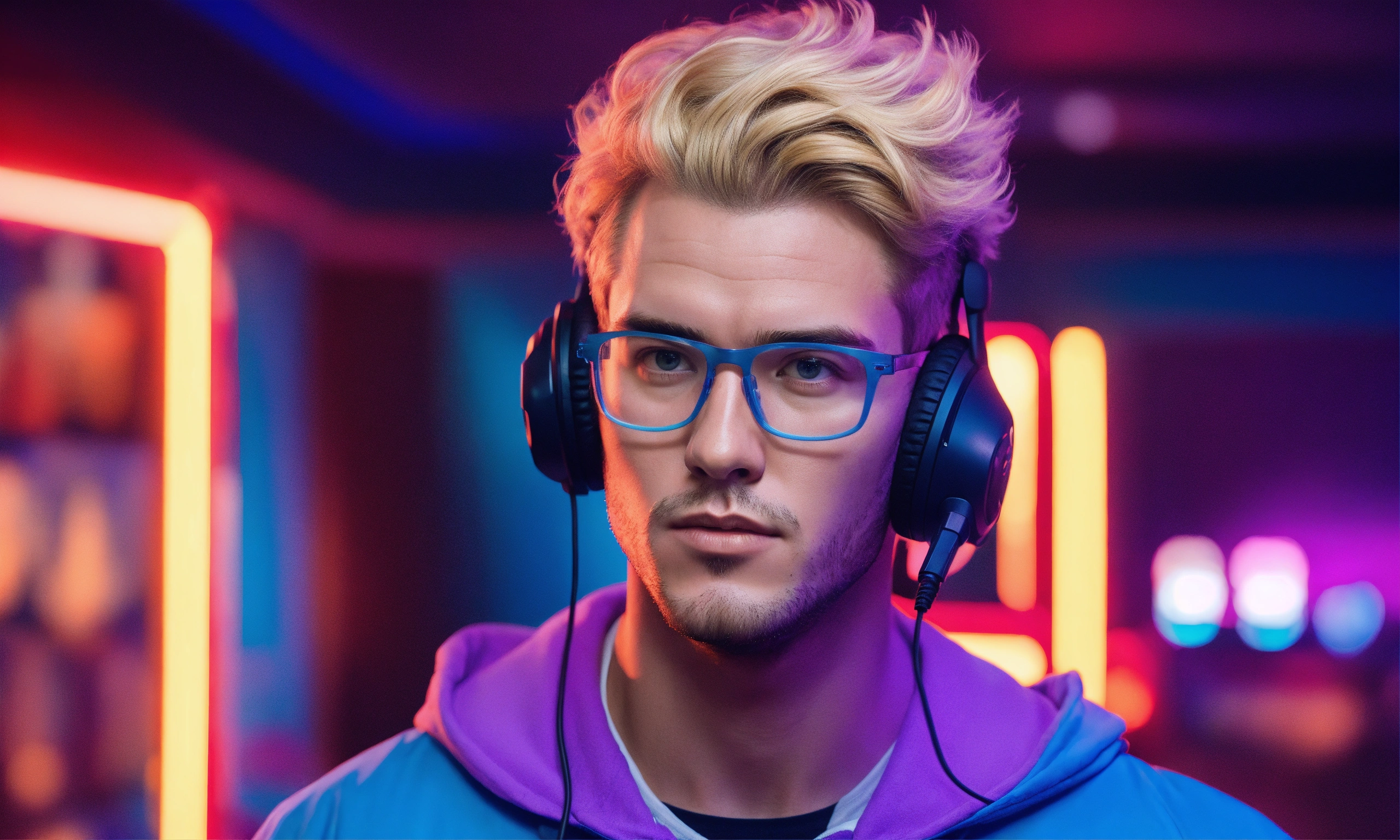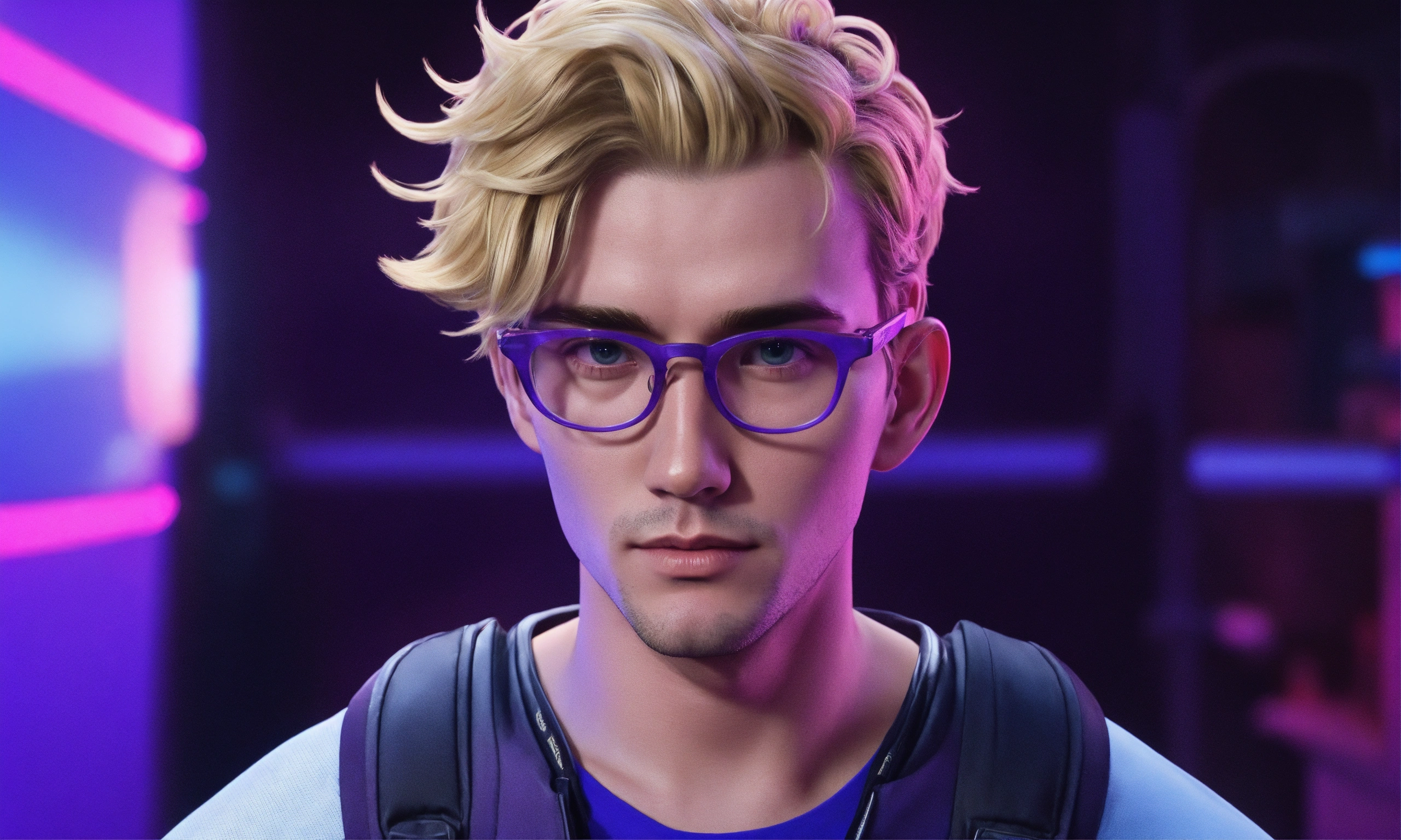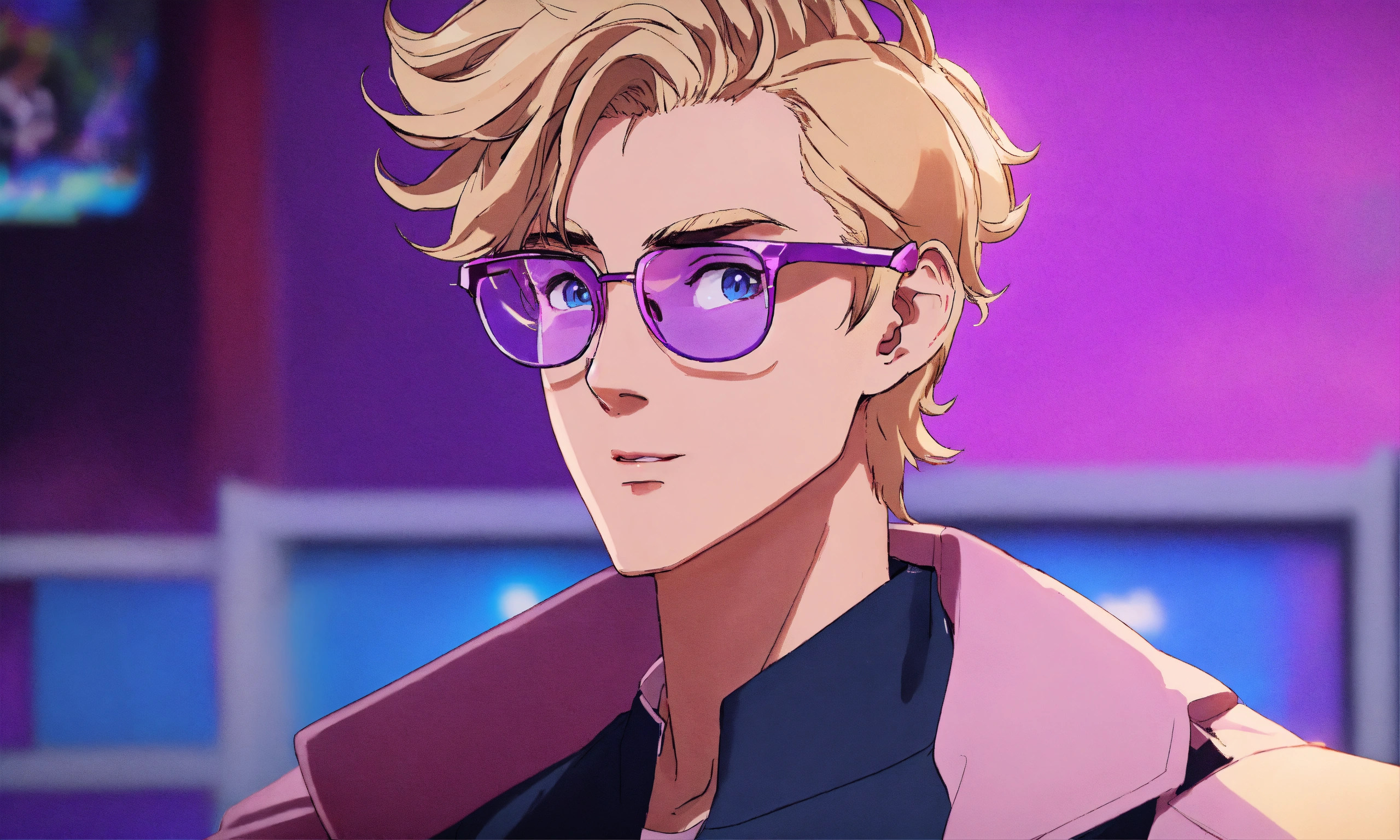 A male gaming streamer, blonde hair, clean shaved, short wavy hair, wearing blue light glasses, purple background, from the shoulders up, receding hairline, hair curled up, long face, masculine