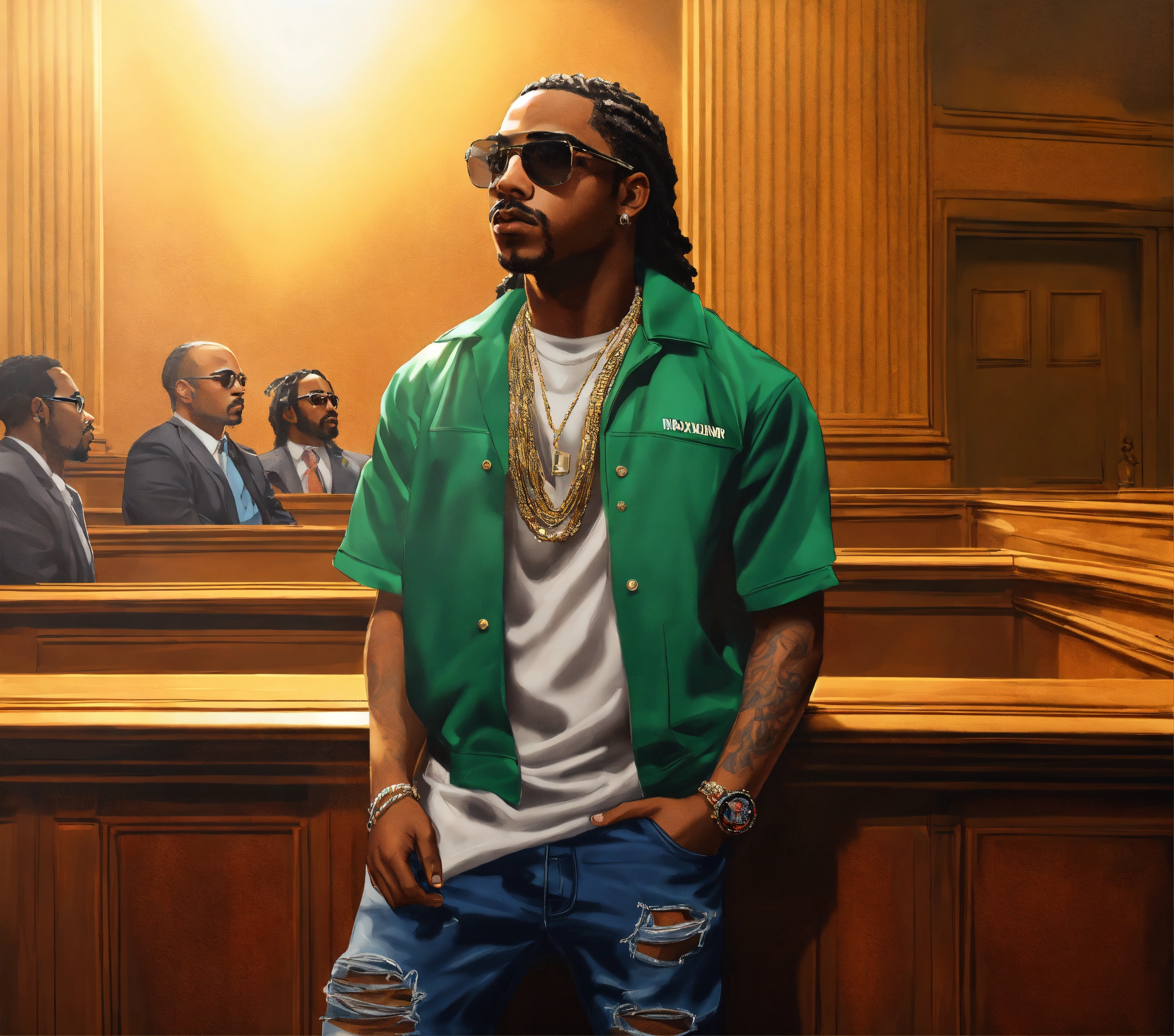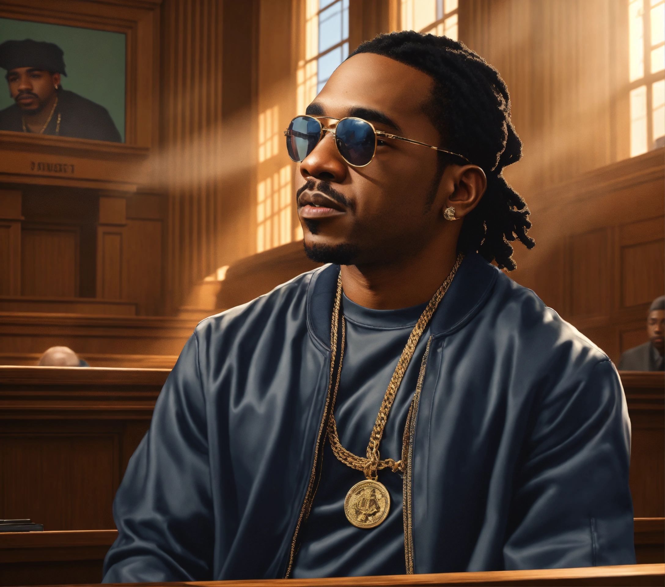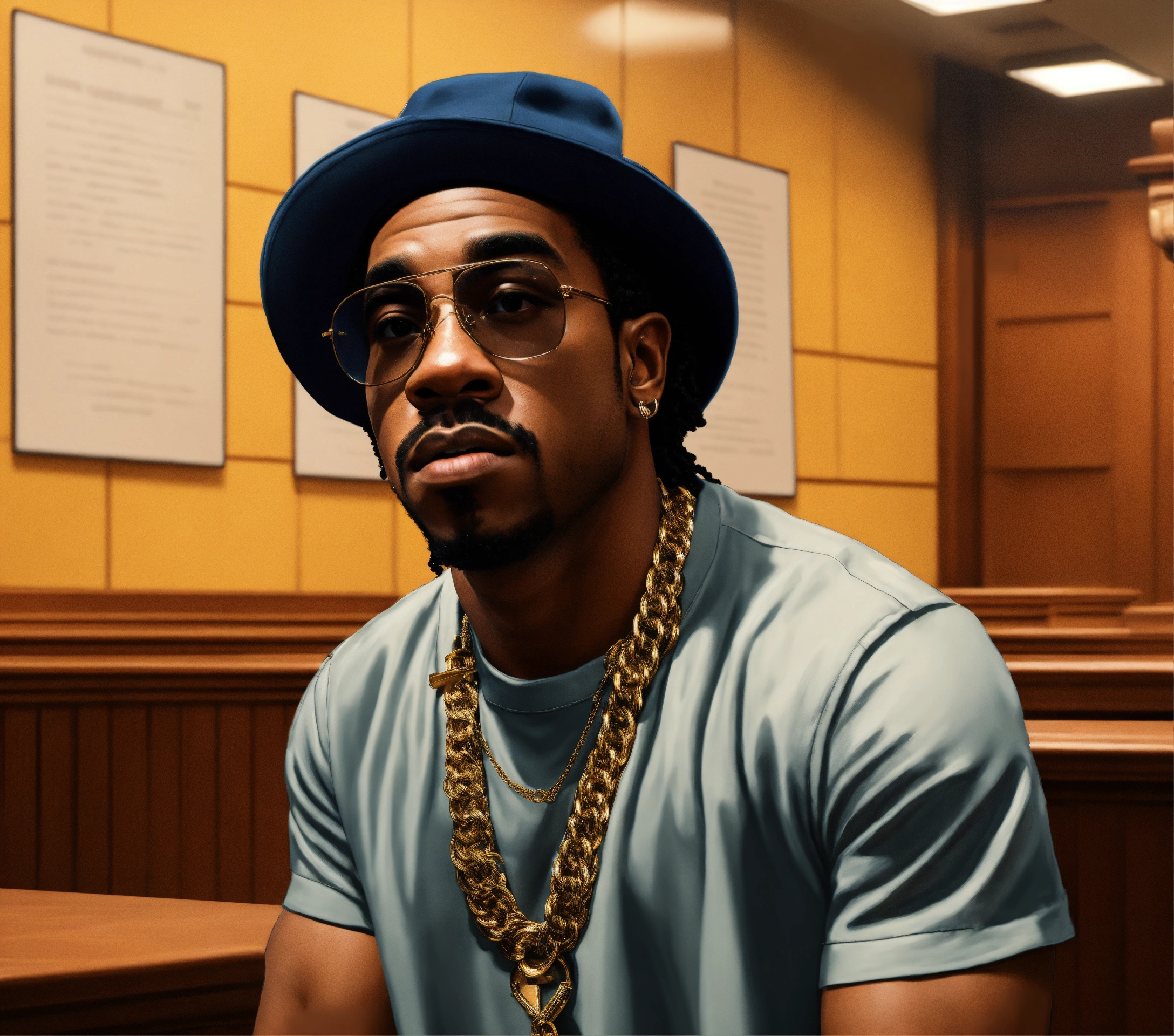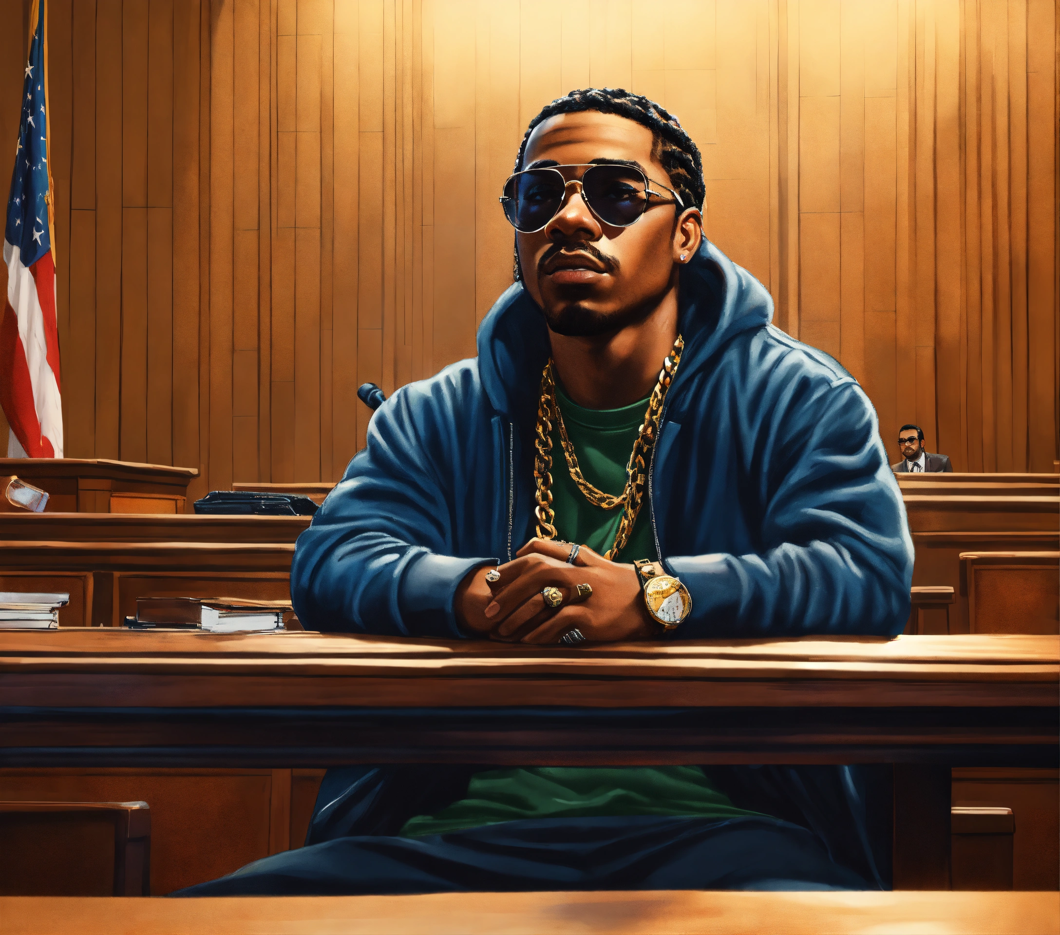 Medium side angle shot pop art, hyperrealist full body portrait of black rapper " max b" in in a courtroom in harlem, new york, on a sunny day, fantasy art, photo realistic, dynamic lighting, artstation, poster, volumetric lighting, very detailed faces, 4 k, award winning