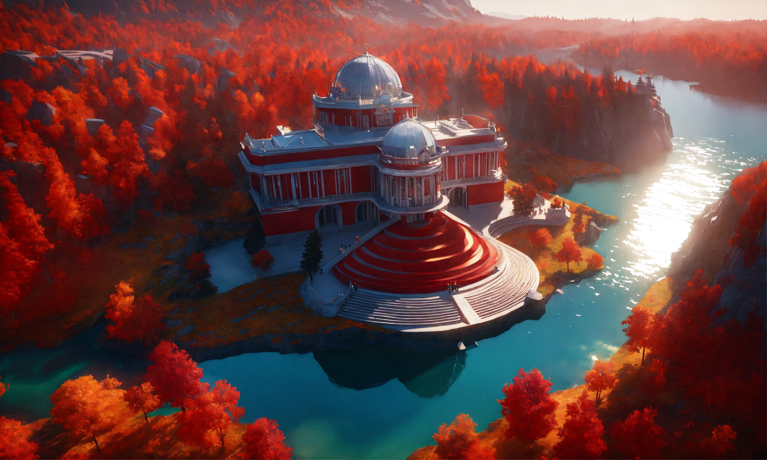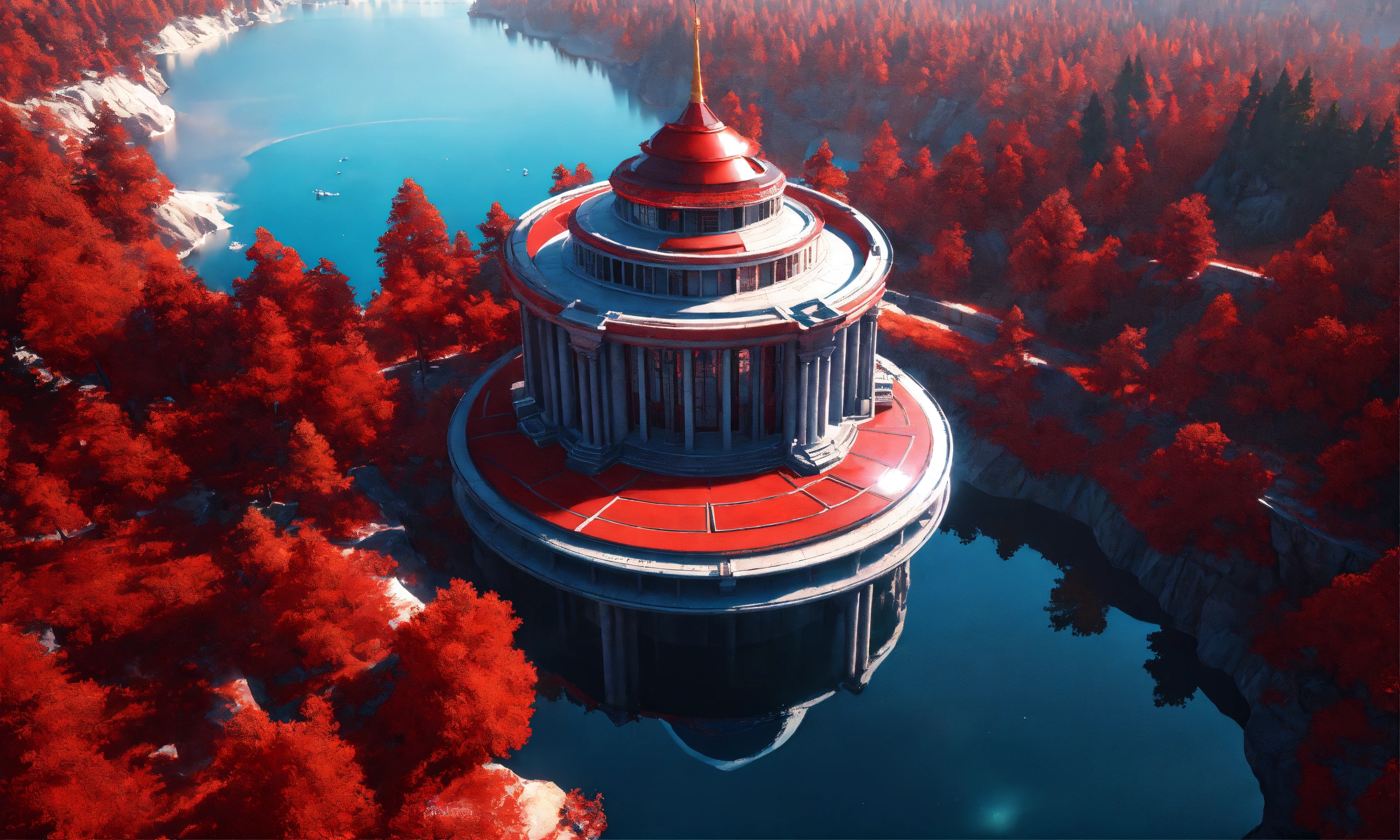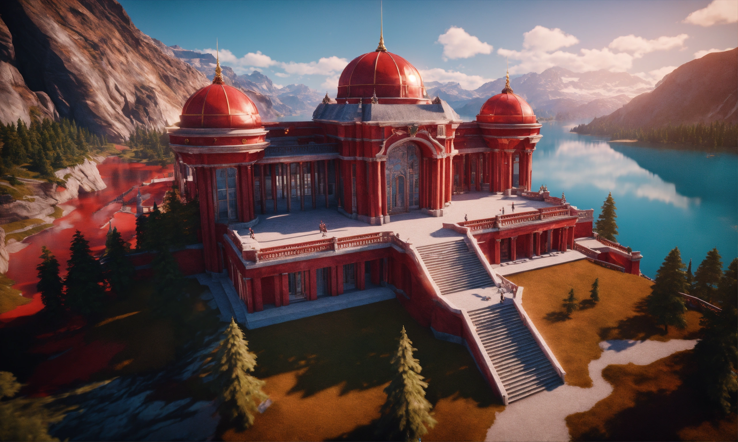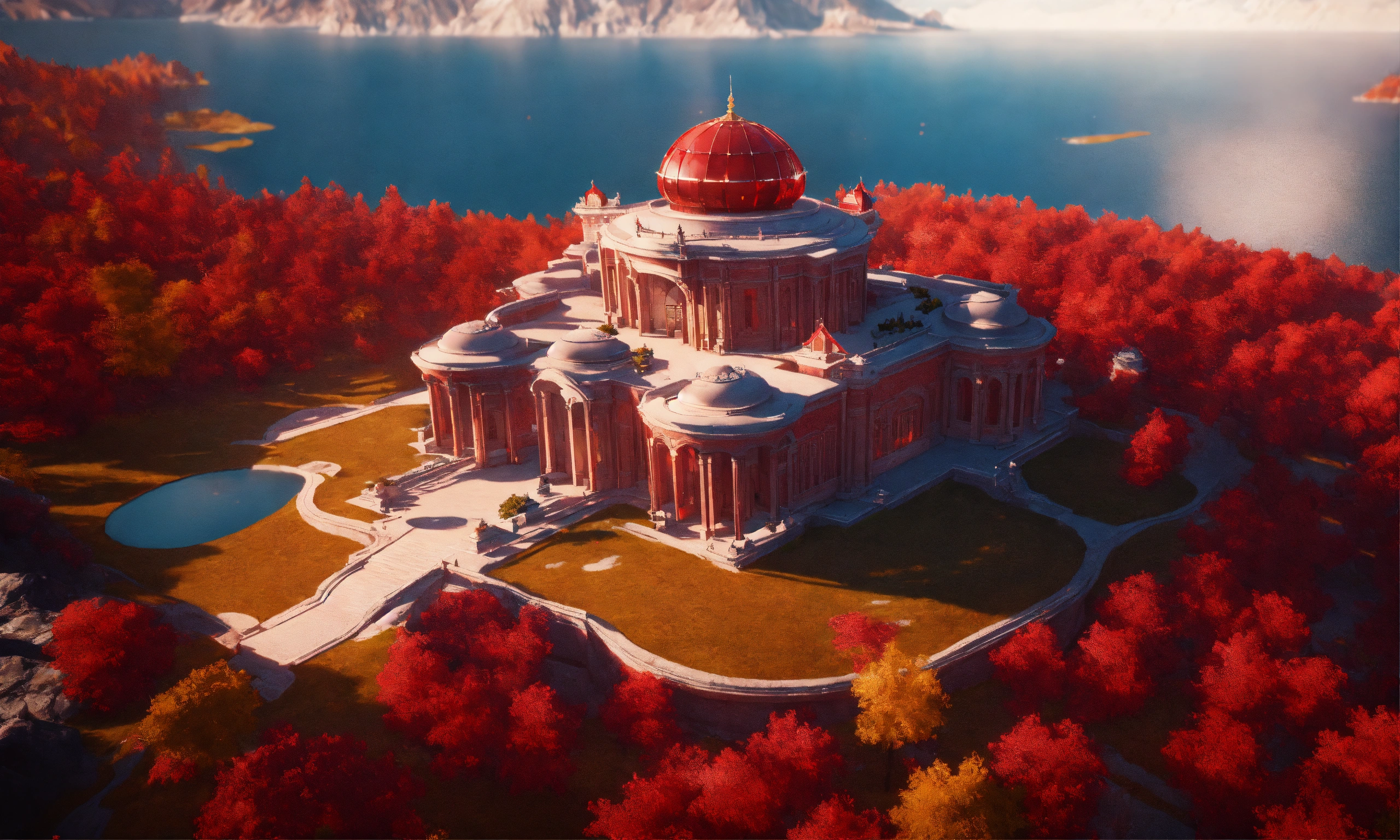 Overhead view of a red marble futuristic royal palace on a cliff overlooking a lake in canada, british architecture, 8k, unreal engine