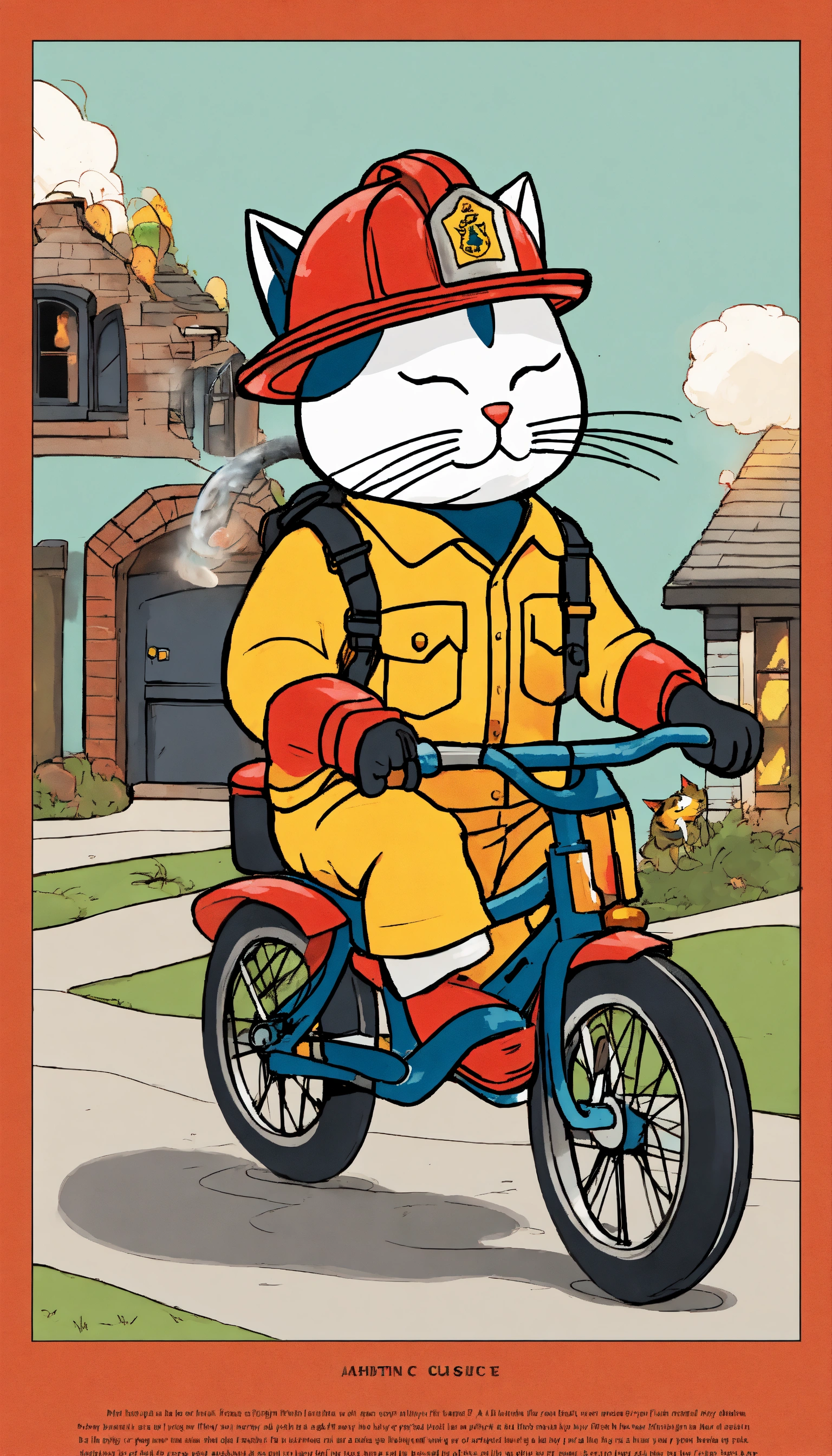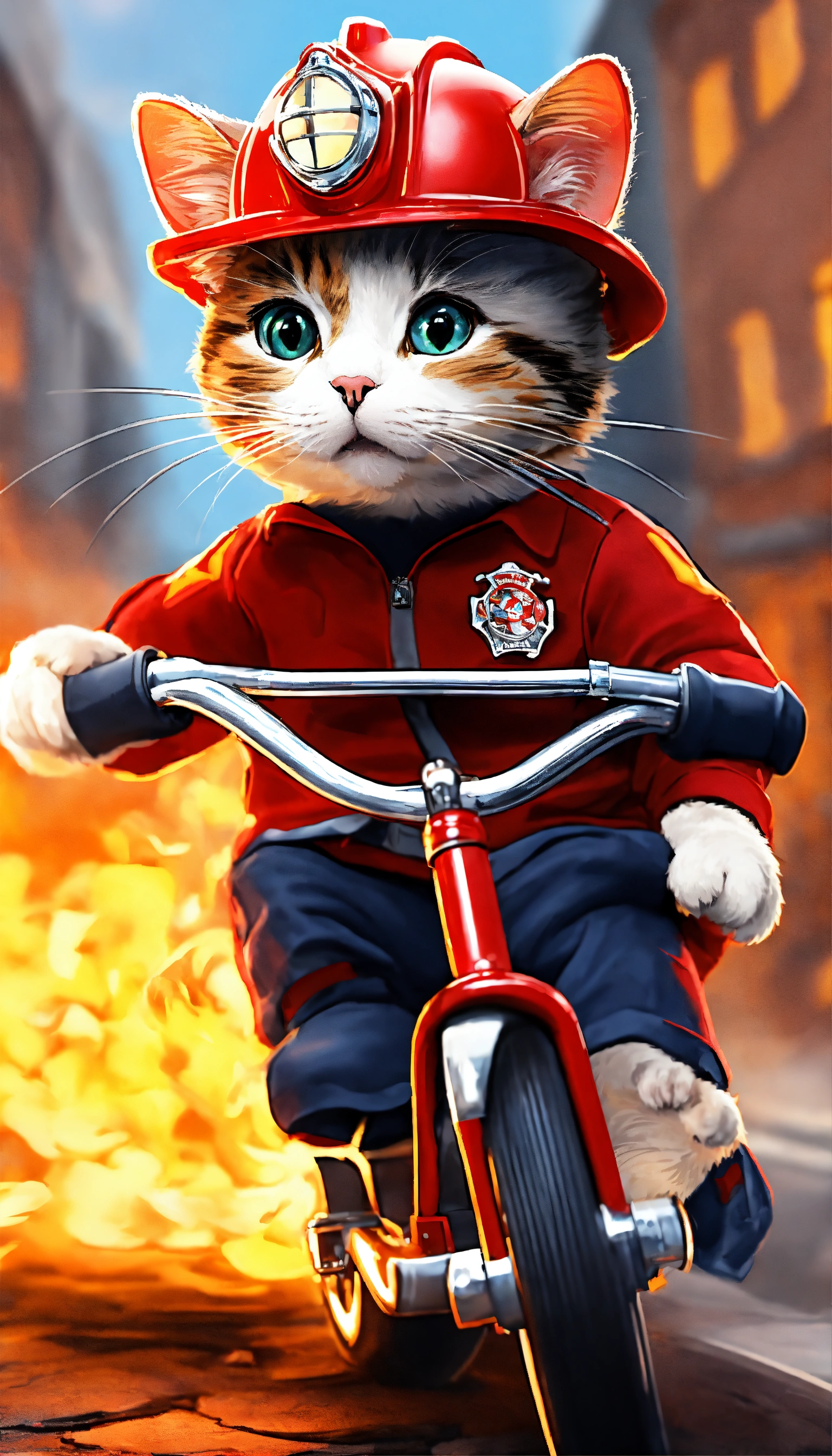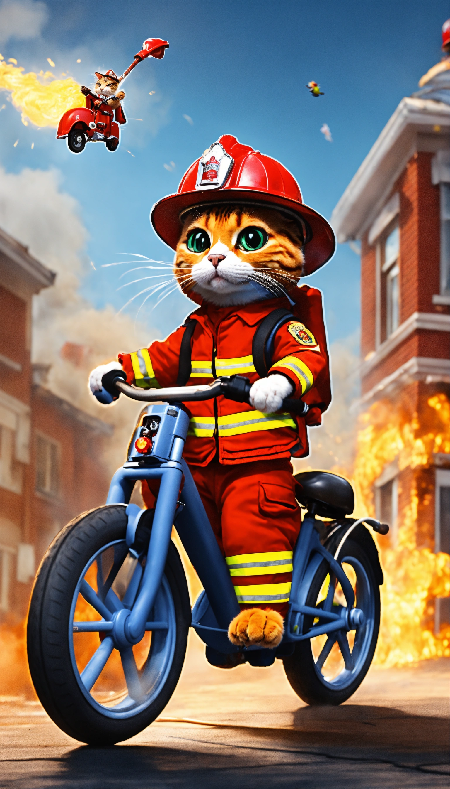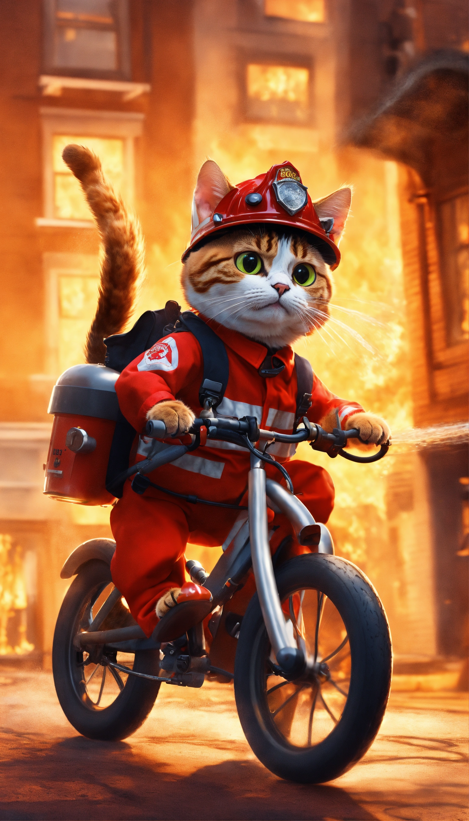 Design an image of a cat riding a bike as a firefighter, dressed in a fireman's uniform with a helmet and a hose, rushing to save a toy mouse from 'danger.
