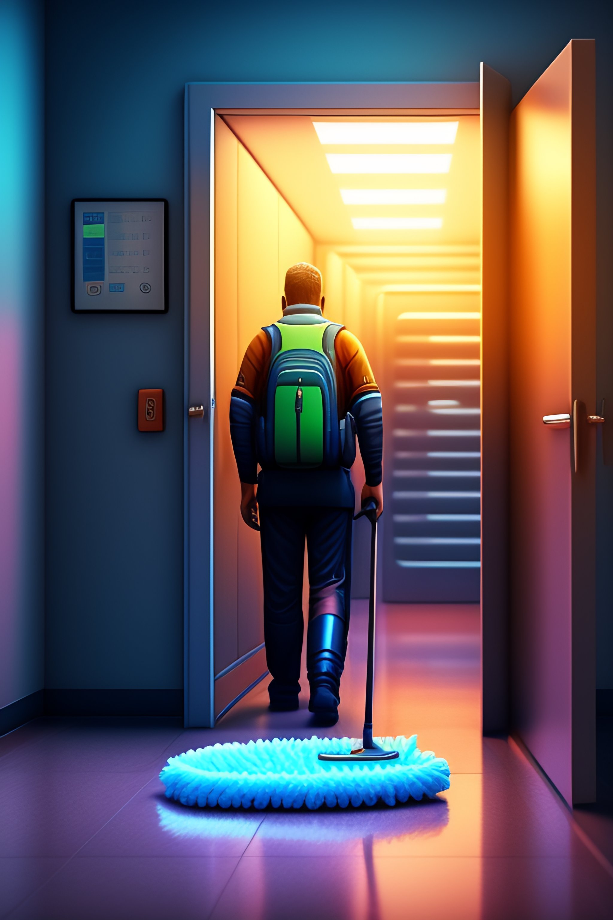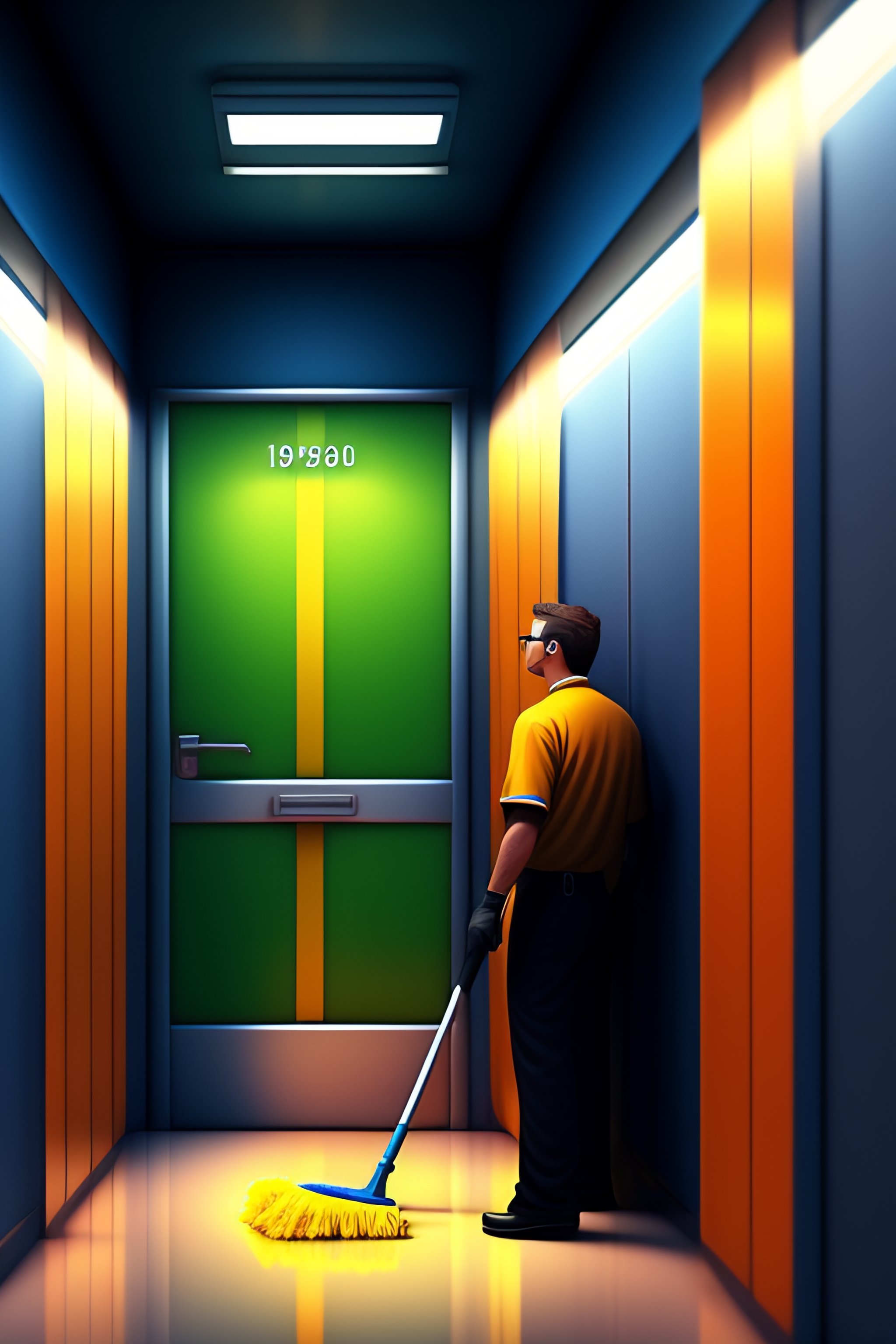 Human male janitor asleep in closet 1970 color subnautica style office building janitor sleeping with mop boy age 45