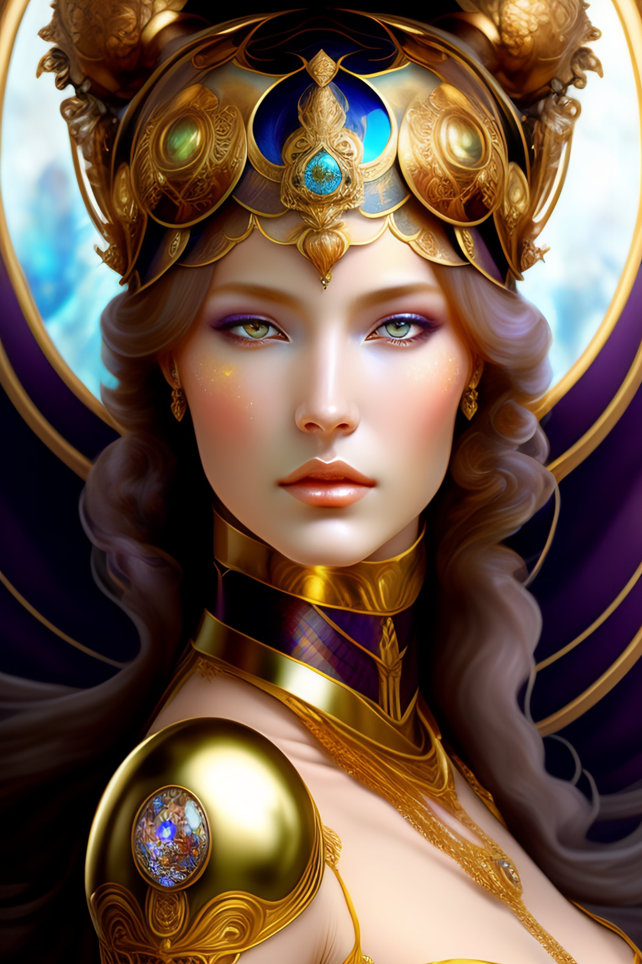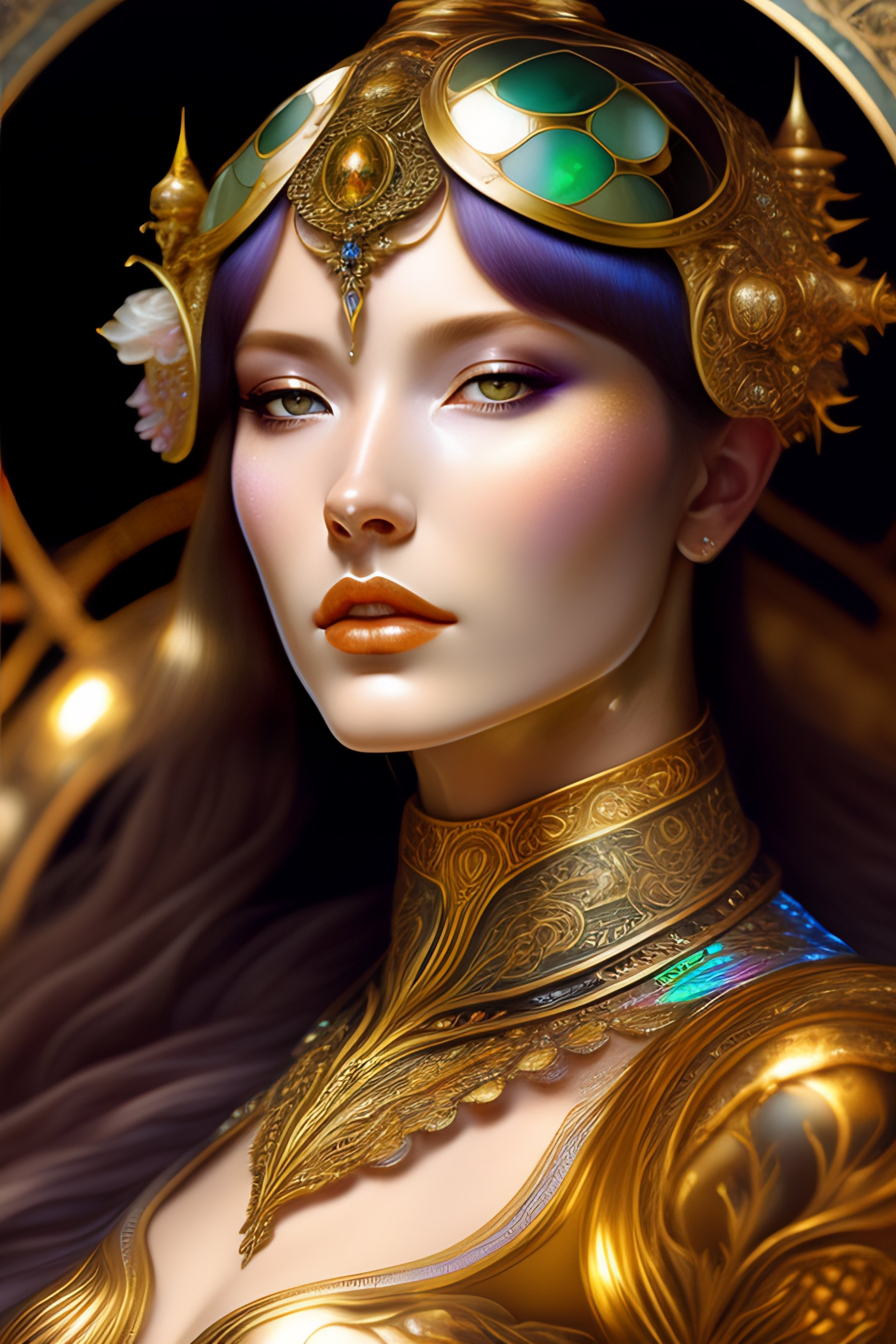 Realistic detailed face portrait of a beautiful futuristic italian renaissance queen in opulent alien glass armor by alphonse mucha, ayami kojima, amano, greg hildebrandt, and mark brooks, female, feminine, art nouveau, ornate italian renaissance cyberpunk, iridescent venetian blown glass, neo - gothic, gothic, character concept design