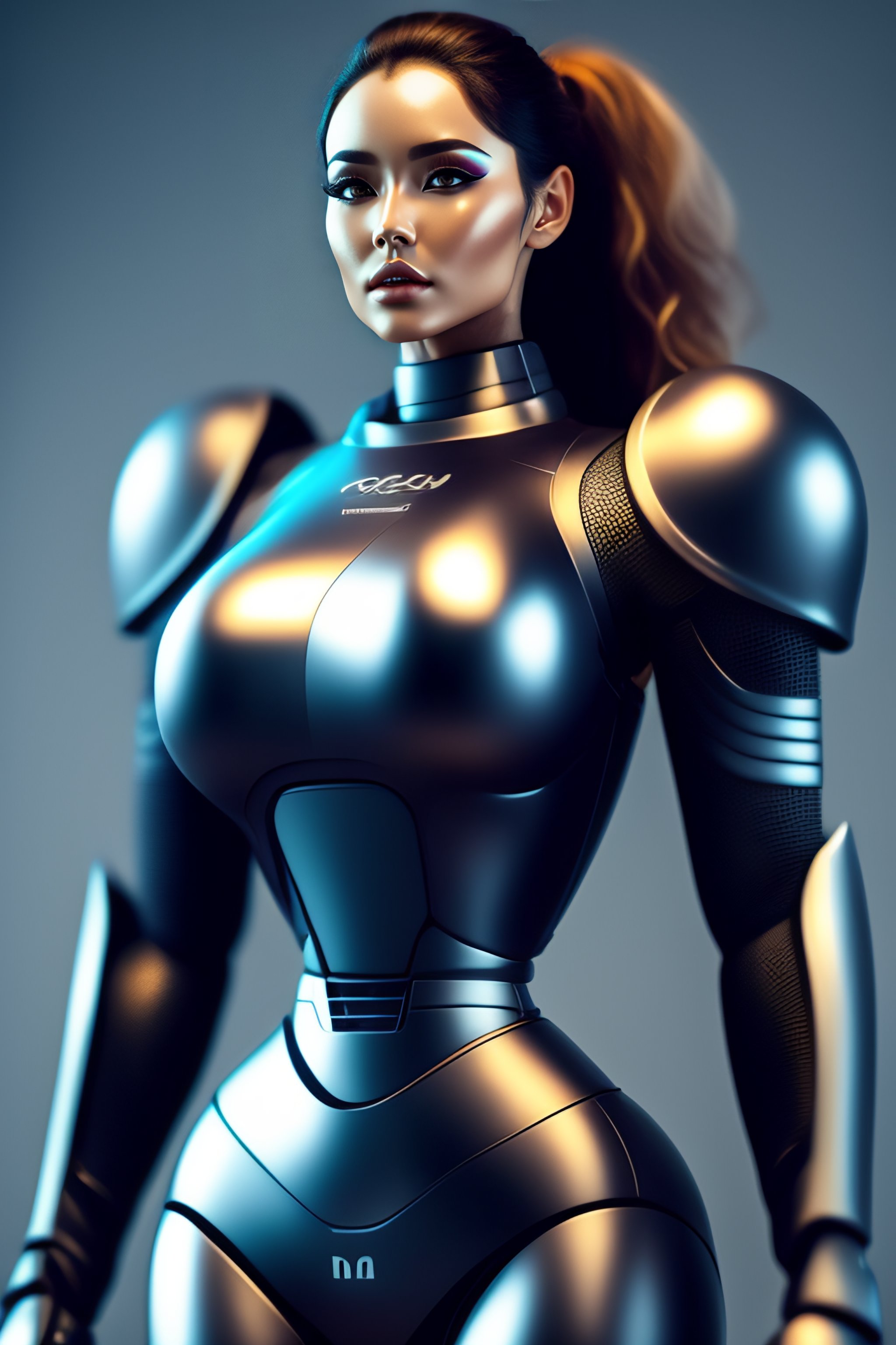 2500 future mom humanoid robot, athletic body, fully clothed matte metal body, detailed tight metal abs, full body product photography, double round, tiny waist, pretty face big lips, huge wide mechanical hips, concept art