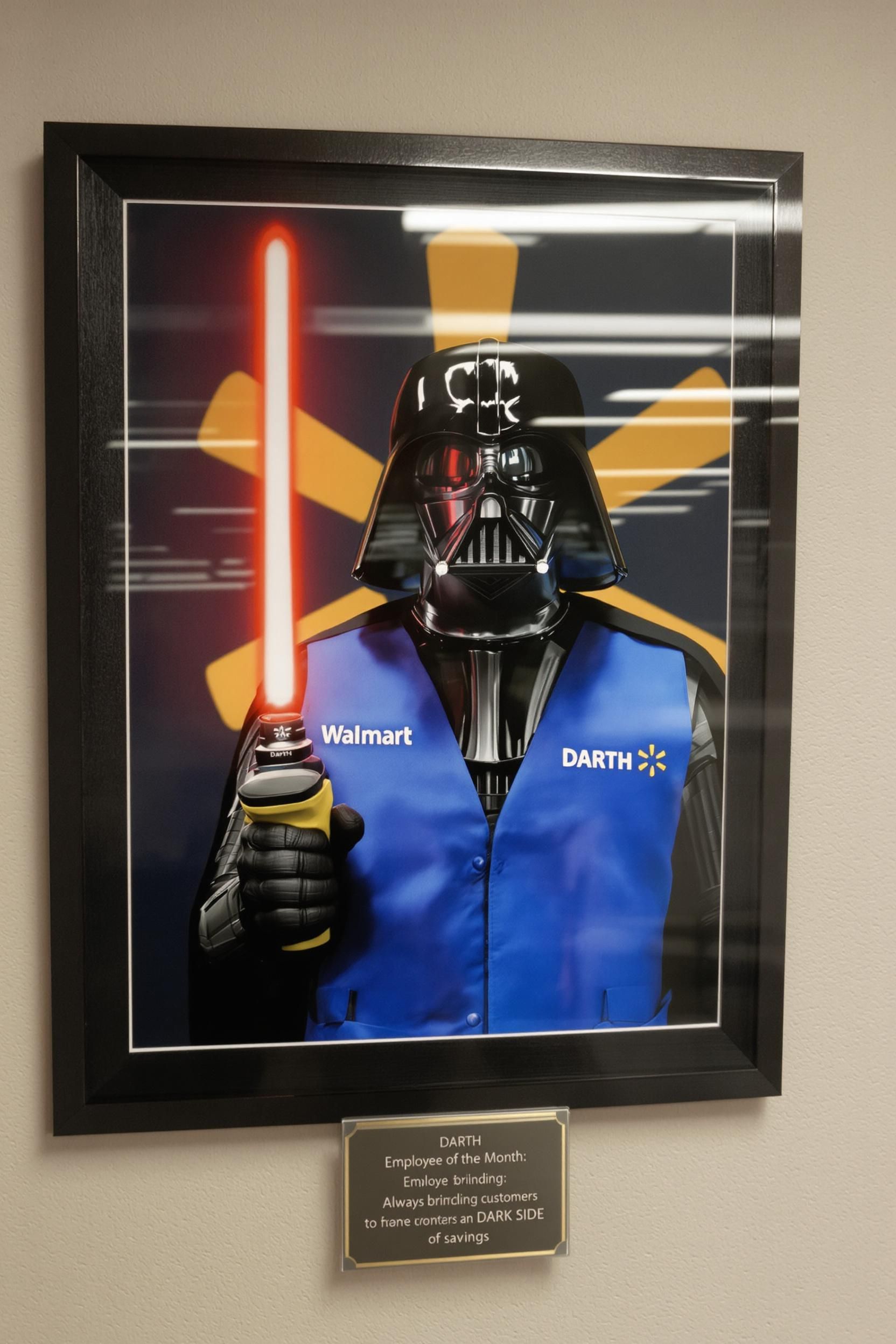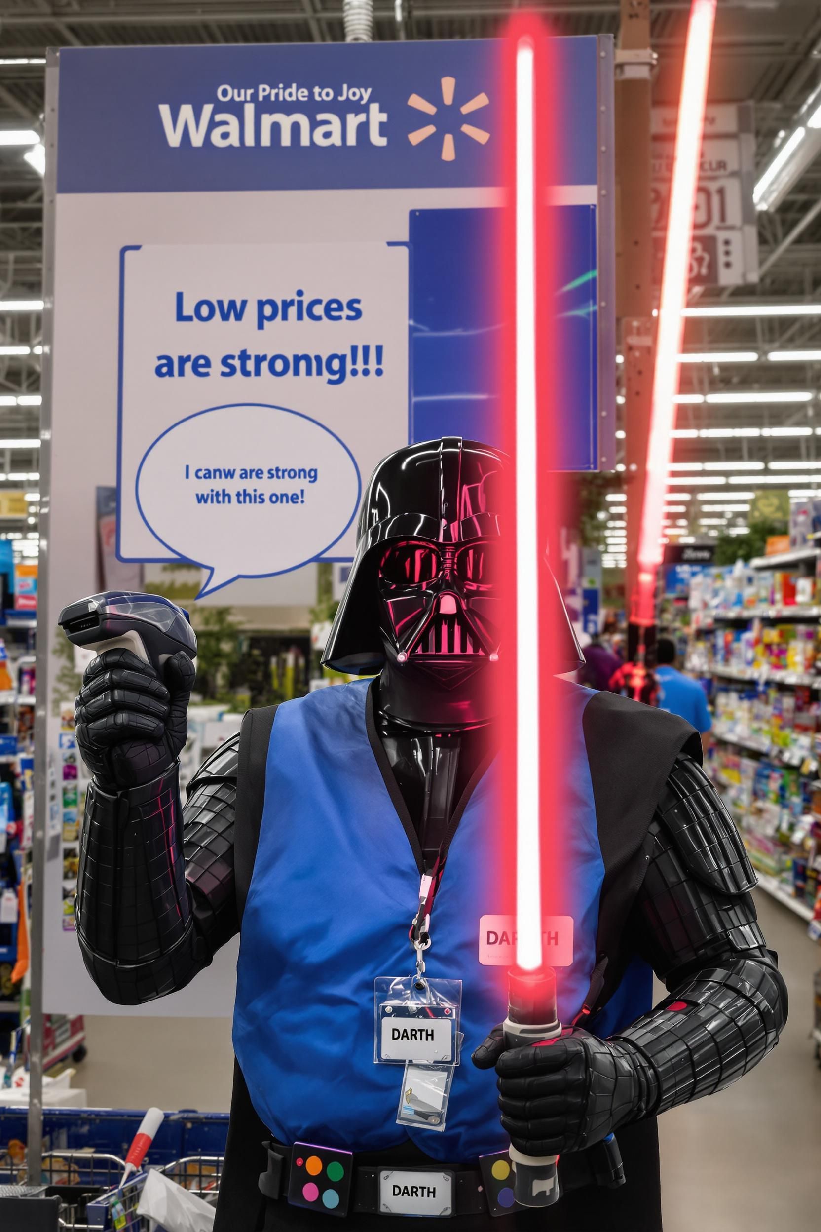 Walmart employee of the month photo featuring darth vader, name tag slightly crooked, holding a price scanner like a lightsaber.