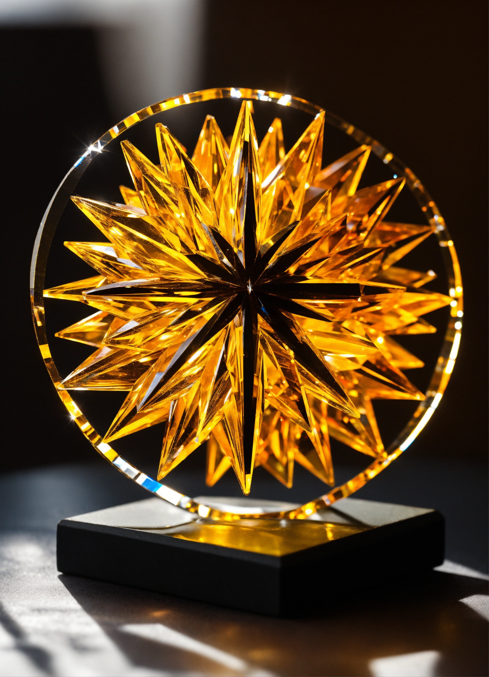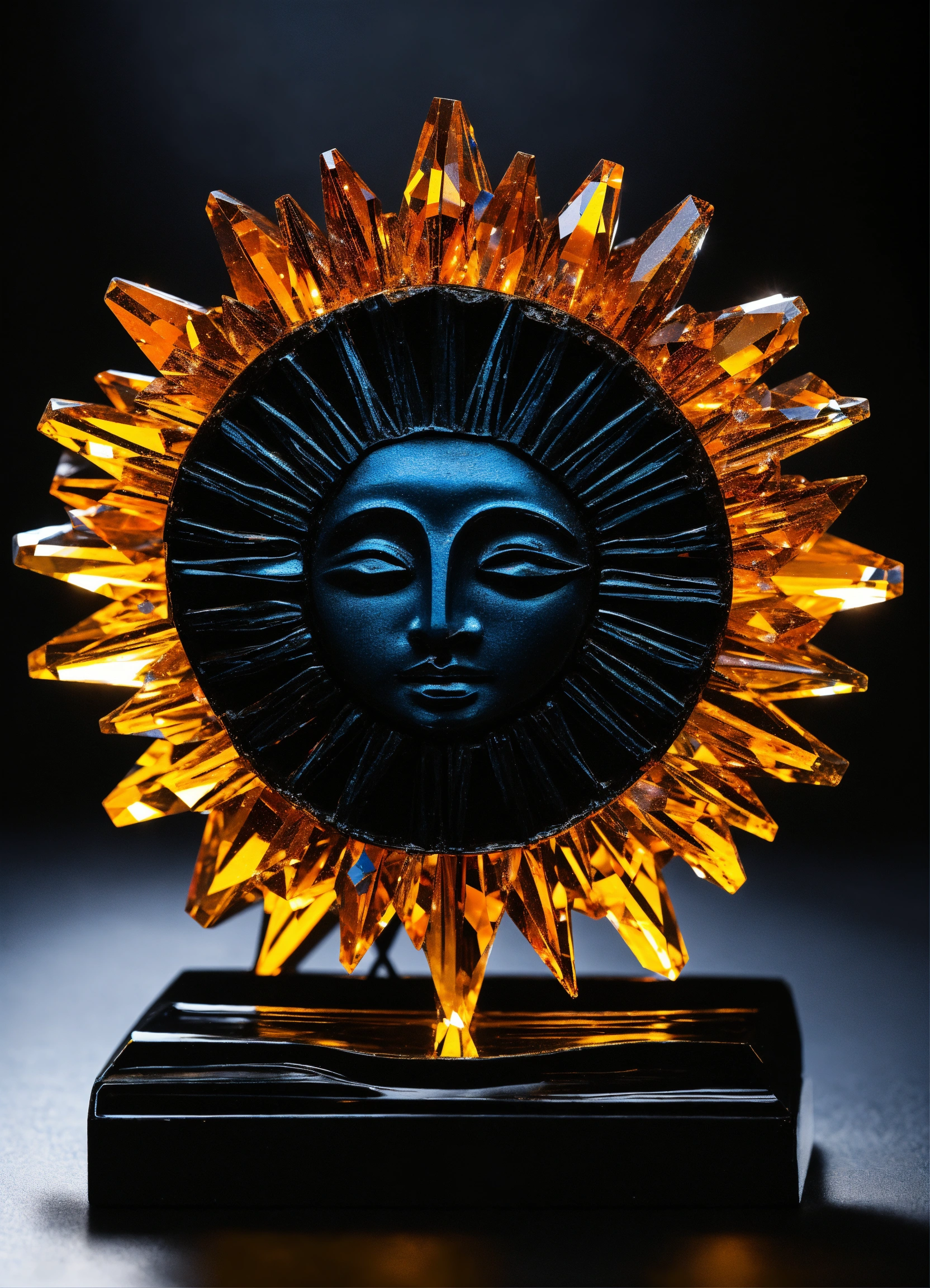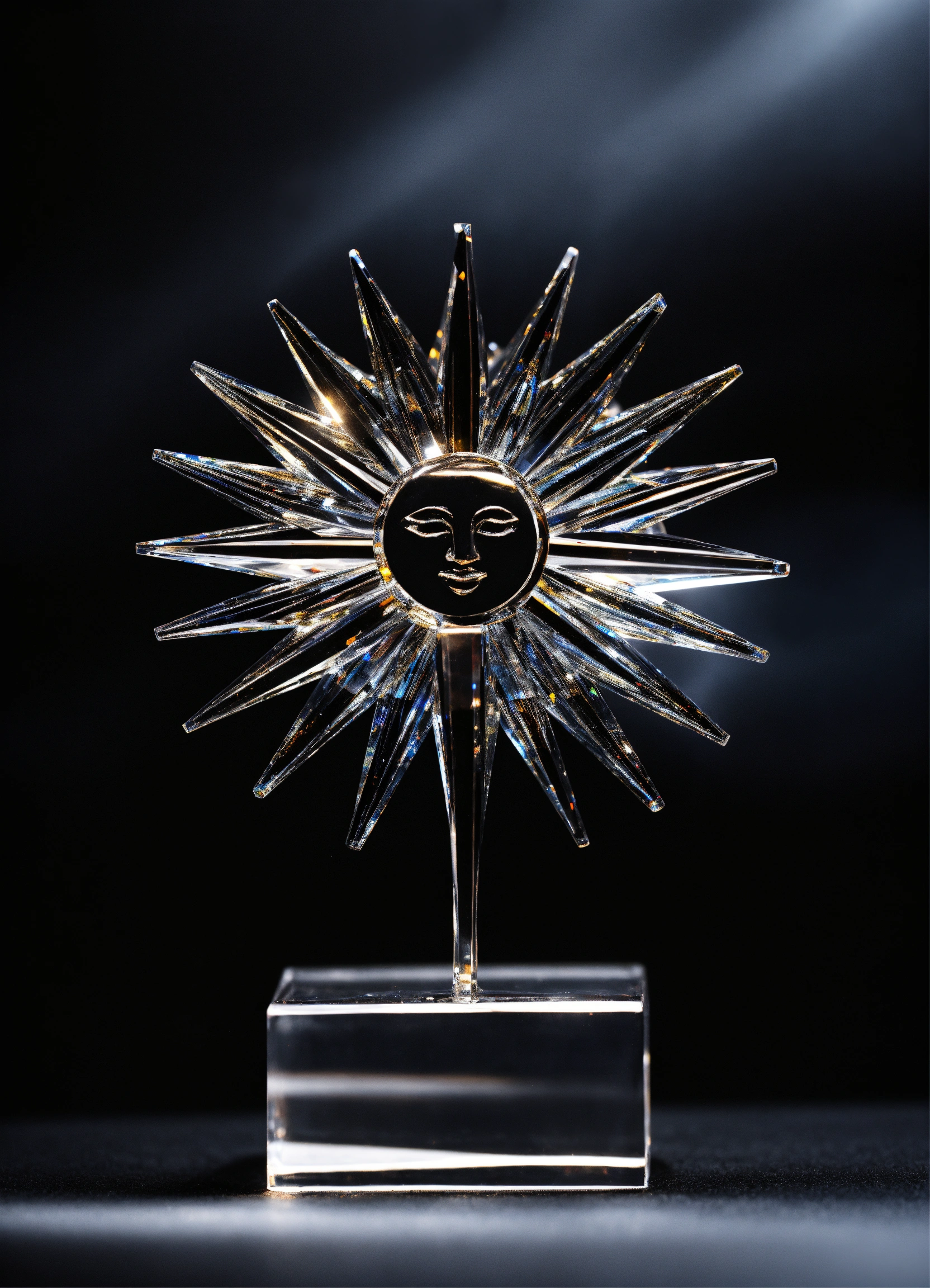 Crystal figurine sun with rays on black background minimalist