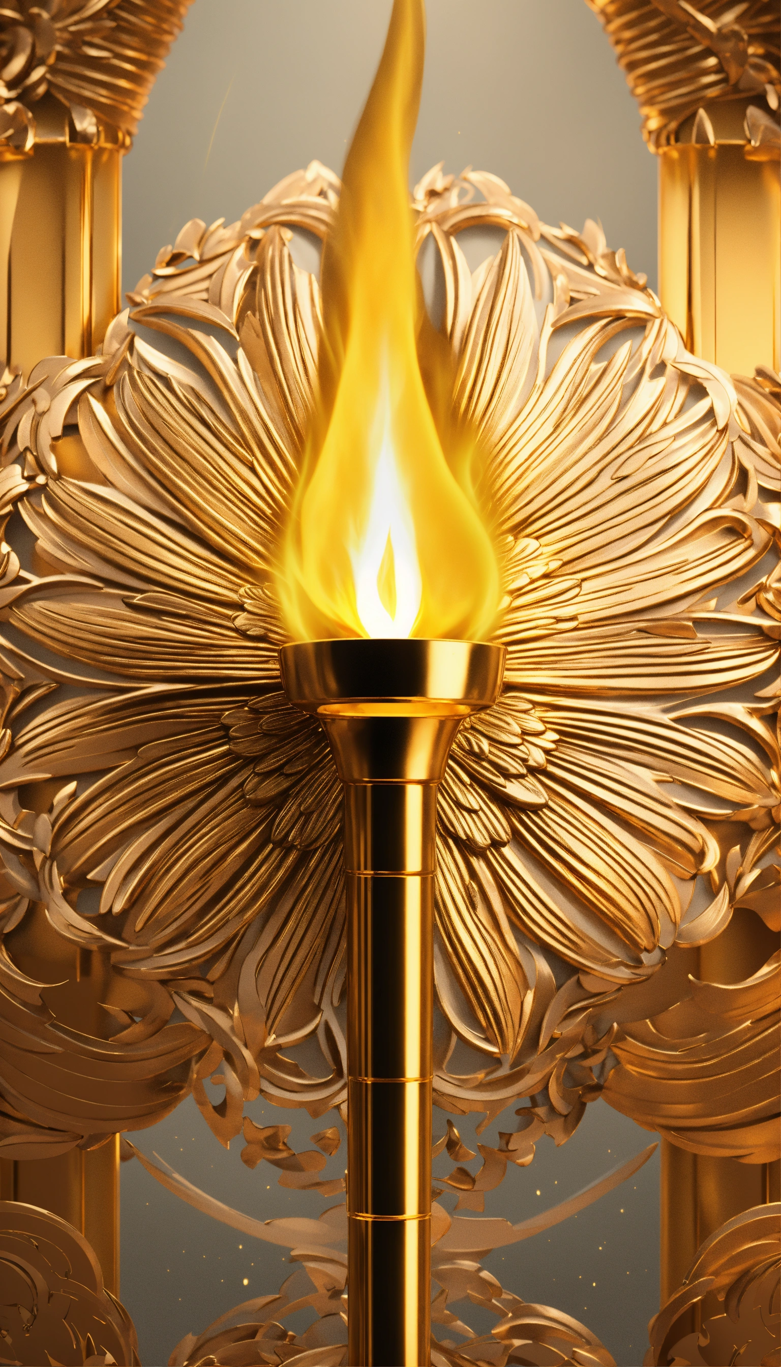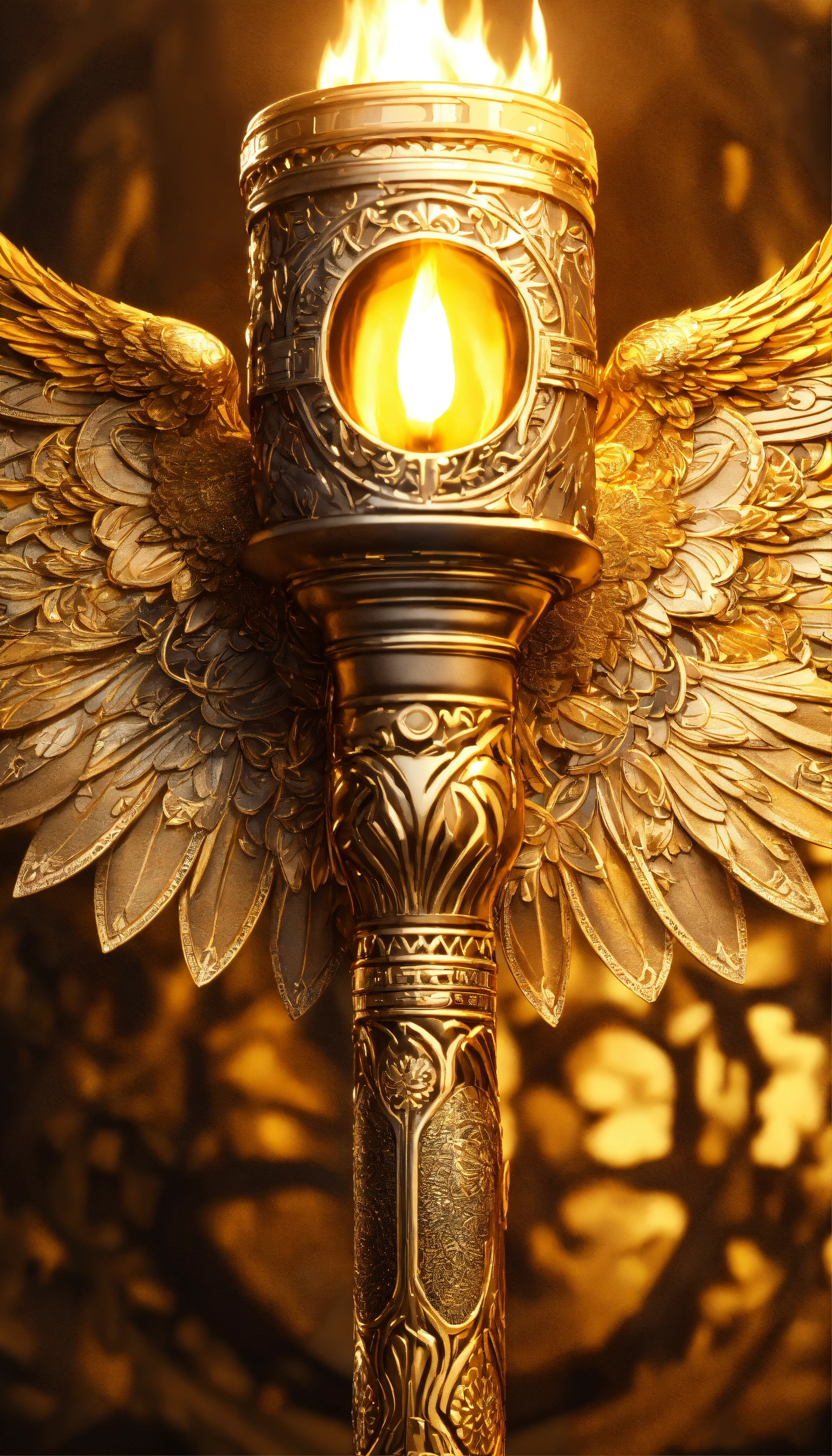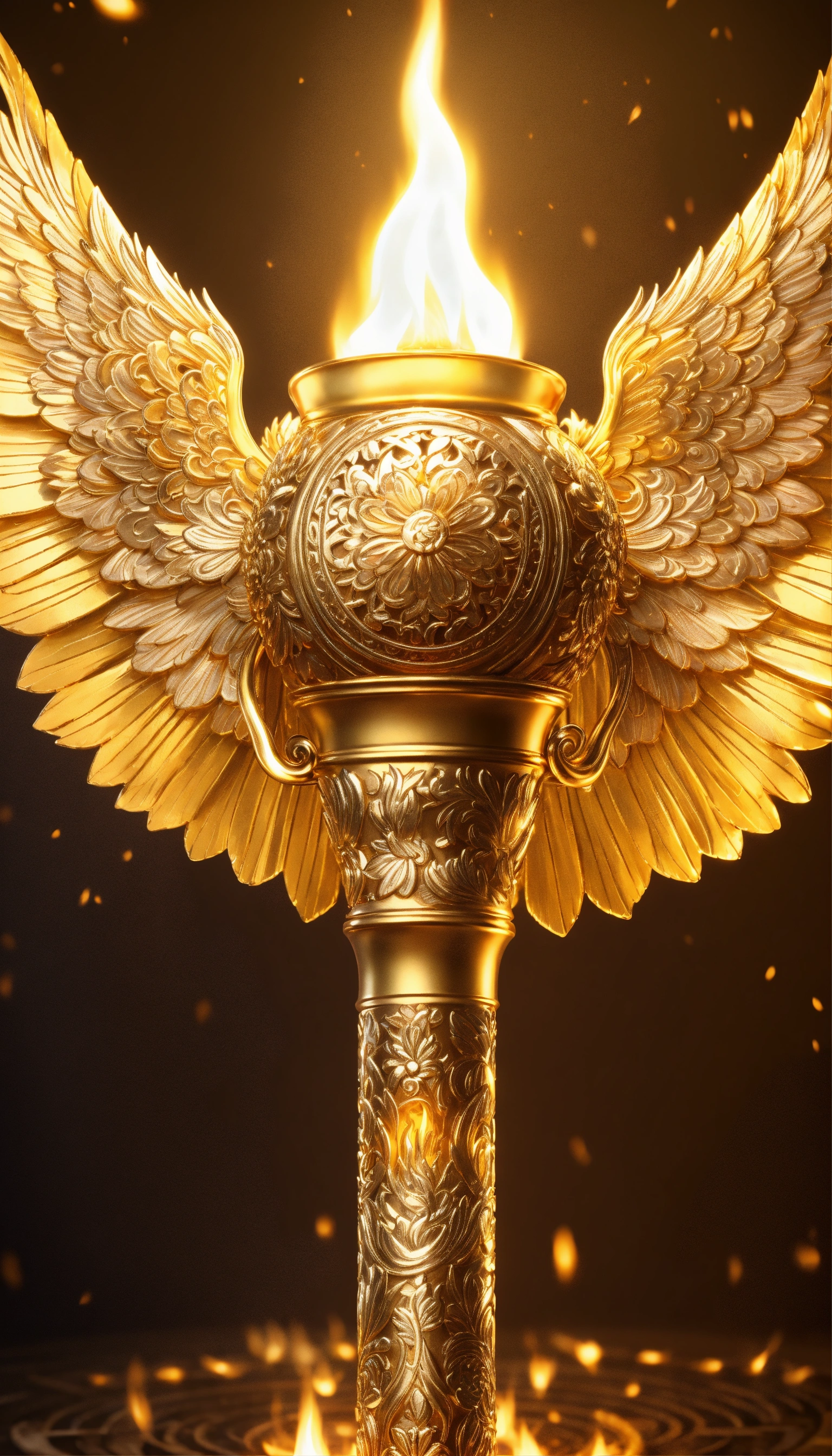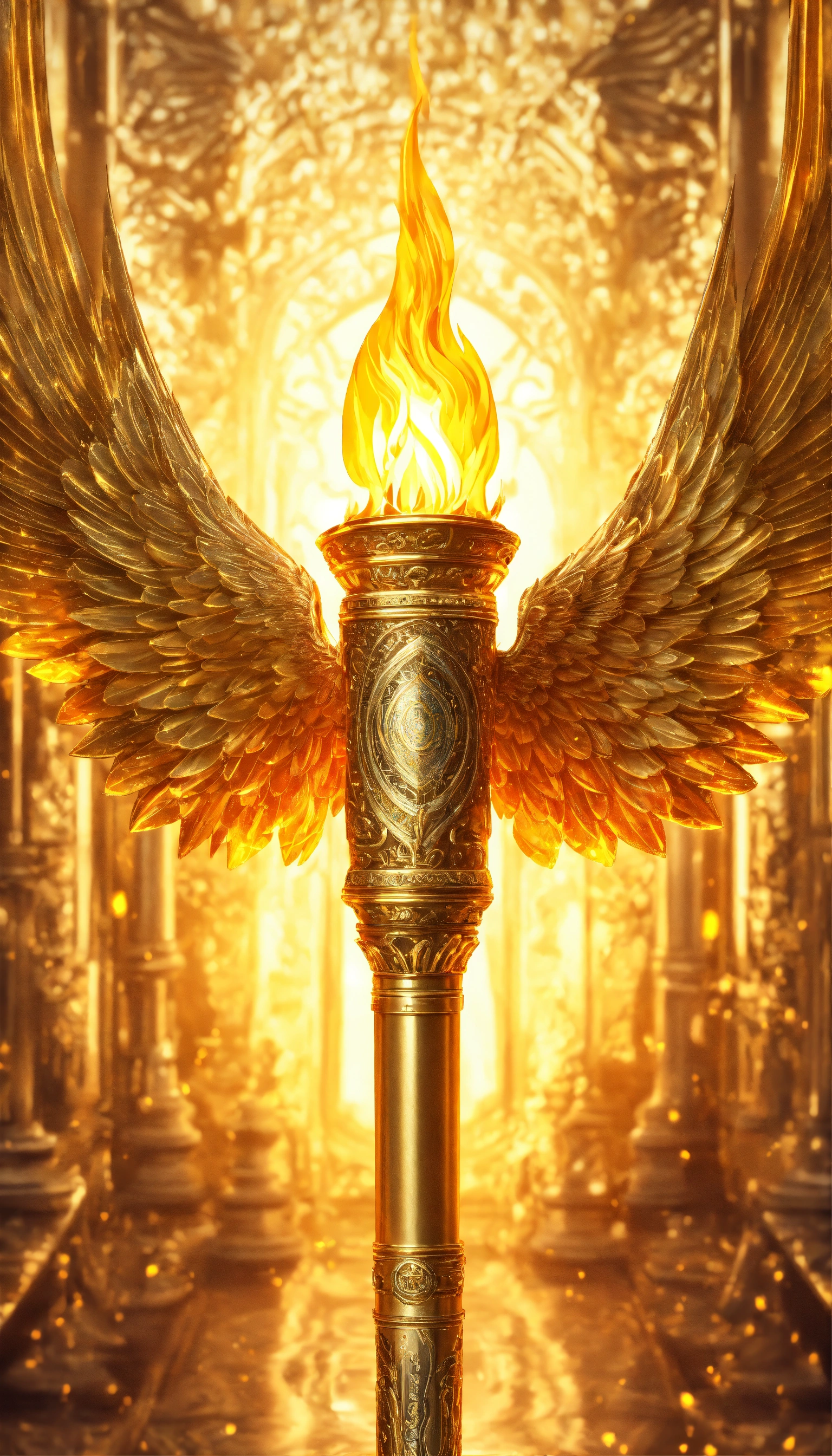 Powerful, detailed torch, digital illustration, real, 3d, golden colored torch with a yellow flame with white and golden details, on each side of the torch there are detailed and large wings, luminous golden mandala shape background, sharp focus, illustration cinematic, 8k, hyperrealistic digital painting, hd, high quality and resolution