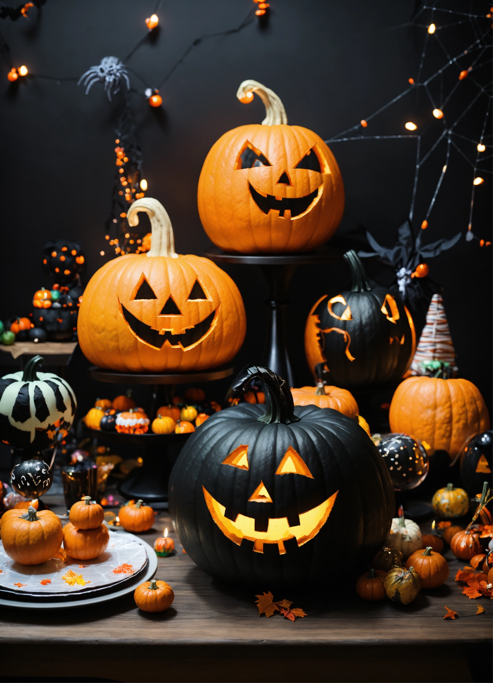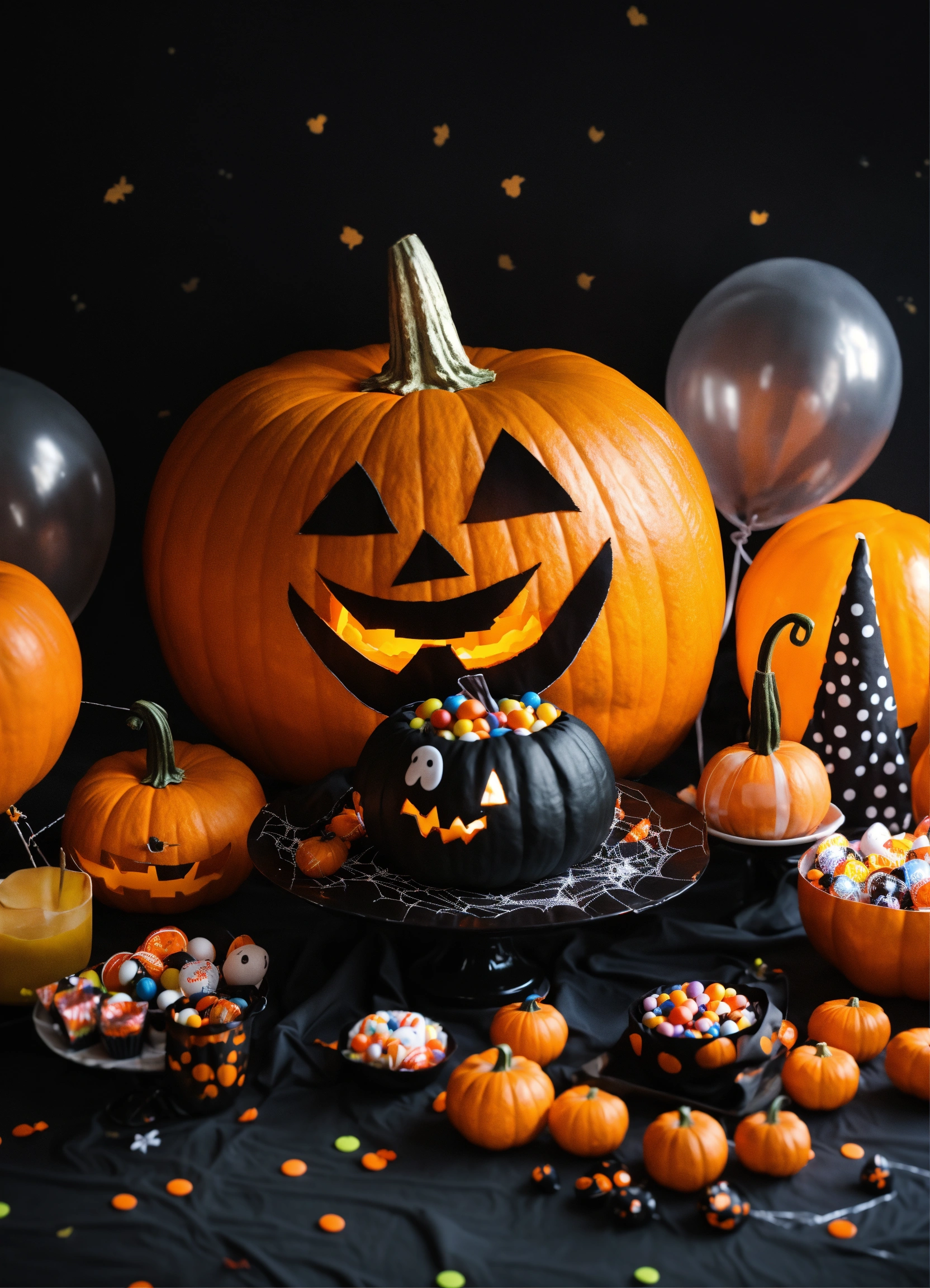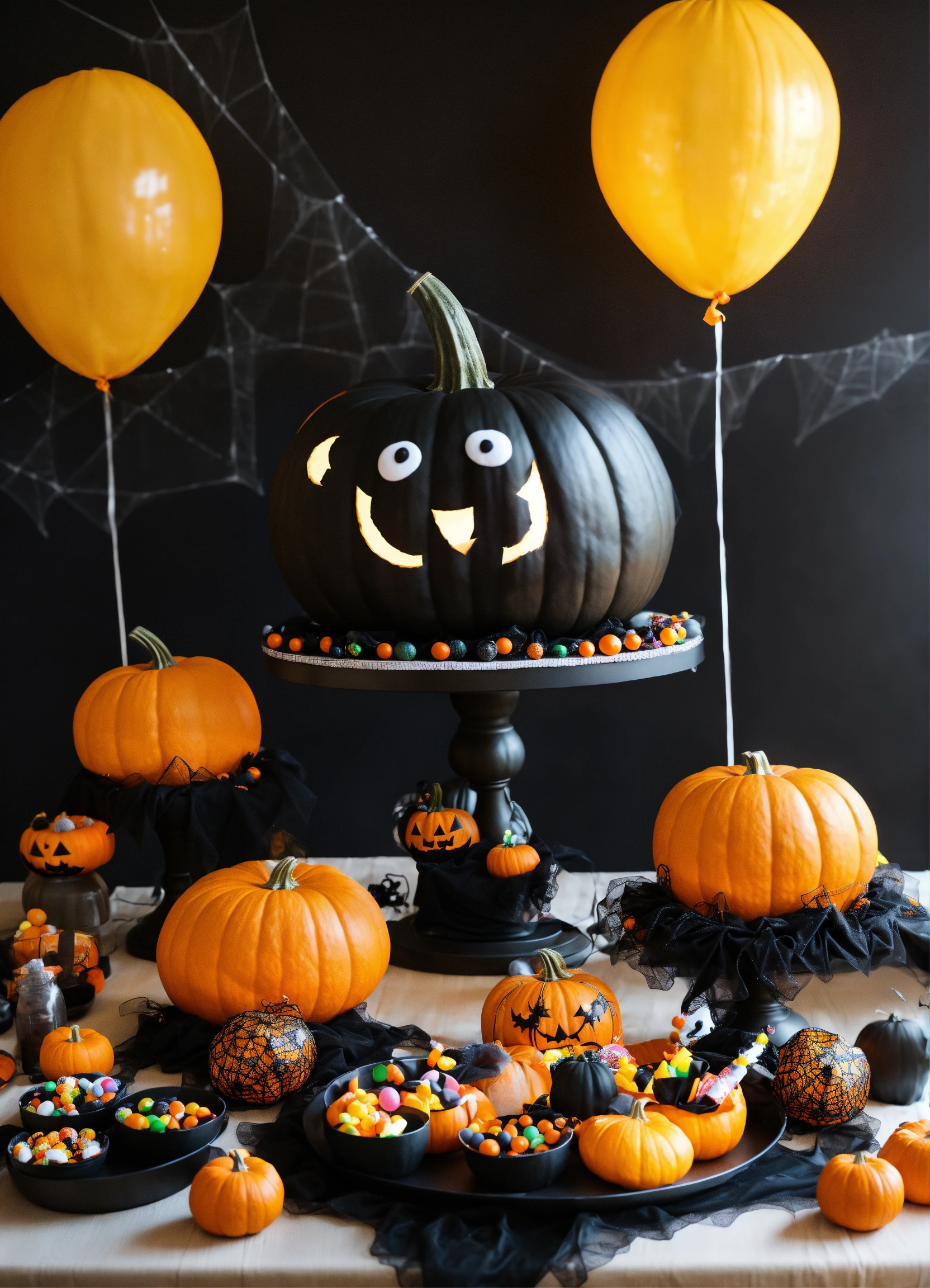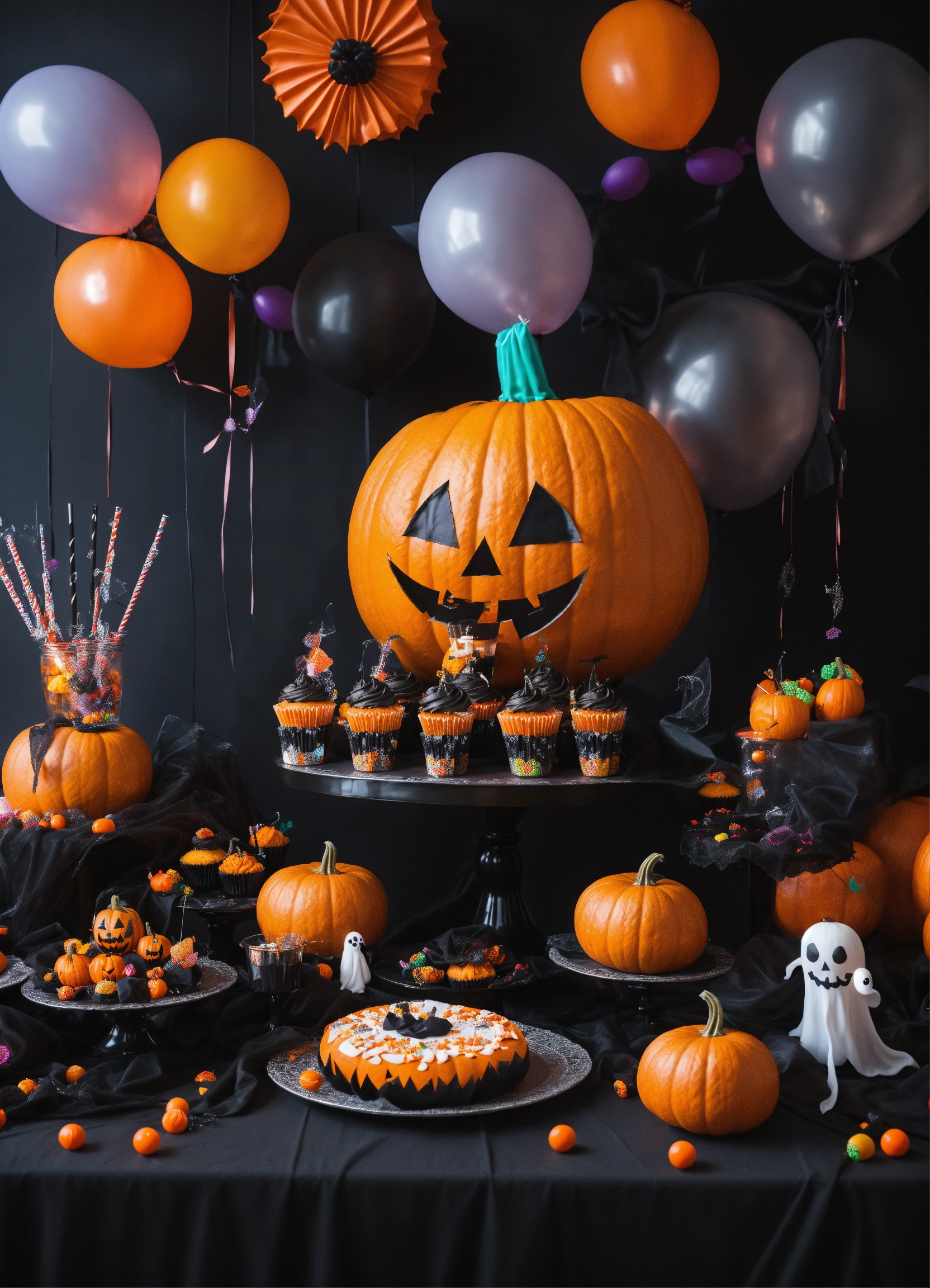 A big table whit a black fabric, whit a funny and cute hallowen decoration for kids, in the middle a big giant plastic pumpkin, in a black background, cute ghosts, many candys, ballons, fruis, cakes spider webs, photo 4k