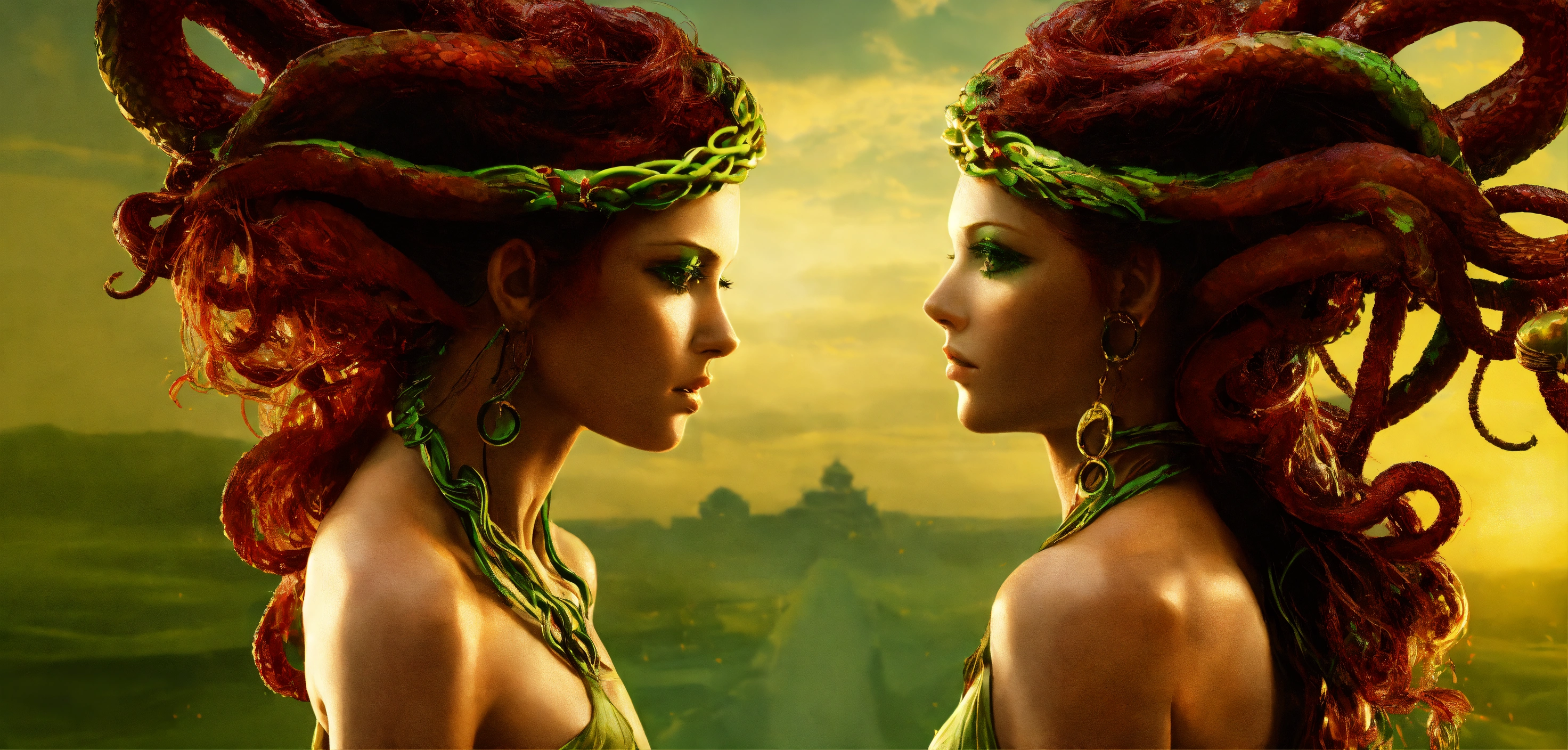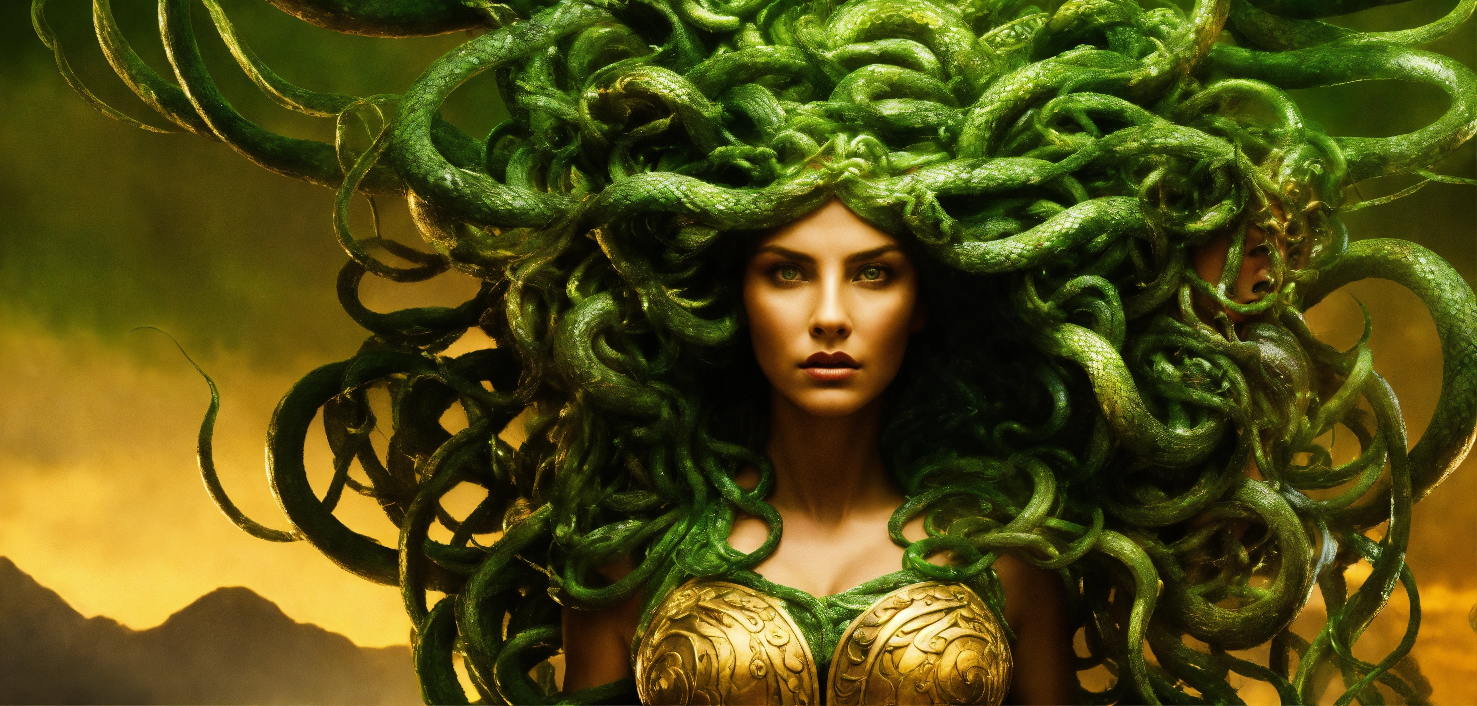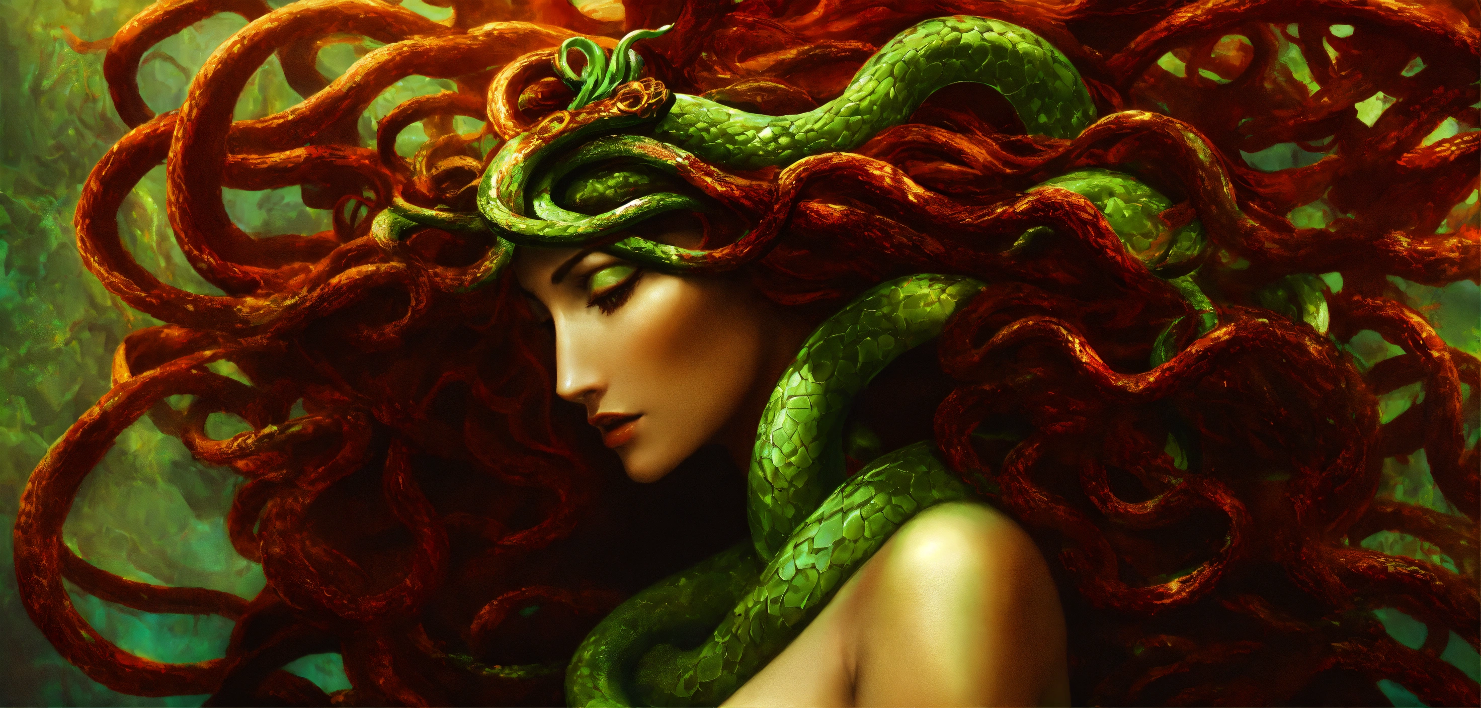 Medusa transformation and redemption a bold and unique choice, medusa's image could symbolize a journey from victimhood to empowerment. rather than focusing on the terrifying aspects, portray her in a moment of transformation or redemption, with her serpentine hair and strong gaze symbolizing wisdom and inner strength.