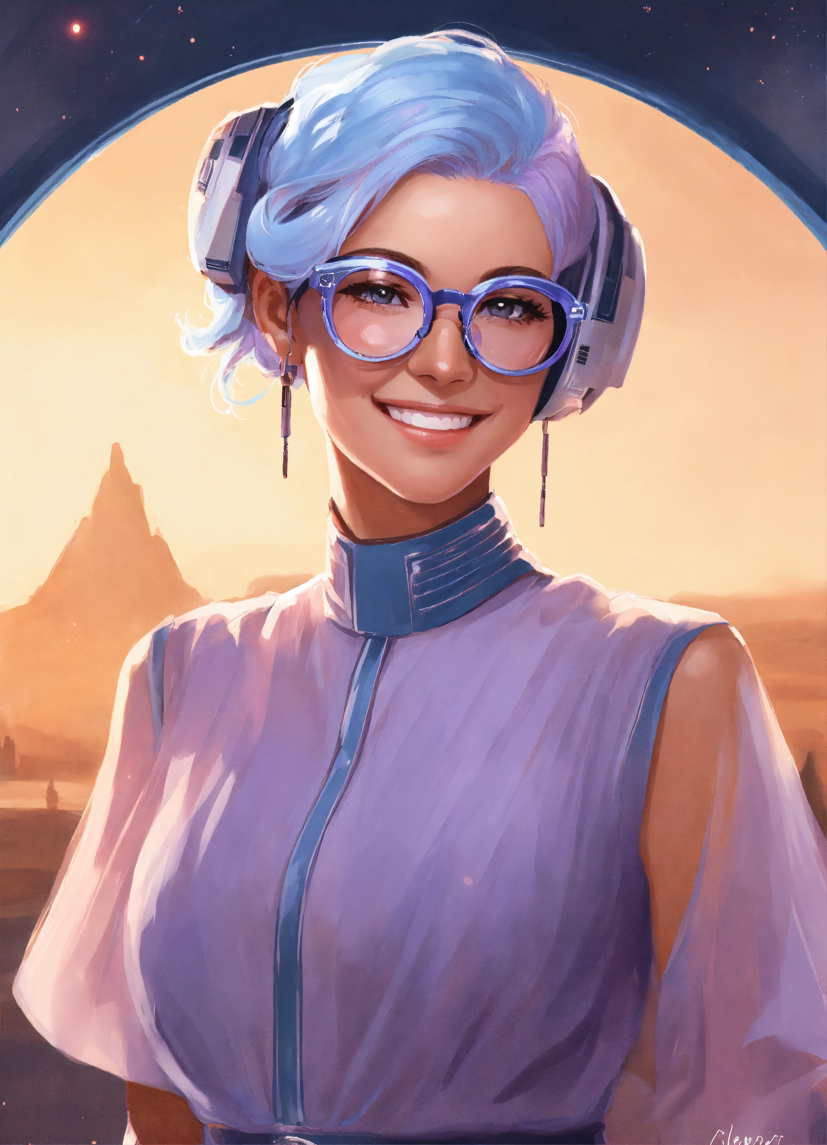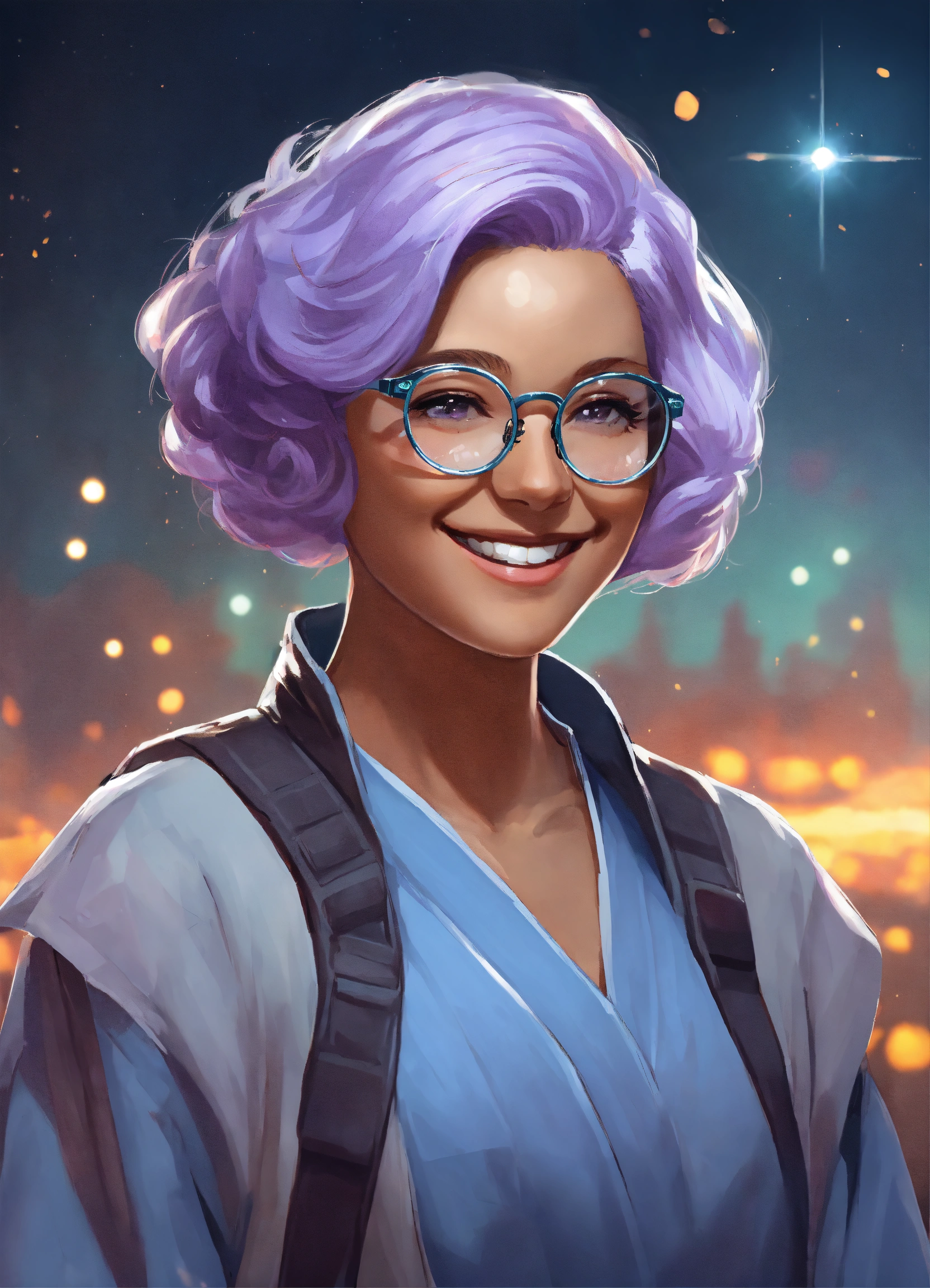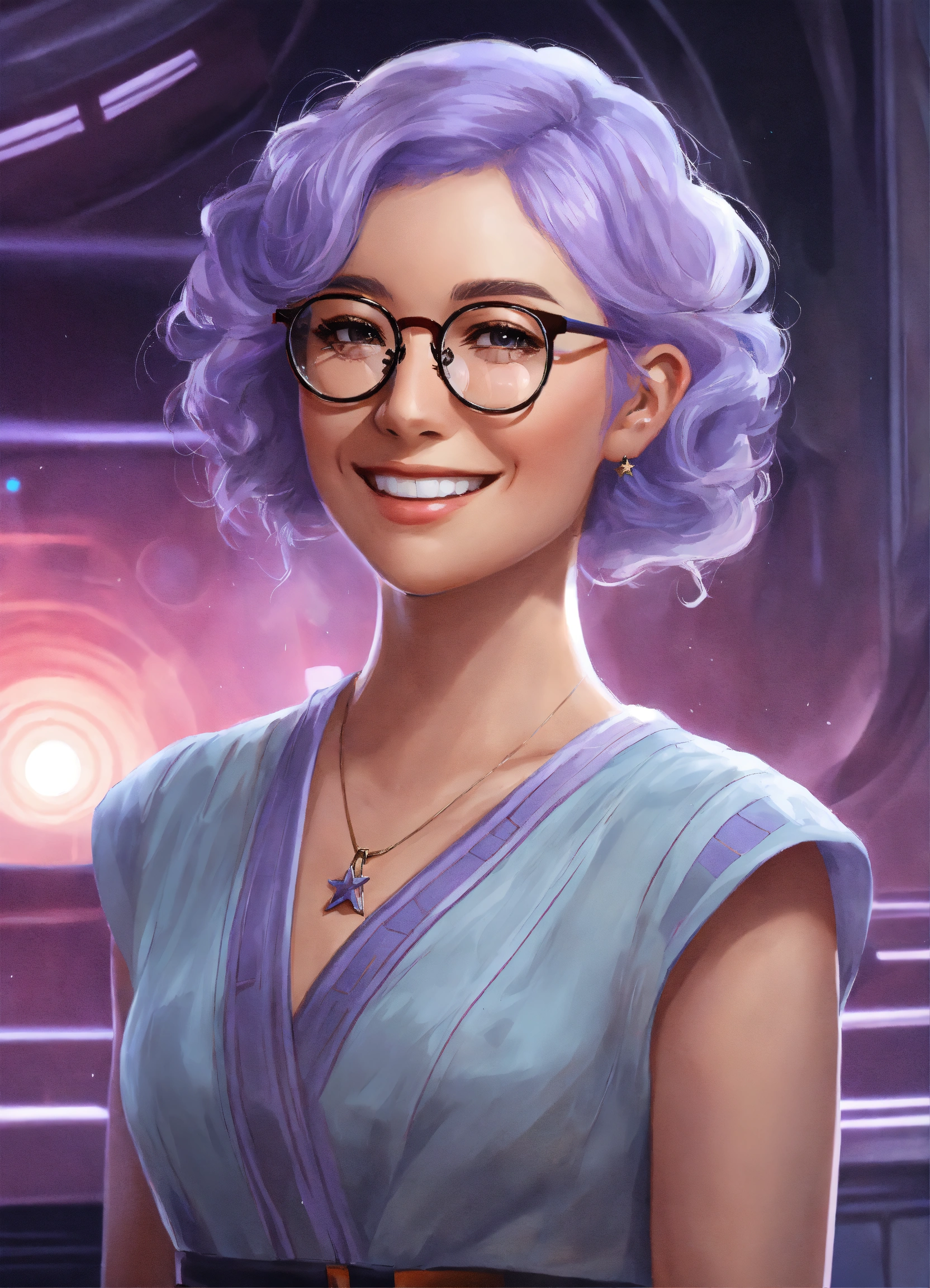 Digital art of a smiling, lavender-haired woman who is a star wars diplomat with round-frame glasses, wearing a light blue dress.