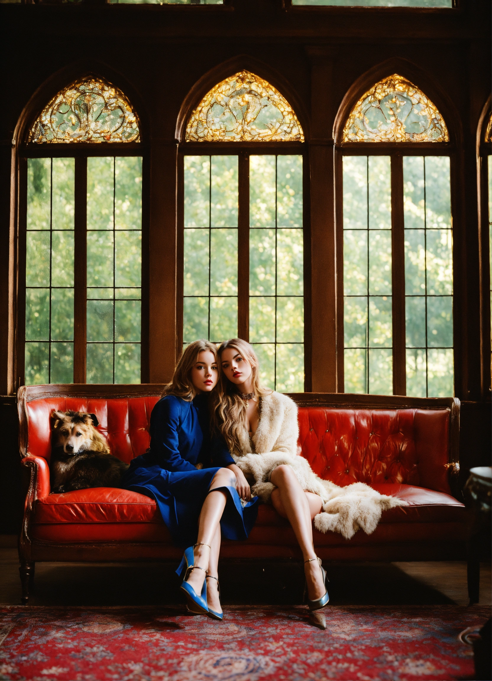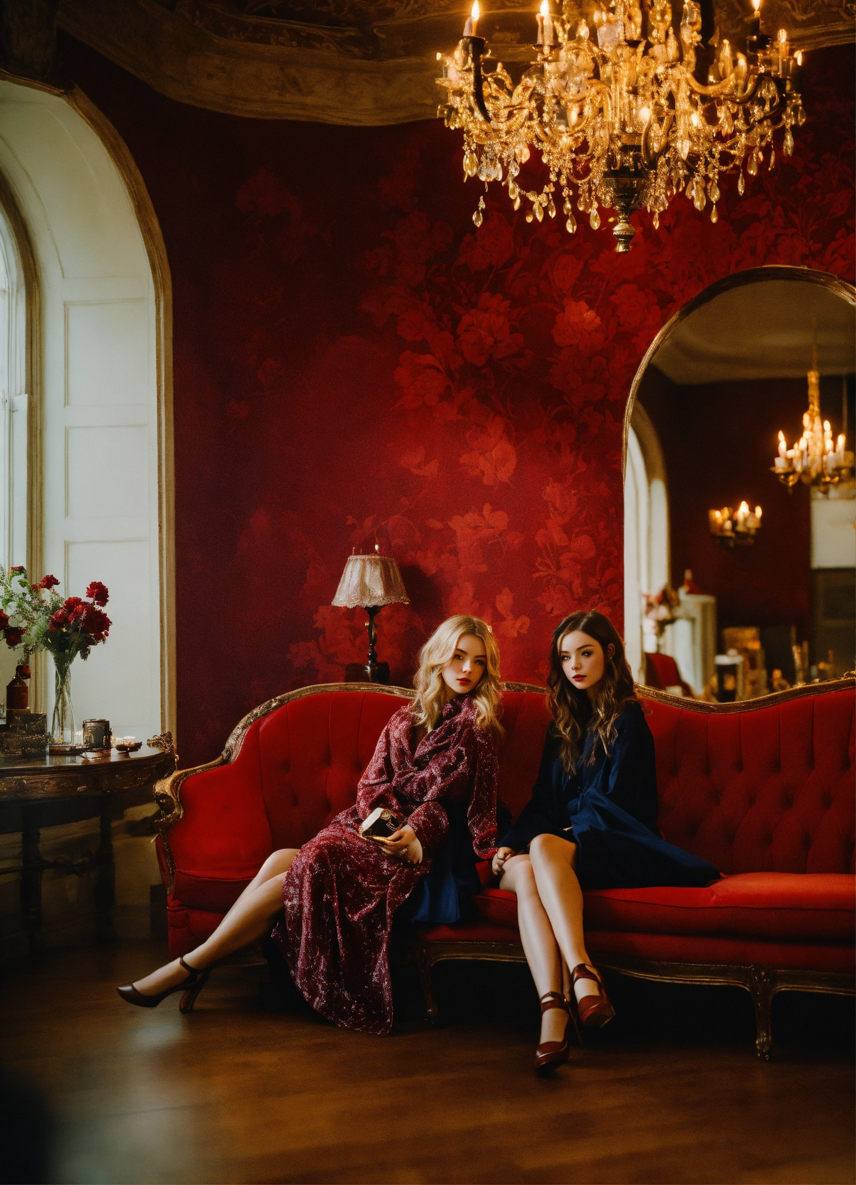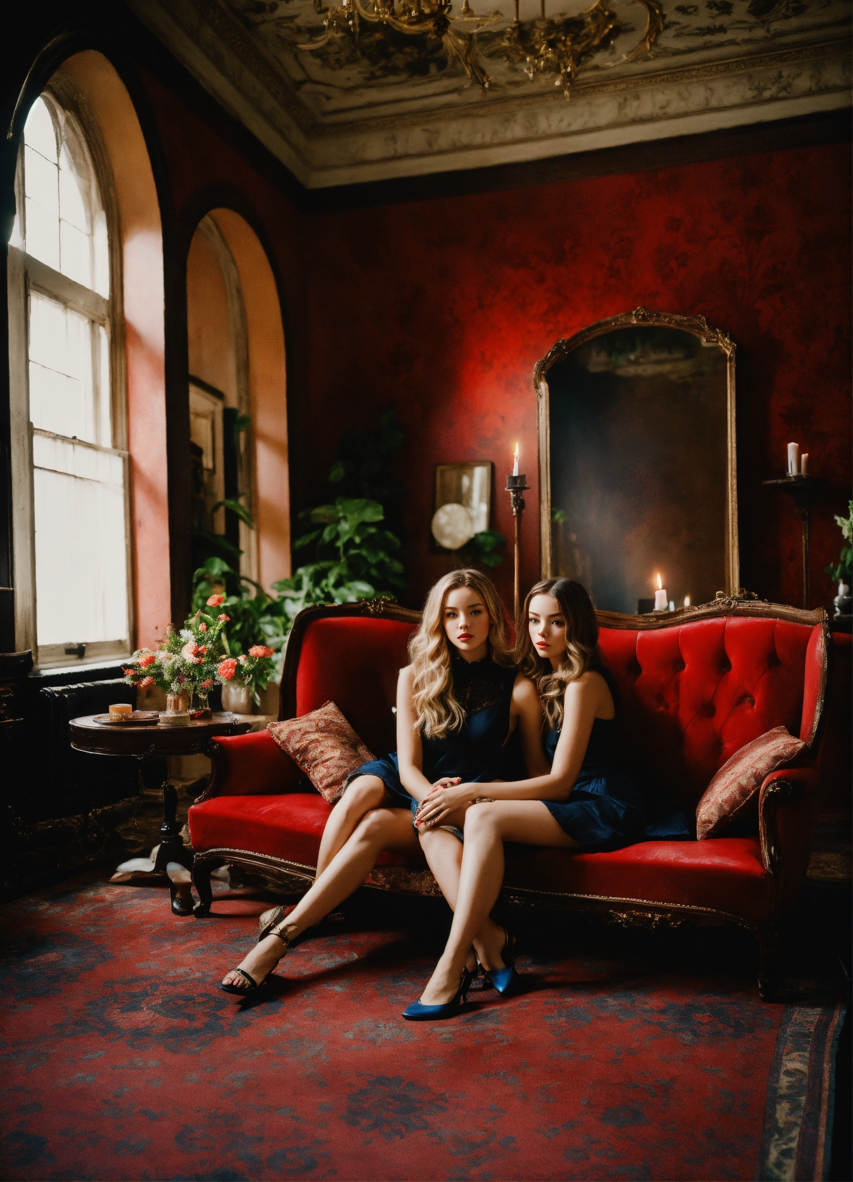 2women kodachrome two female models 1st-model=<blonde-amber(maika-monroe heard><wearing-makeup> + 2nd-model=<brunette-ksenia(effy-stonem)kahnovich><wearing-makeup> 65mm-film portrait, laying, hugging, cozy, cuddling loving on couch, kissing, youthful looks, december aesthetic, subjects at distance, 19th century interior, arched windows, hanging red velvet, hardwood floors, candle on coffee table, gothic wallpaper walls, candle sconces, two youthful models on large wooden red leather lounge couch, high-depth cinematic symmetry central point of composition subsurface scattering kodak portra high quality raw exquisite textures highly detailed photograph harsh lighting sharp focus high resolution 8k uhd dslr film grain fujifilm xt3