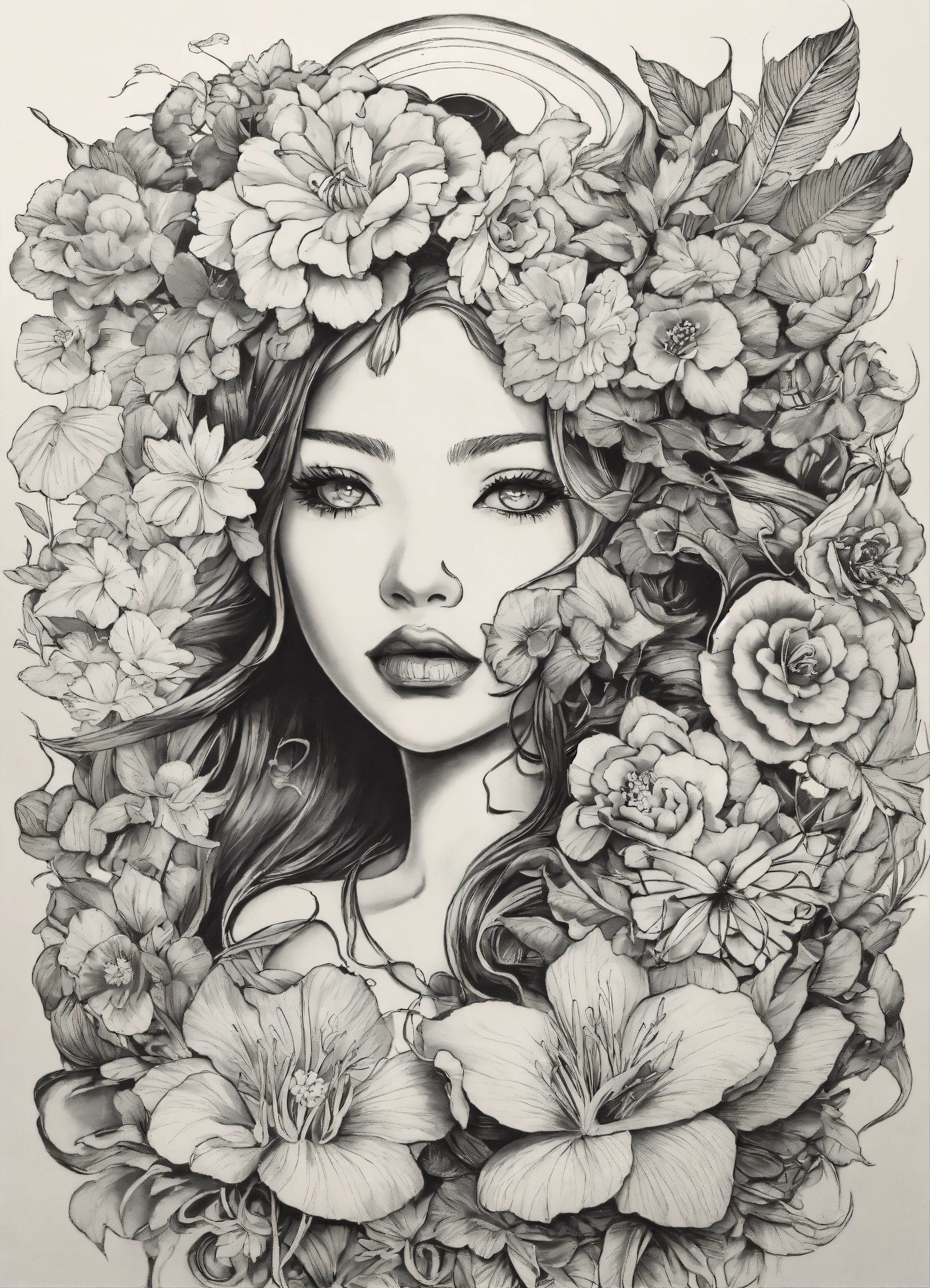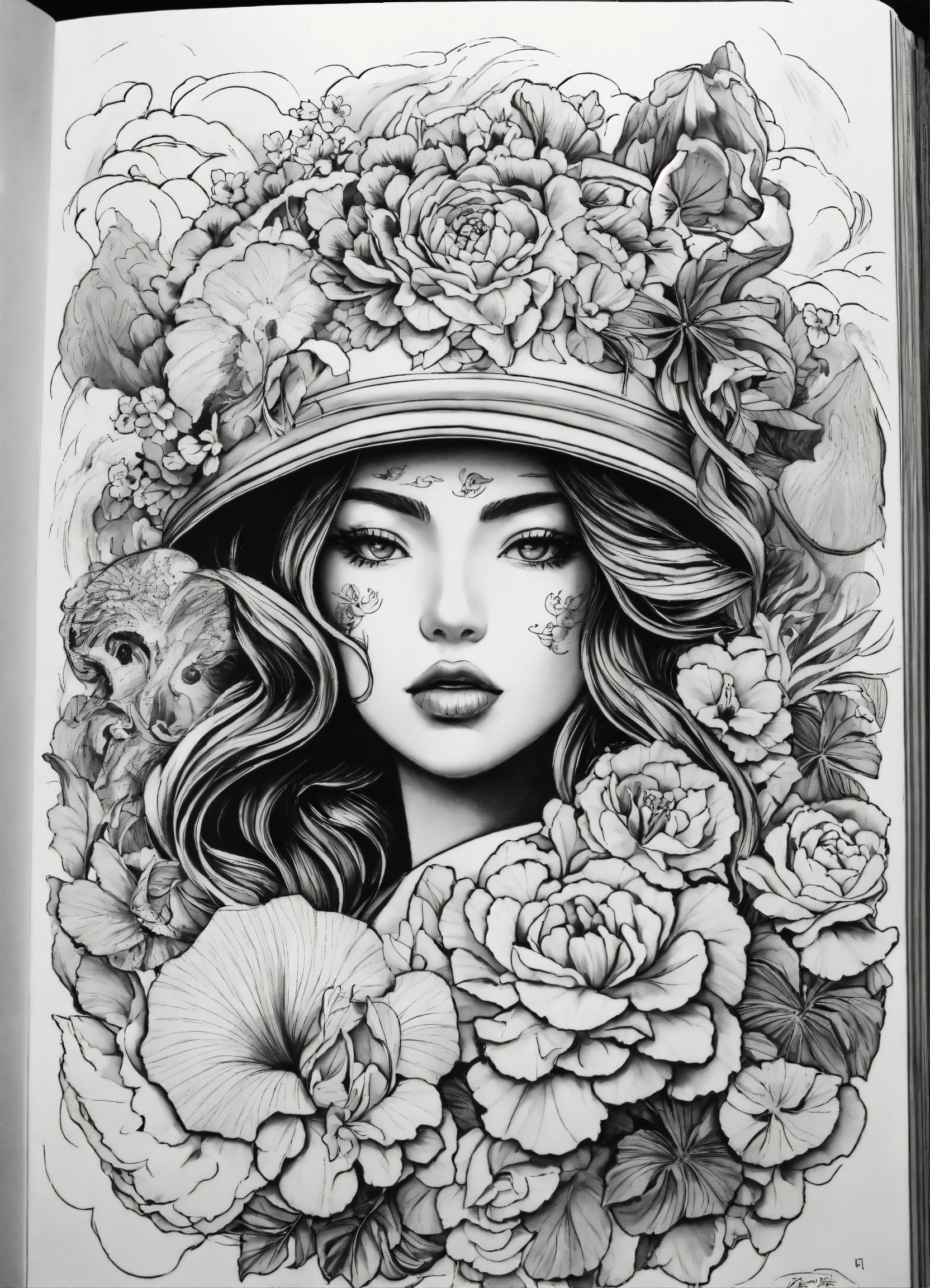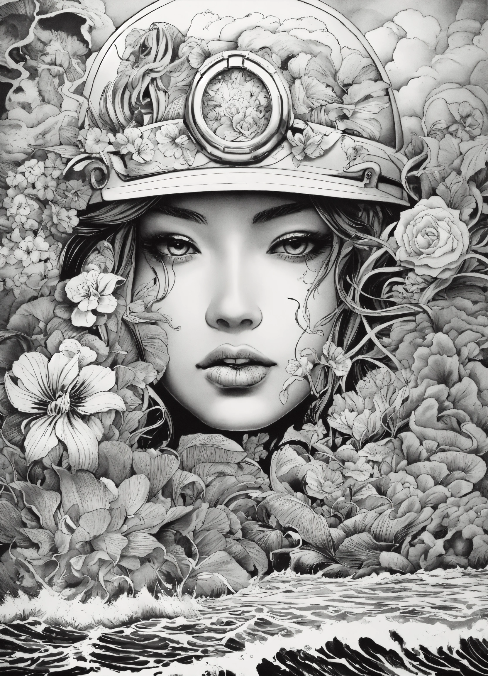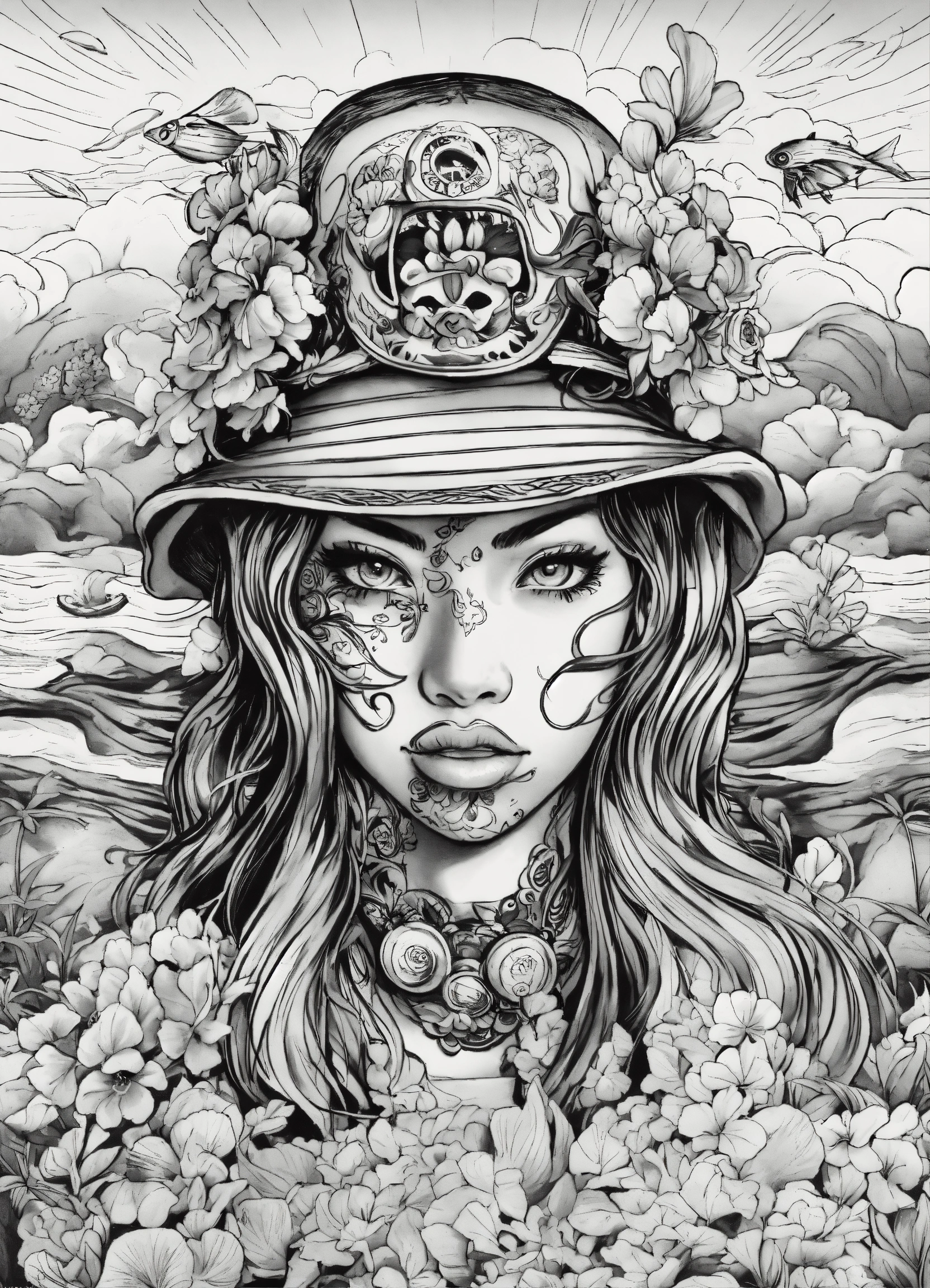 Faces and flowers, by ed roth, behance contest winner, lowbrow, tattoo sketch of a ocean, with japanese inspiration, multiple faces, victo nagai, tropical style, military art, in style of chrome hearts, trending on art-sation, black and white coloring book page, line art