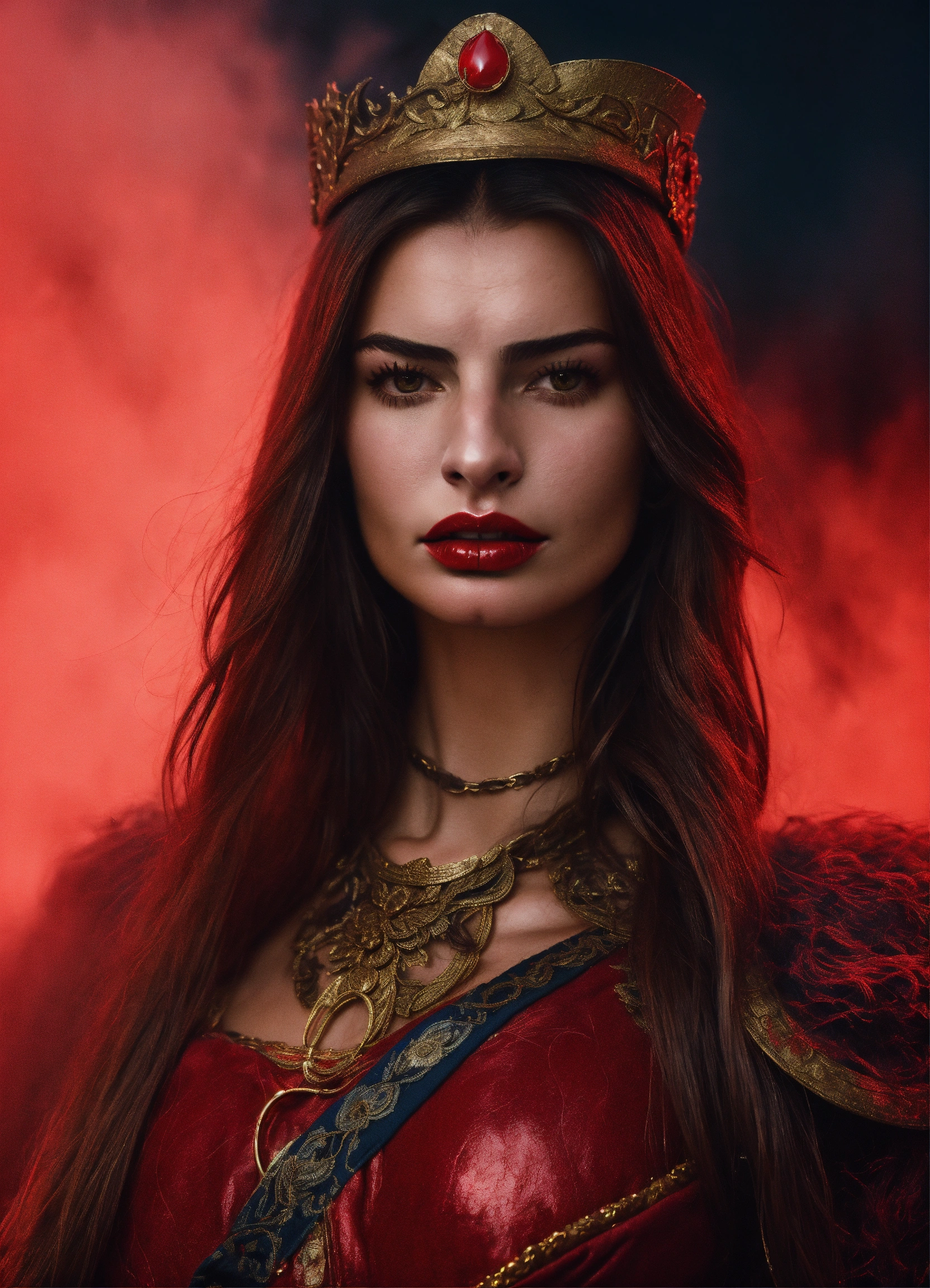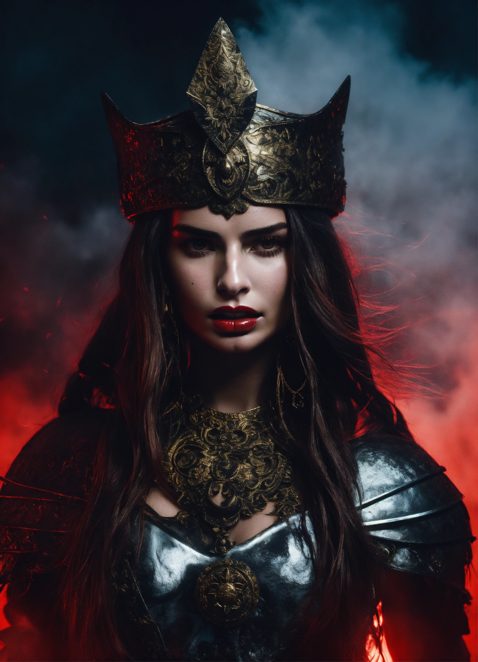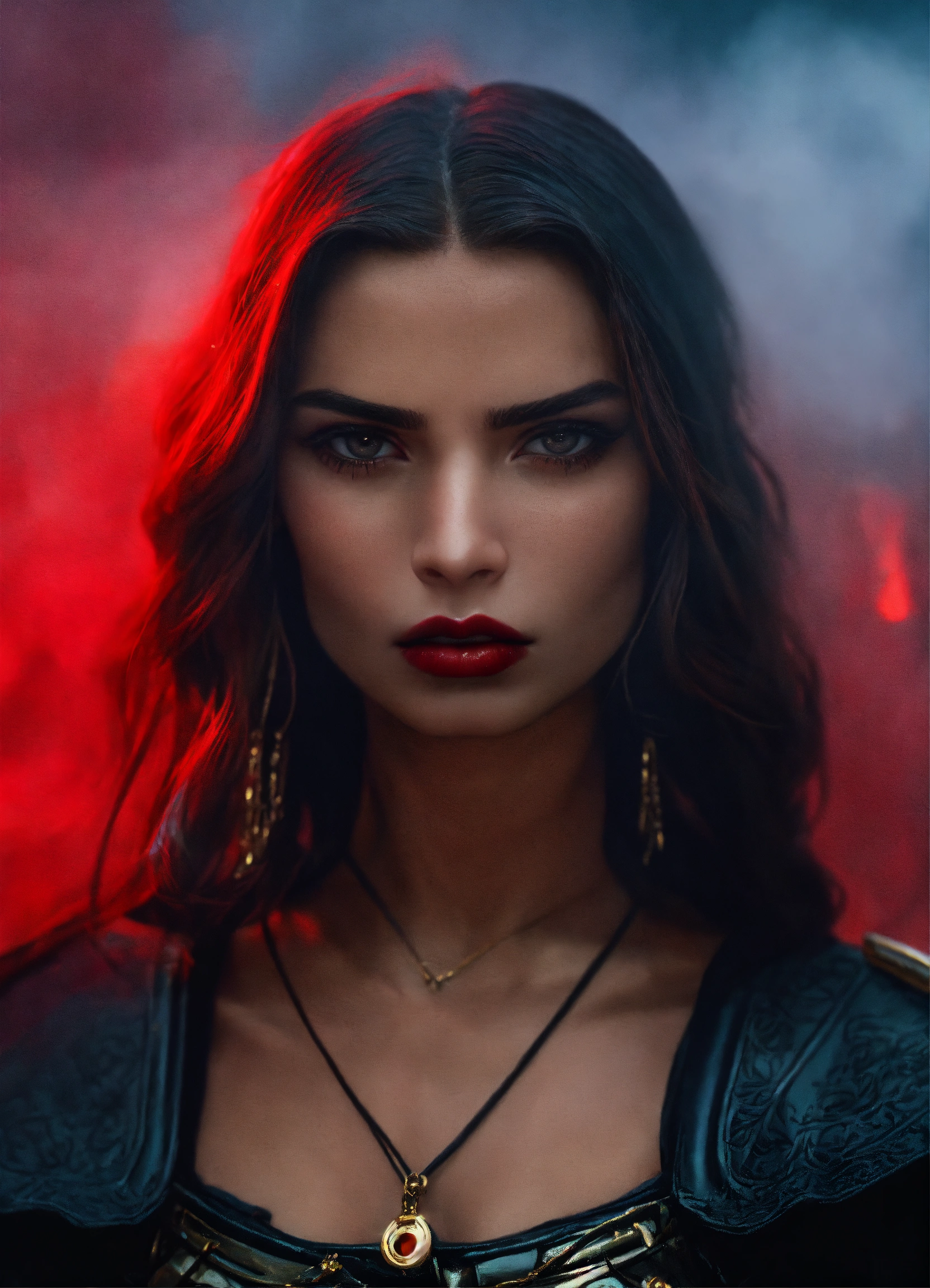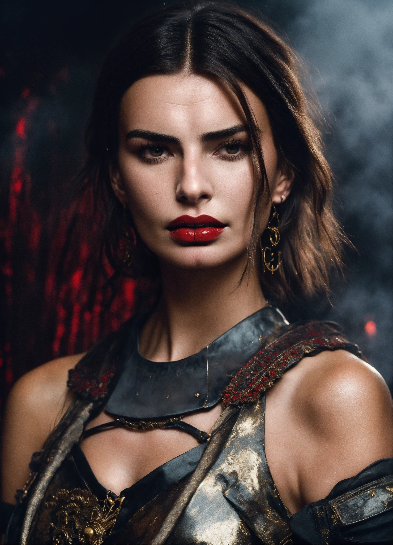 A photo quality portrait of emily ratajkowski as a beautiful warrior with red lips, a serious expression, and surrounded by spooky fog.