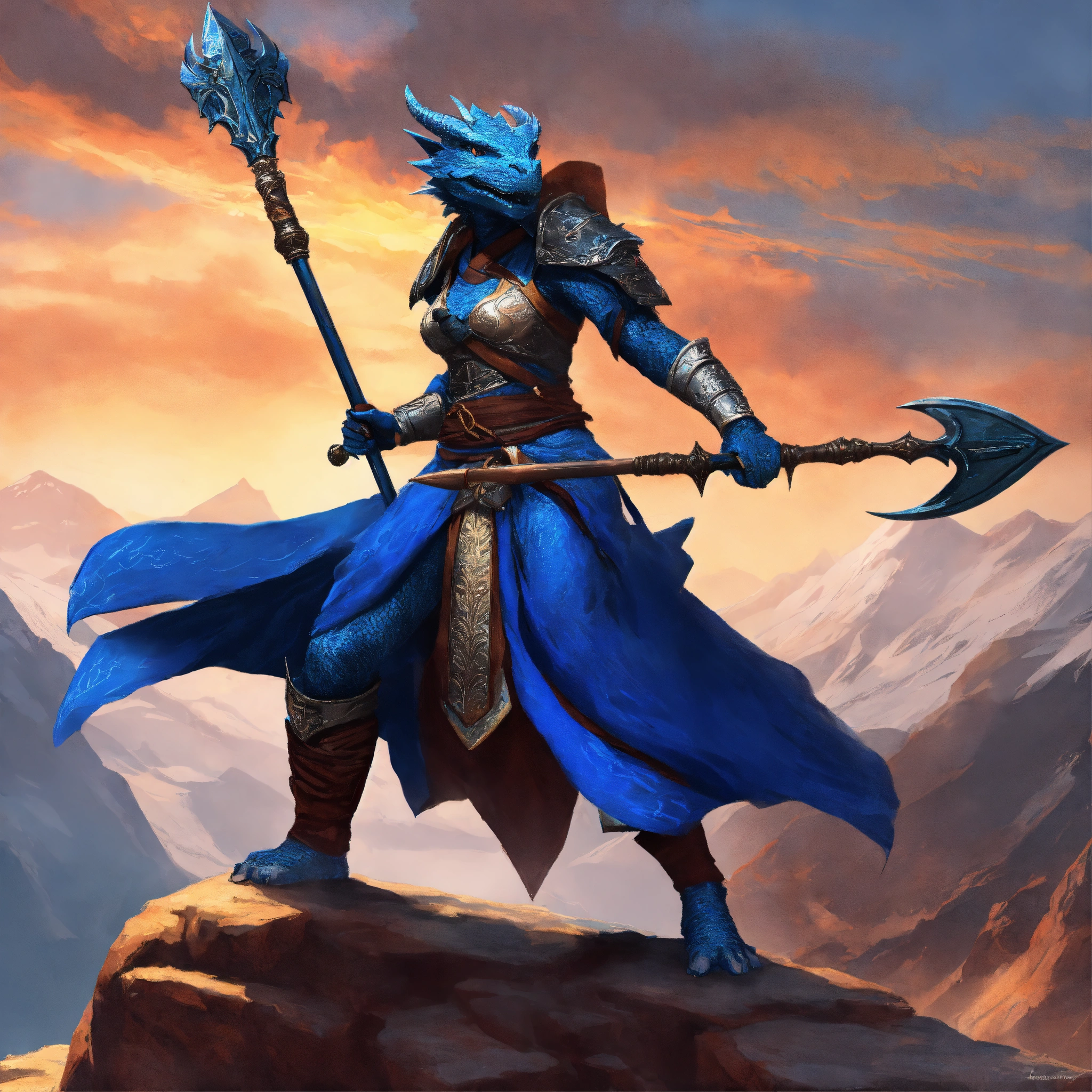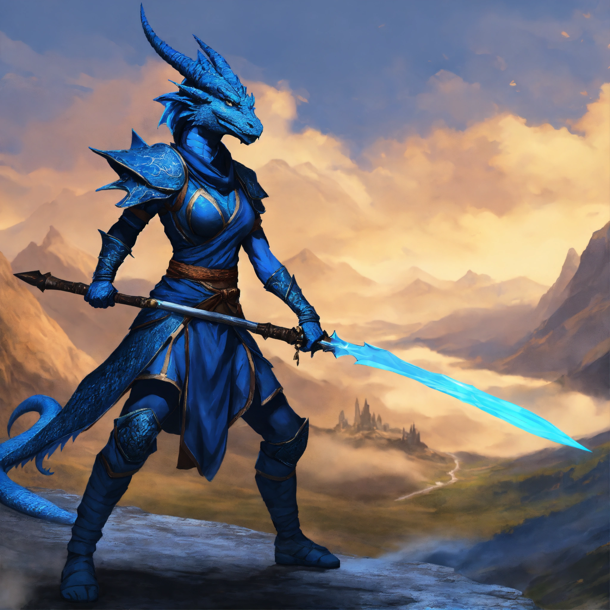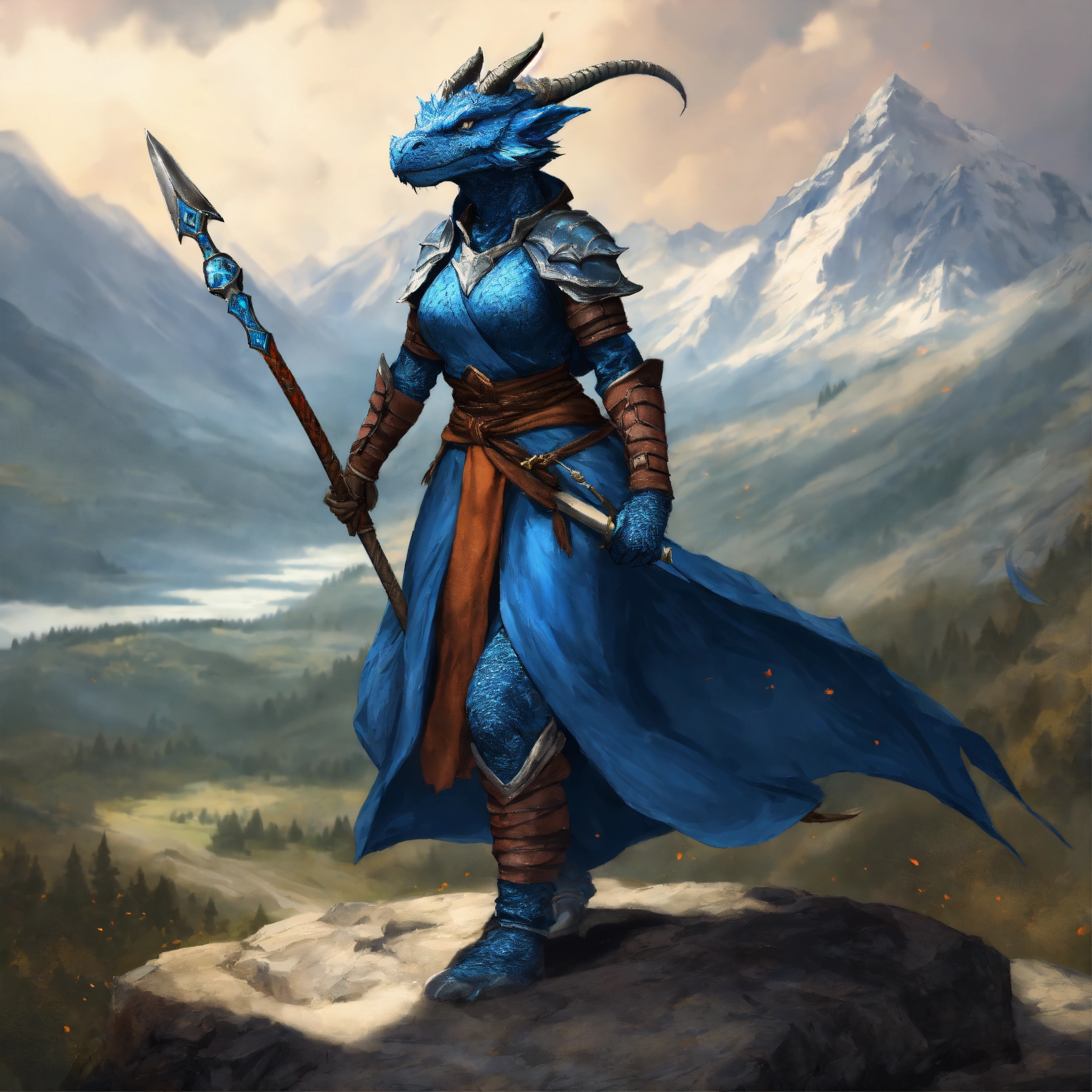 Female blue dragonborn with a spear, wearing a monk robe, defensive stance, raging, mountainous background, digital art