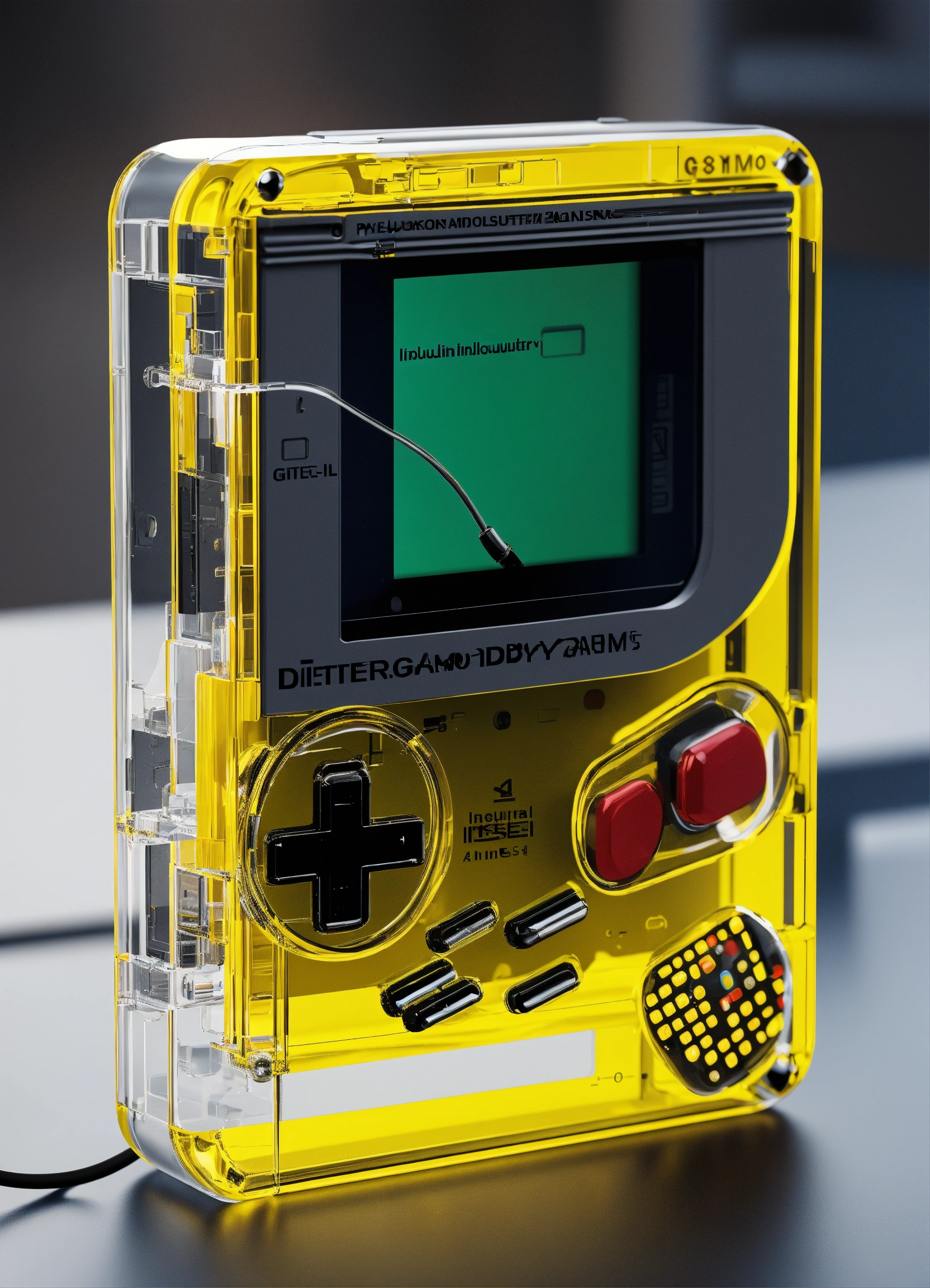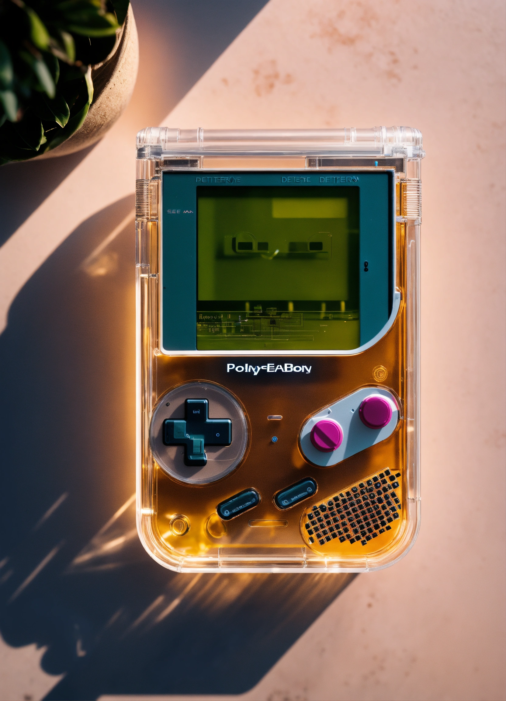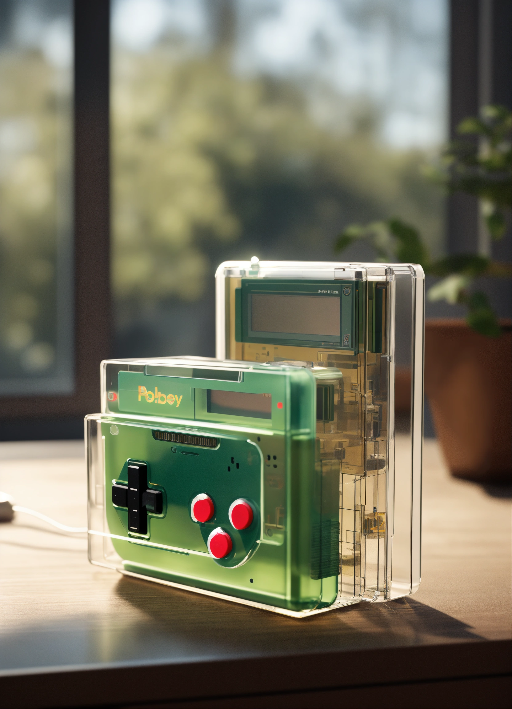 A see through polycarbonate game boy designed by dieter rams. industrial design inspiration. unreal engine render, natural lighting, on desk, beautiful shot