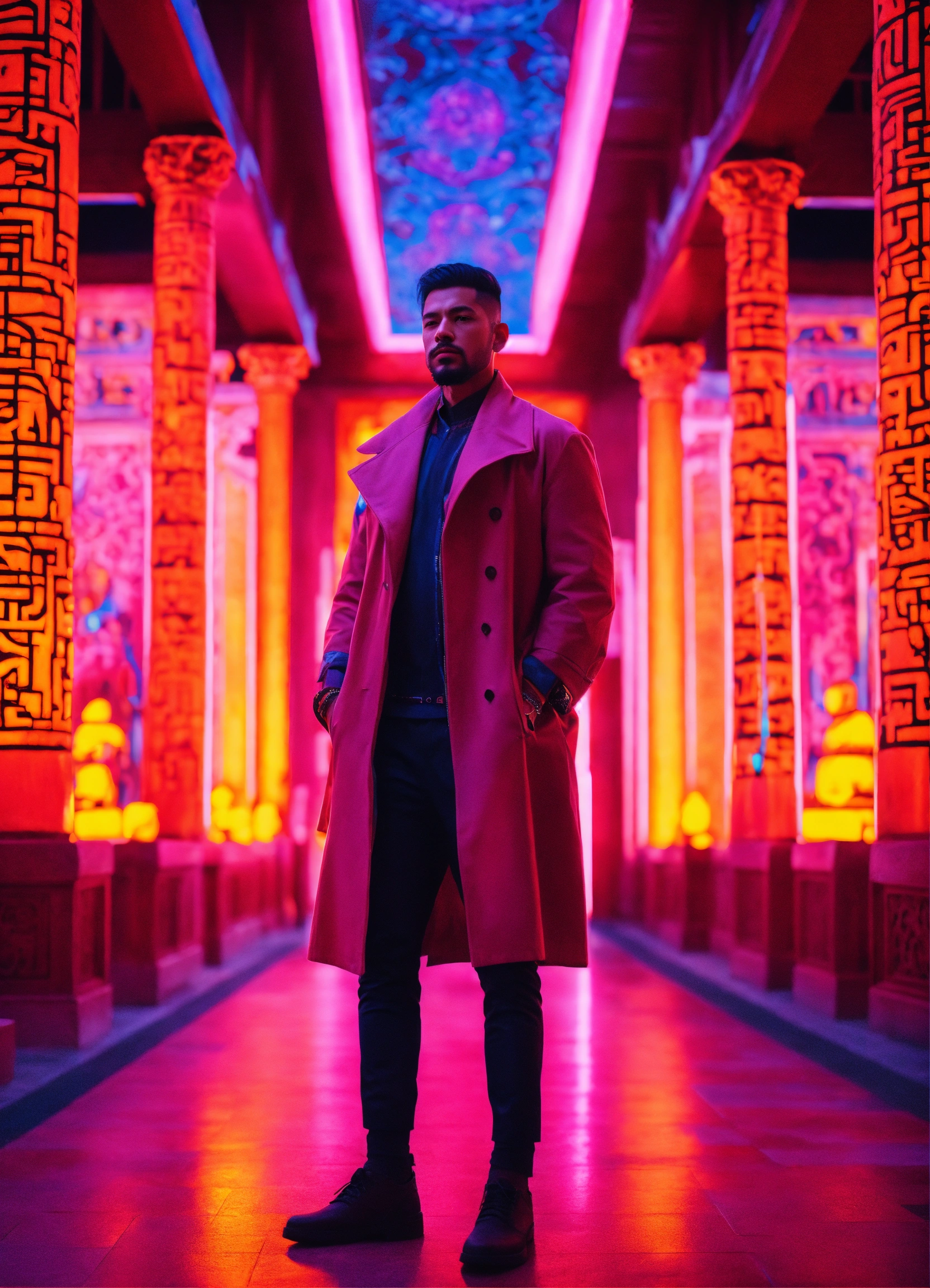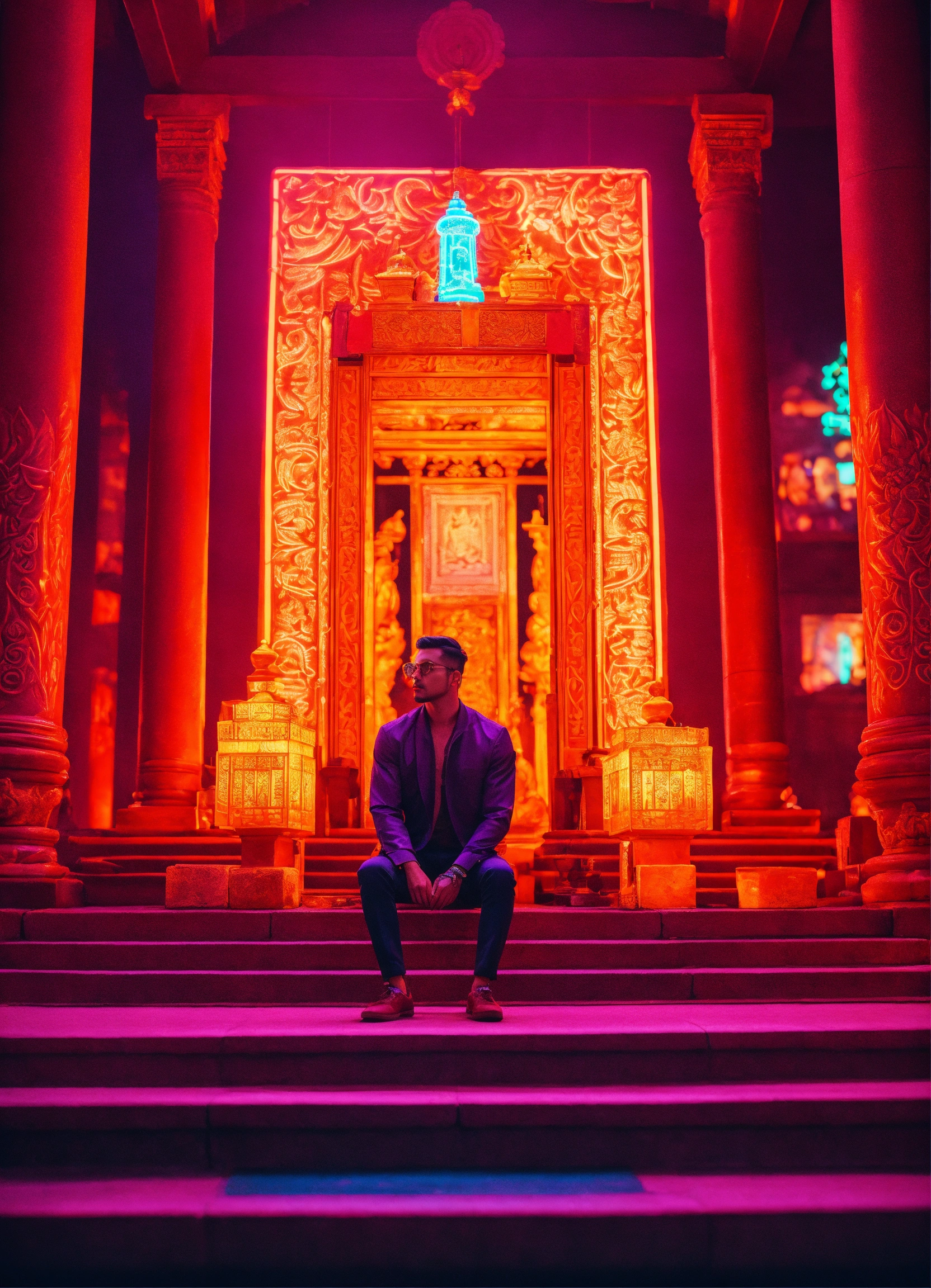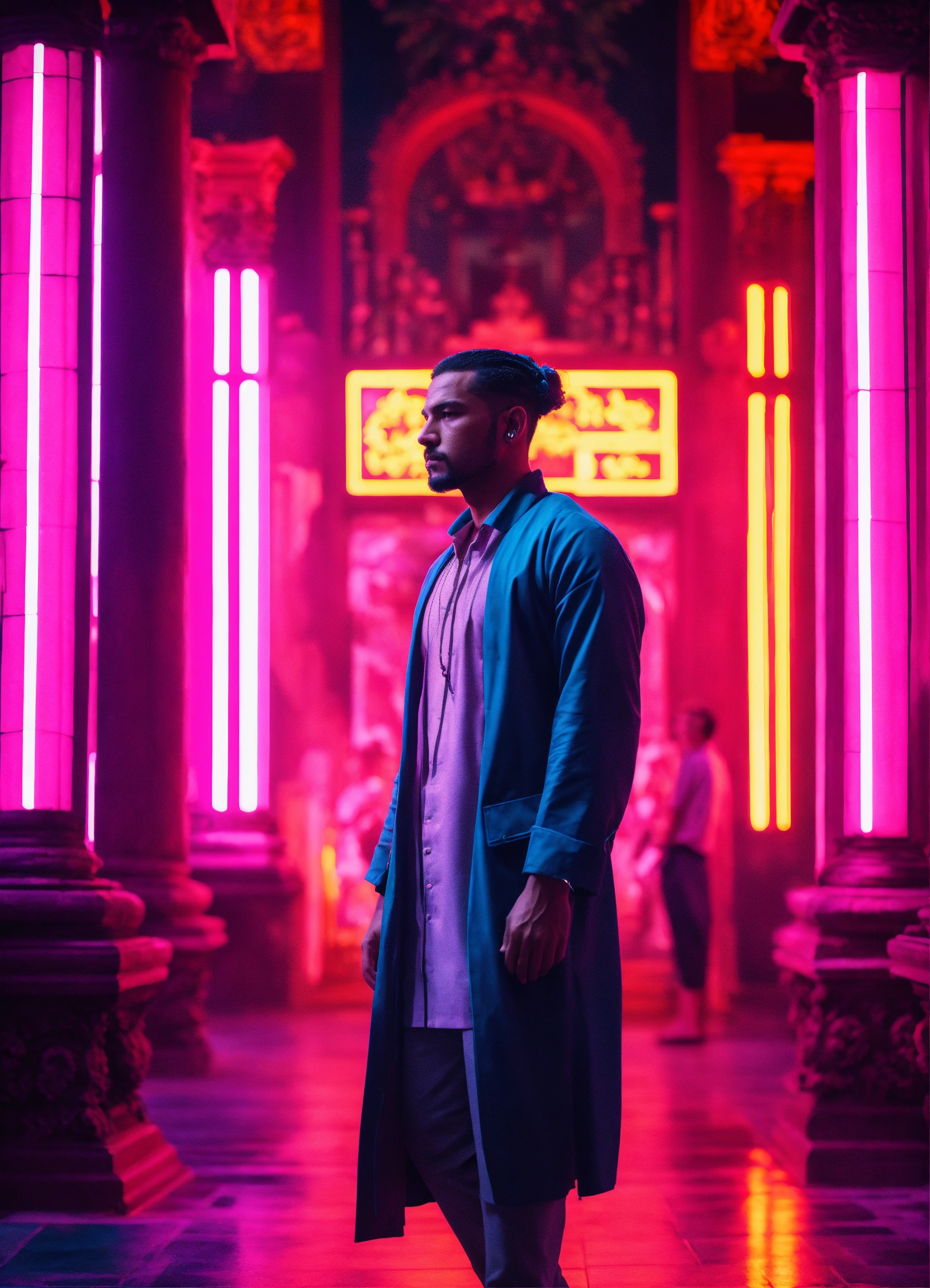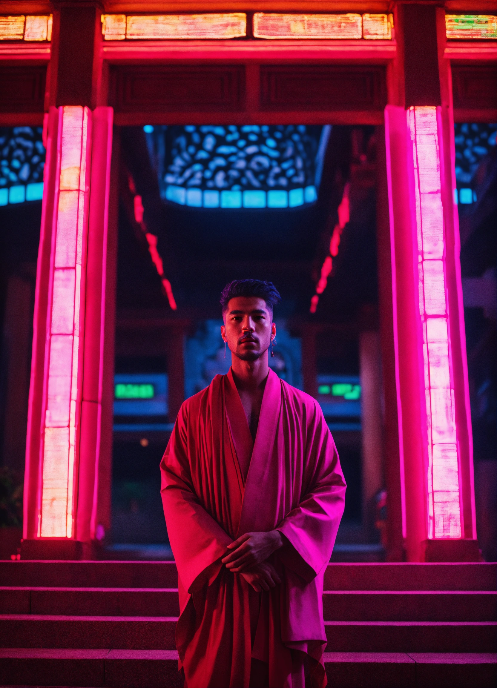Cinematic photography, modern, male sage in temple, proportionate, neon colors, realistic details, ultra 8k resolution