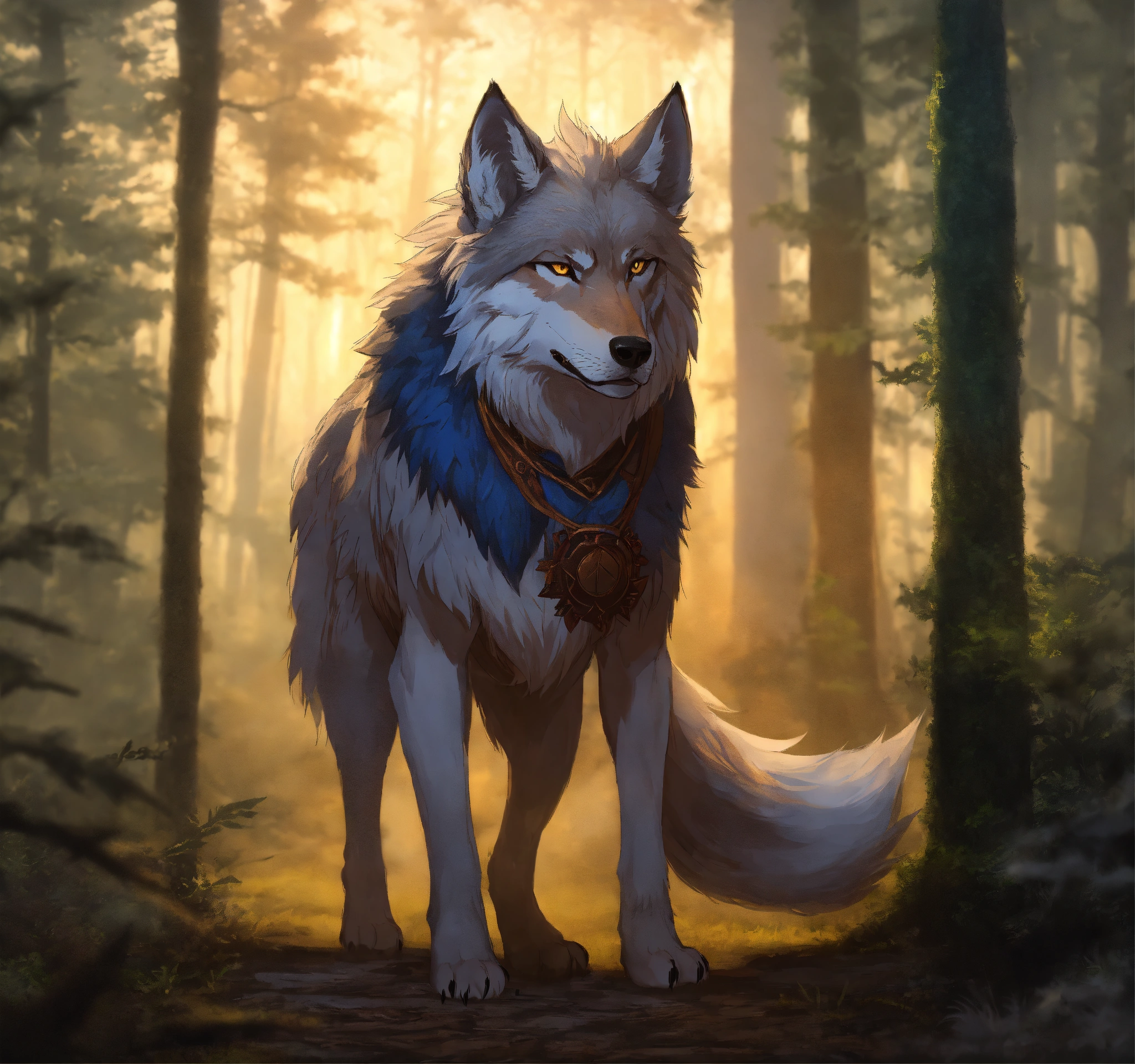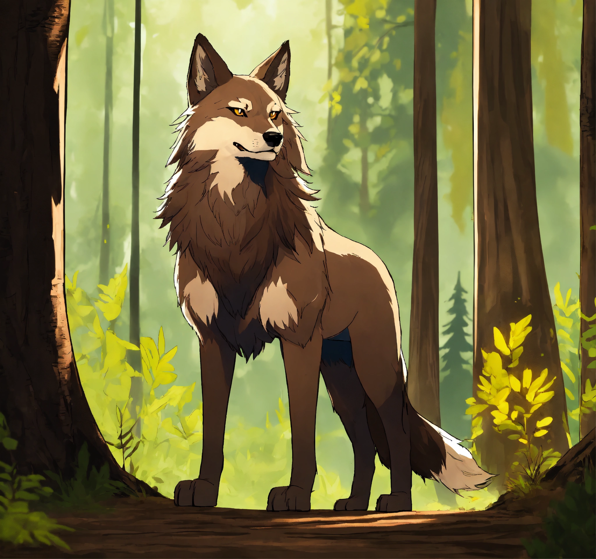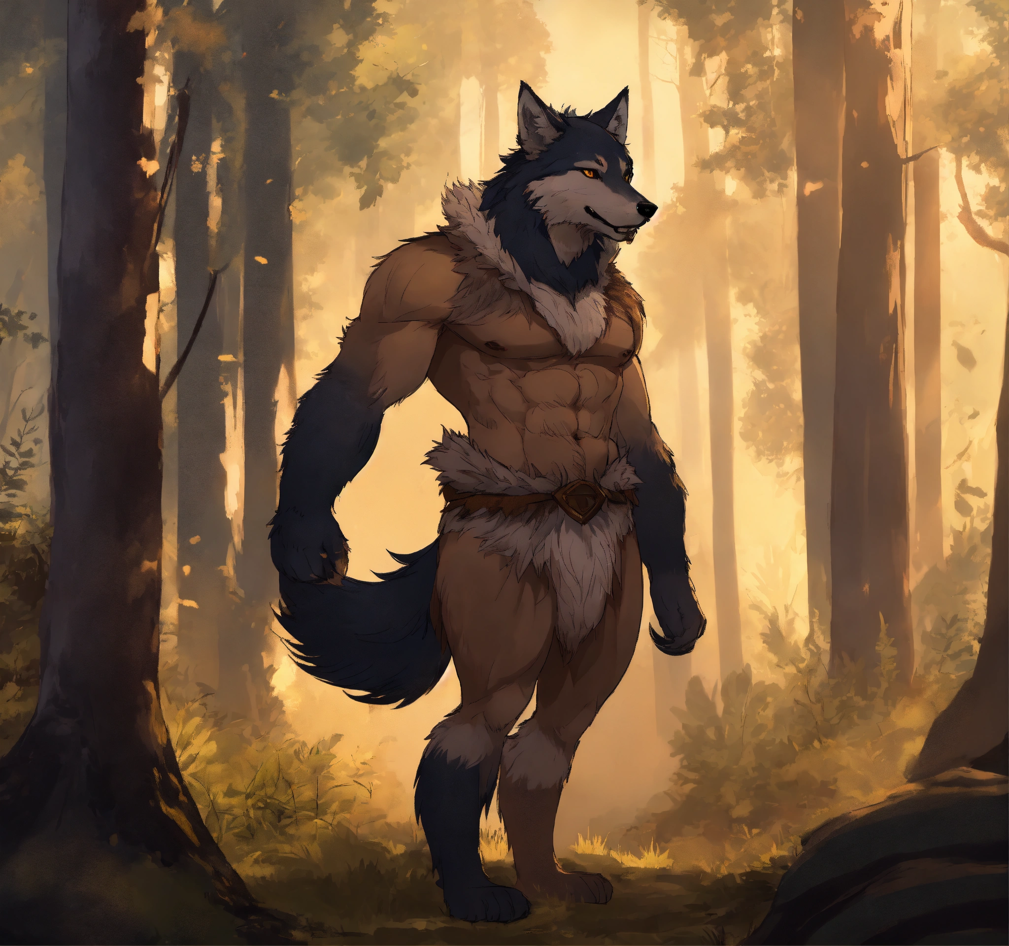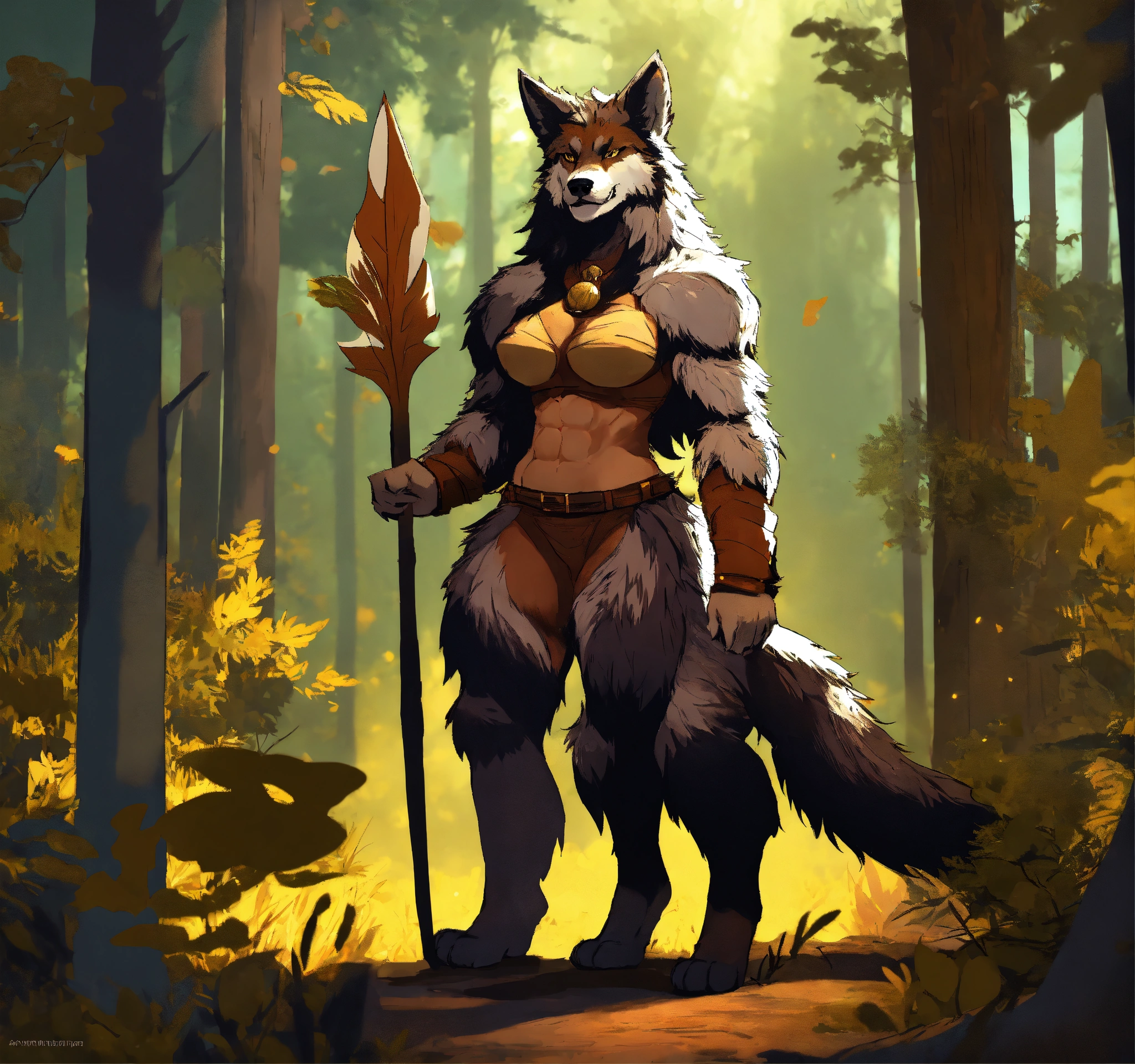 A wolf woman with small horns, large fluffy tail, hairy body, big paws, muscular, tall, in the forest