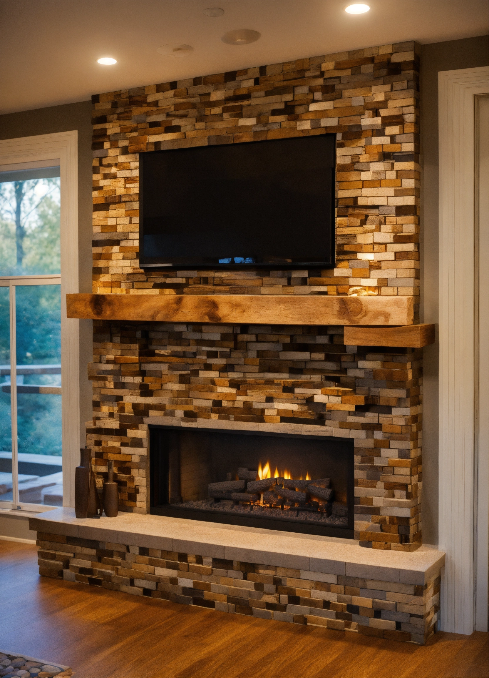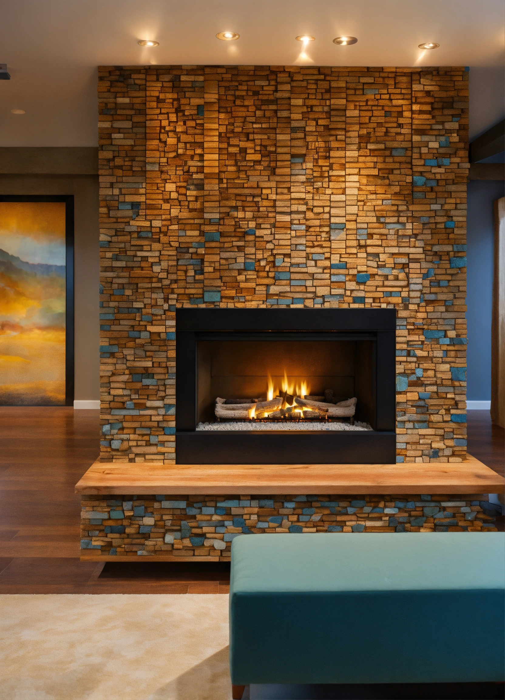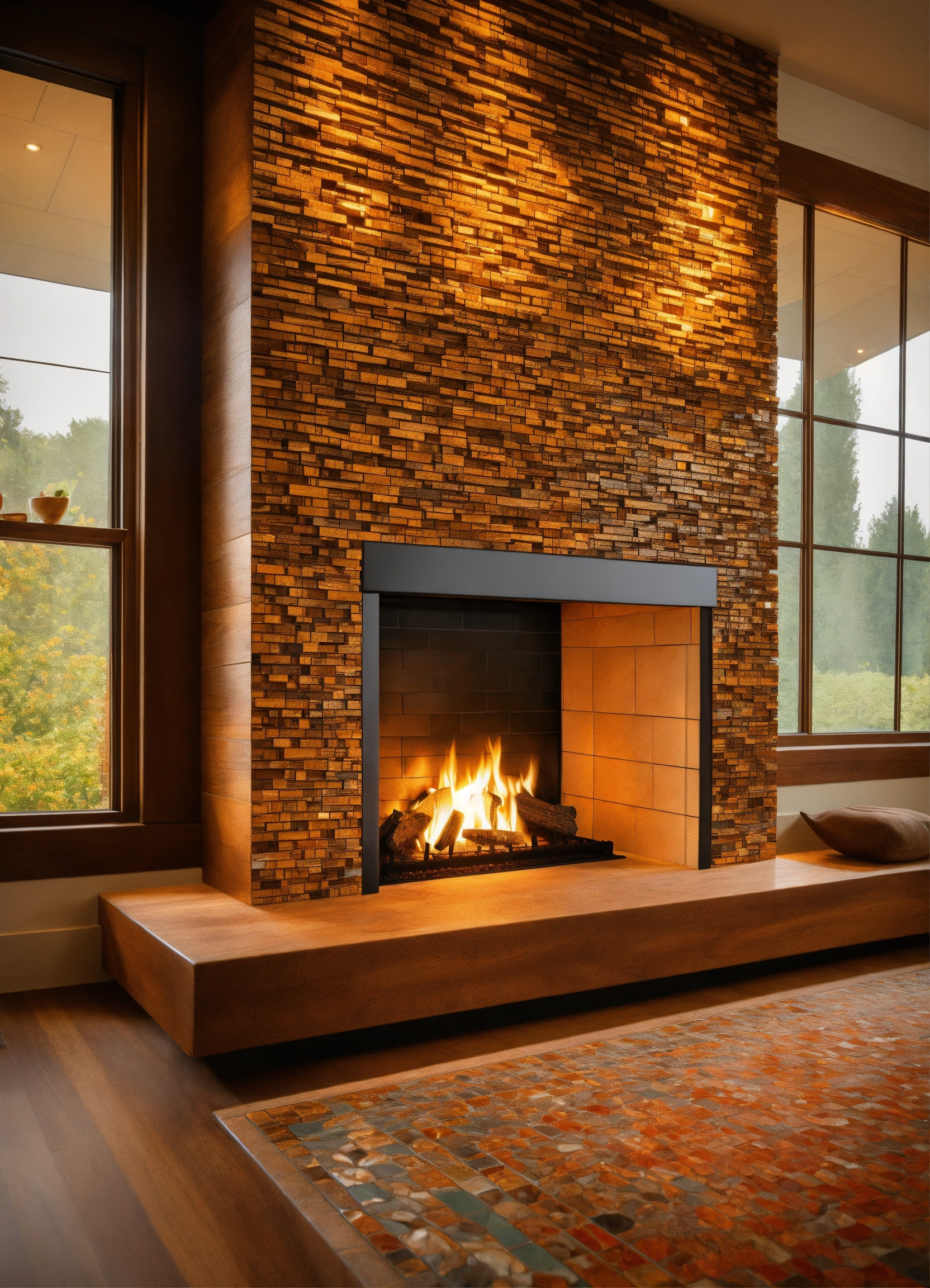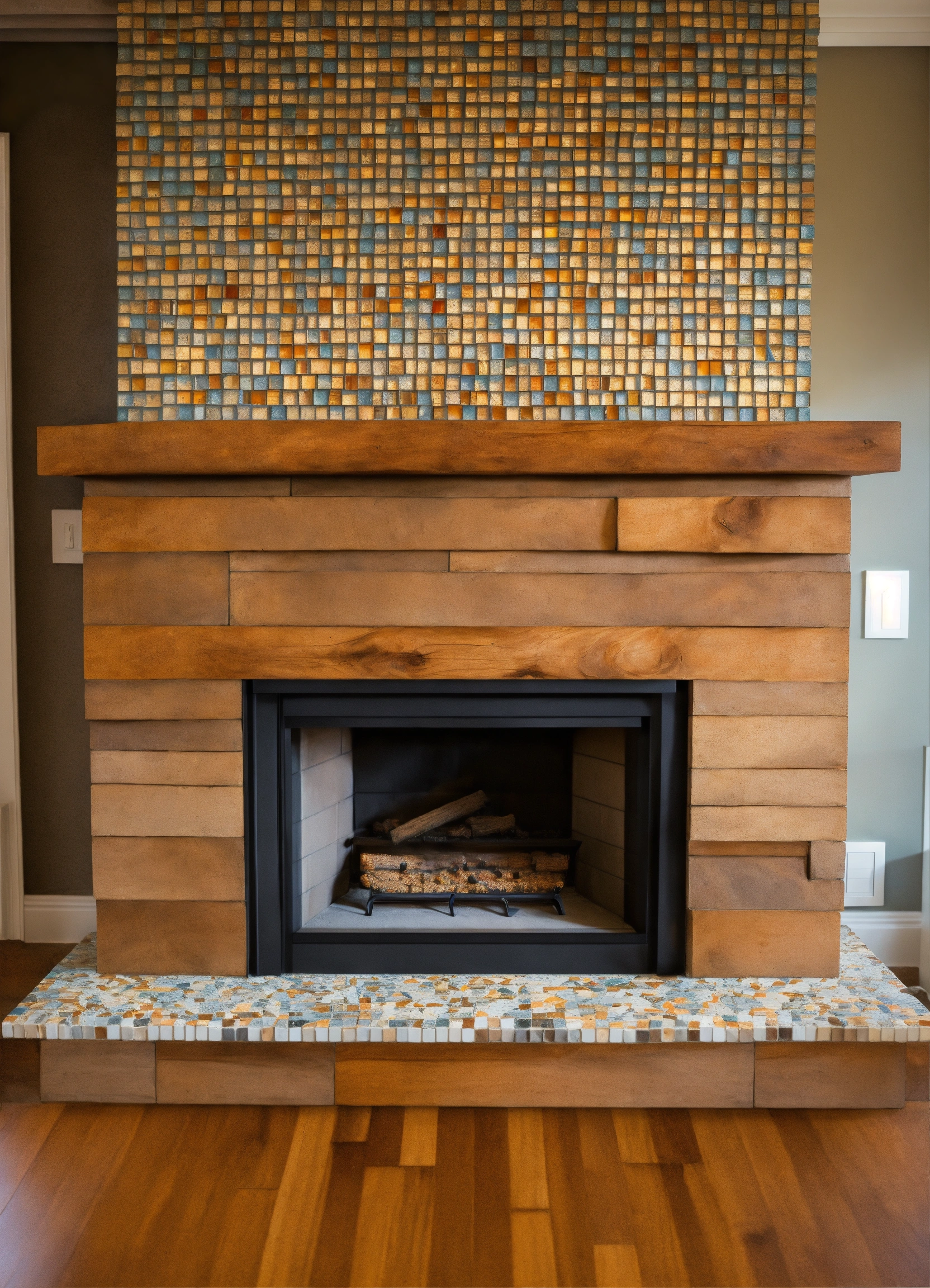 A floating, natural wood mantle over a fireplace, mosaic tiles surrounding a rectangular fireplace, 4k, hd