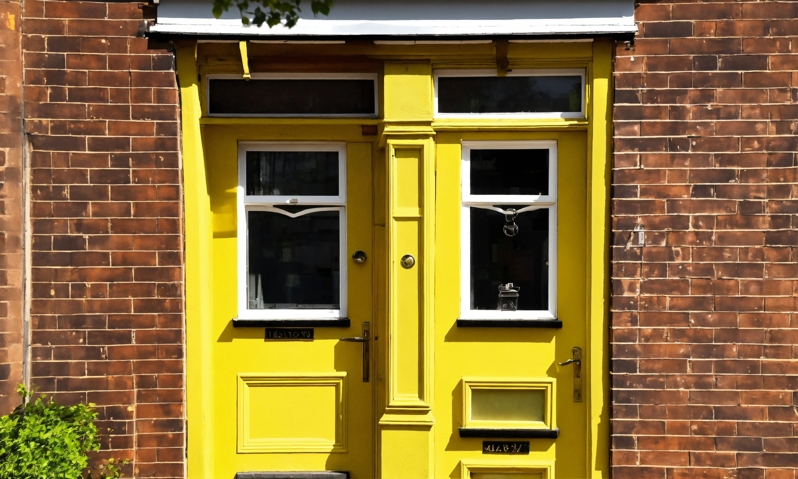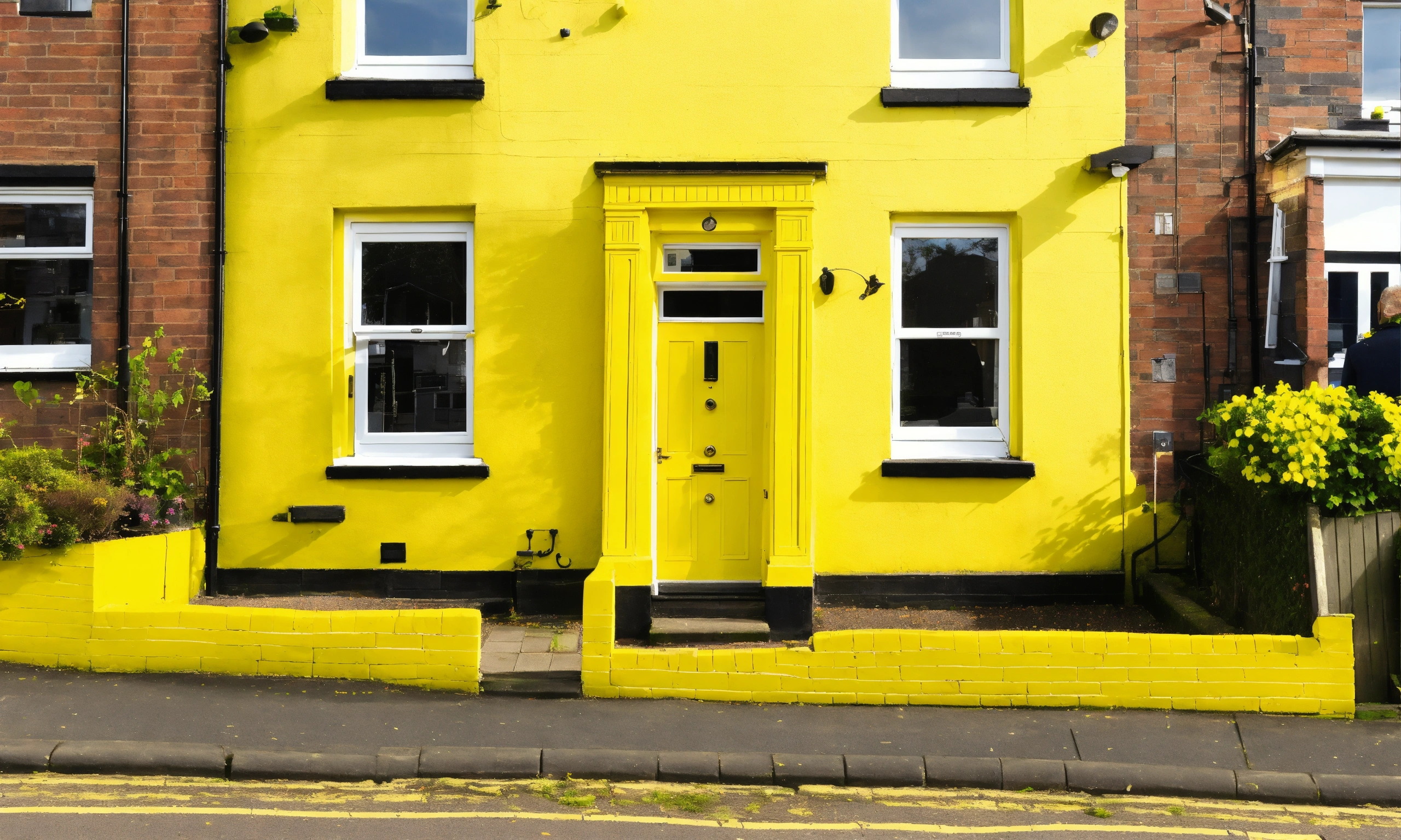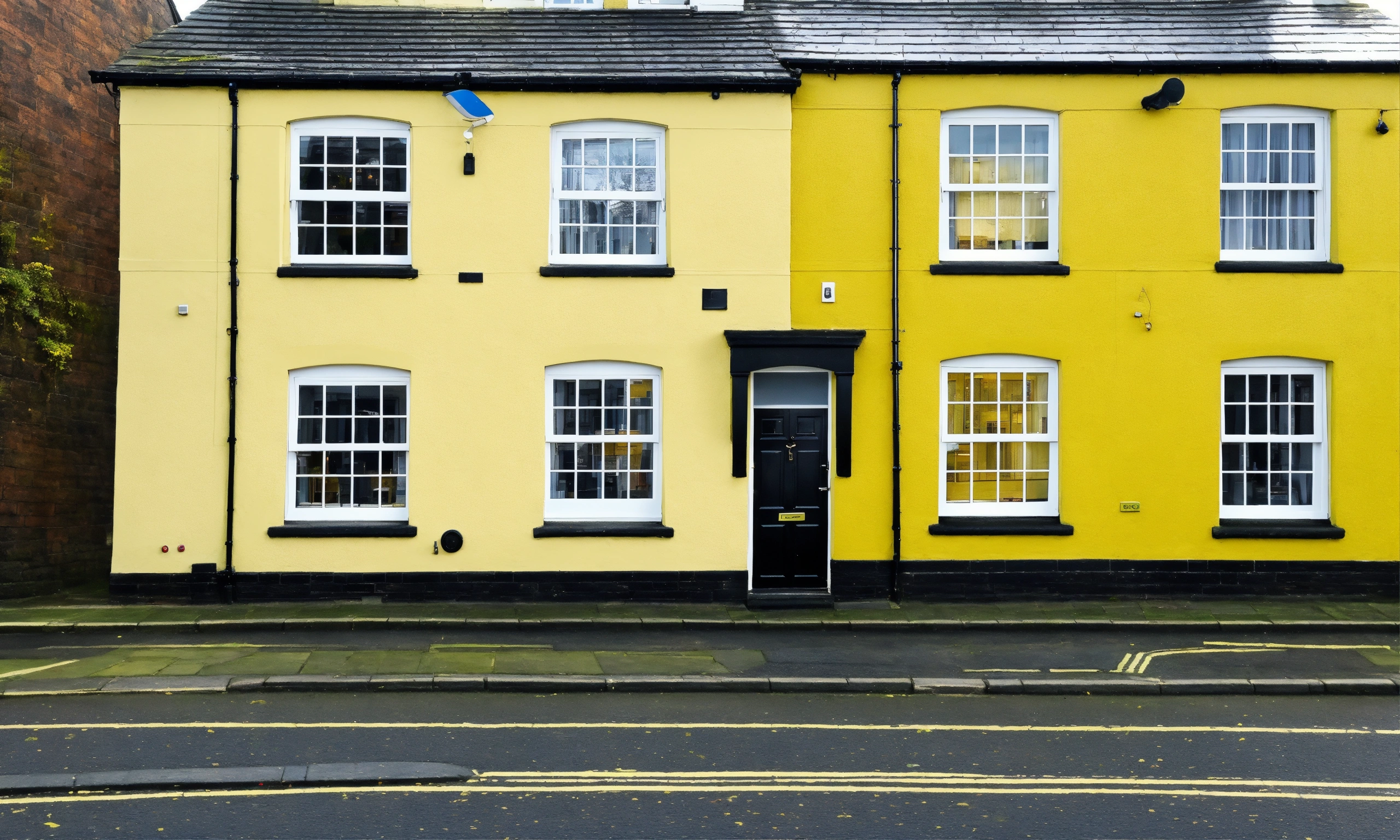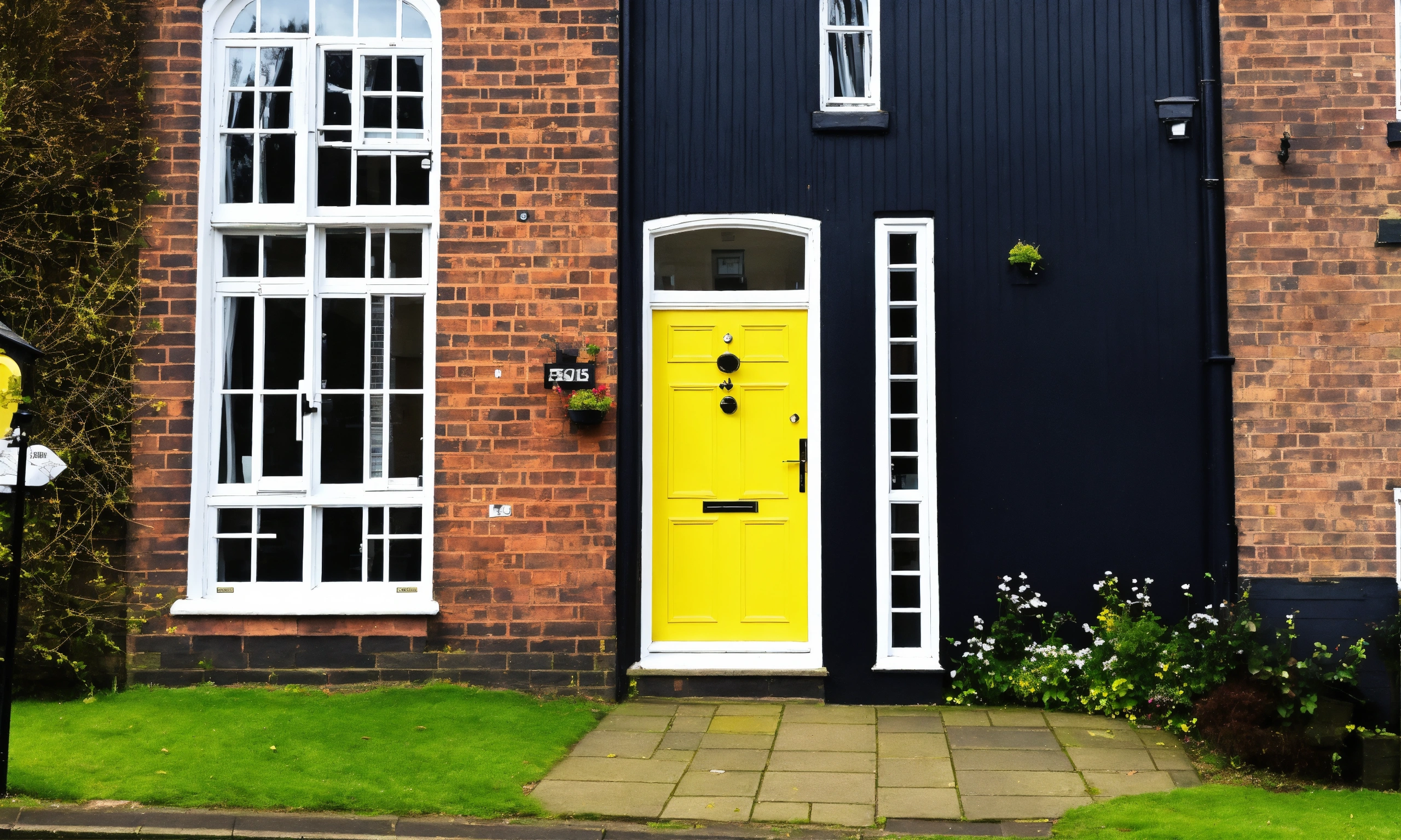 Show the facade of a typical middle class house in macclesfield uk, black and white color house and yellow door house in manchester.