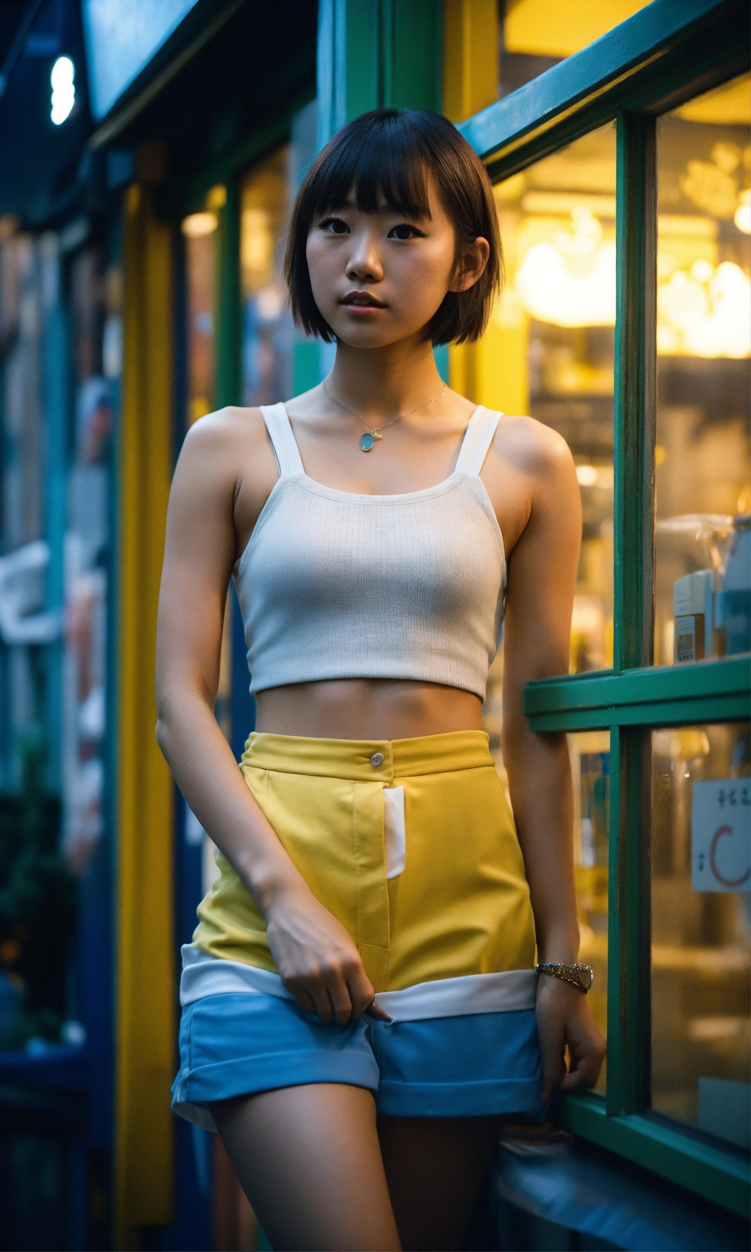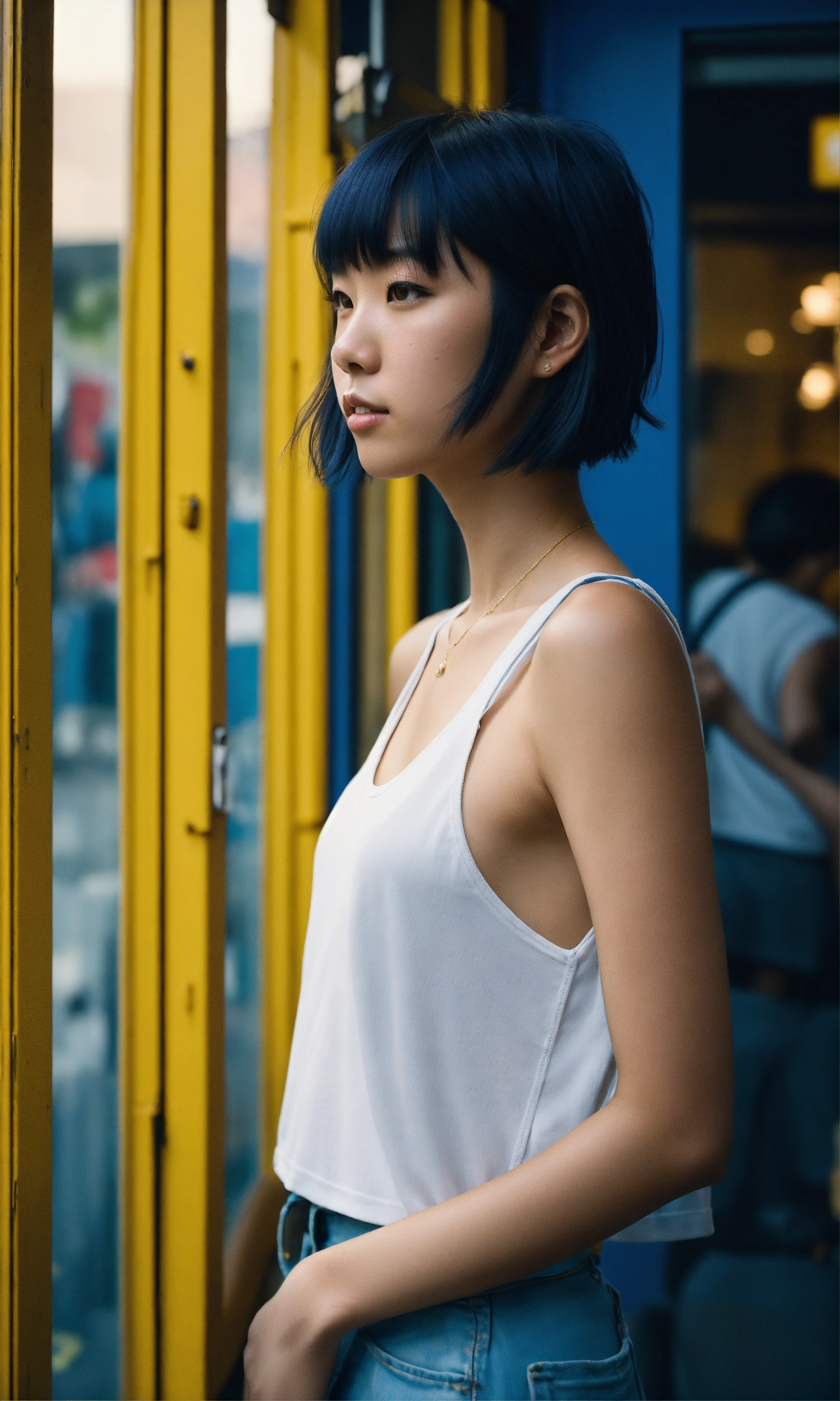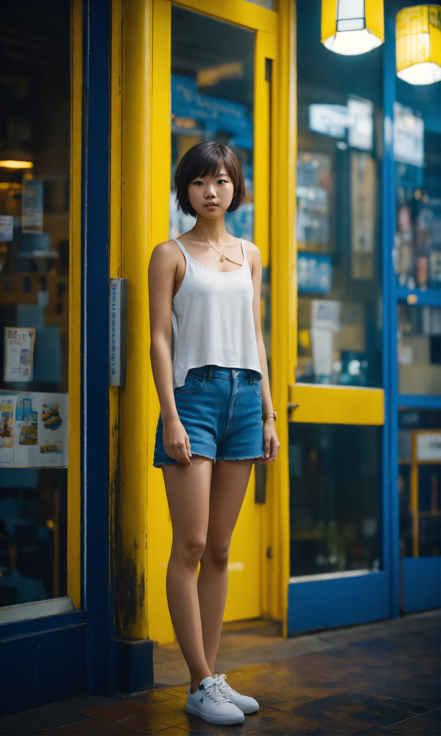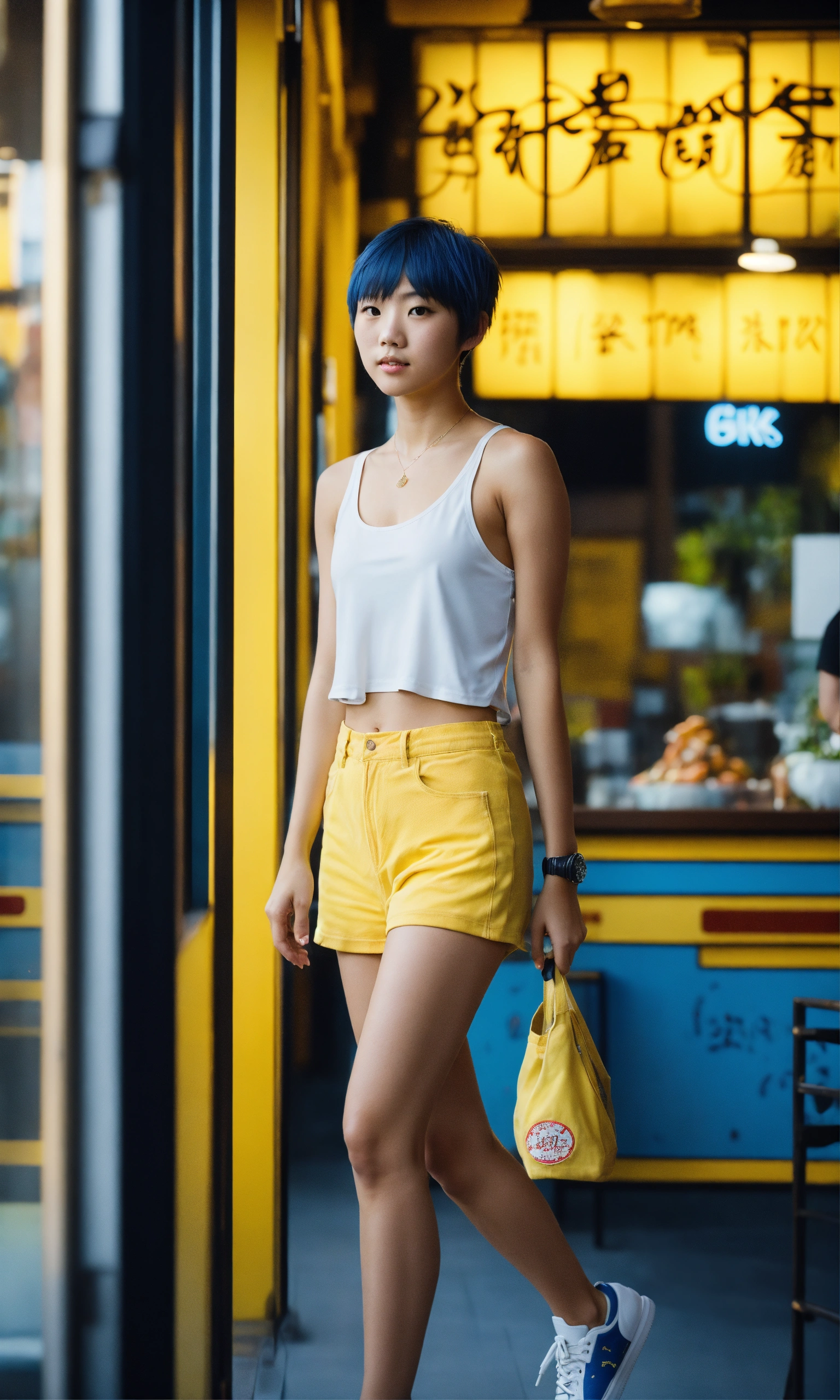 8k full body shot portrait of an extremely attractive, fit, and cute japanese young college girl in a white tank top with pixie cut hair, entering a yellow and blue restaurant in the space in the early morning, highly detailed, production cinematic, reflections on the store windows, 8k, film grain, extremely realistic, shot on hasselblad with 40 mm zeiss lens