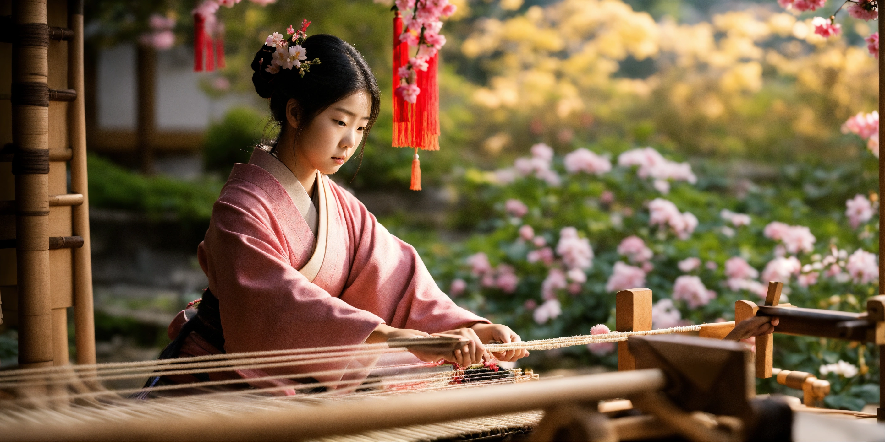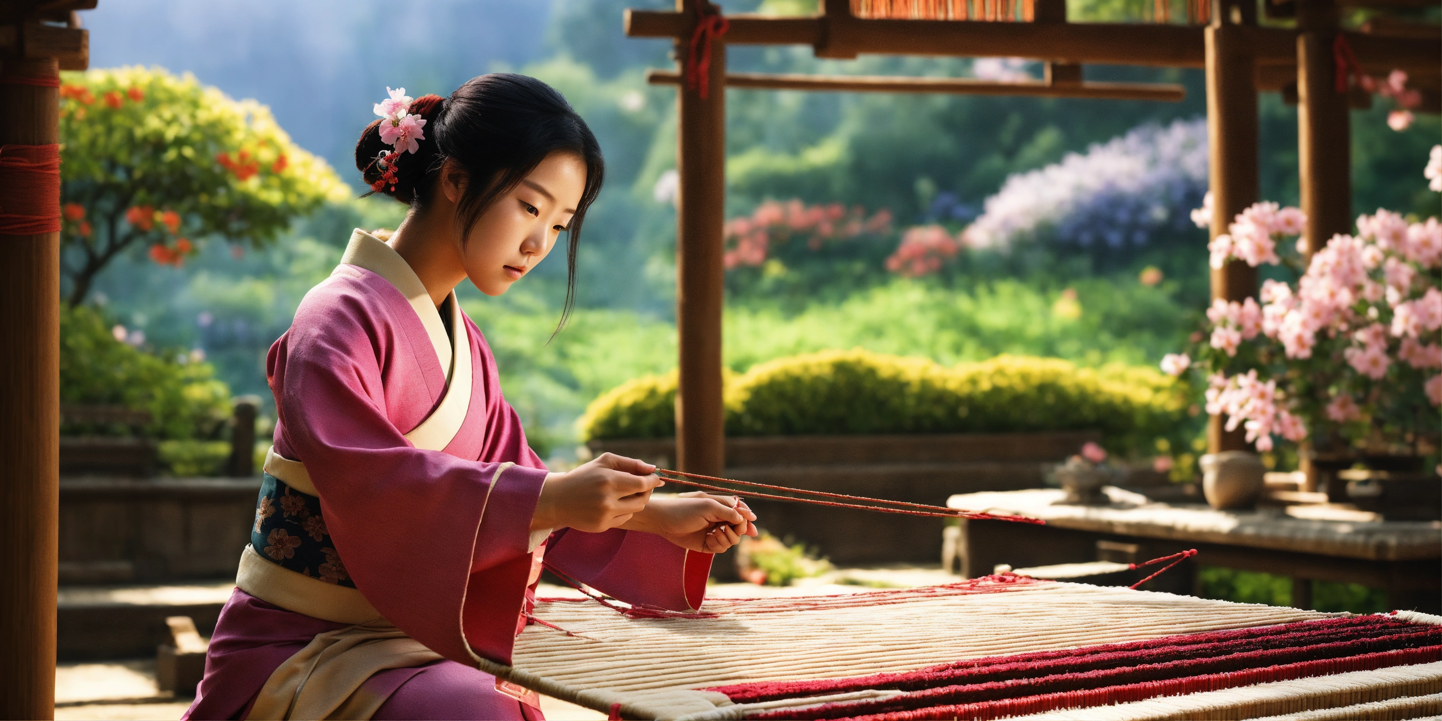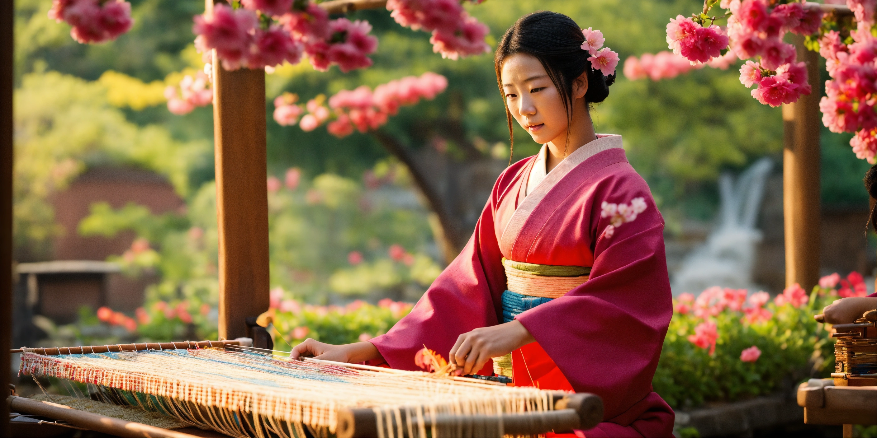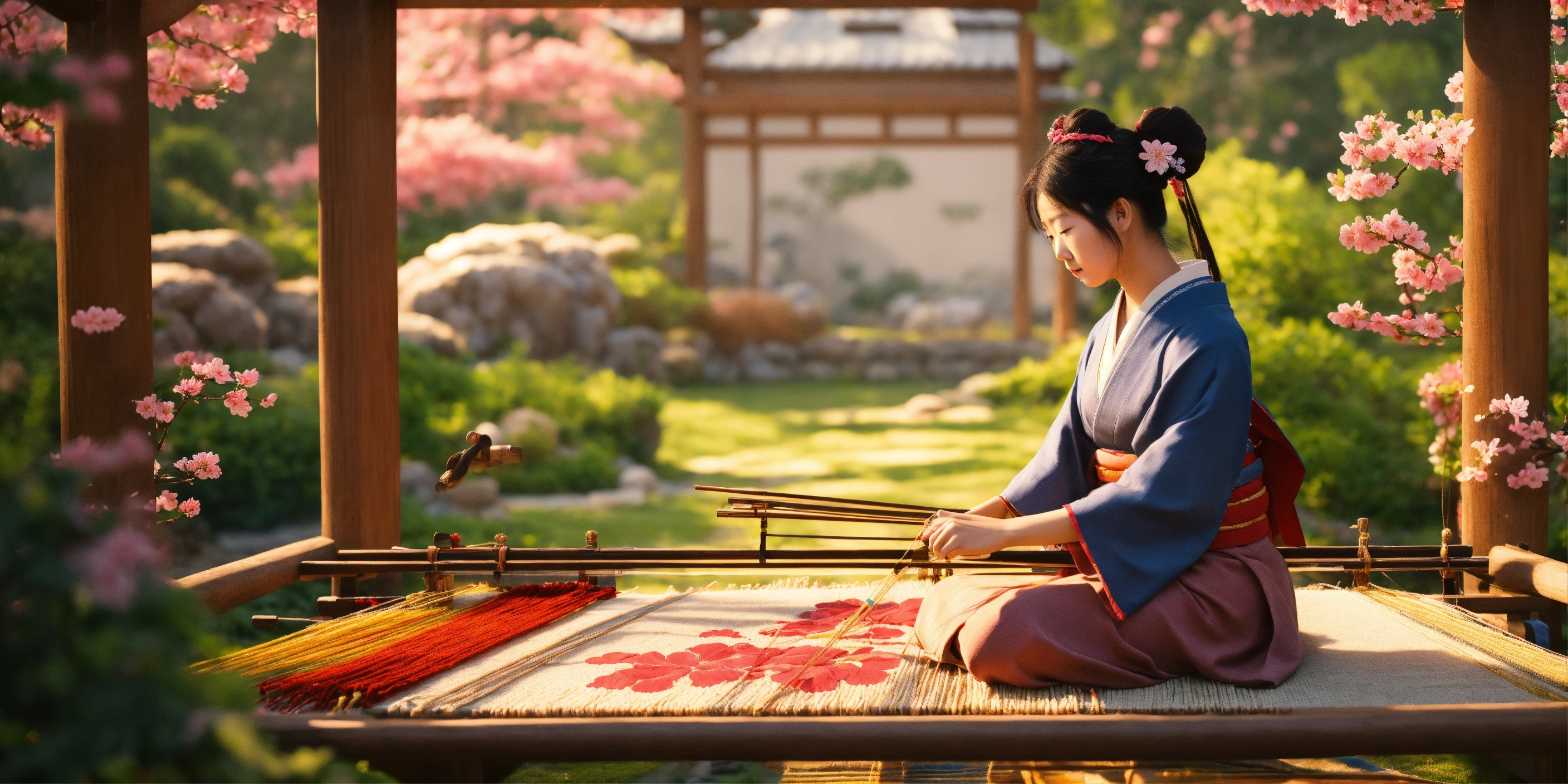 8k image of young sakura, a japanese woman, weaving her carpet on a handmade loom and in the background a beautiful garden with flowers
