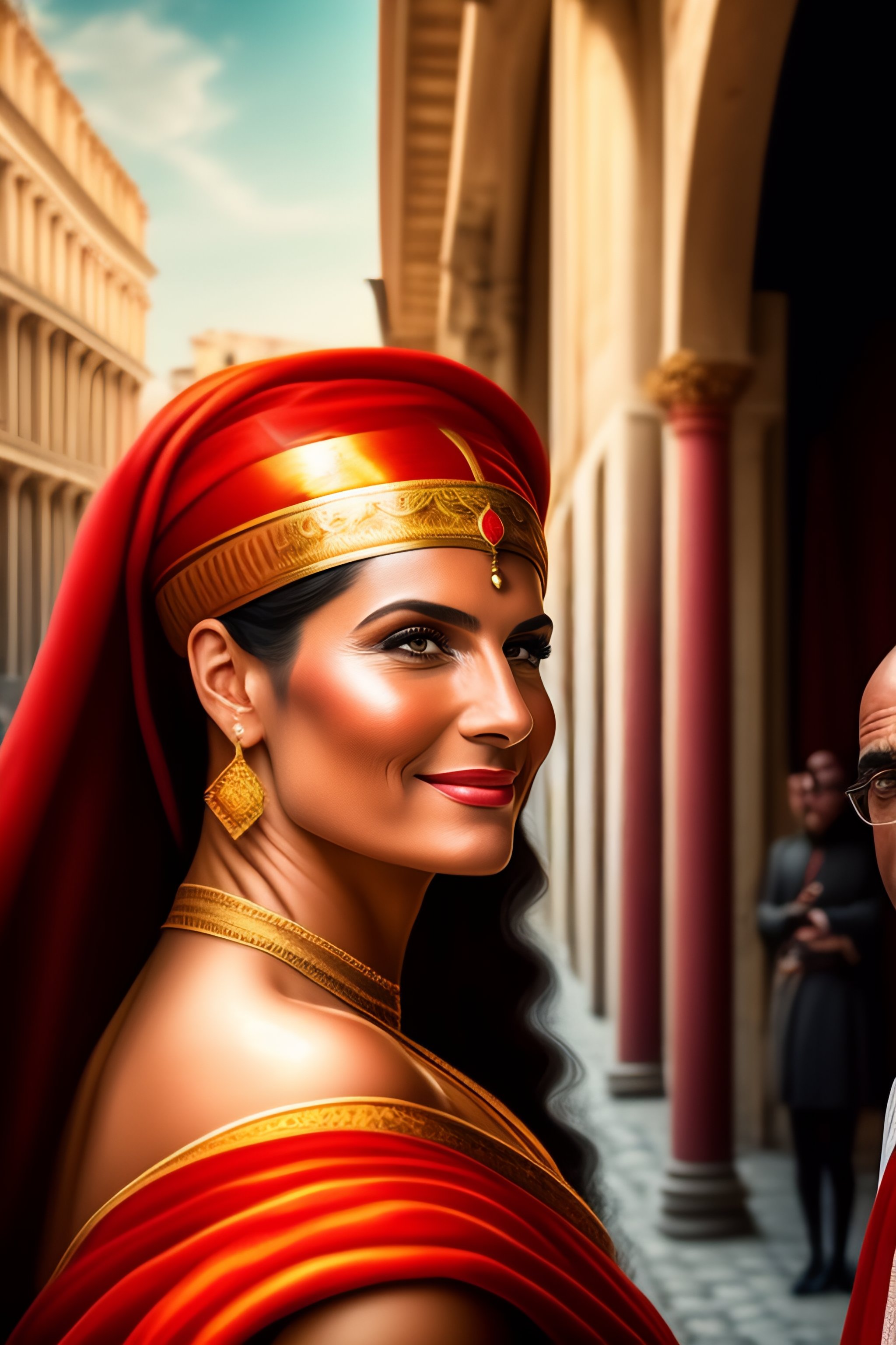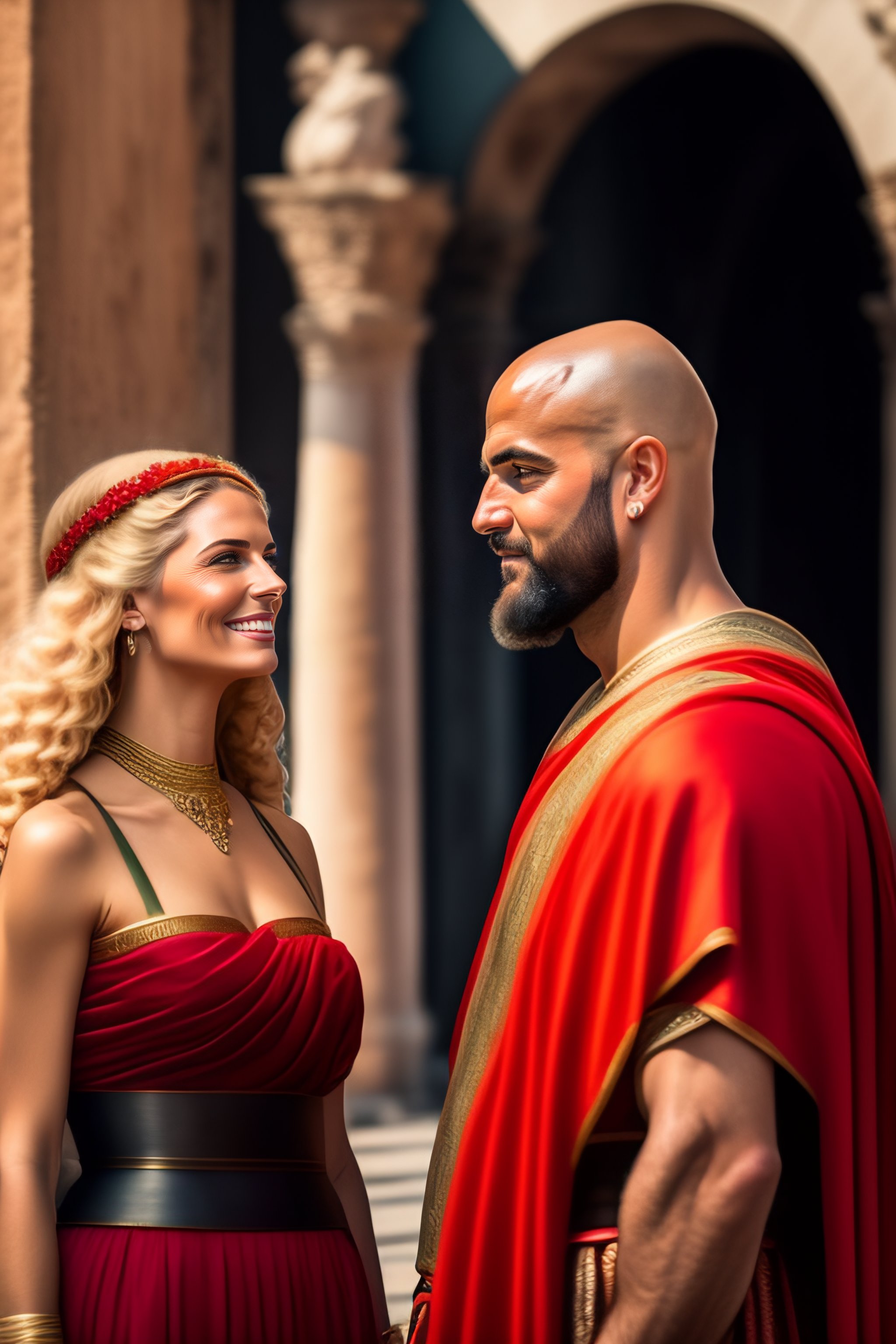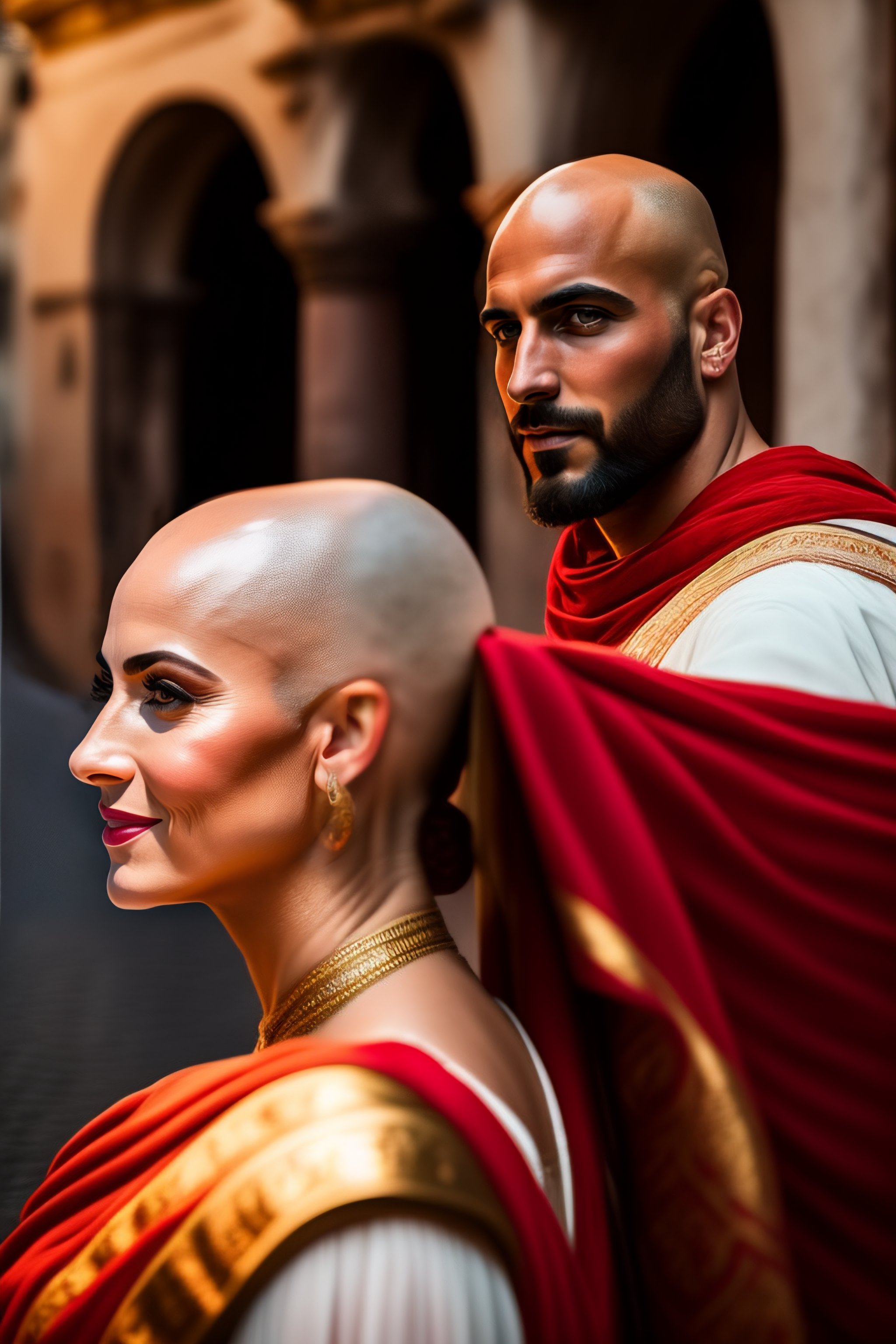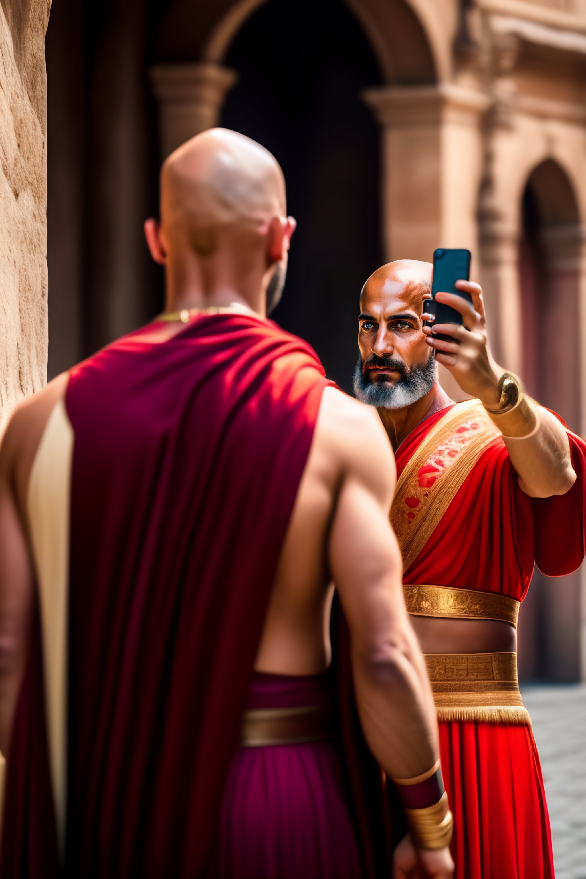 Portrait of a bald roman man taking a selfie in a street of antique roma, coliseum, 46 before christ, in a red roman toga, while a beautiful roman blond woman staring at him with surprise
