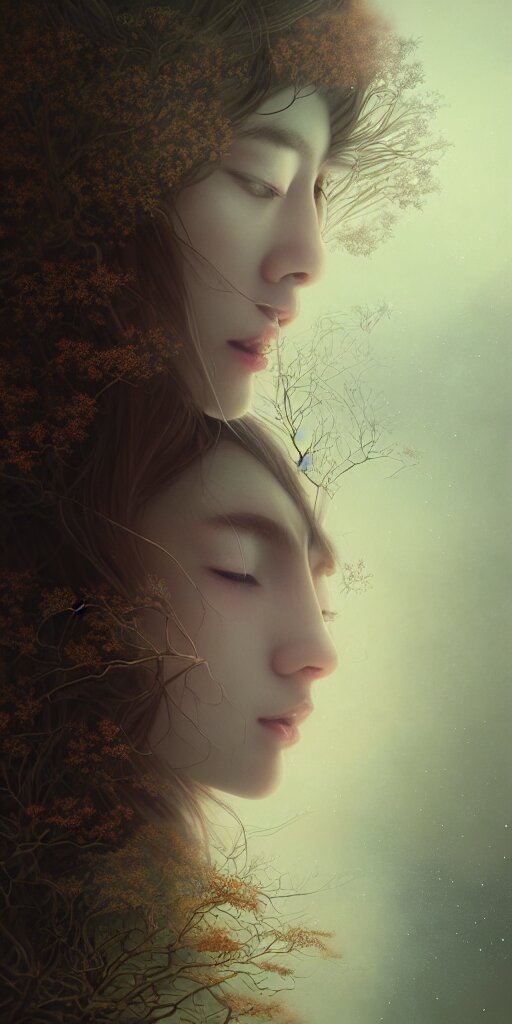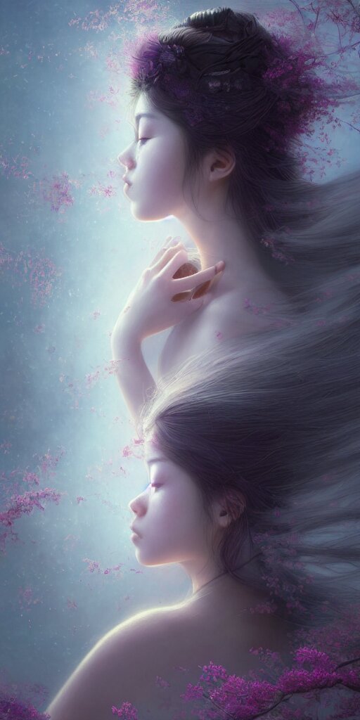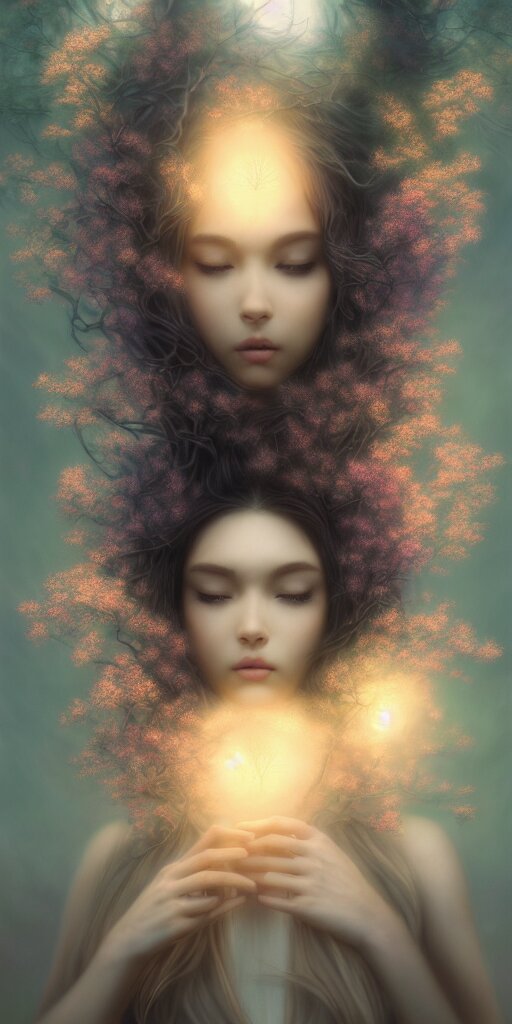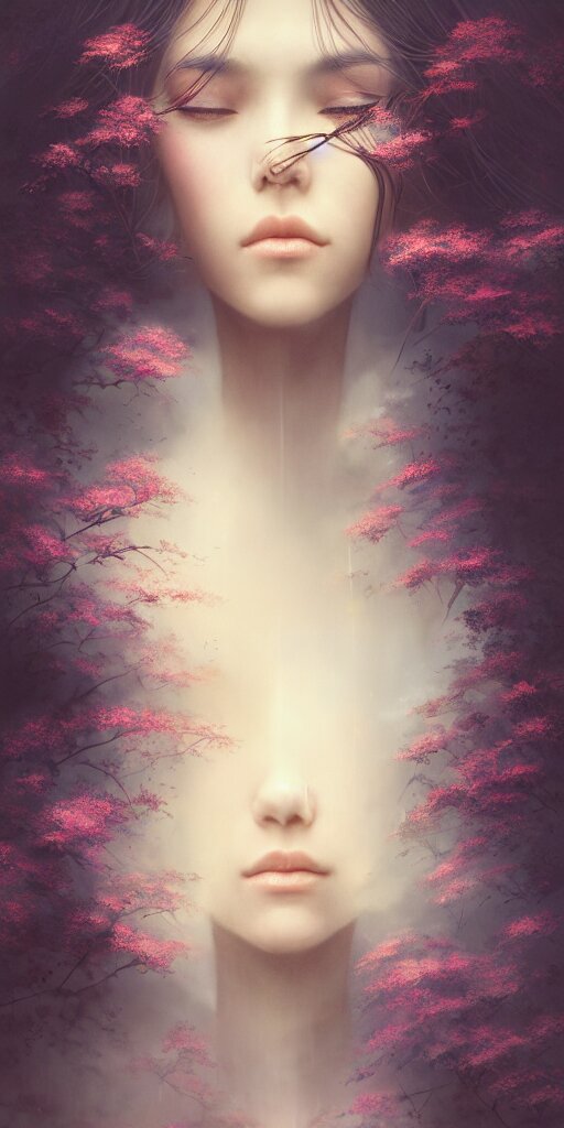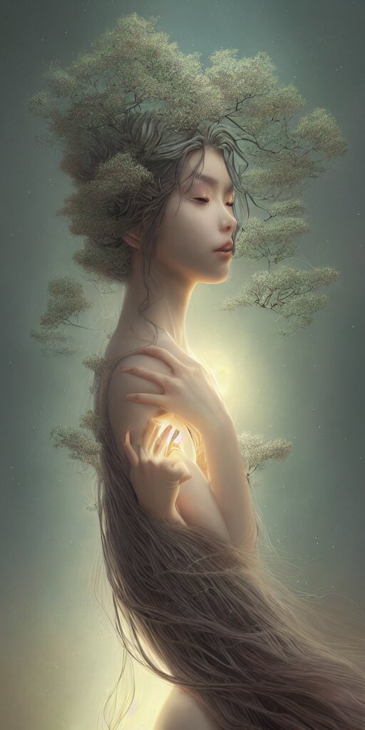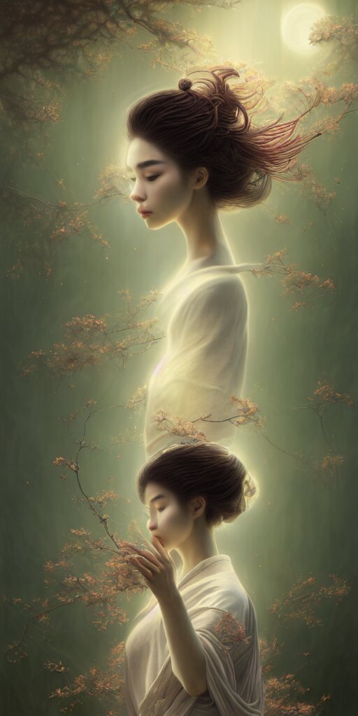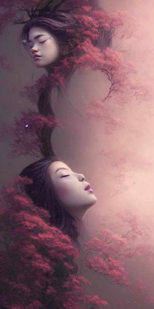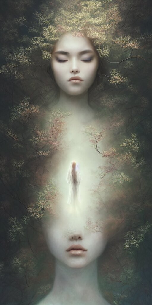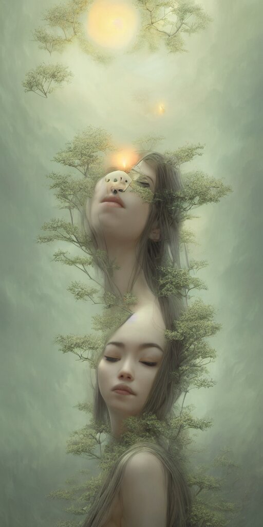 Breathe into euphoria, alterd carbon, madison beer, half - woman half - tree, many heads fractal infinite, geisha, dreamy ethereal vibe, atmospheric, detailed intricate render, fibbonacci, detailed illustration, hd, 4 k, digital art, overdetailed art, surrealistic, by greg rutkowski, by loish, laura sava, slavic traditional trending on artstation, deviantart