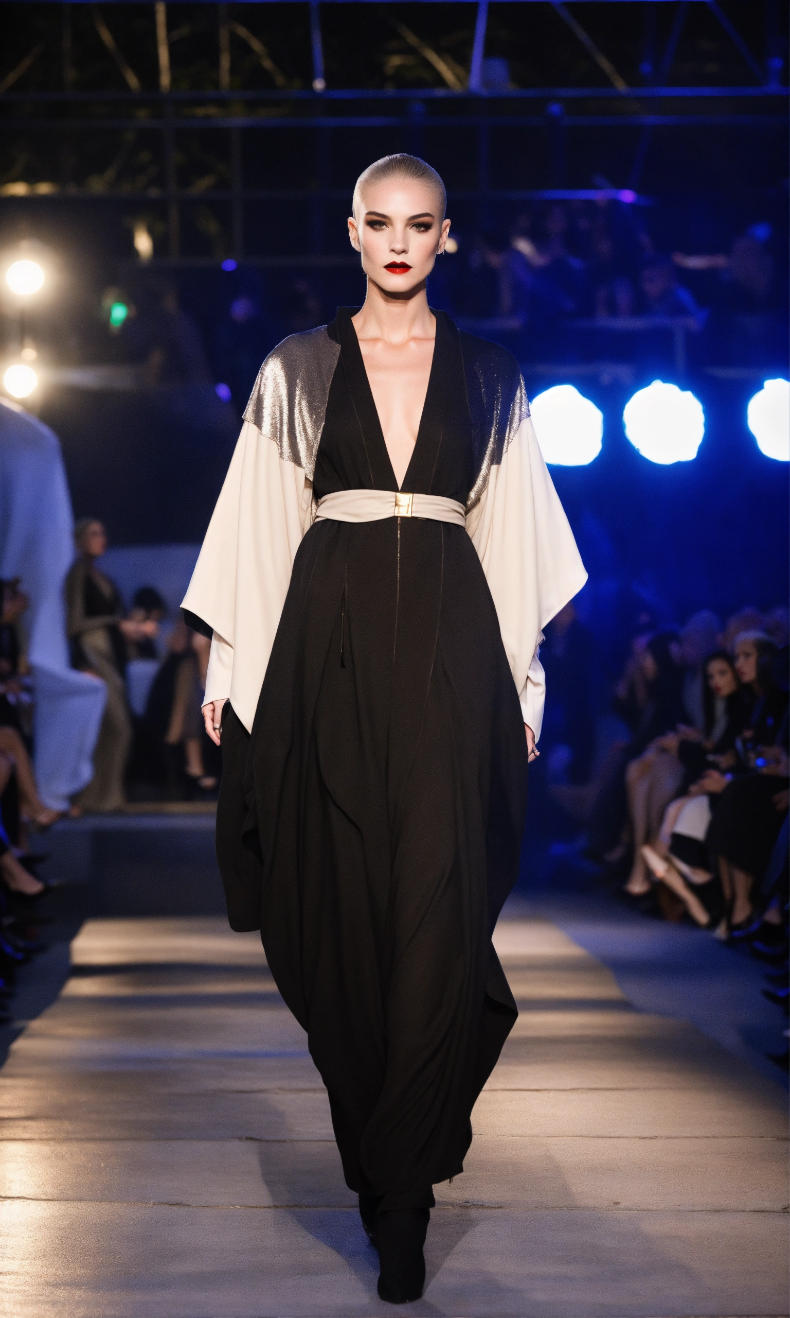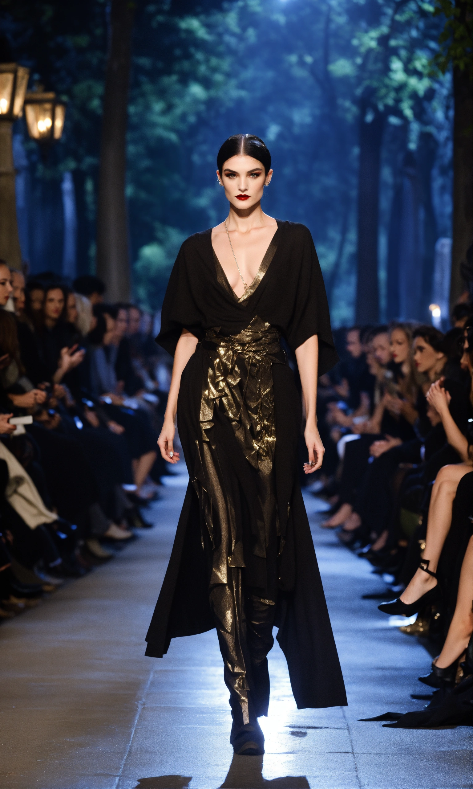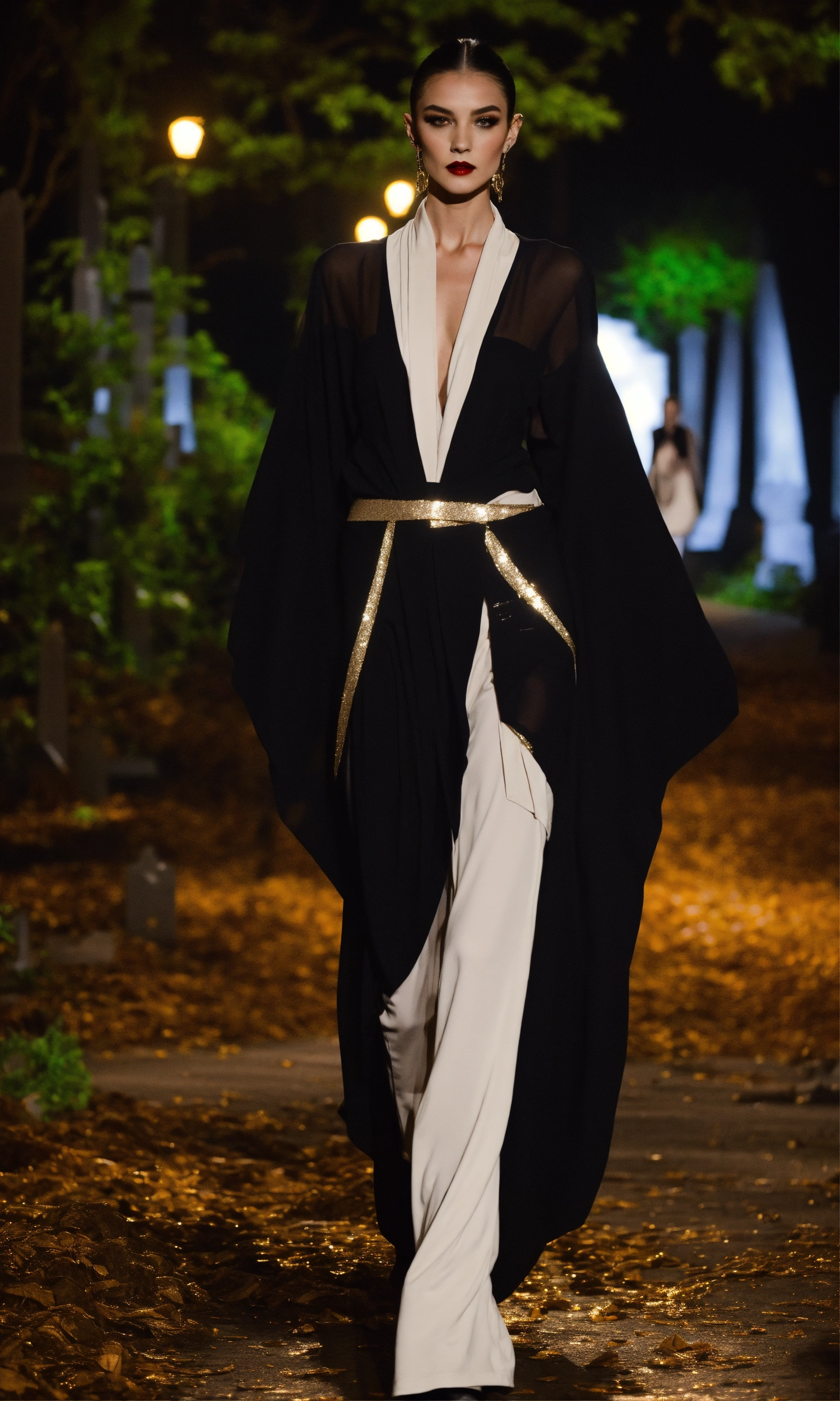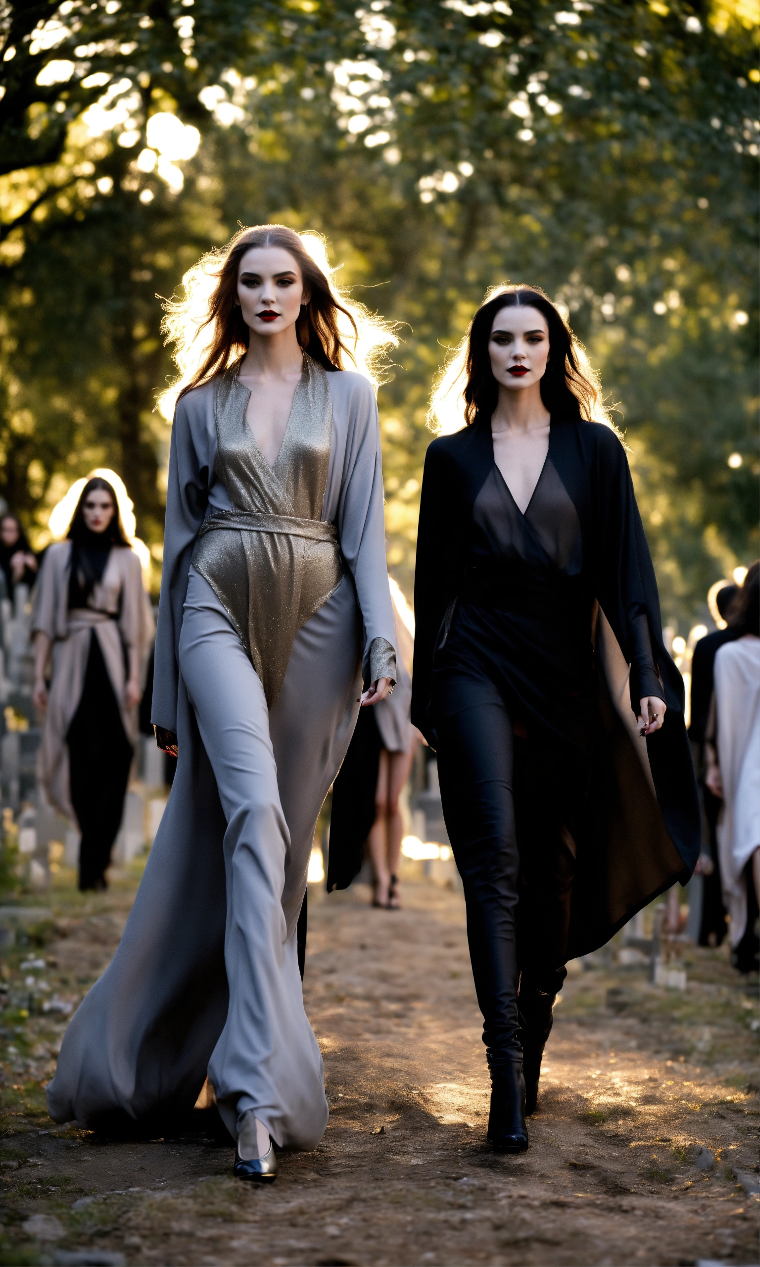 Lothlorien androgynous vampires walking runway during vamp fashion week wearing dolman sleeve dark donna karan vamp fashion in black, white, grey, beige, stone, metallics, shimmer at a cemetery runway at bright nighttime