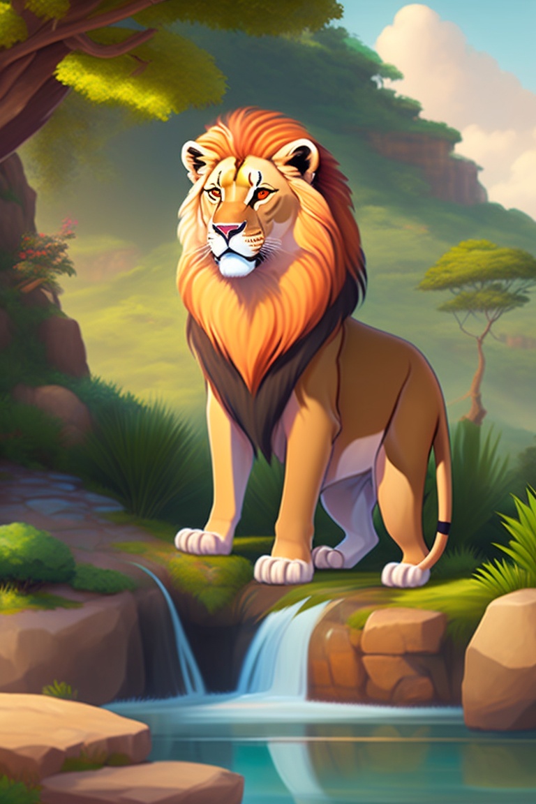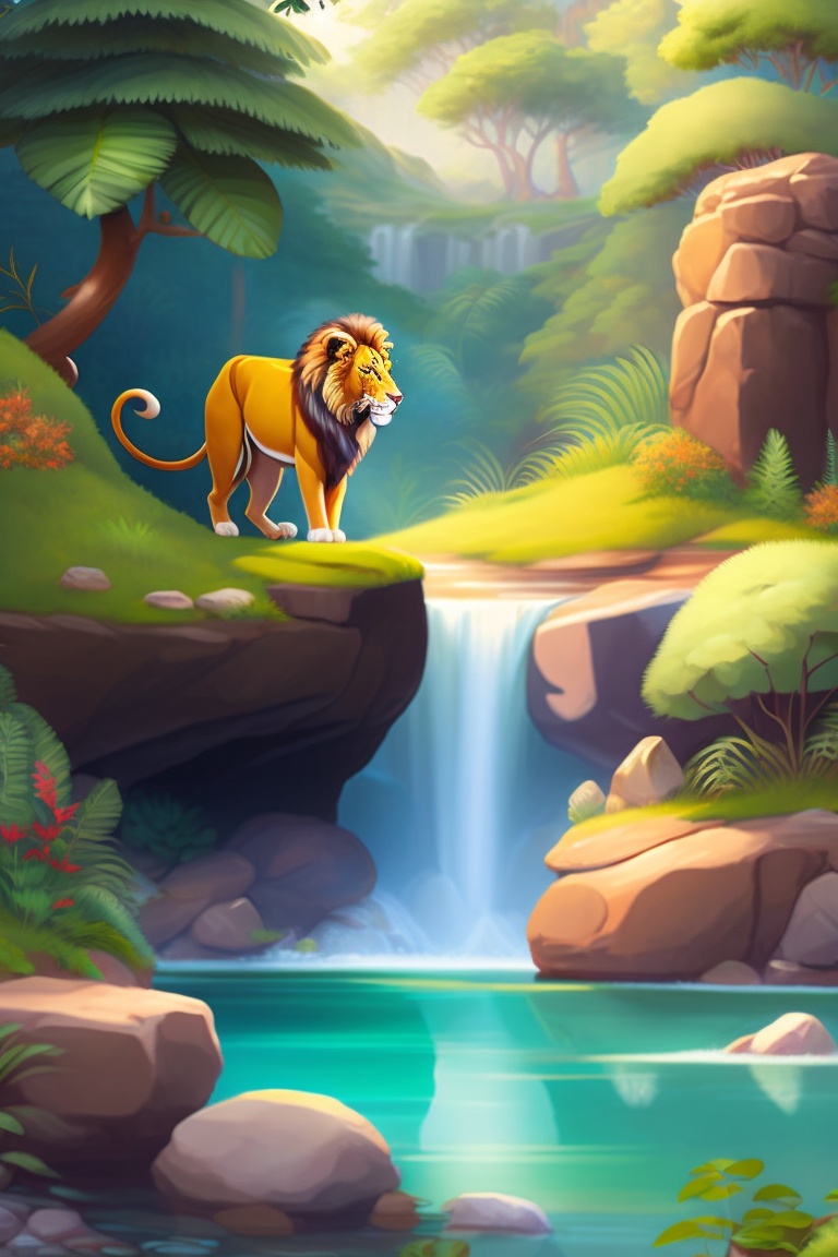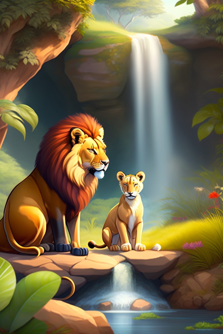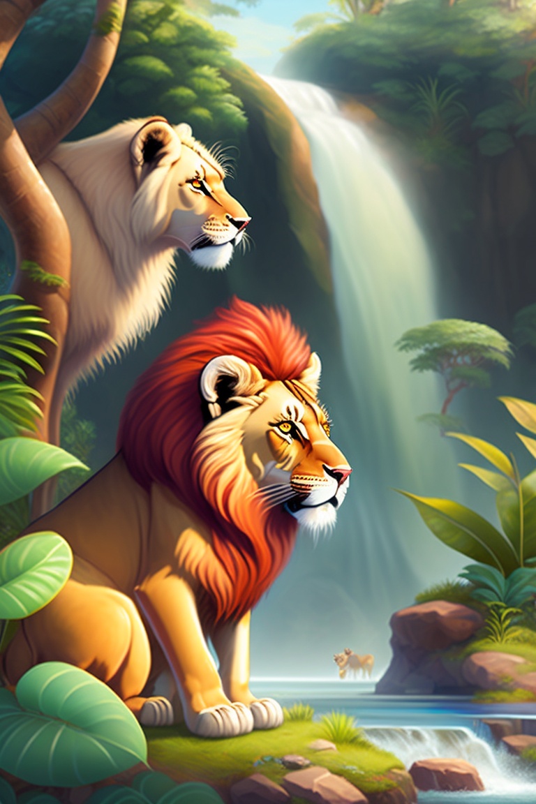 Beautiful jungle with a waterfall, a lion family drinking water, rocks. style from the cartoon lion king