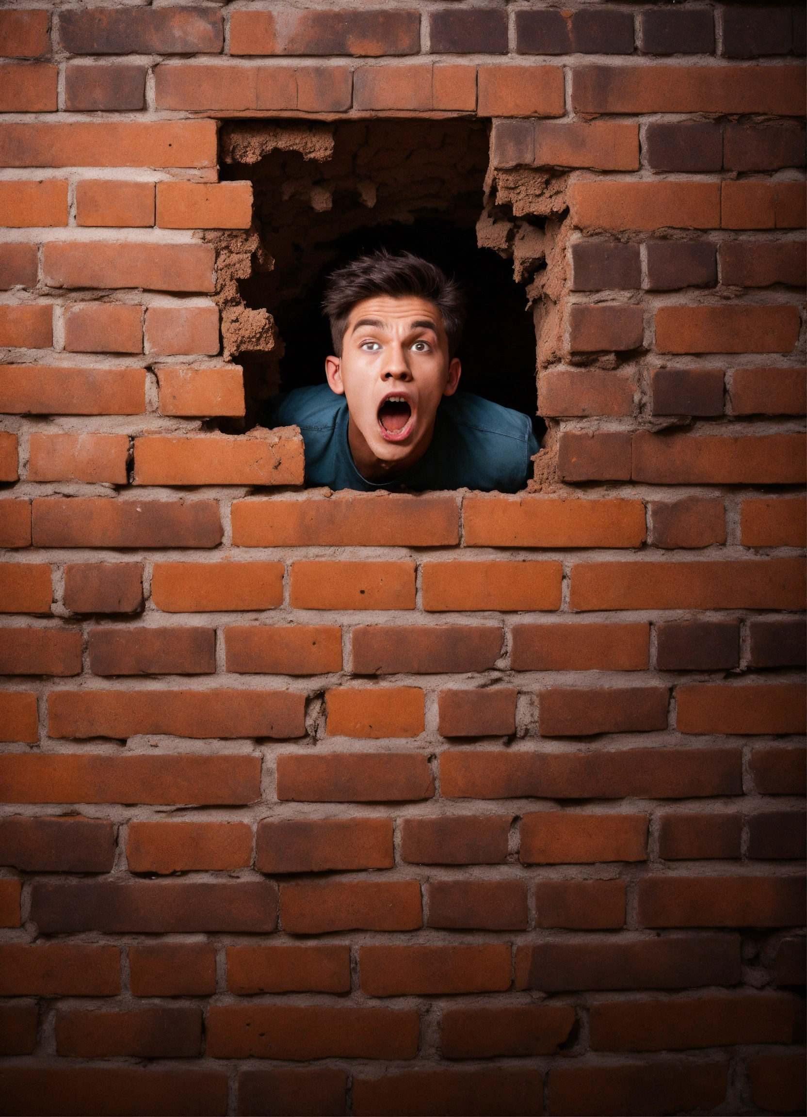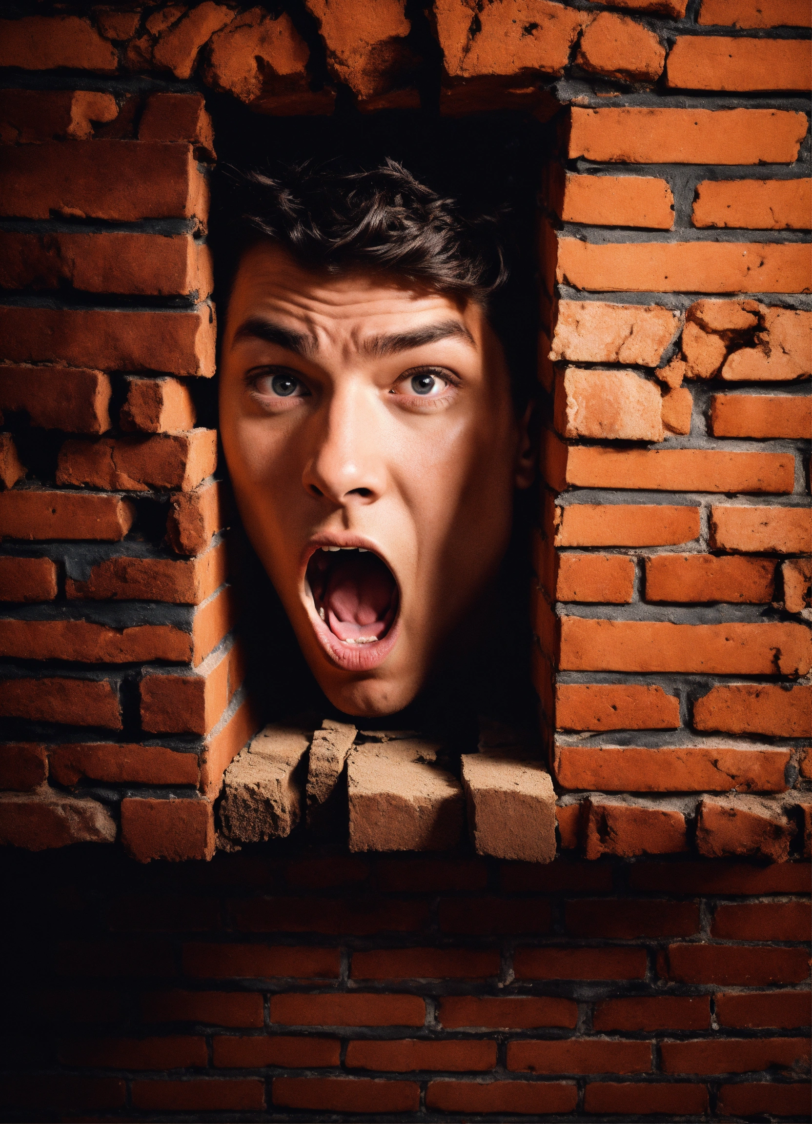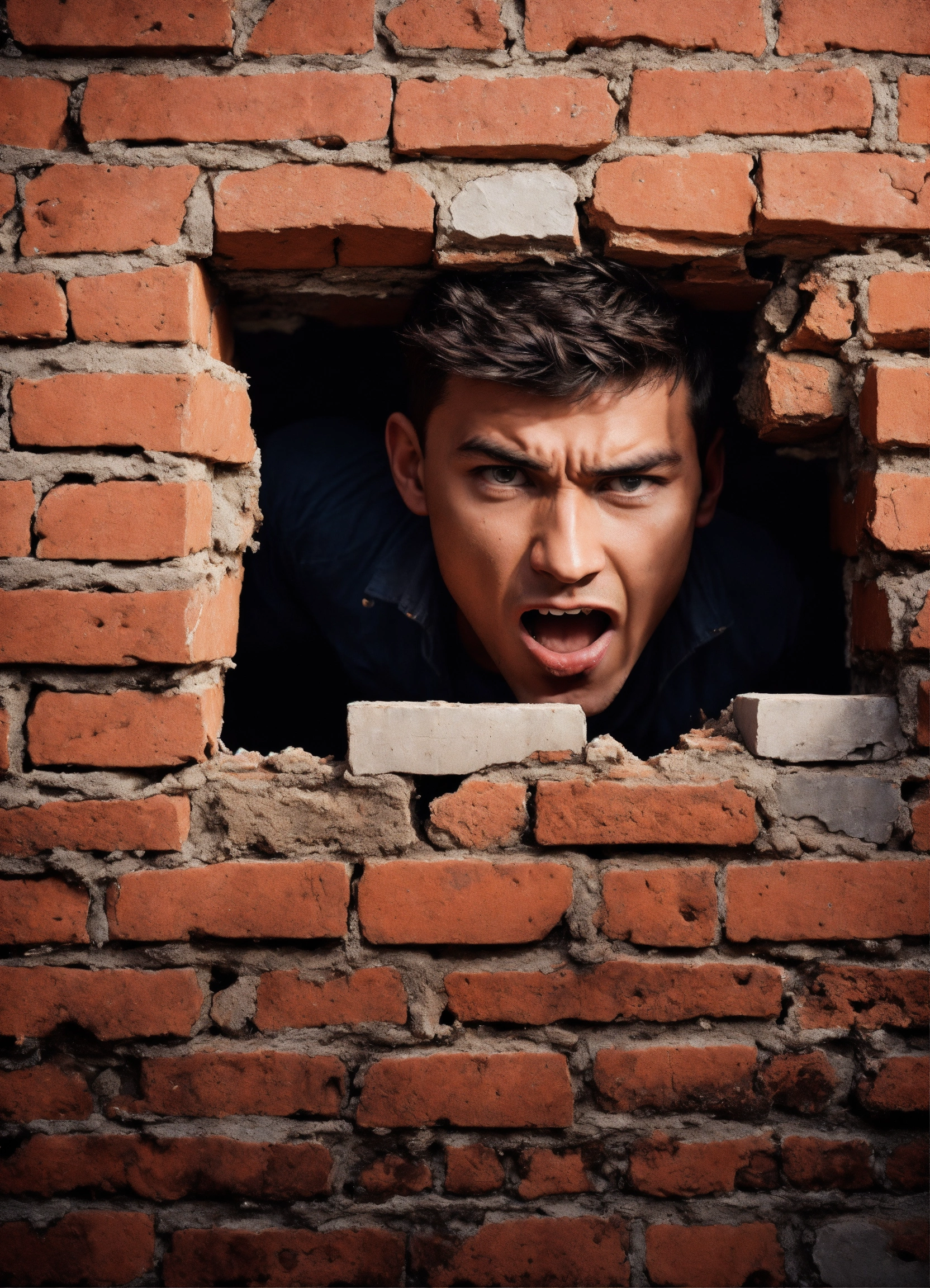 A scary young male bursting his head through a hole in a brick wall and being agressive