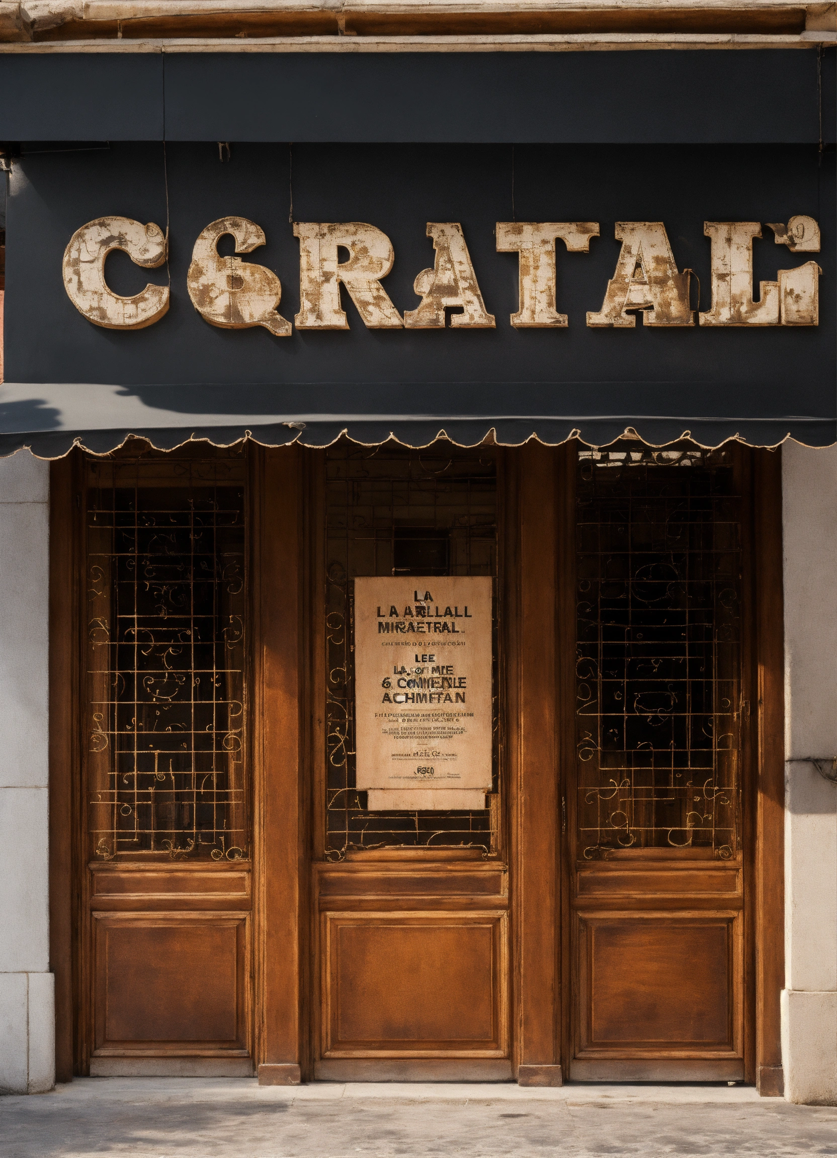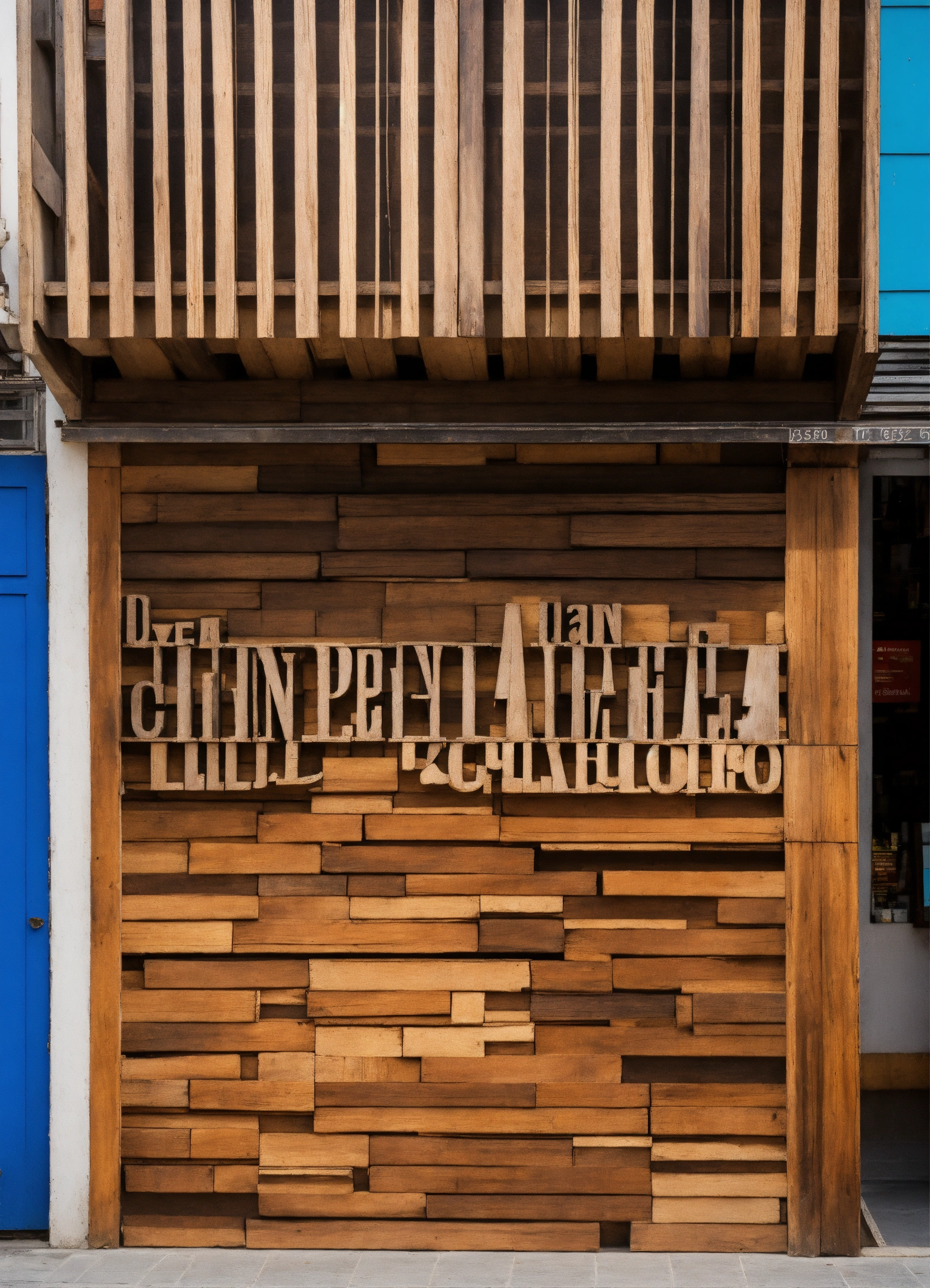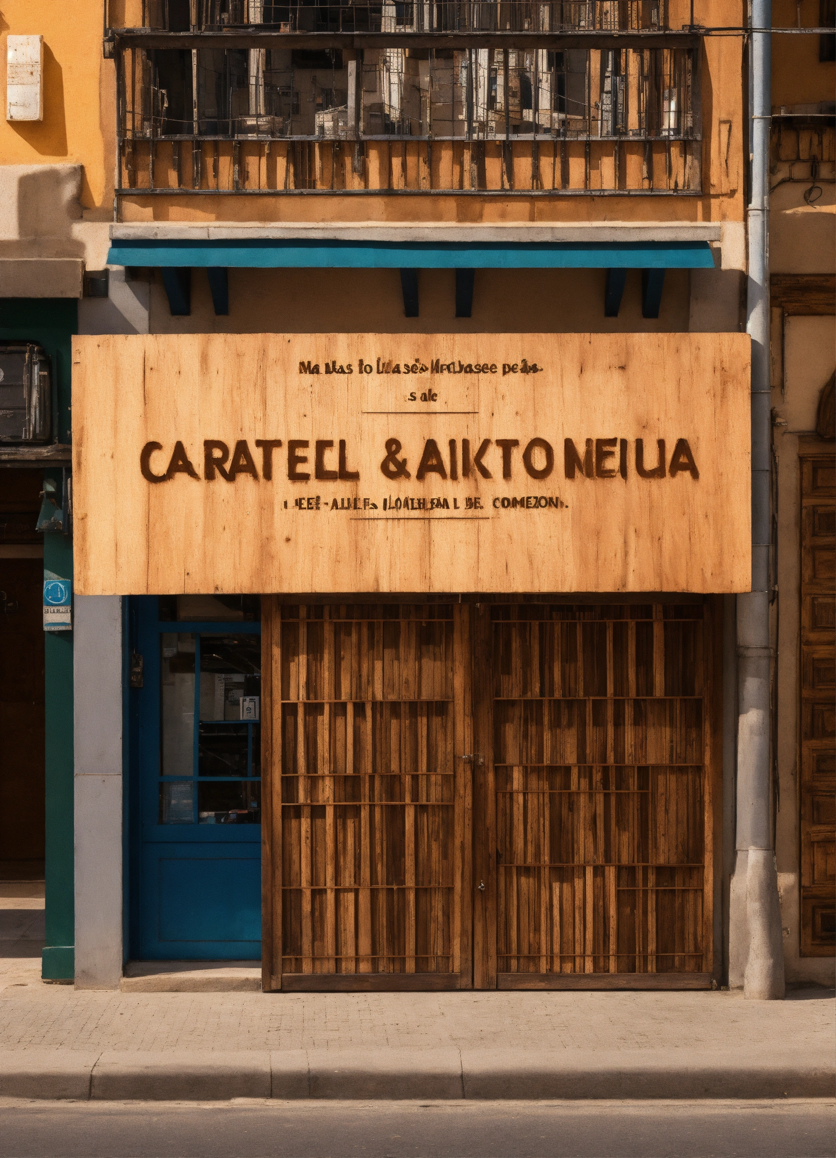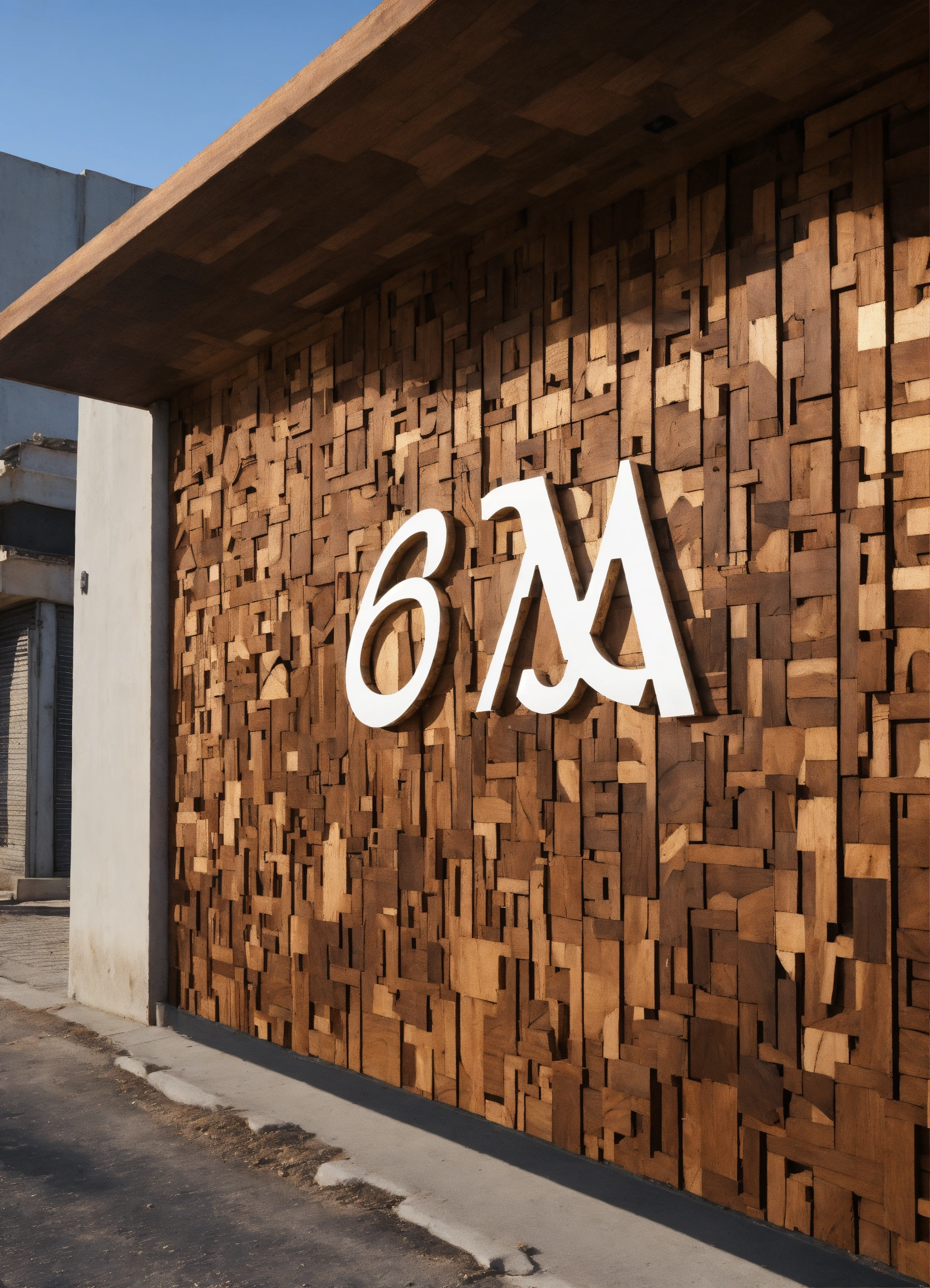 Un cartel para la fachada de un local comercial. la base del cartel sera de madera y las letras en marron. el cartel es de 6 metros por 0, 60 metros de alto