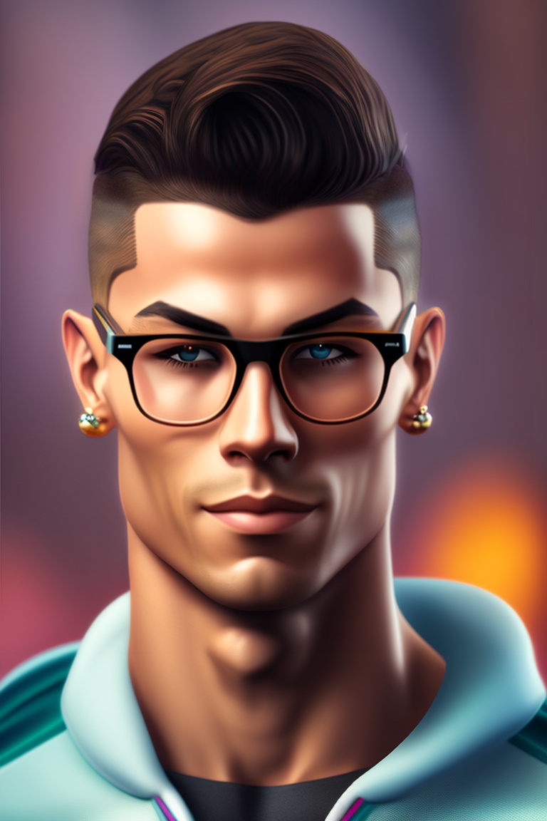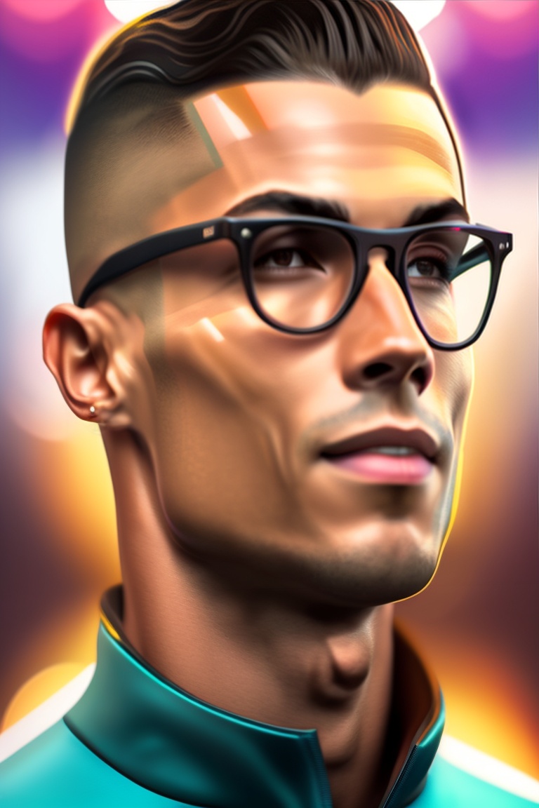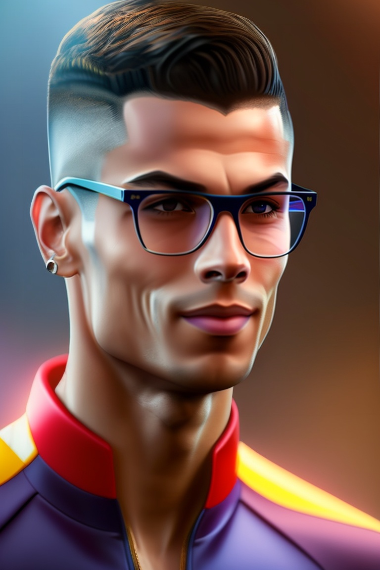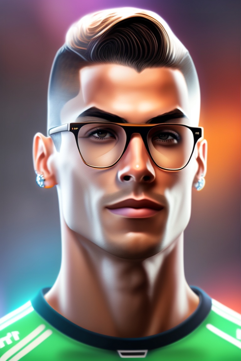 Cristiano ronaldo, podcast recording, glasses, frontal view, blurred background, half body, face forward without a smile