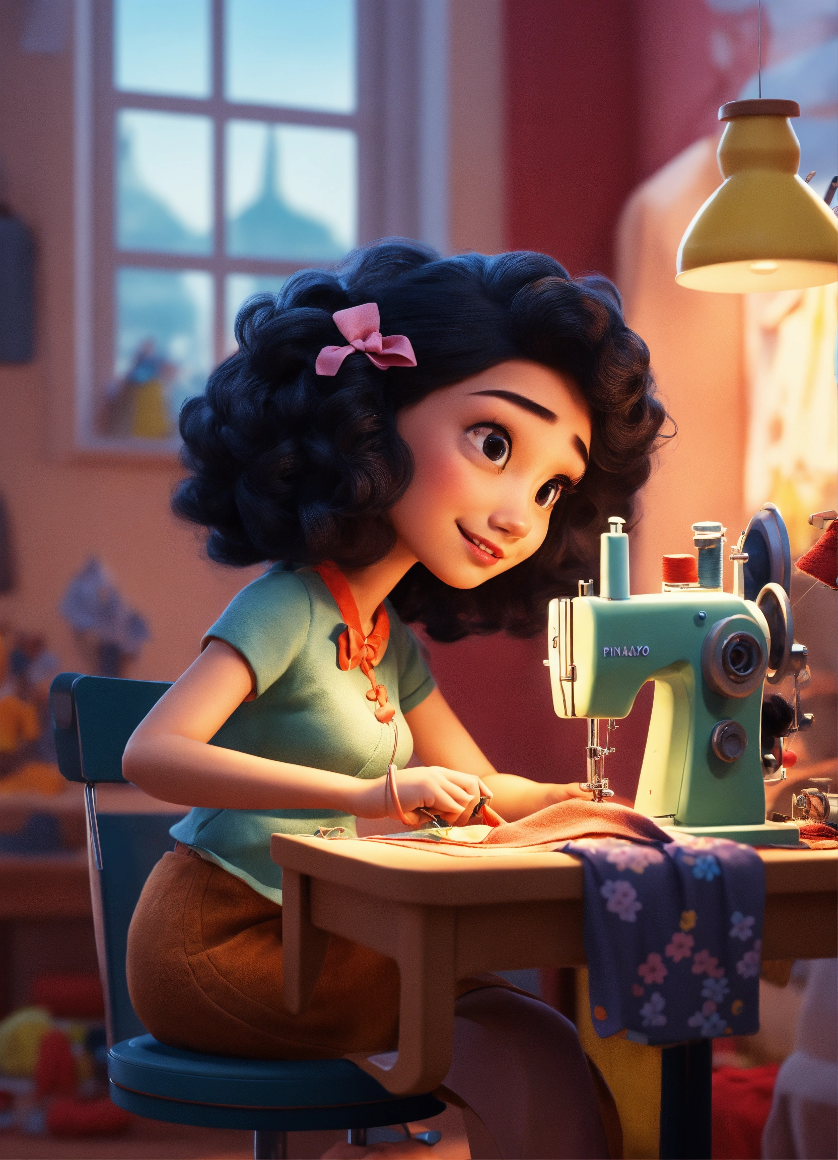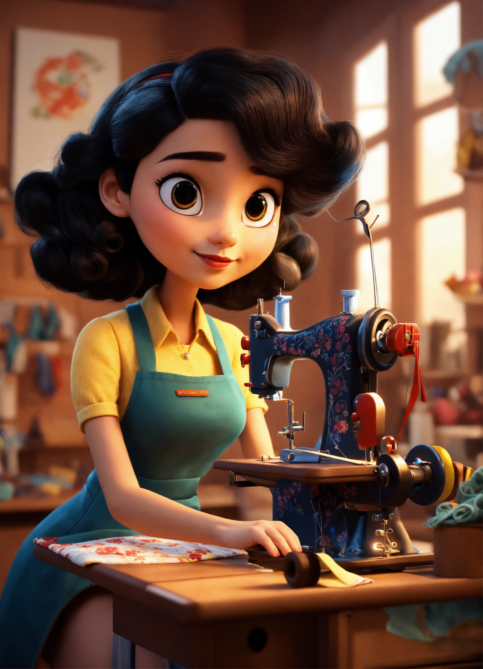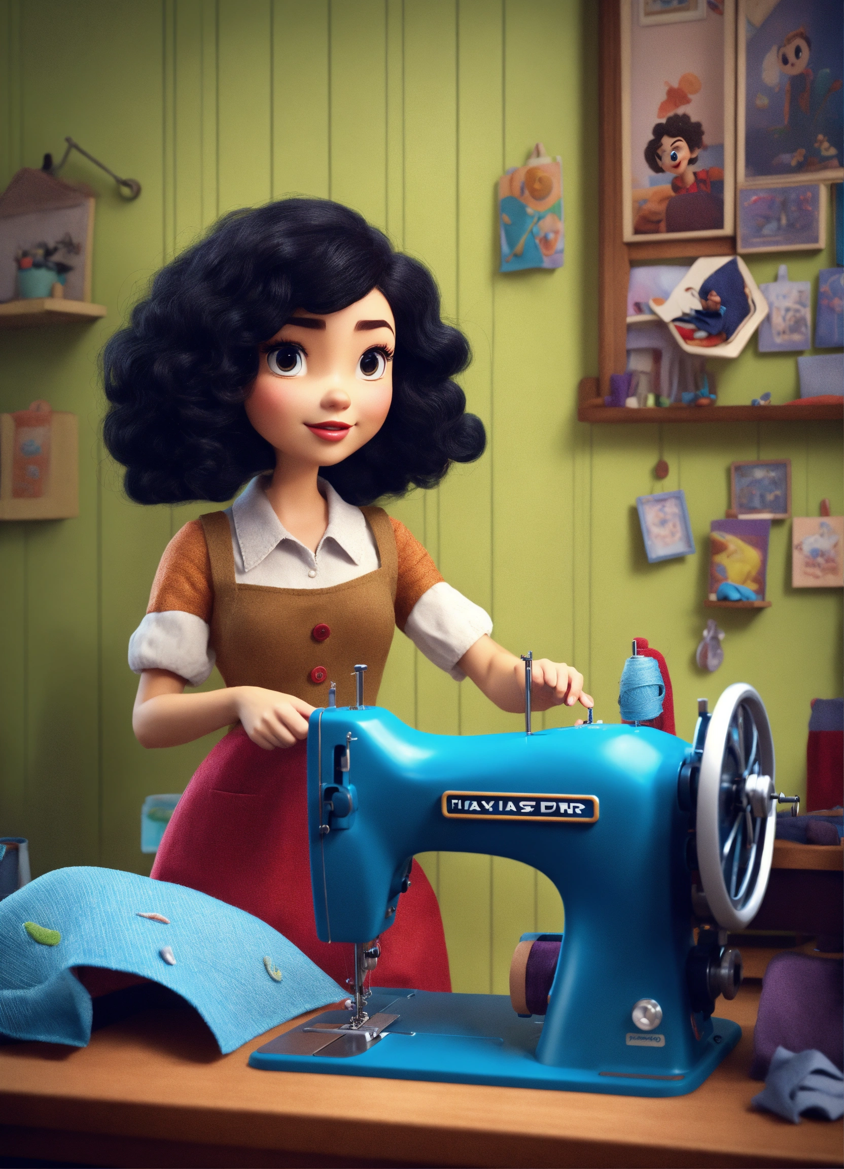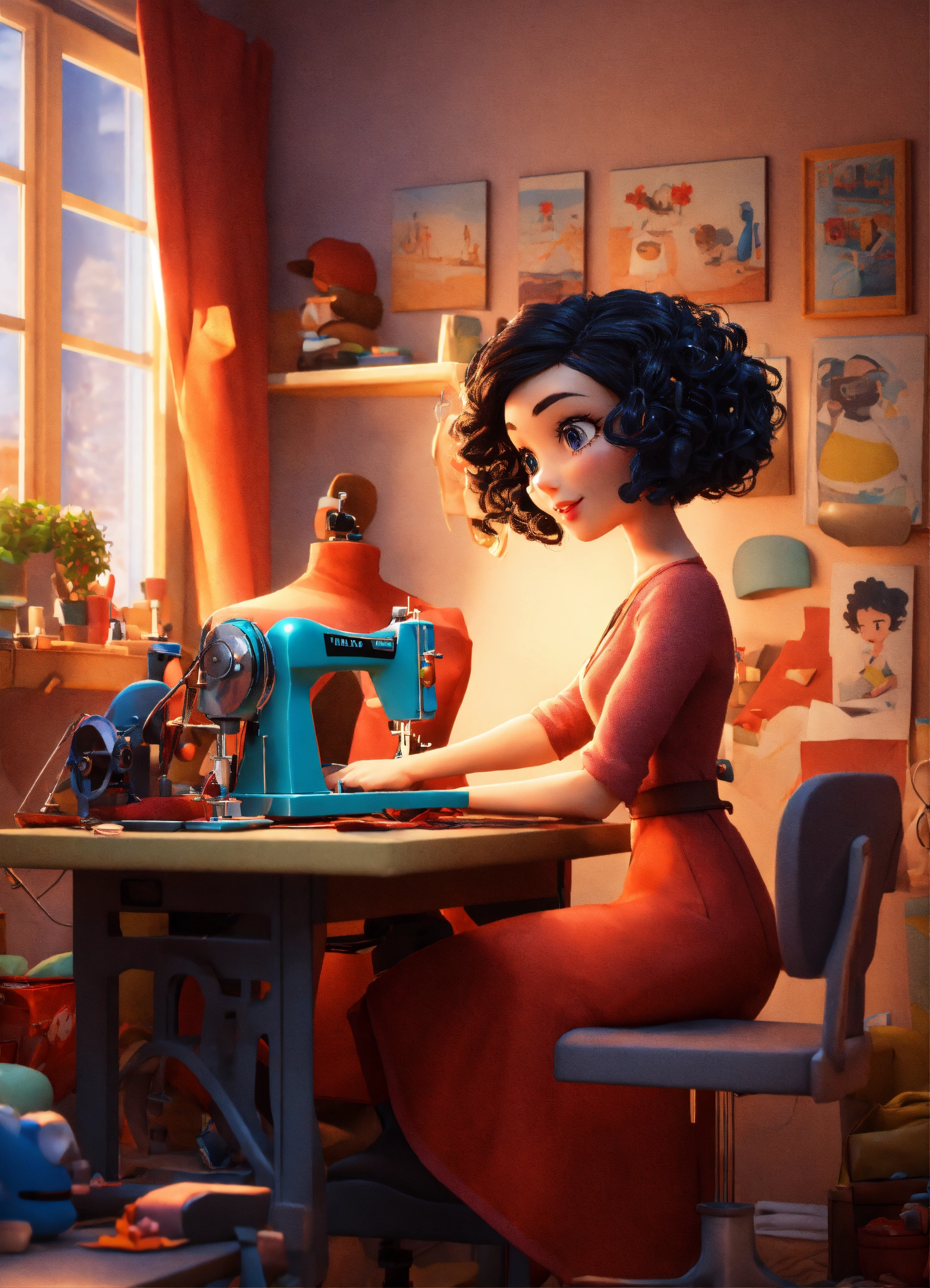 with a cute woman with curly black hair working at a sewing machine
