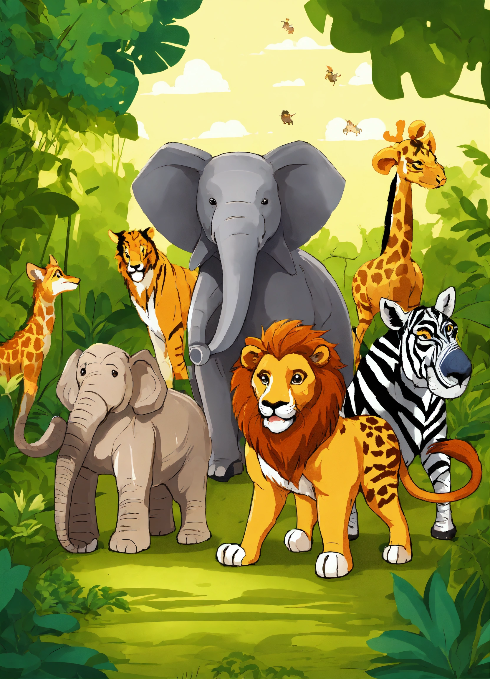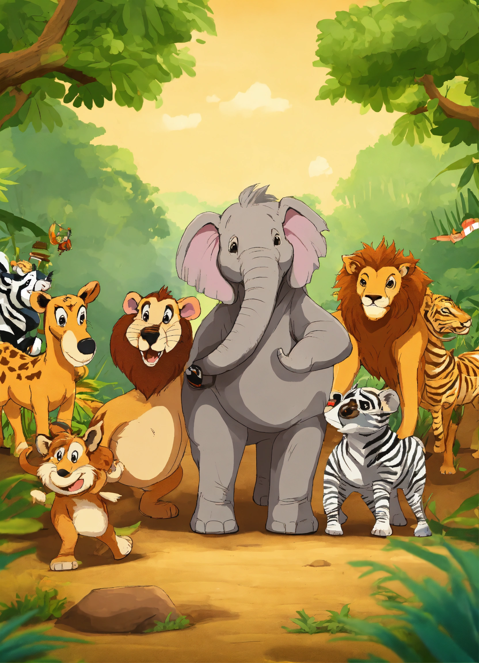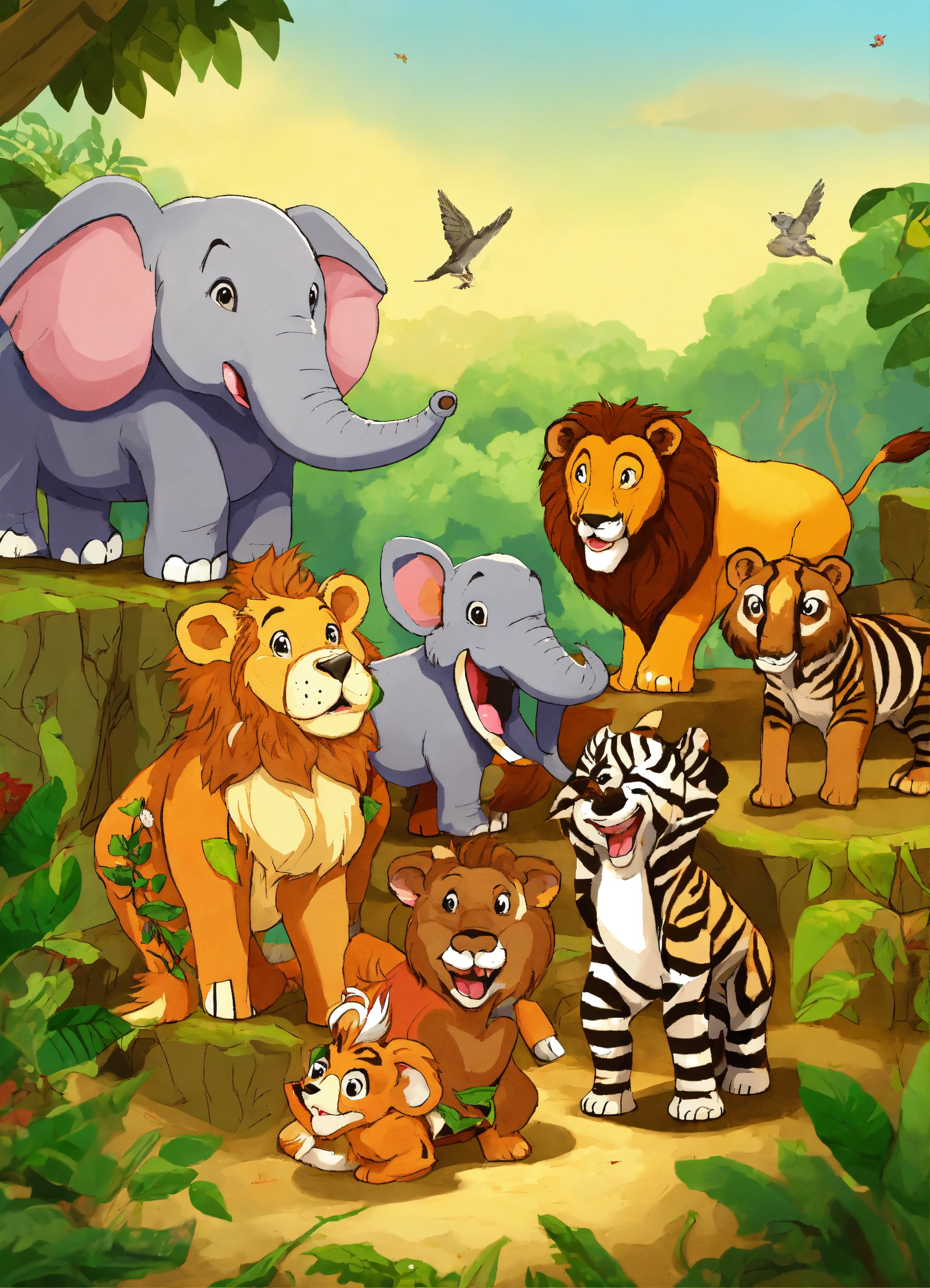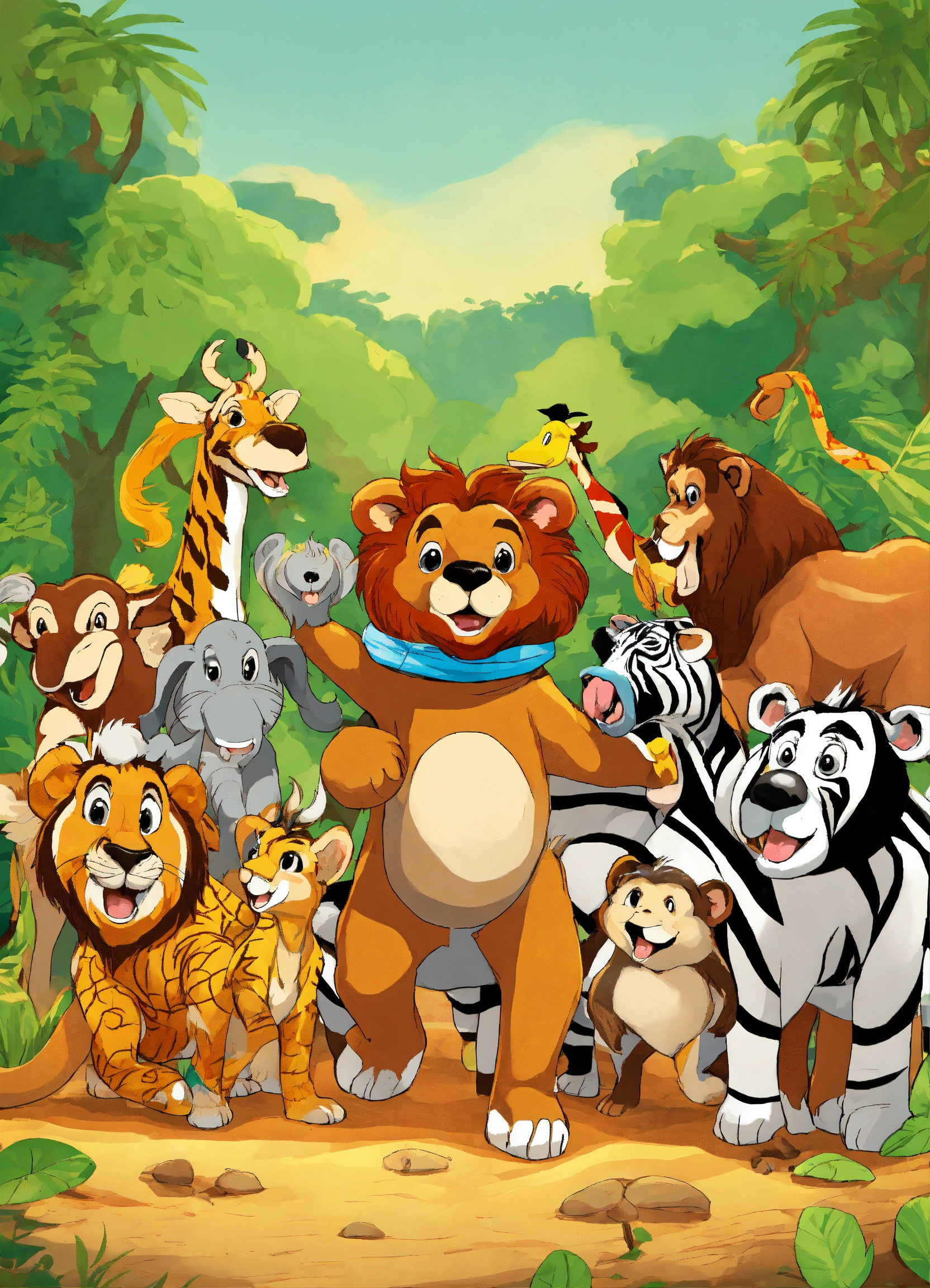 Cartoon many jungle animals elephant wolf deer lion monkeys zebra bear applauded tortoise for winning race