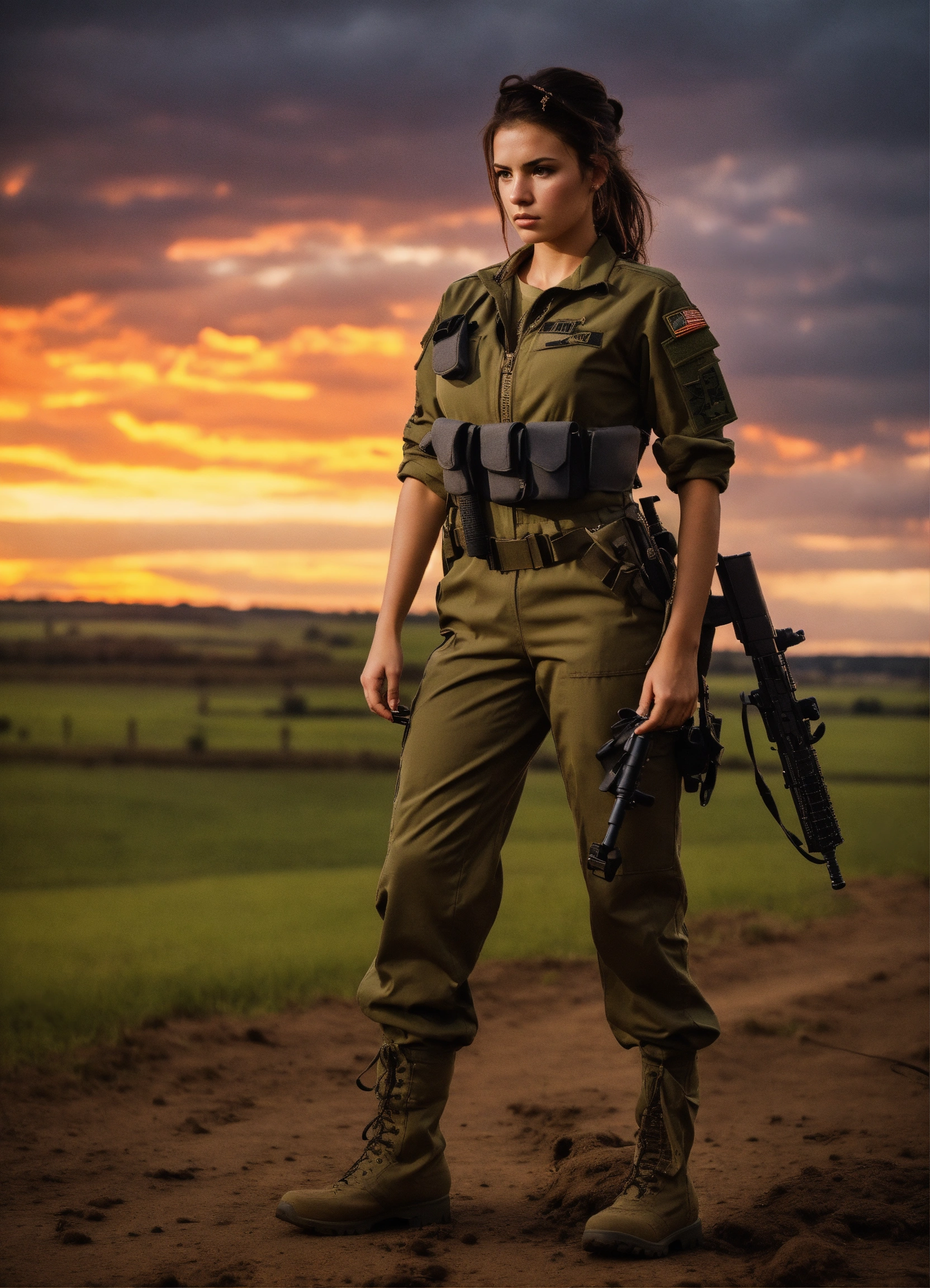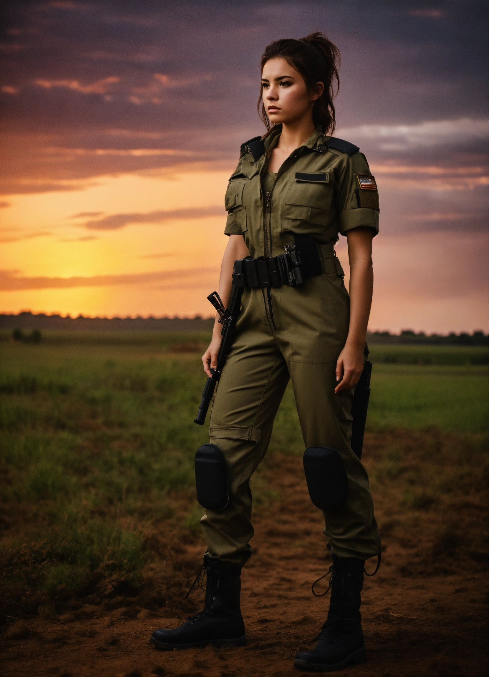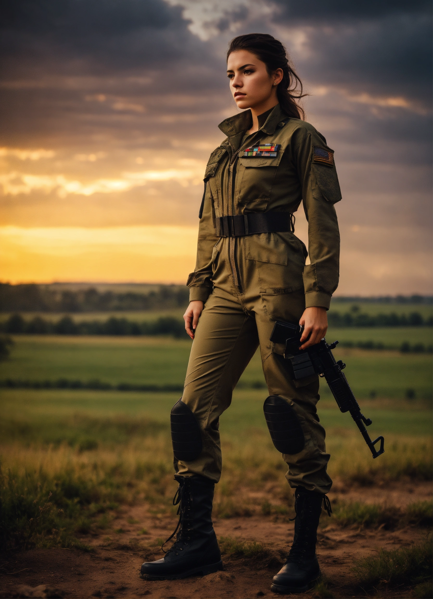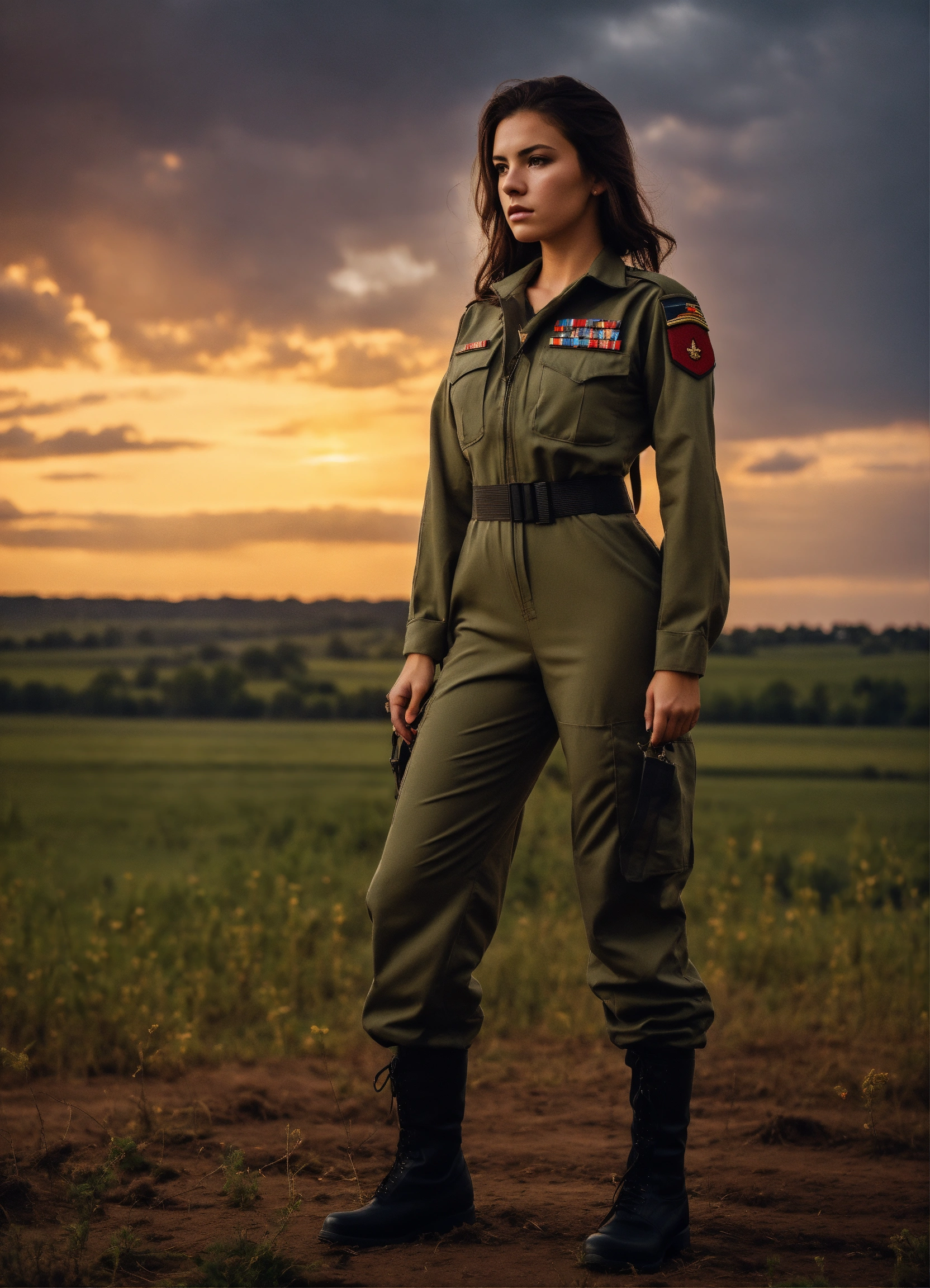 A beautiful brunette military girl, tight combat jumpsuit, no weapons, beautiful, moody lighting, best quality, full body portrait, real picture, intricate details, depth of field, rural landscape, beautiful lighting