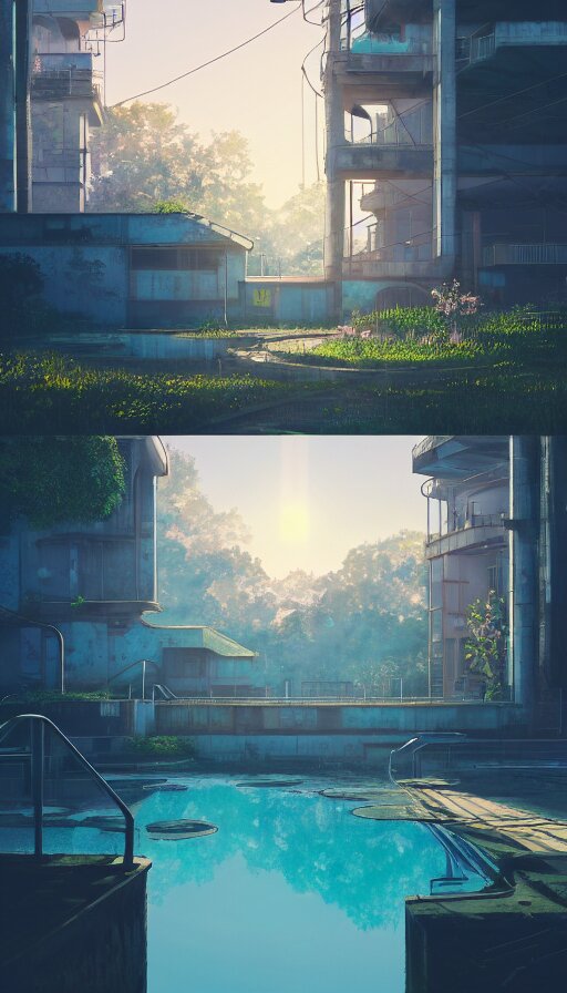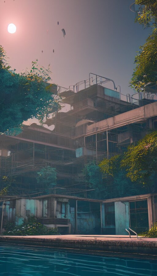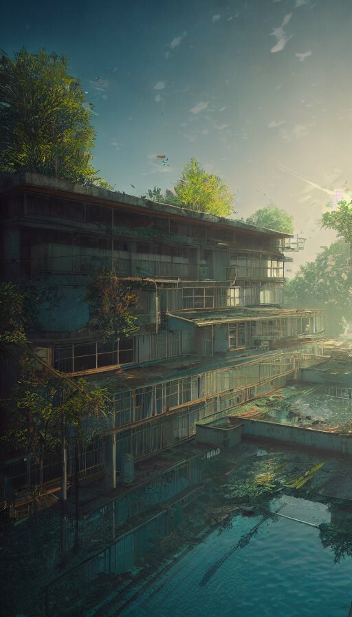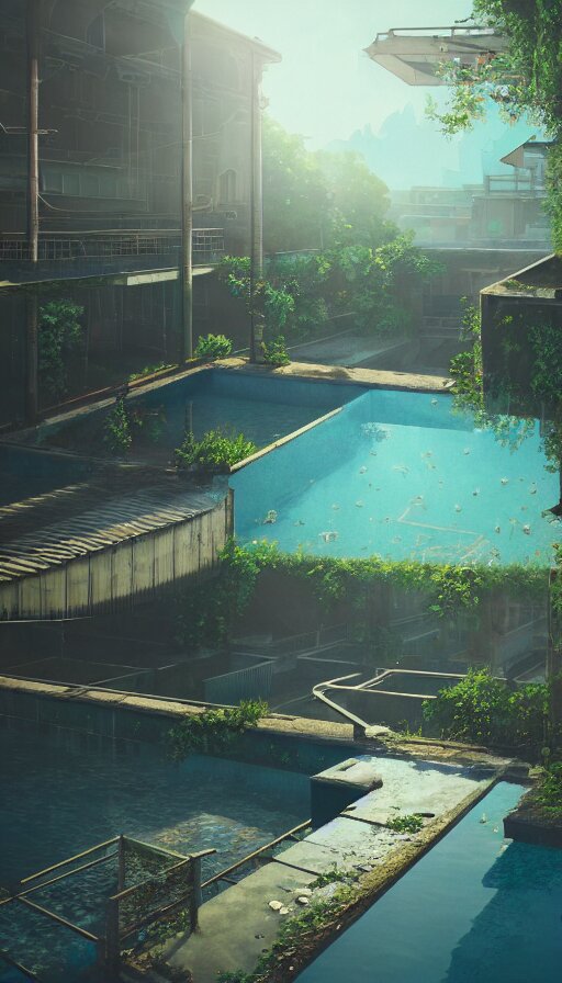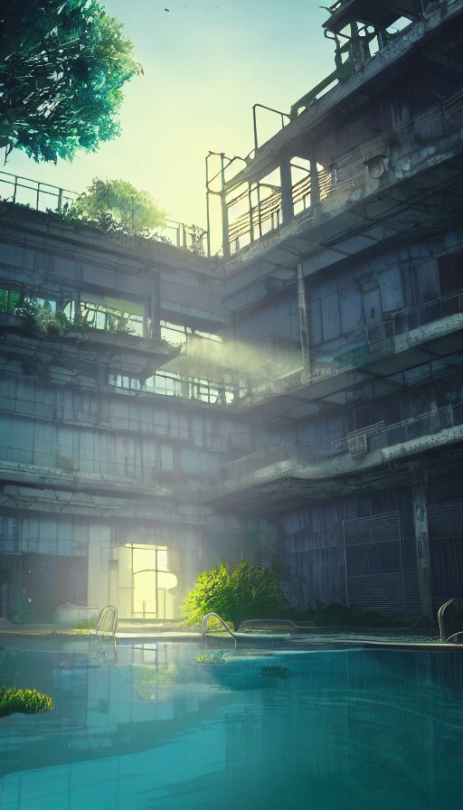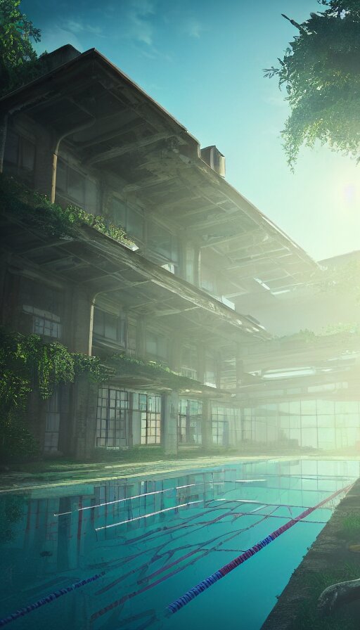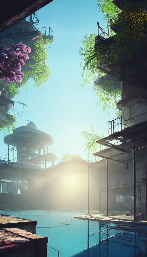 A beautiful detailed render of swimming pool building nature abandoned urbex industrial architecture unfinished building by beeple, studio ghibli at dawn thermal vision flowers assassin's creed morning sun laser, archdaily, wallpaper, highly detailed, trending on artstation.