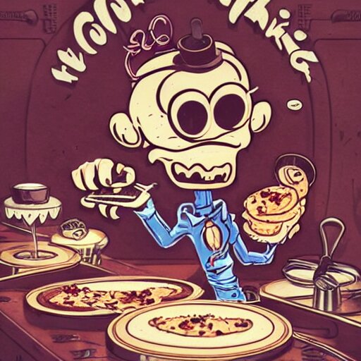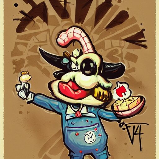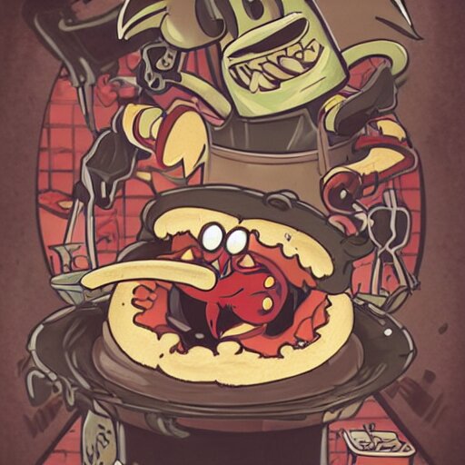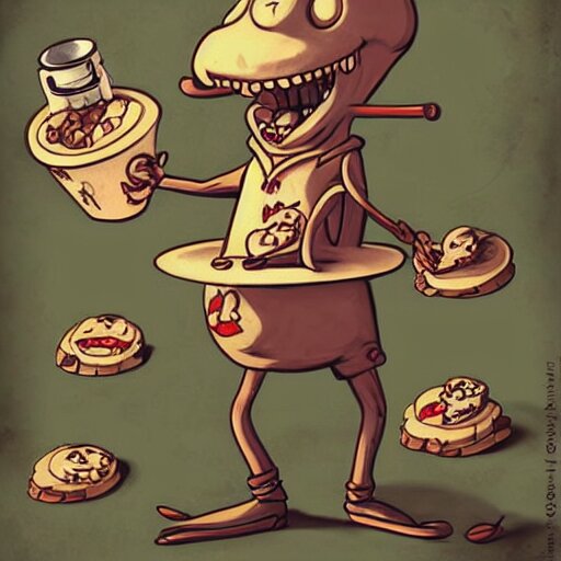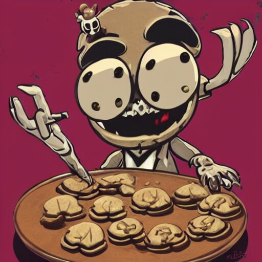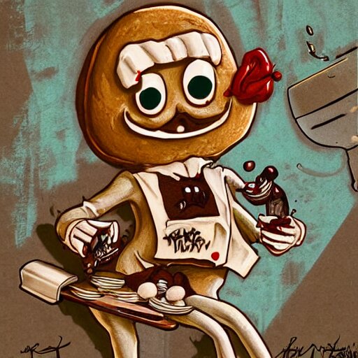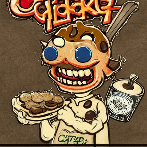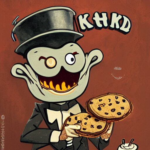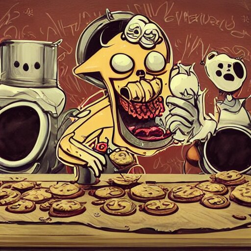 Evil anthropomorphic cookie cooking a bunch of cookies, in the kitchen, cuphead, painterly, logo, graffiti, elegant, highly detailed, digital art, art by jc leyendecker and sachin teng
