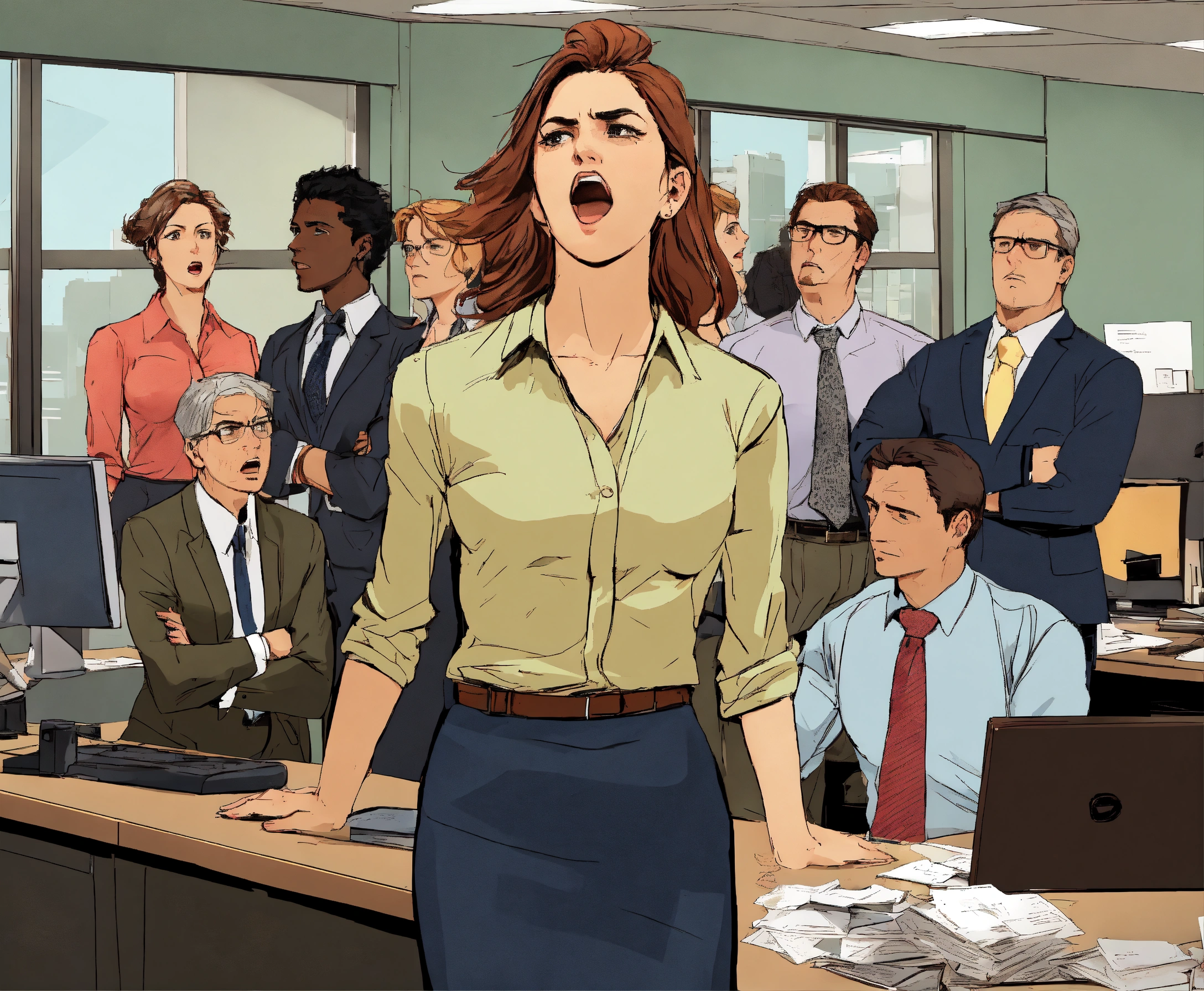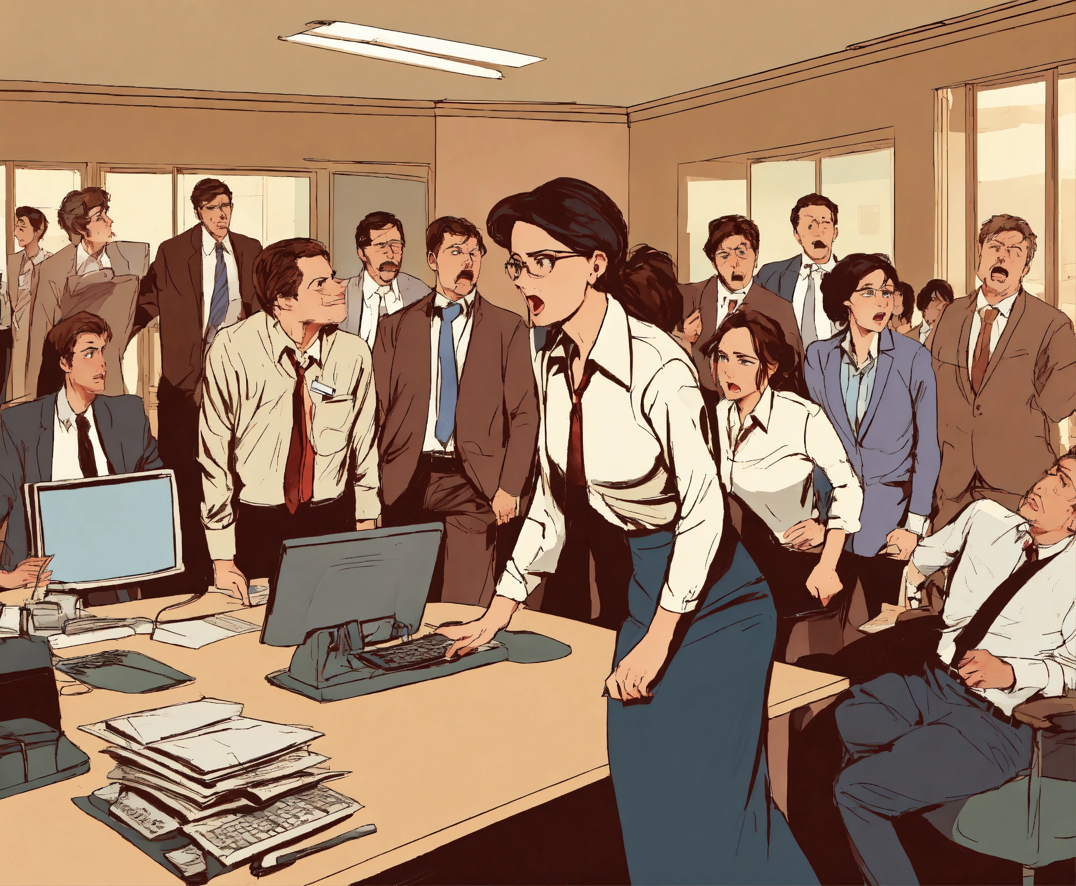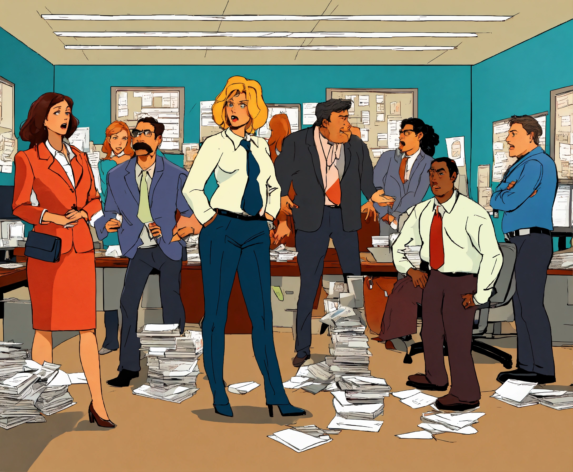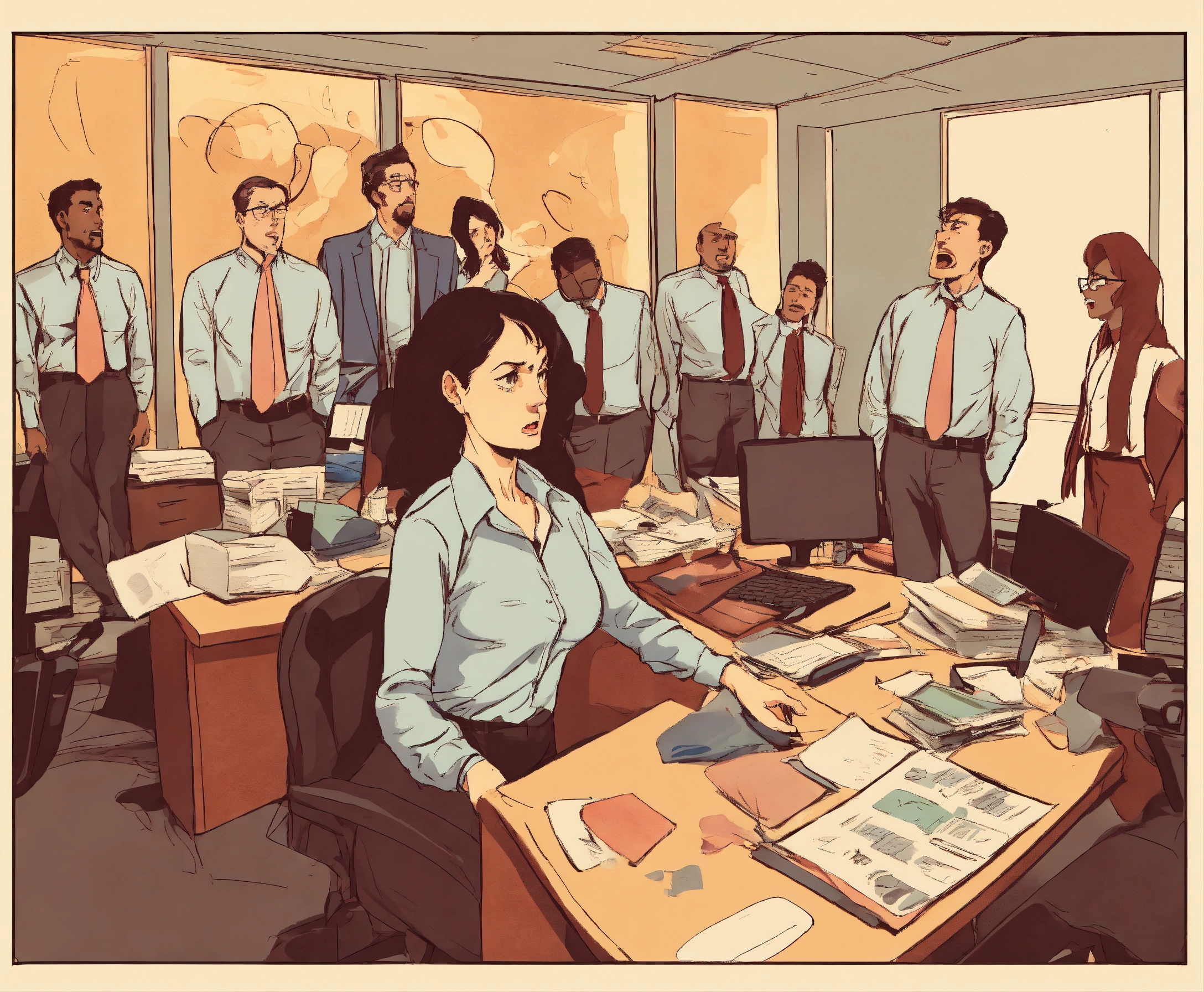 "depict a scene in an office where a woman boss stands at the center, trying to direct 25 employees, both male and female. each employee is looking in a different direction, leading to a chaotic yet comical tableau. the boss's expression is a mix of exasperation and determination."