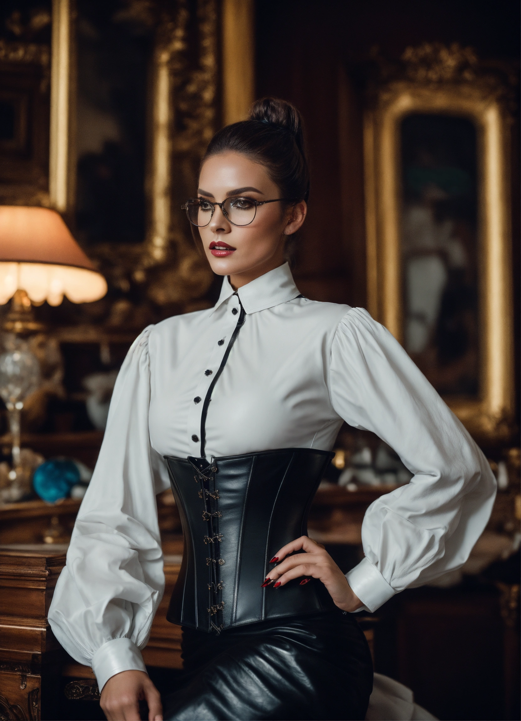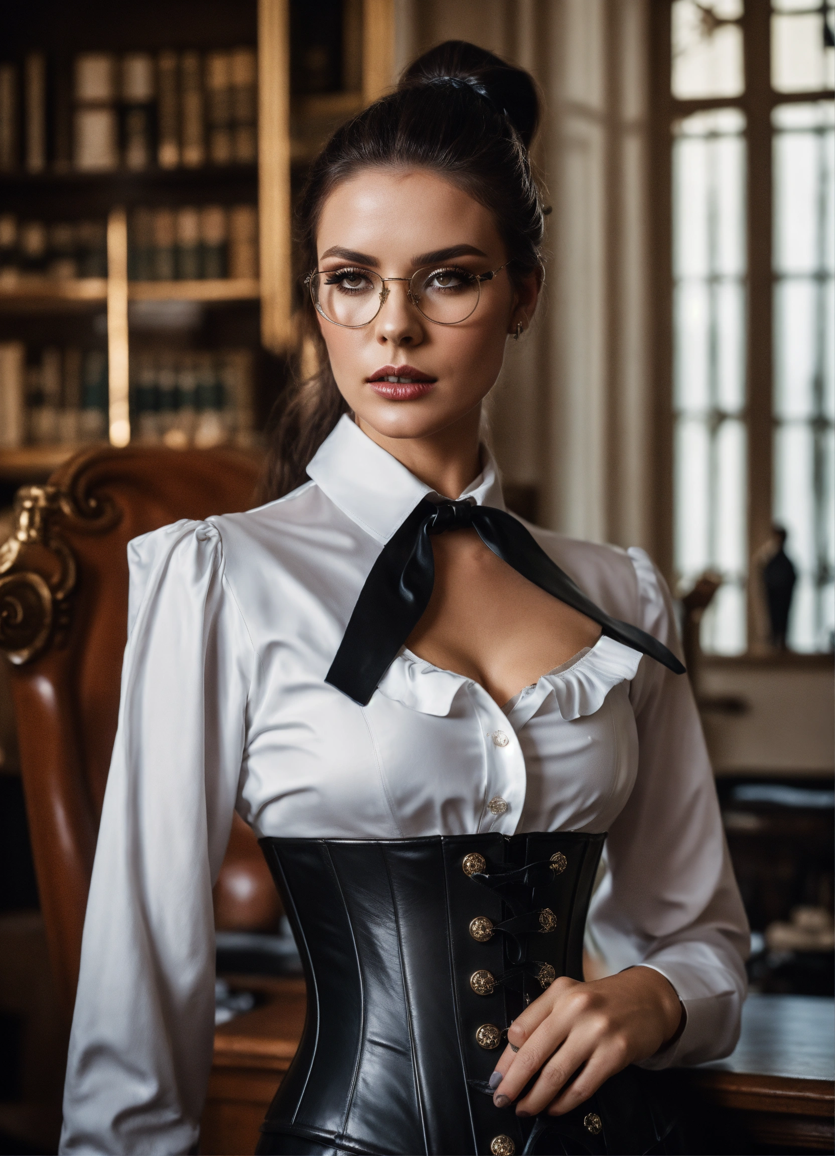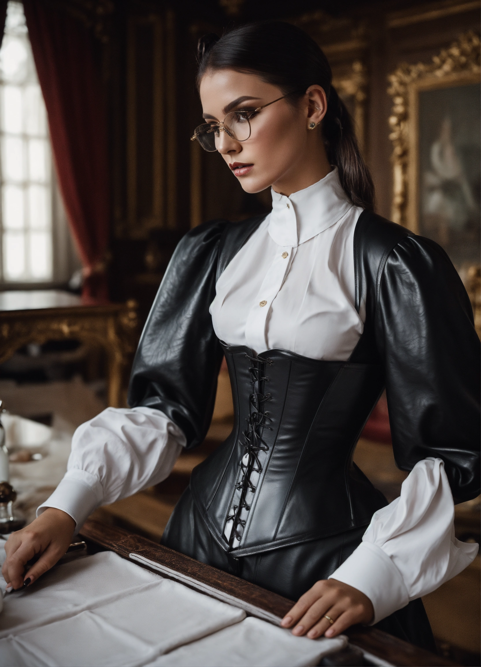 Stunning french seductress woman fashion model, brunette straight high ponytail, glasses, black leather corset, long strict victorian governess wide black long leather dress with big buttons, white governess shirt with long big puff sleeves, mansion room, white office shirt, eyeliner makeup