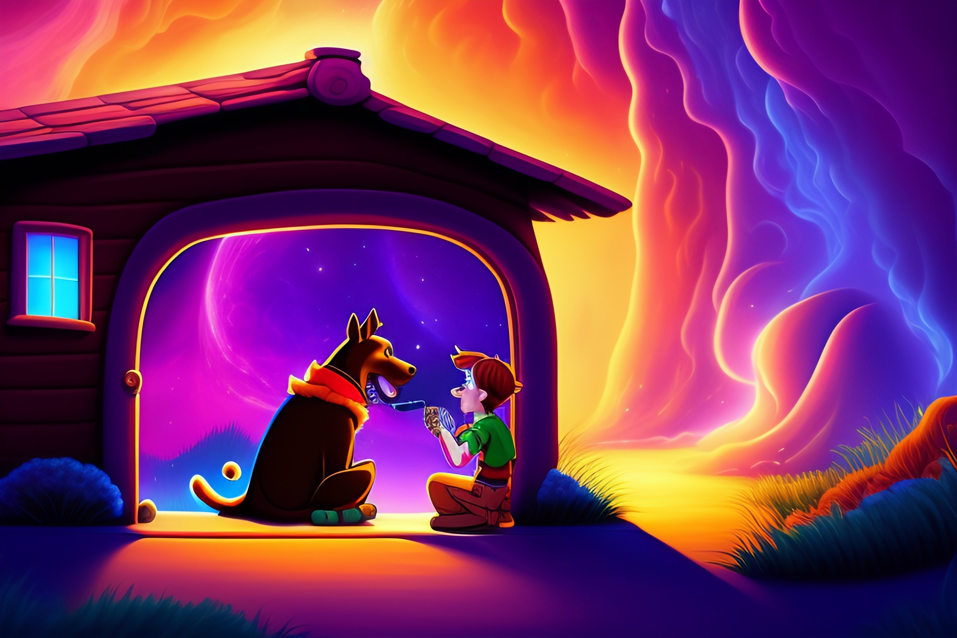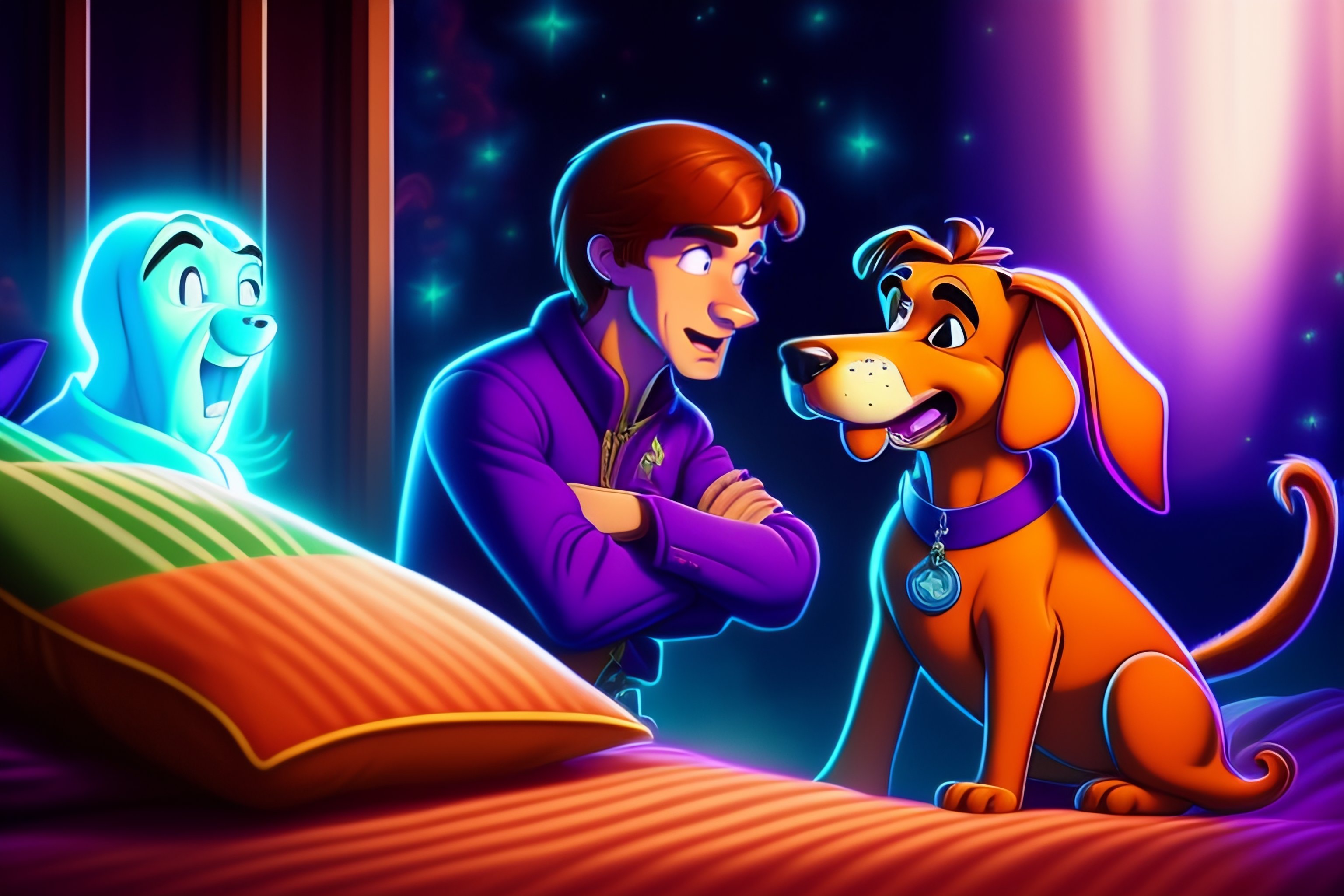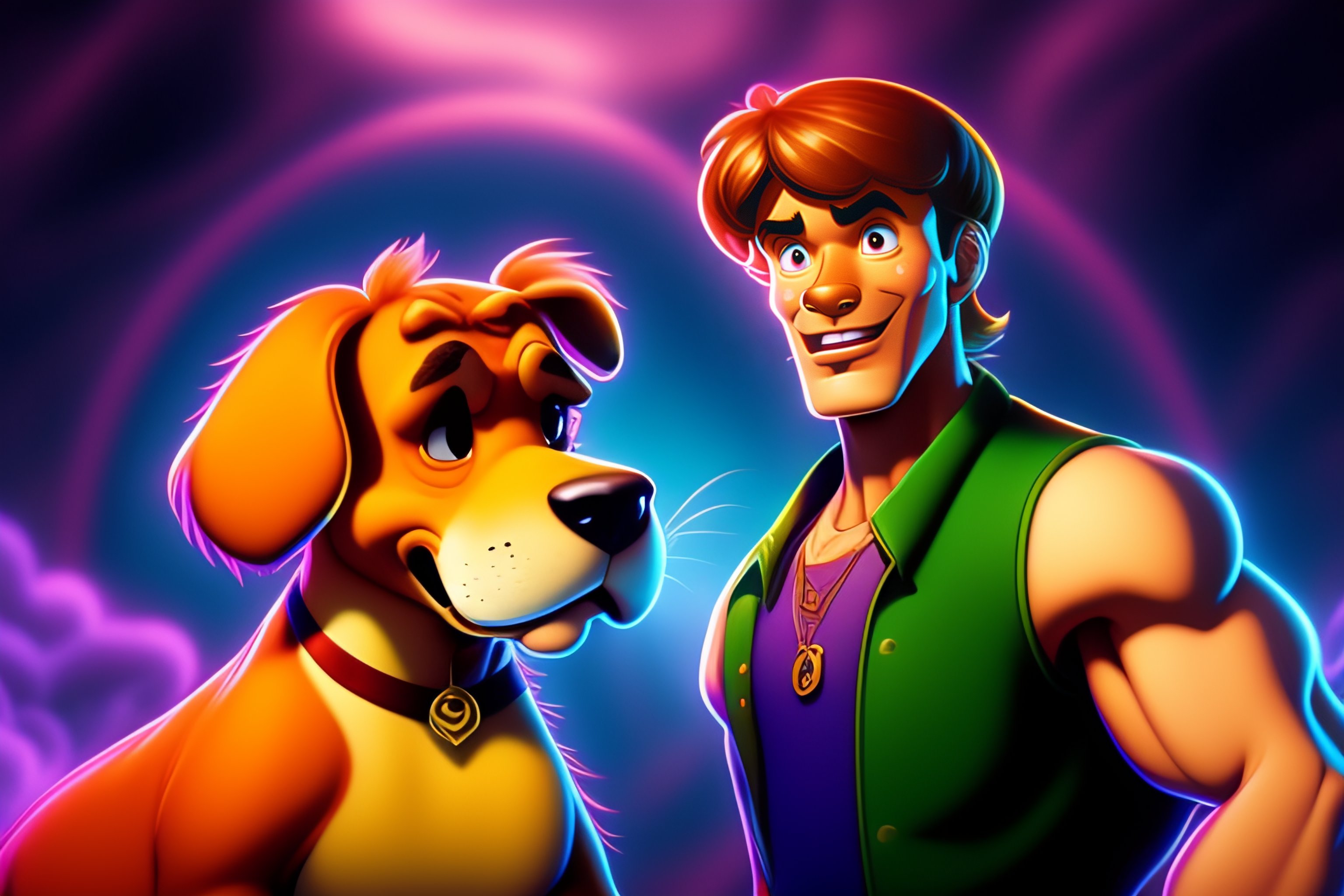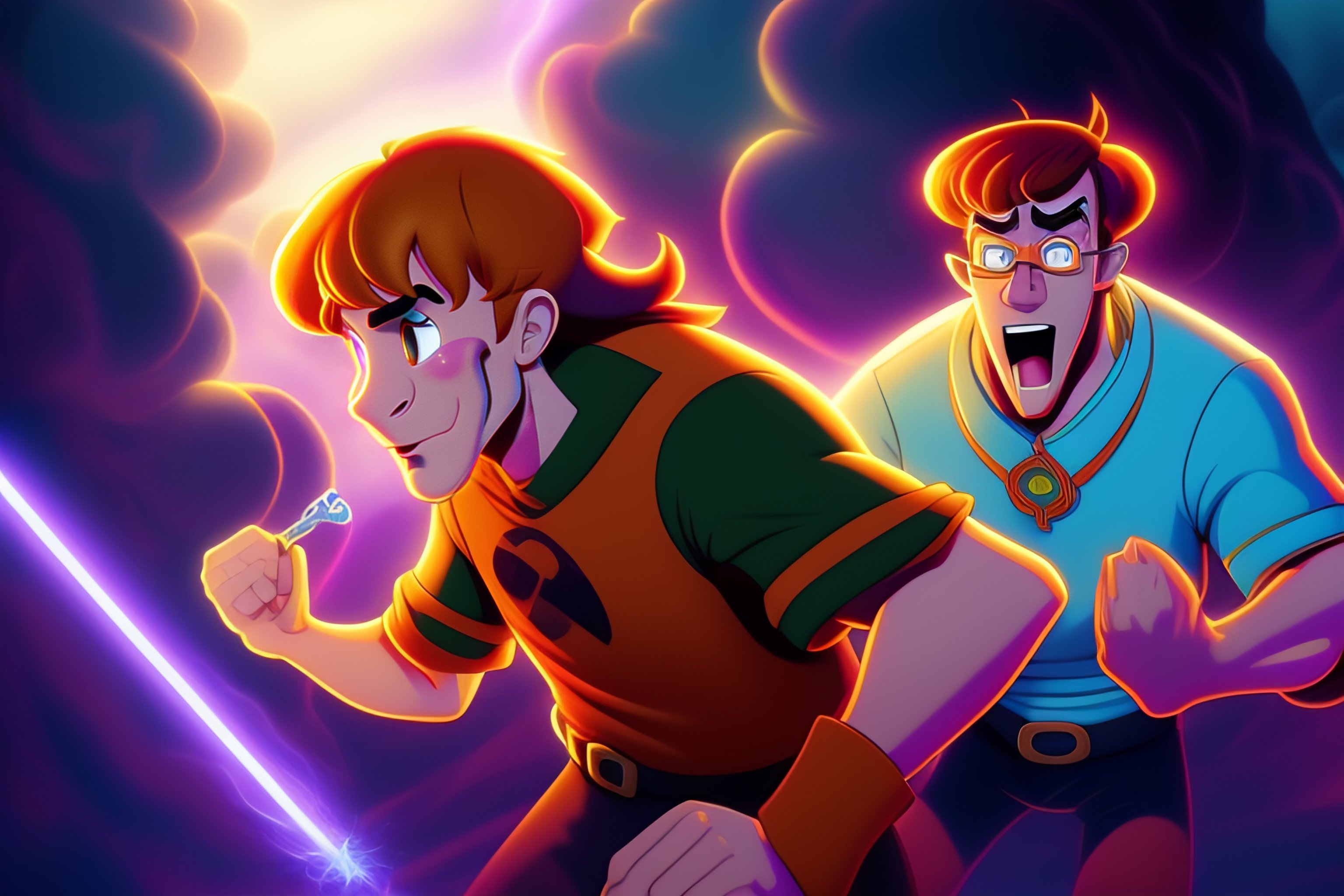 A beautiful photo of scooby-doo and shaggy being scared of a ghost