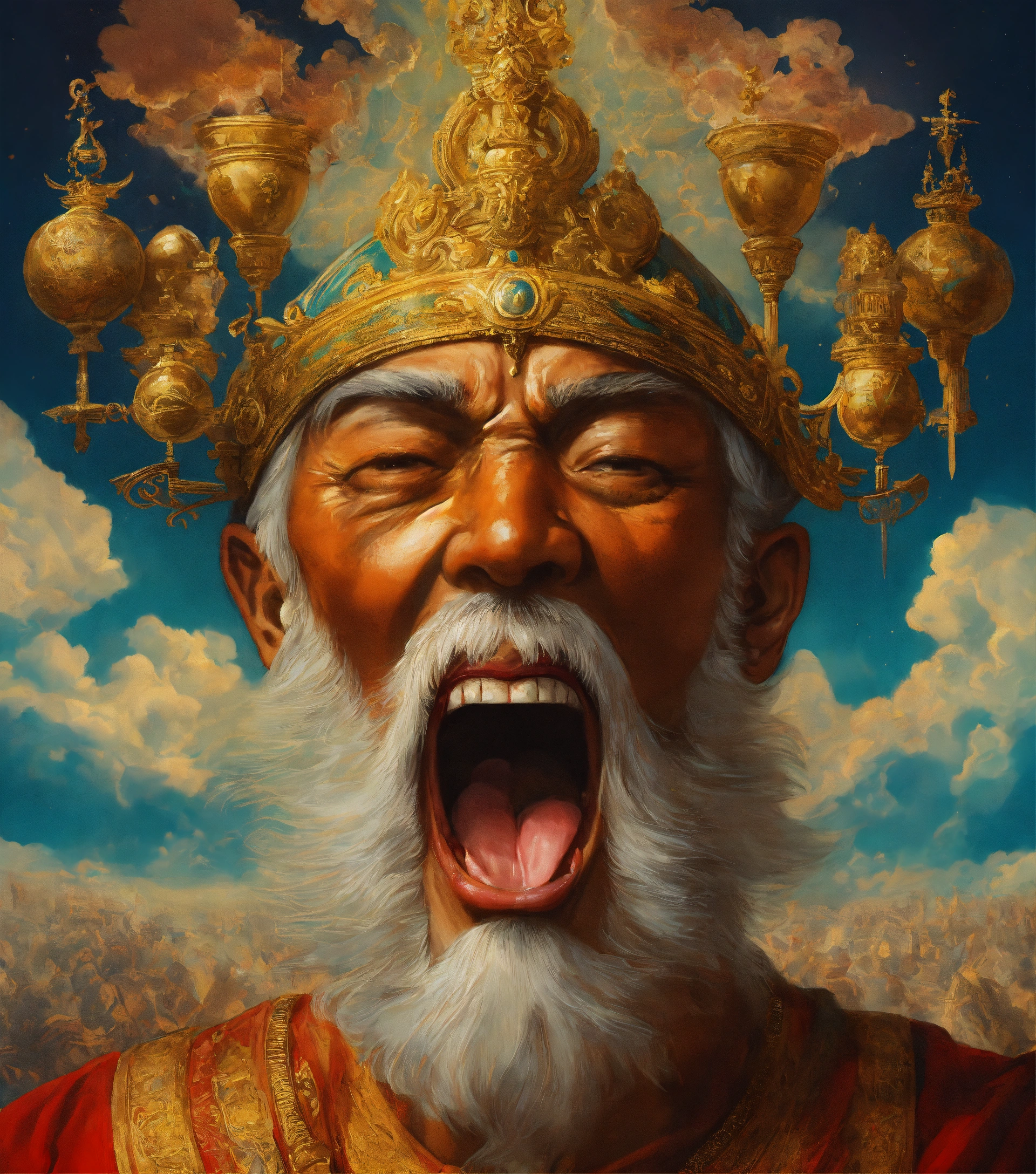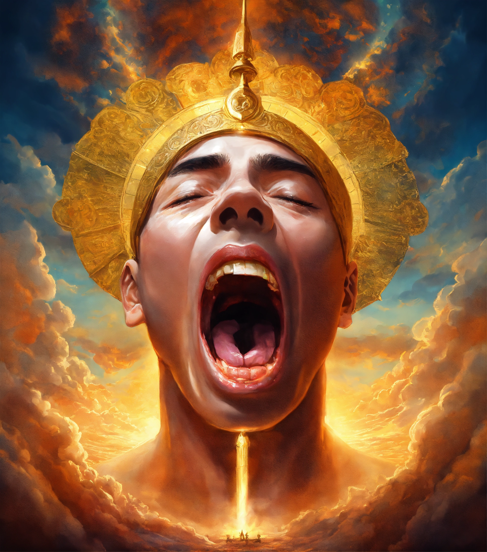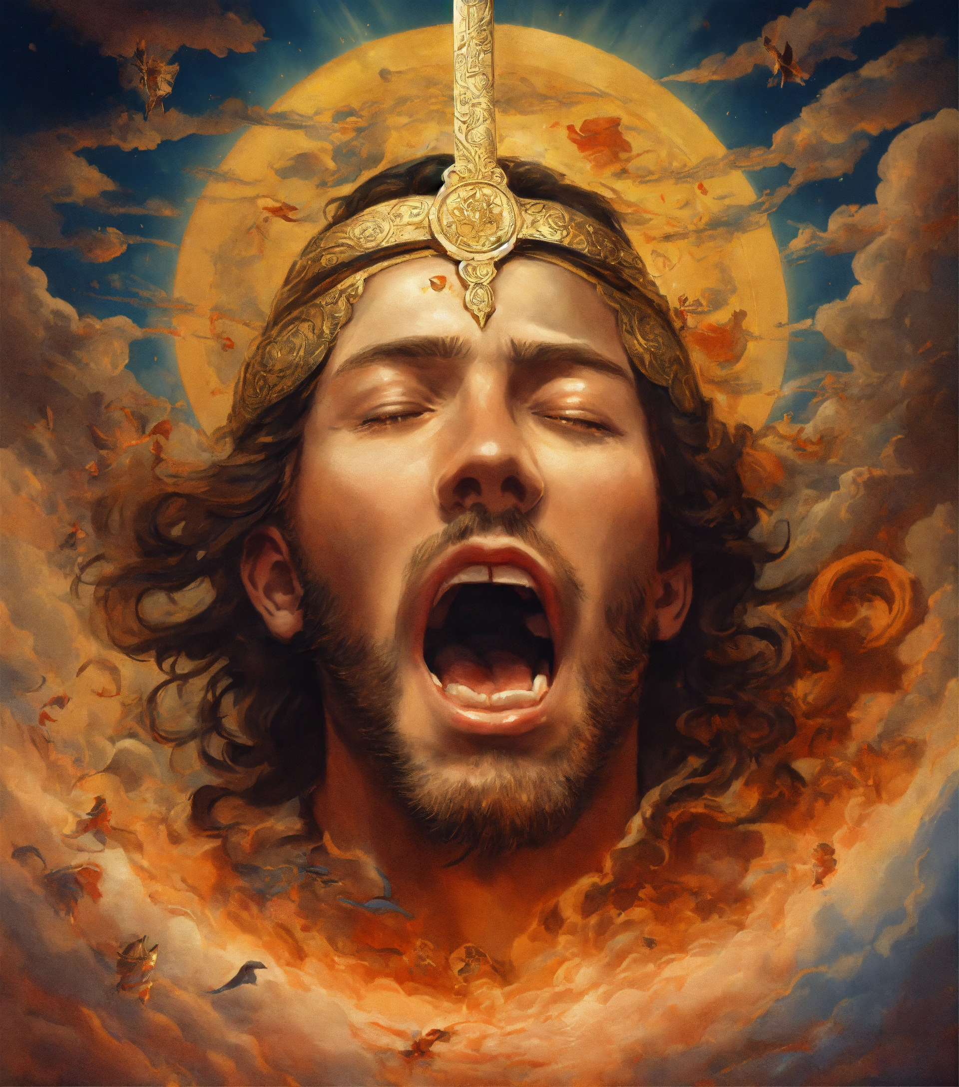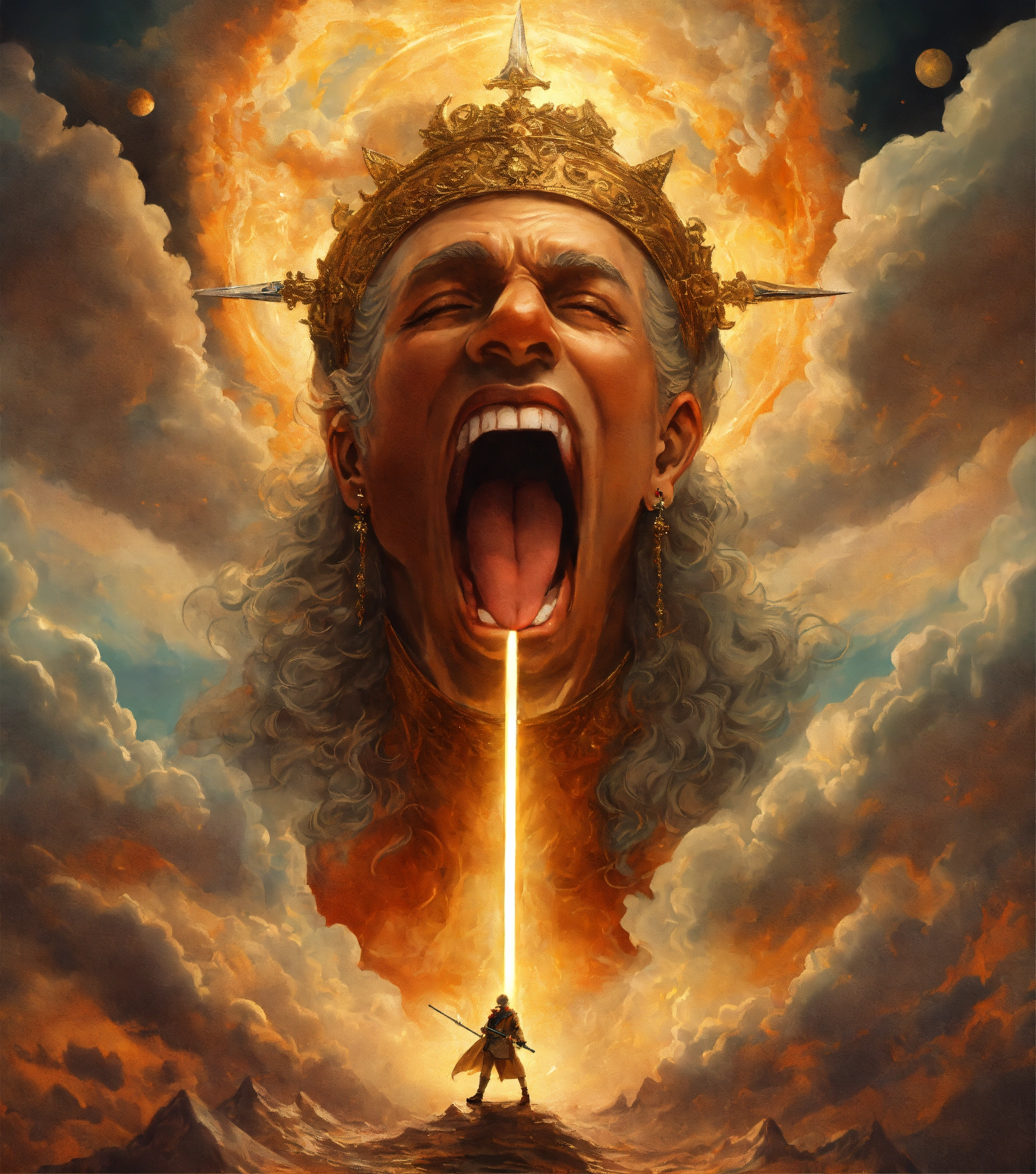 In the heavens, the face of an enlightened man with an opened mouth and a tongue as a double-edged sword coming out of his mouth. below on earth multitudes of exhausted nations.