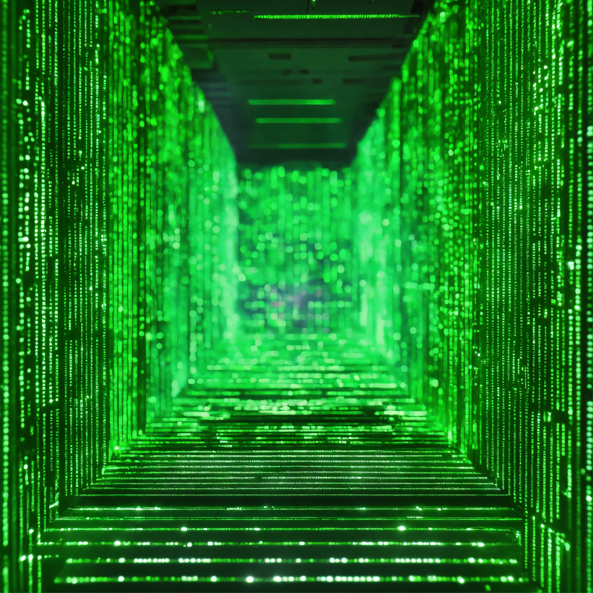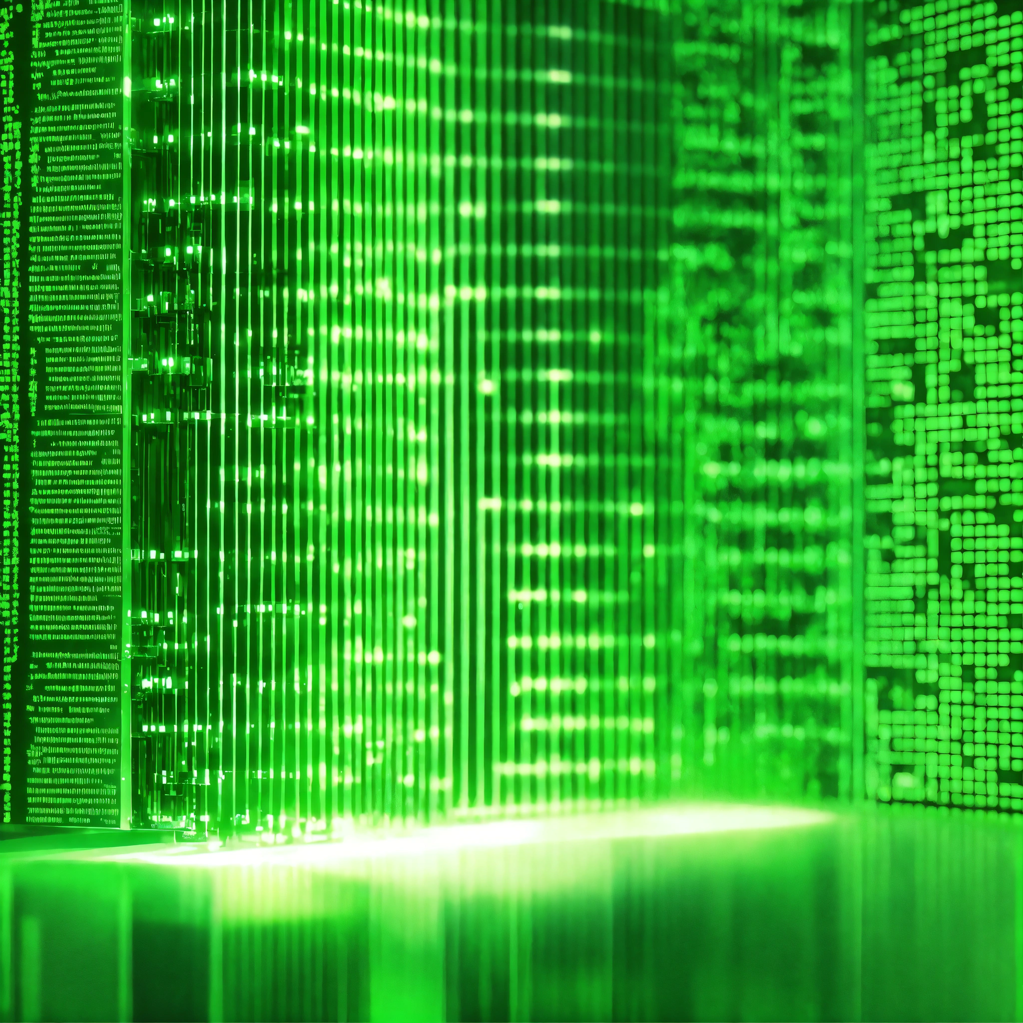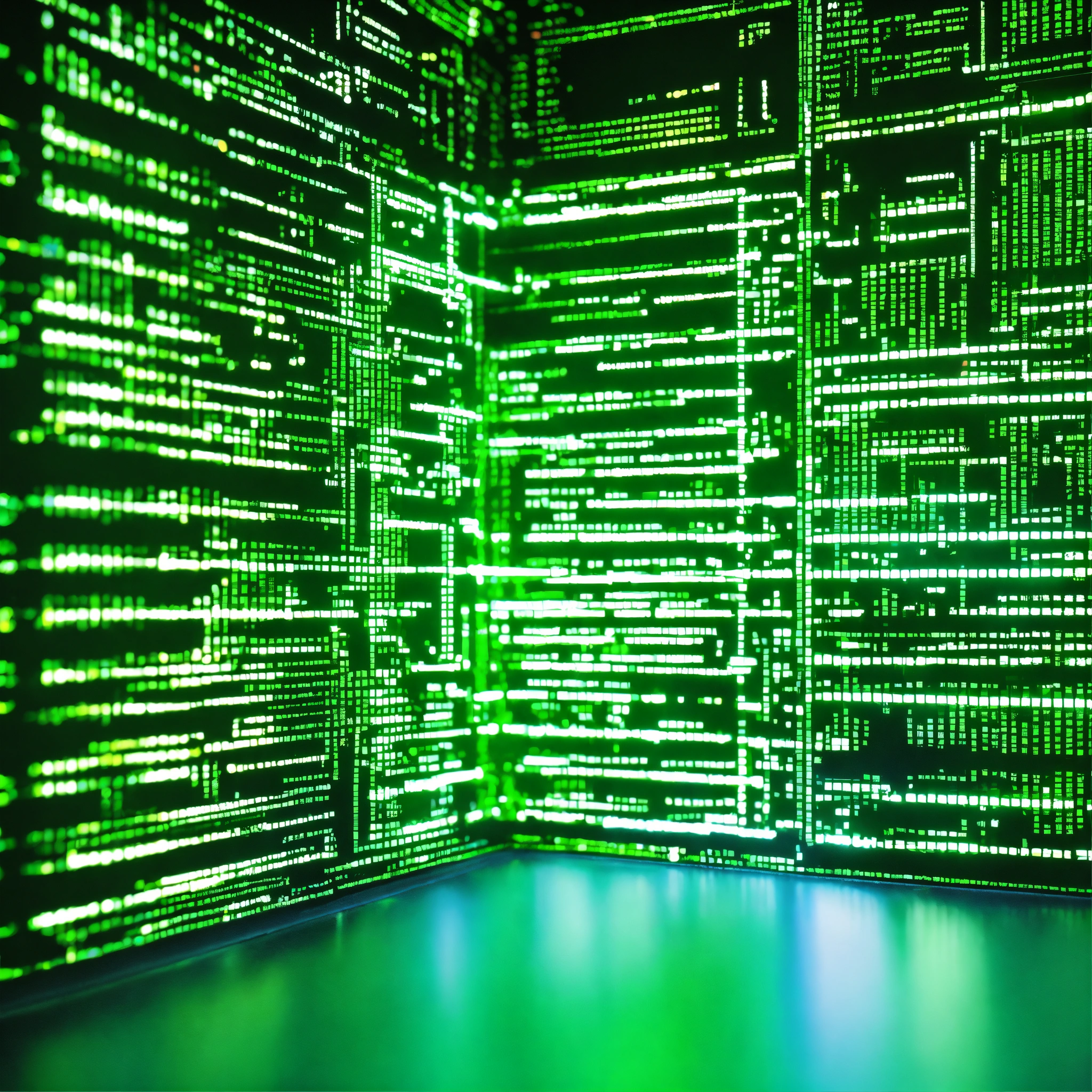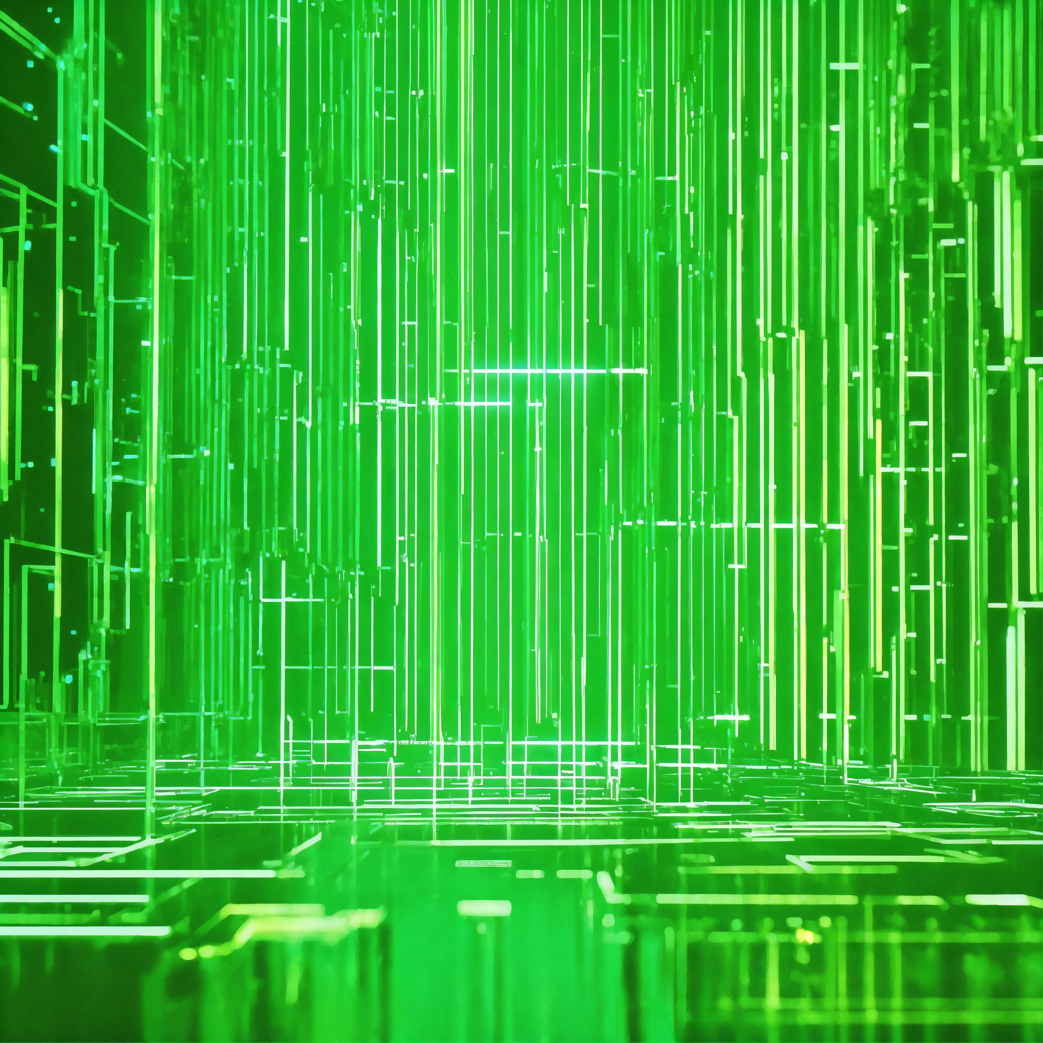 Ultra realistic bright photo of a very high tech 3d software code structure lit with bright green and white light