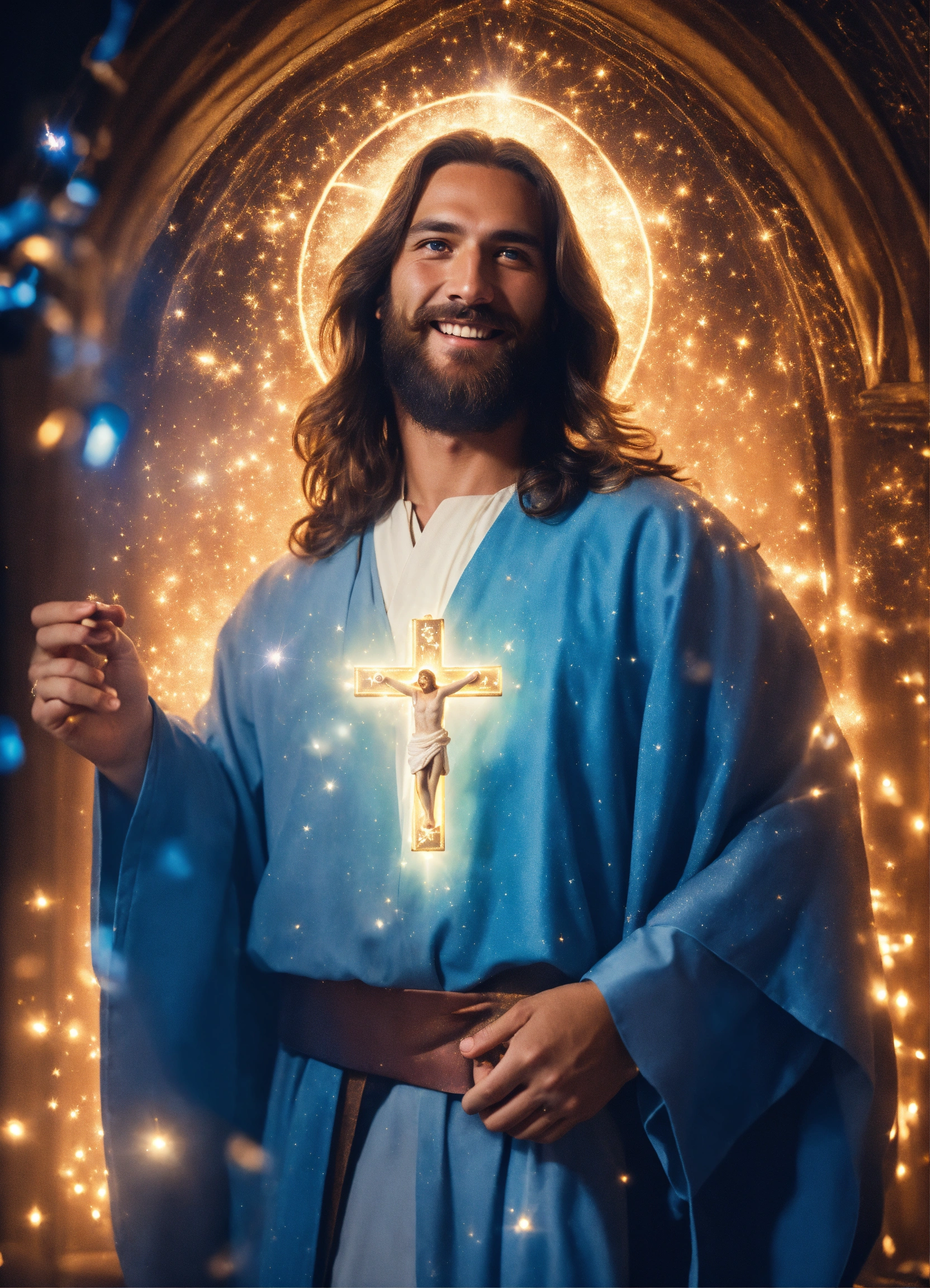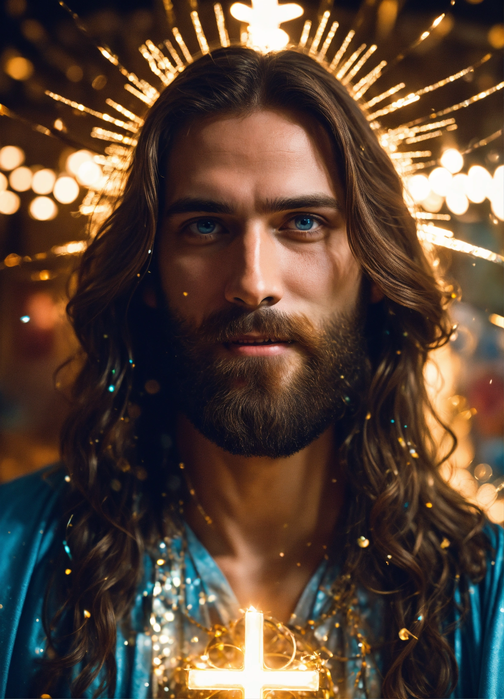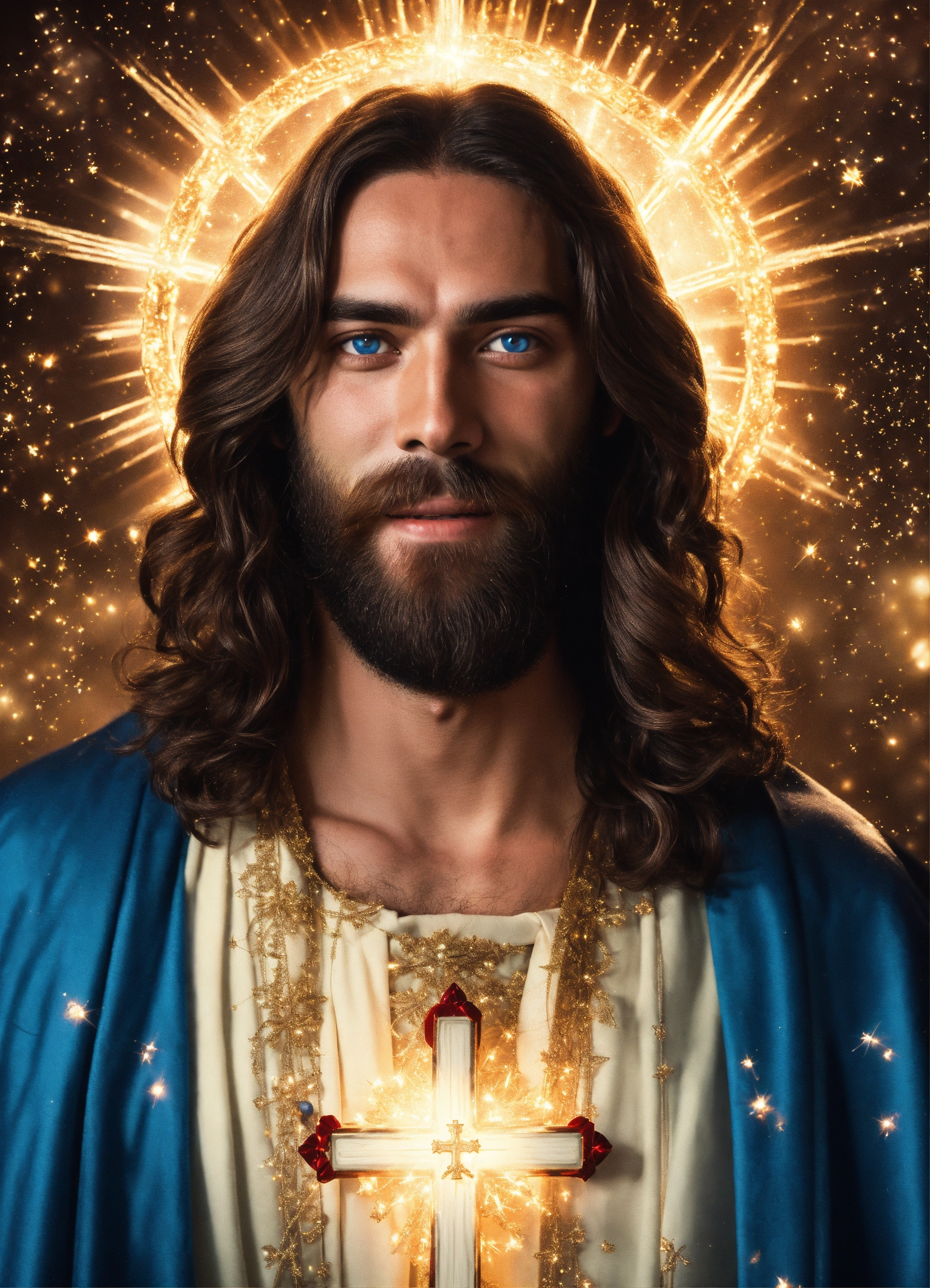 Surreal close up captured with a canon camera film grain.photographic portrait of masculine robust smiling jesus christ, looking at camera, supermodel white male, background is an swirling holy spirit sparks, holding a glowing cross wreathed in holy sparkles close to his heart, make a wish, magic, magician, sparkling wishes, holy spirit glow, smiling, staring intensely straight ahead directly into camera as if listening to me, long brown hair with full beard, loving glowing bright blue eyes centred towards me, wearing kingly robes, magazine photoshoot