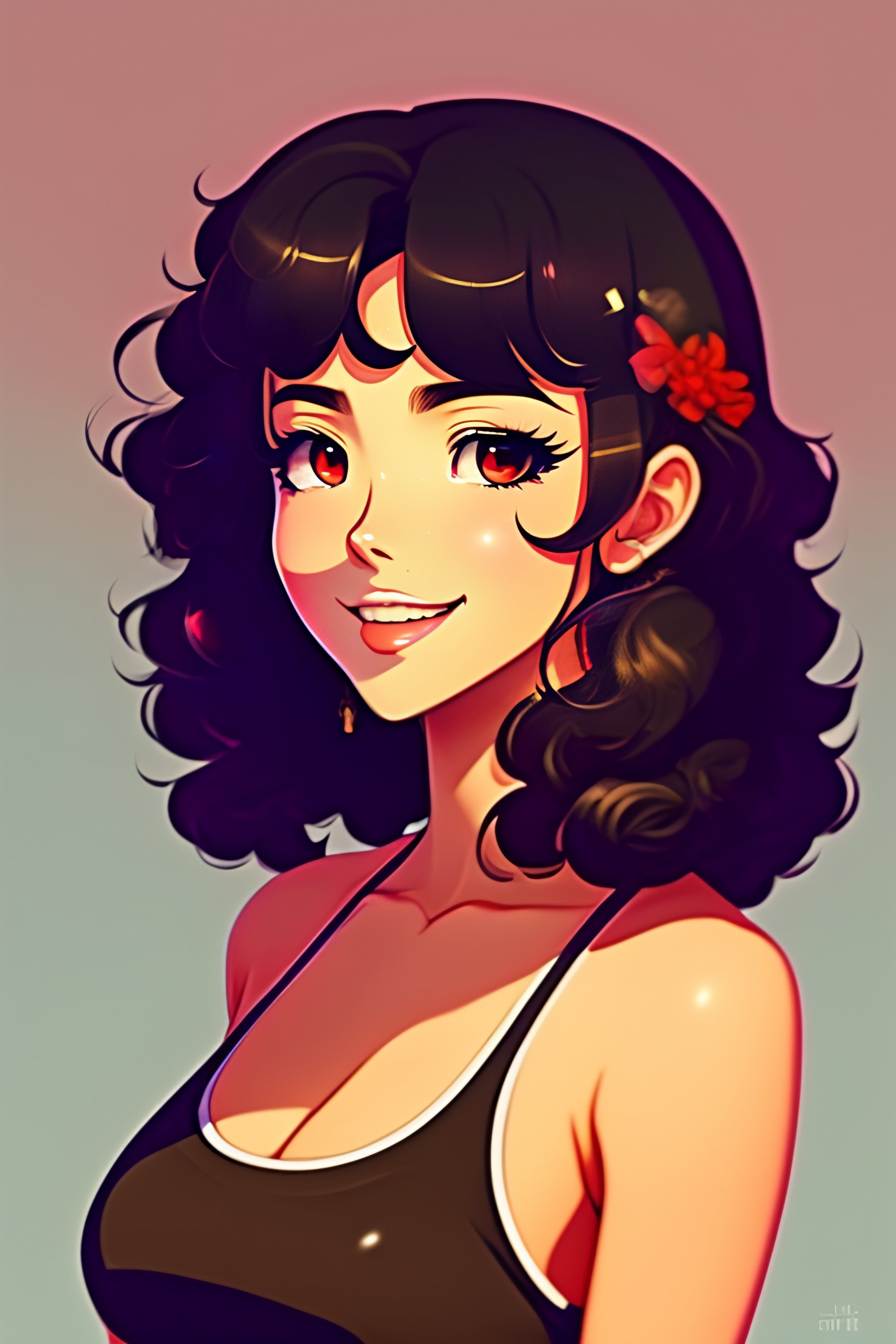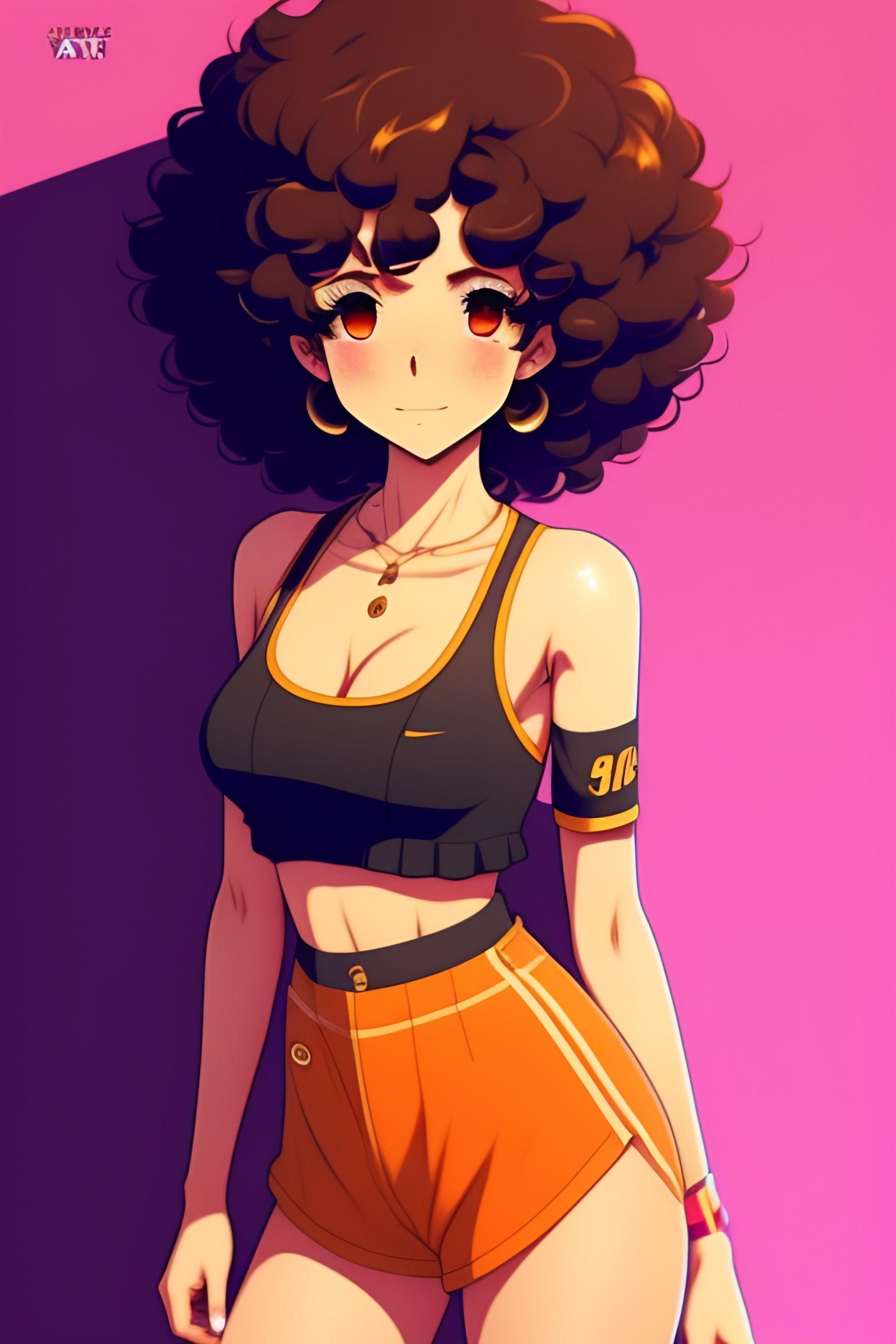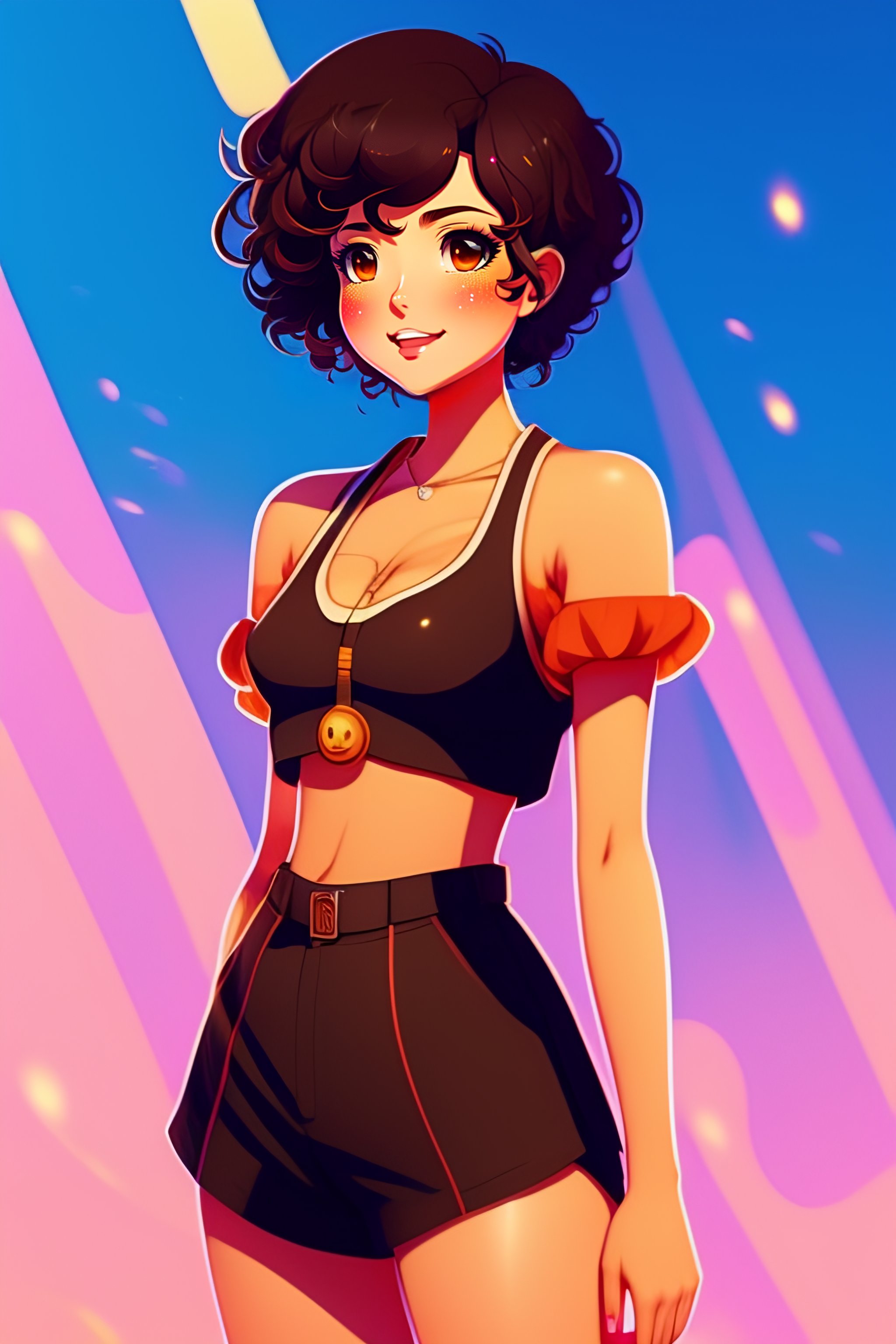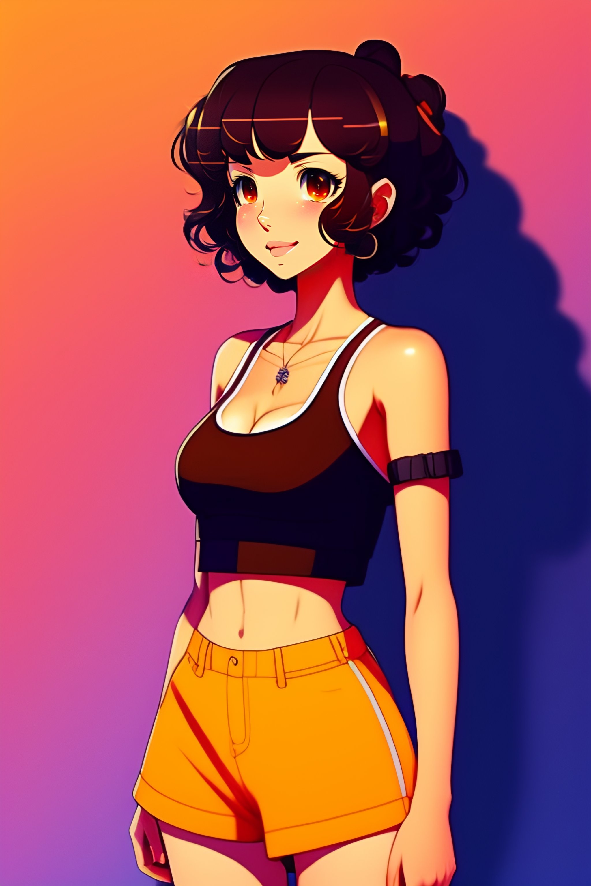 Anime style, kevin dart city background, beautiful woman, 20 years old, short brown curly hair, brown eyes, cute smile, medium bust, crop top, short shorts, flat belly visible