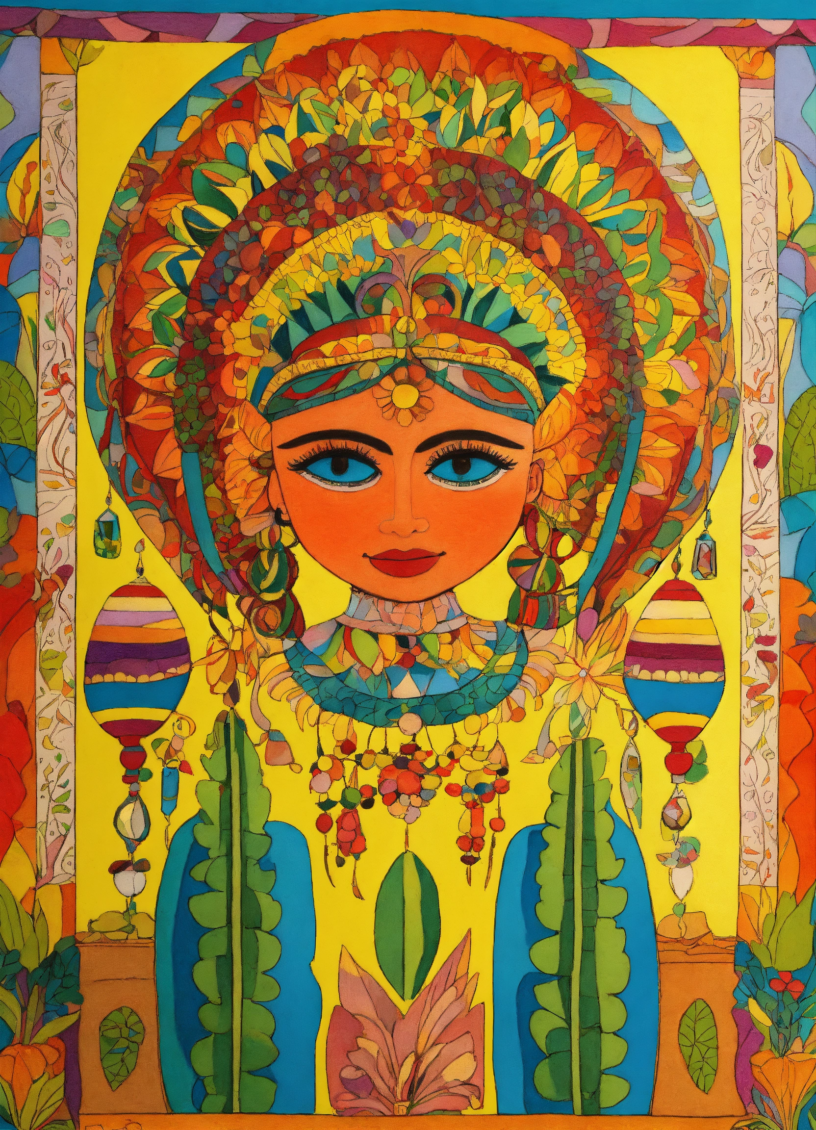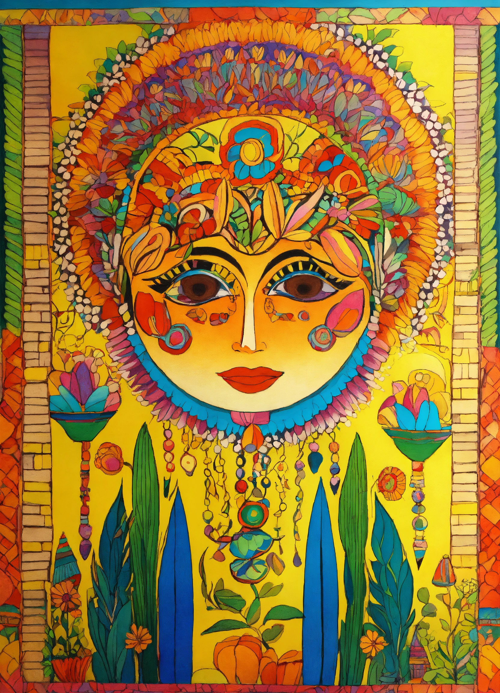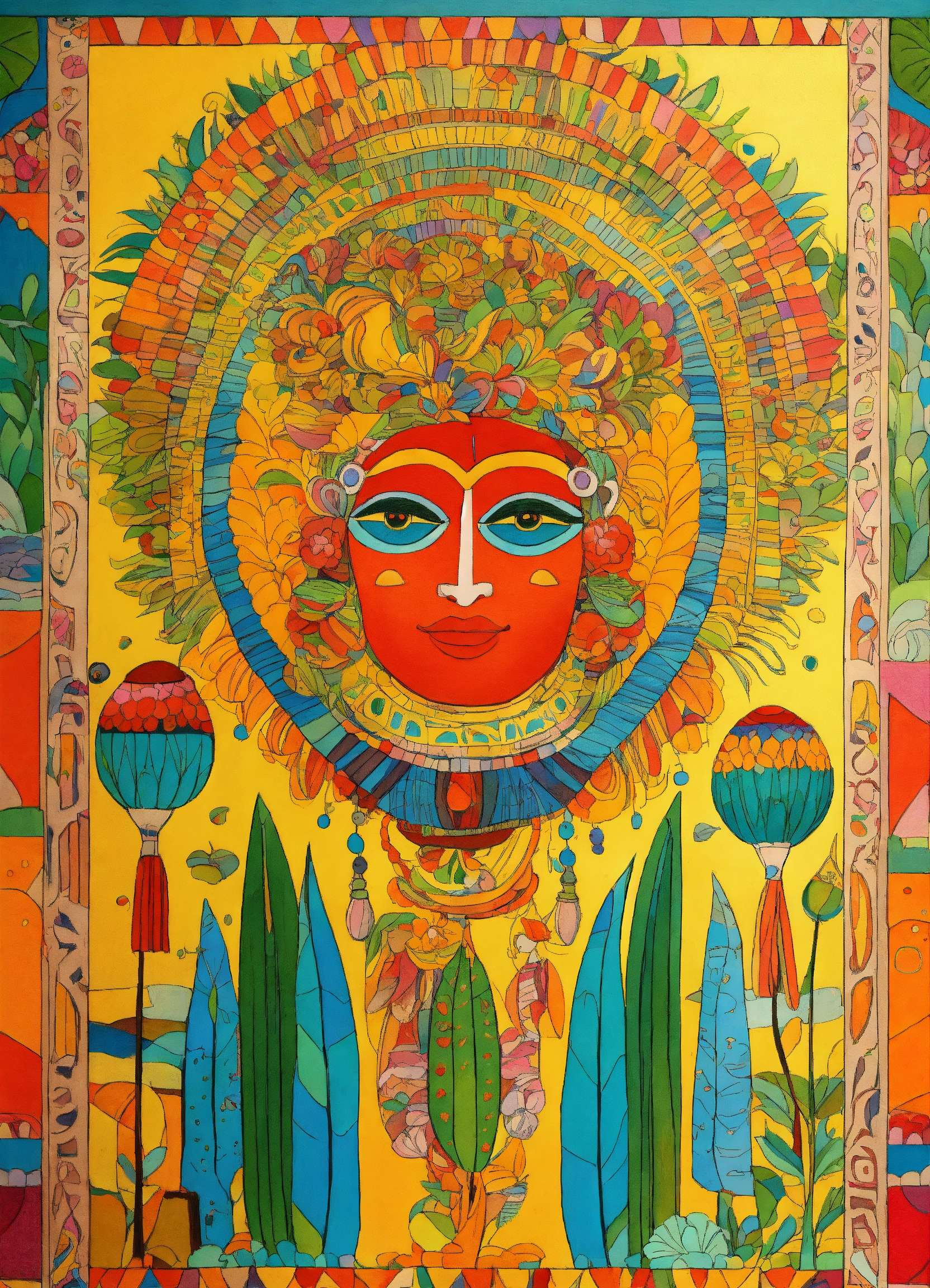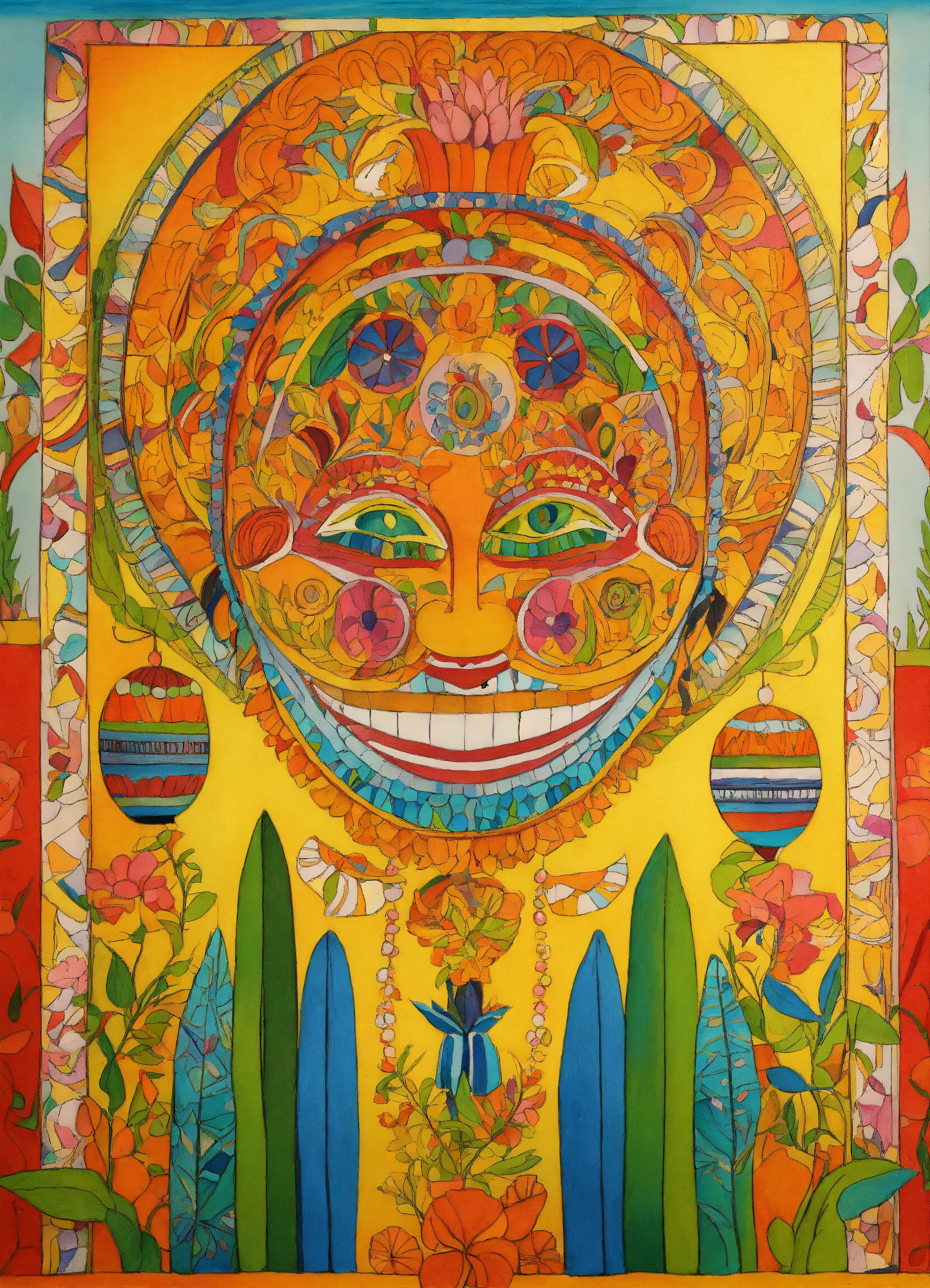 Mexican folk art art drawing the smiling spirit of nature. crystal clear, line drawing, clean clear lines, coloring book style, bright colors, intricate details, brazilian patterns elements, elegant, magical, serene, fine details, pastel pencils, winsor mccay style