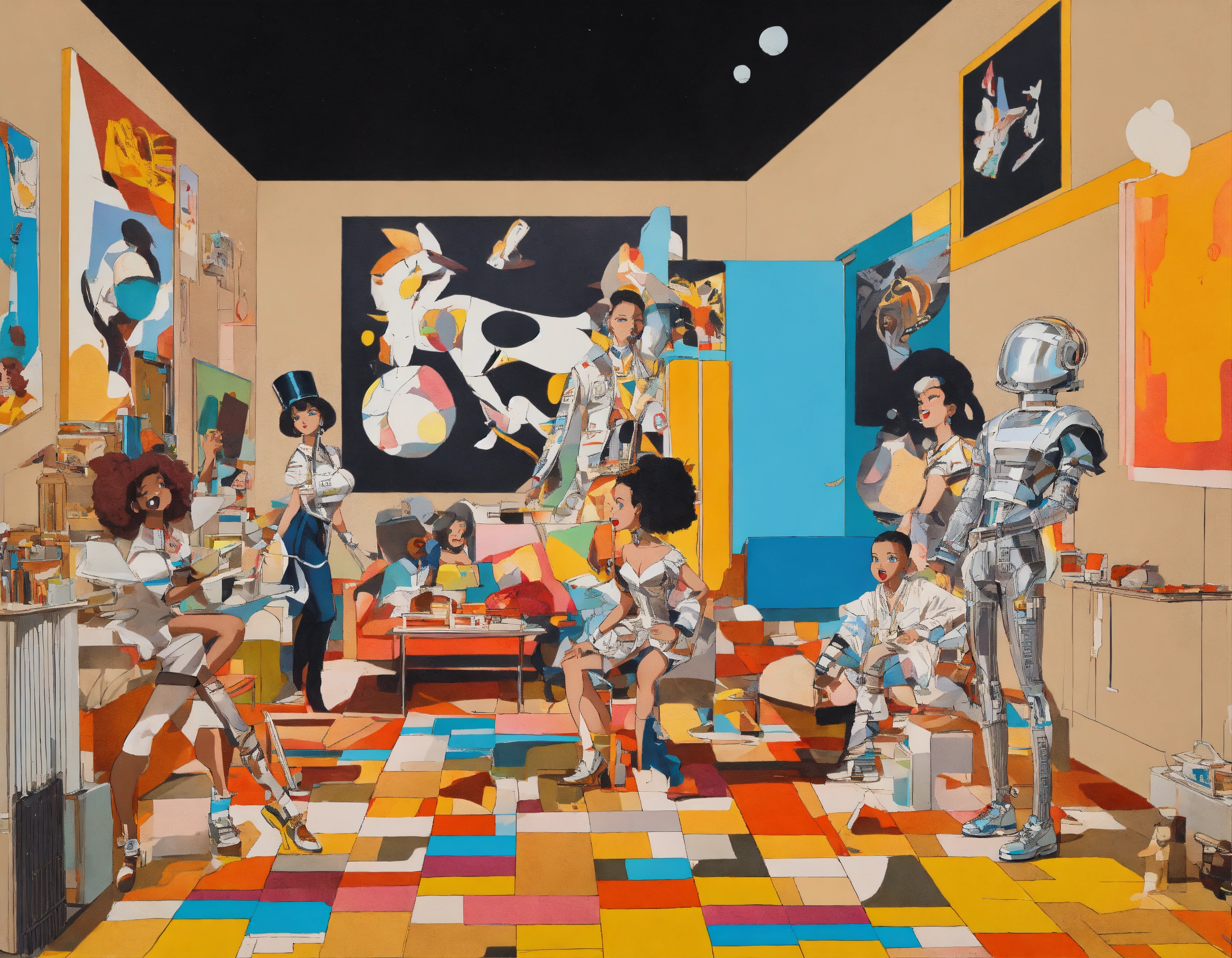 Stellated ((cartooned)) fine artwork in frame, canvas lettering|bodies surreal amalgamation of limbs, dynamic dancing flow, drawing masterpiece, illustration of black jetsons, boondocks, dream model chola american, pinup, neutral structure and metallic-sheen, cartoon futuristic, (french), twins photo of mixed and matched outfits, minimalism collaged selects, nigo human made, isolated-white-cubic space creole, slate beige grey, ink|smoke, surprise highlights, monochrome, sfmoma, hyperspective retro playboy toon