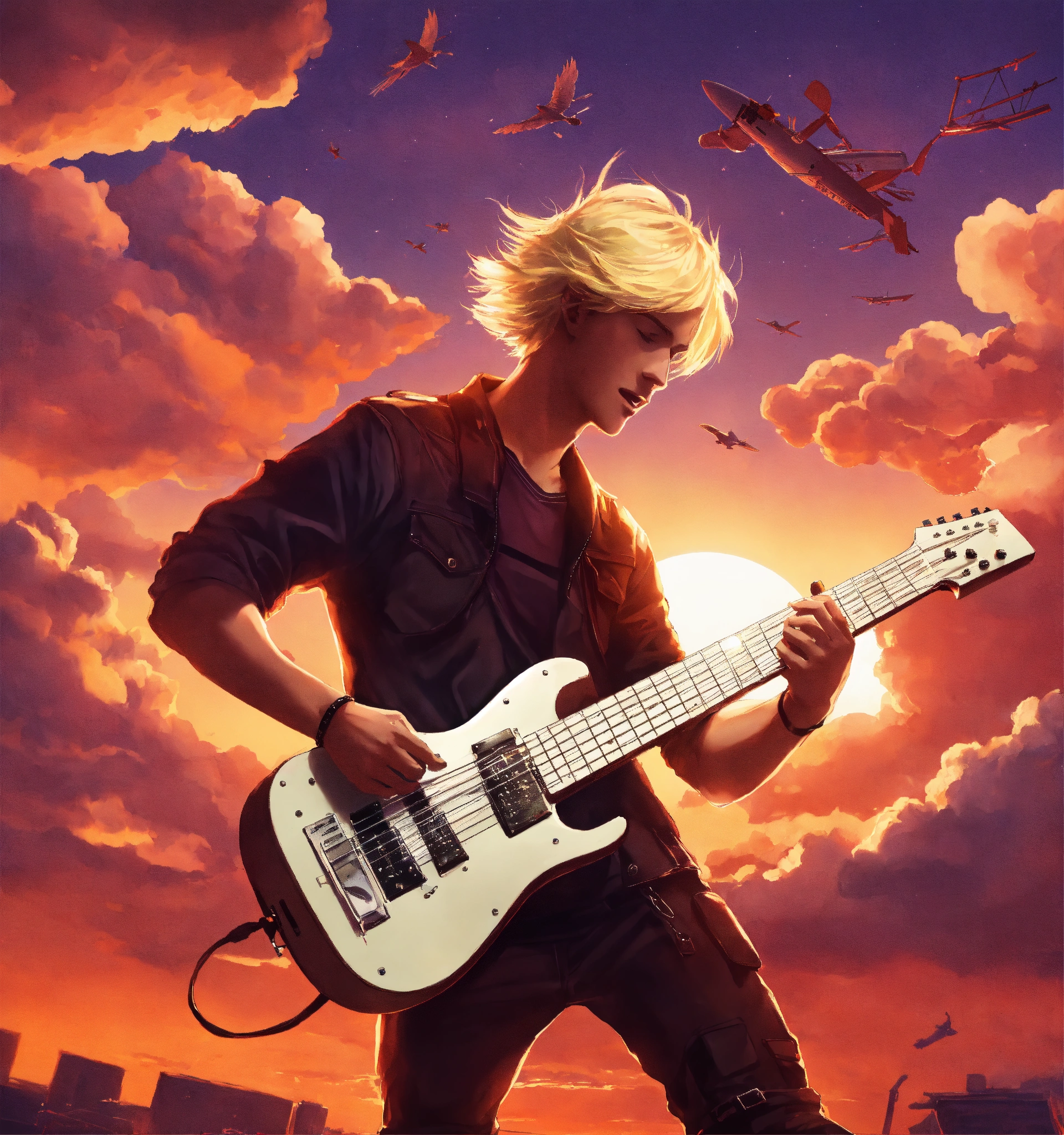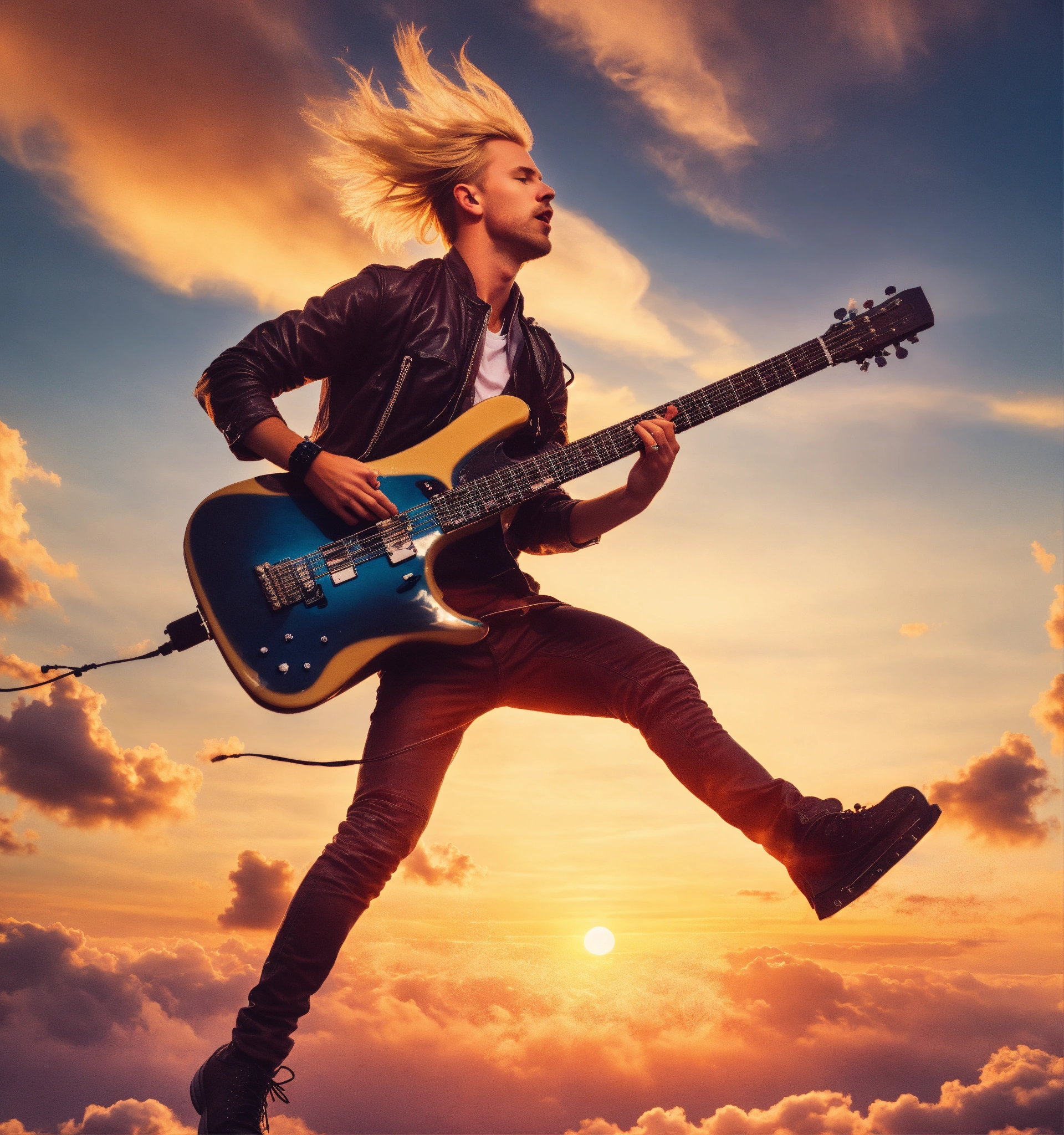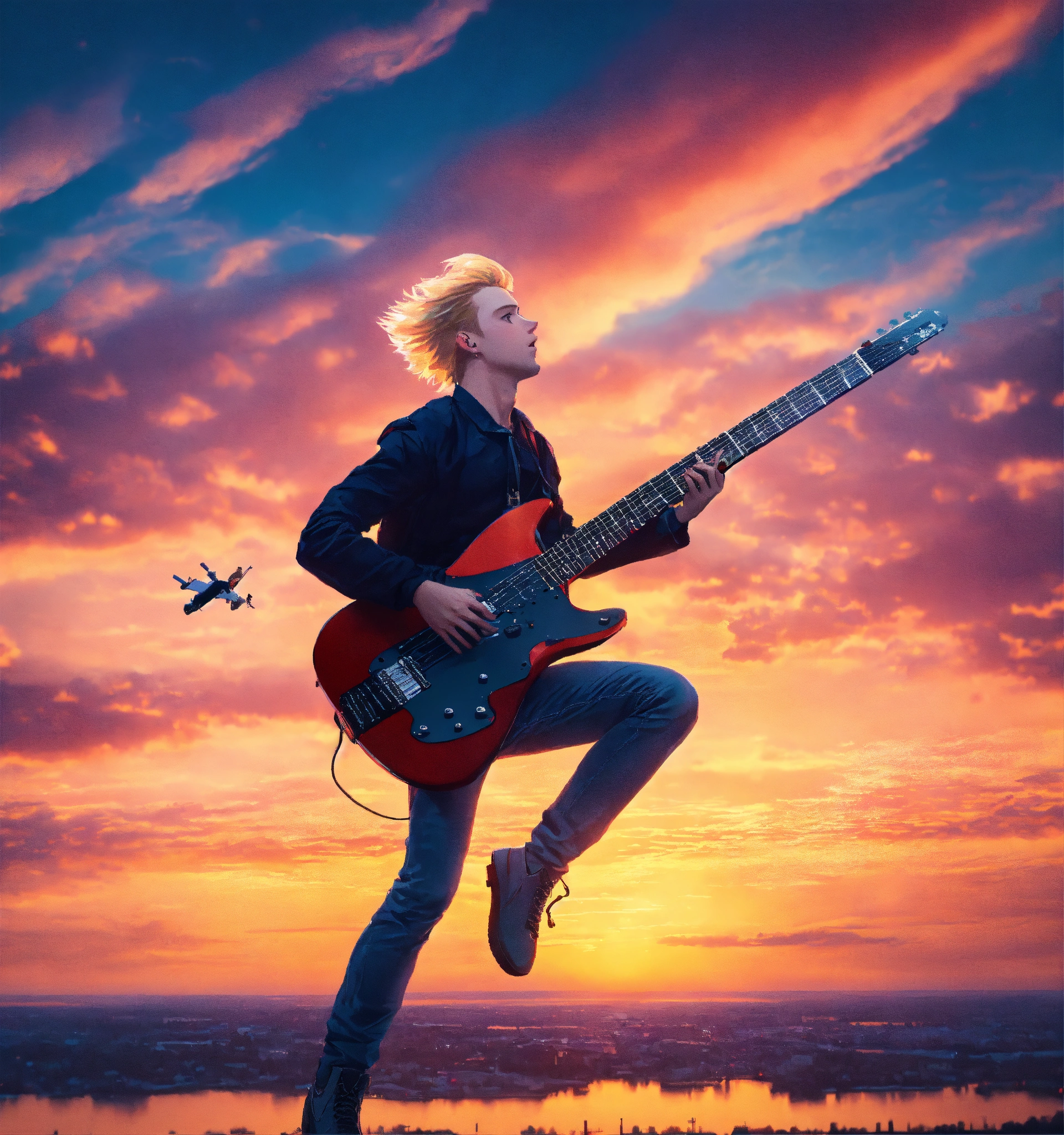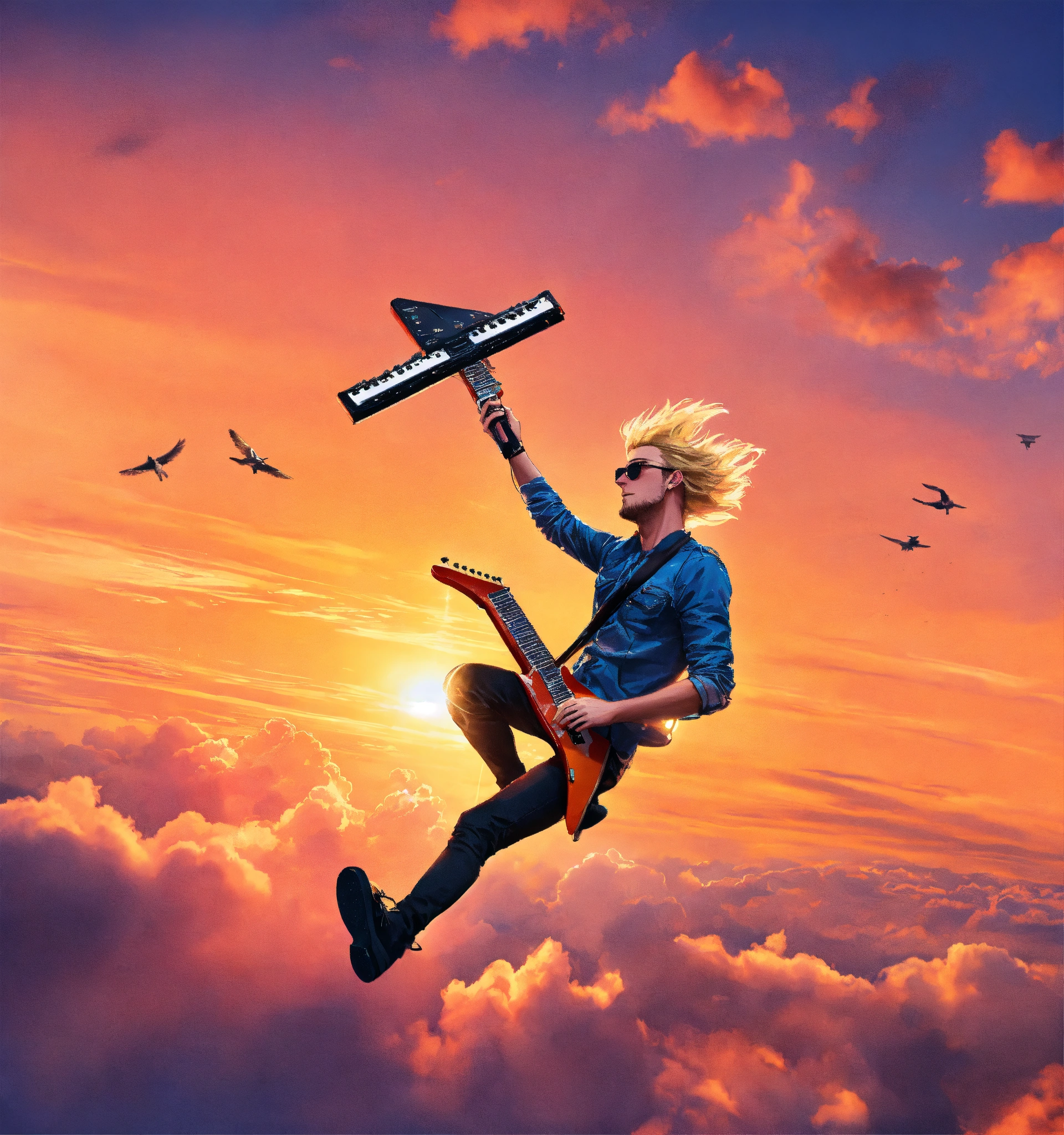 A blond estonian guy playing a keytar and a guitar while flying through the sky at sunset