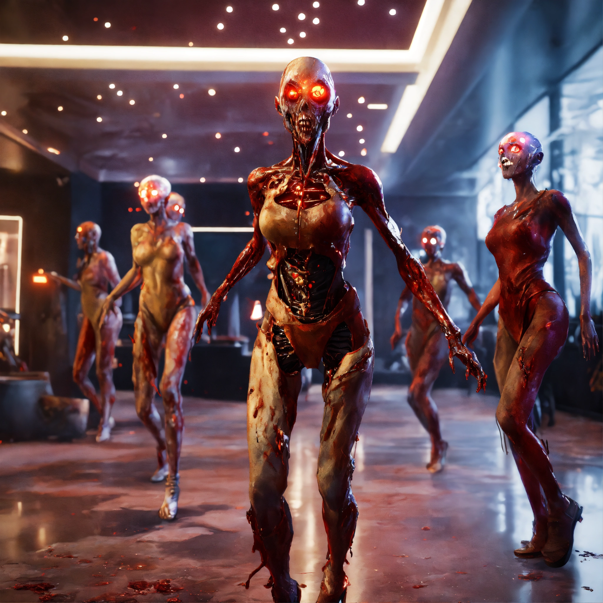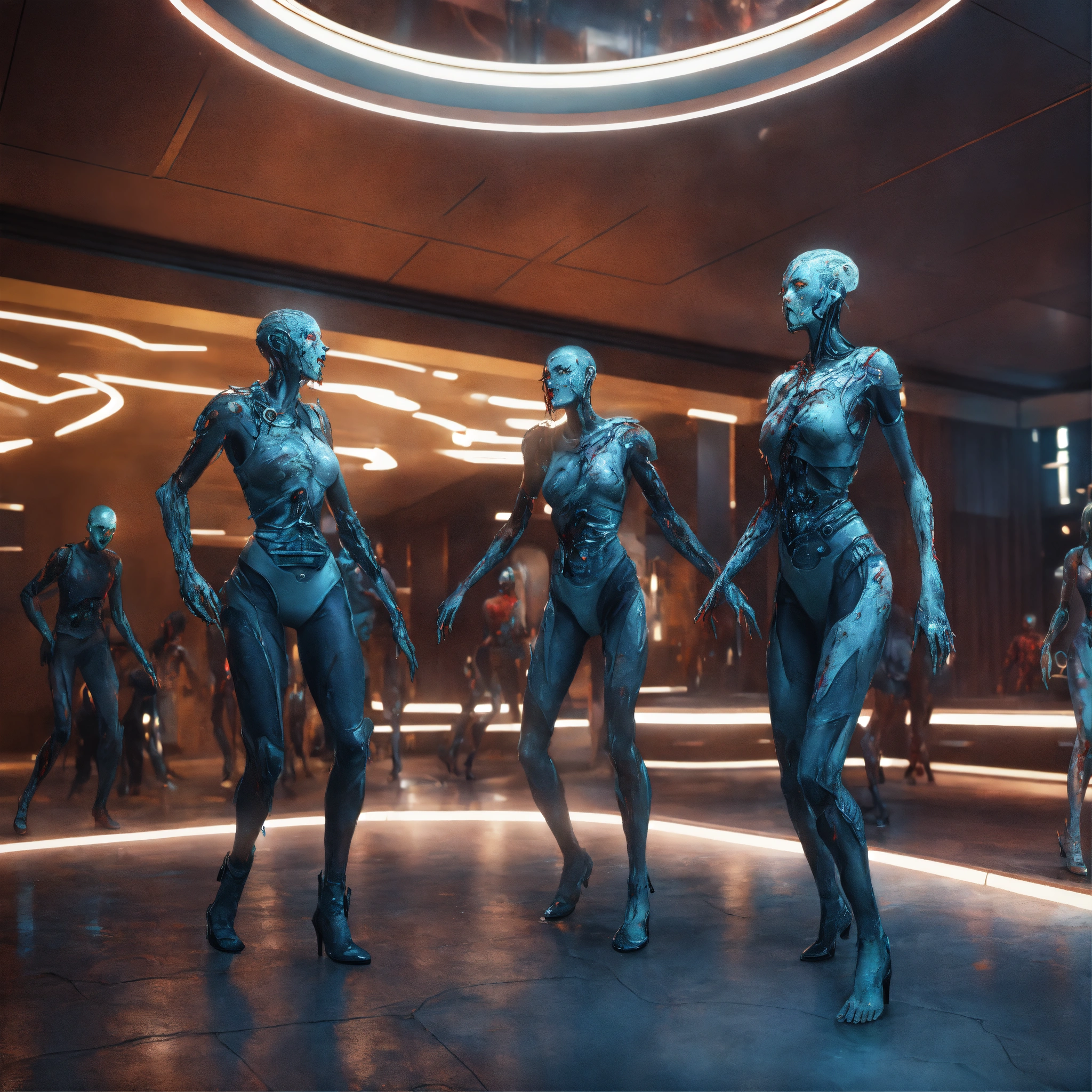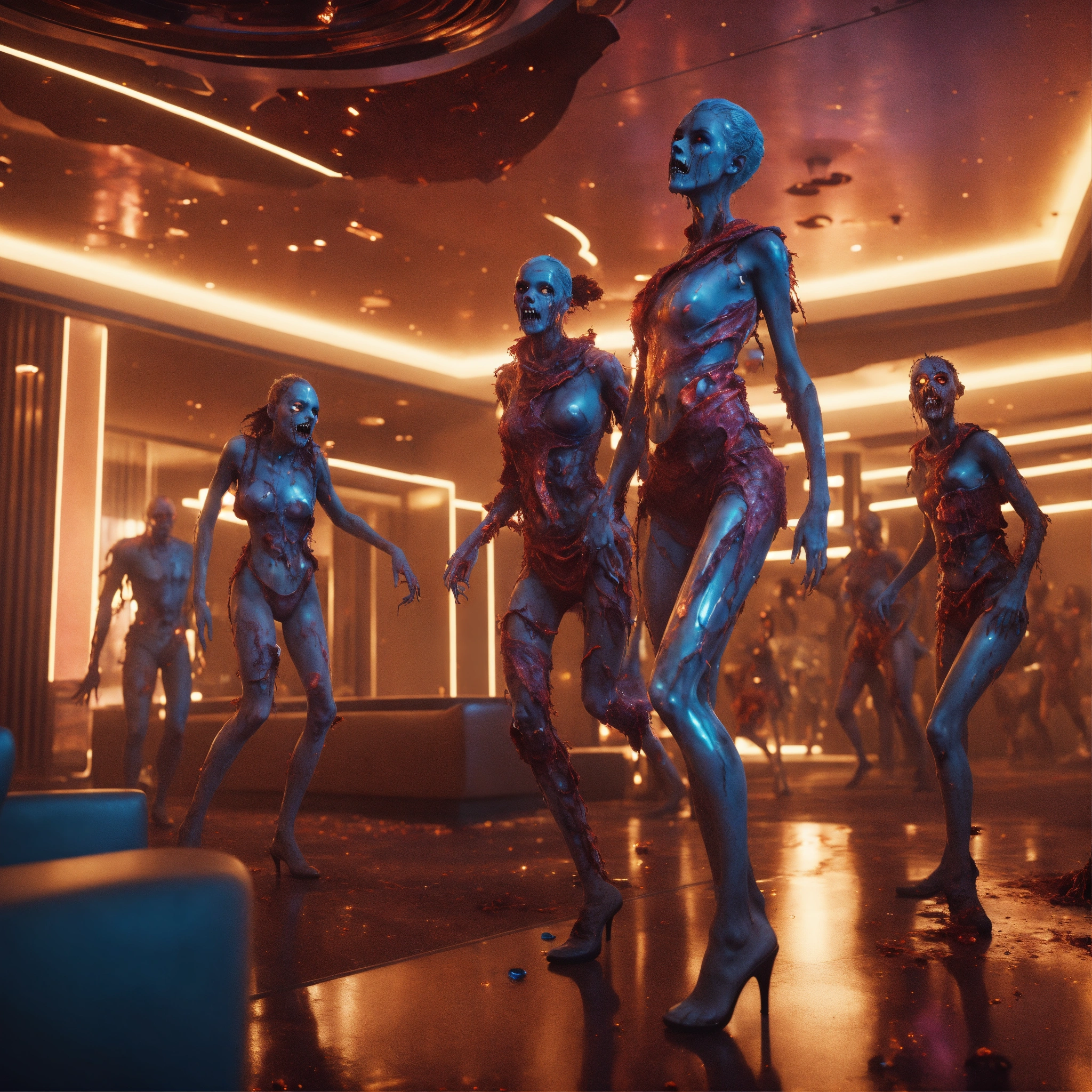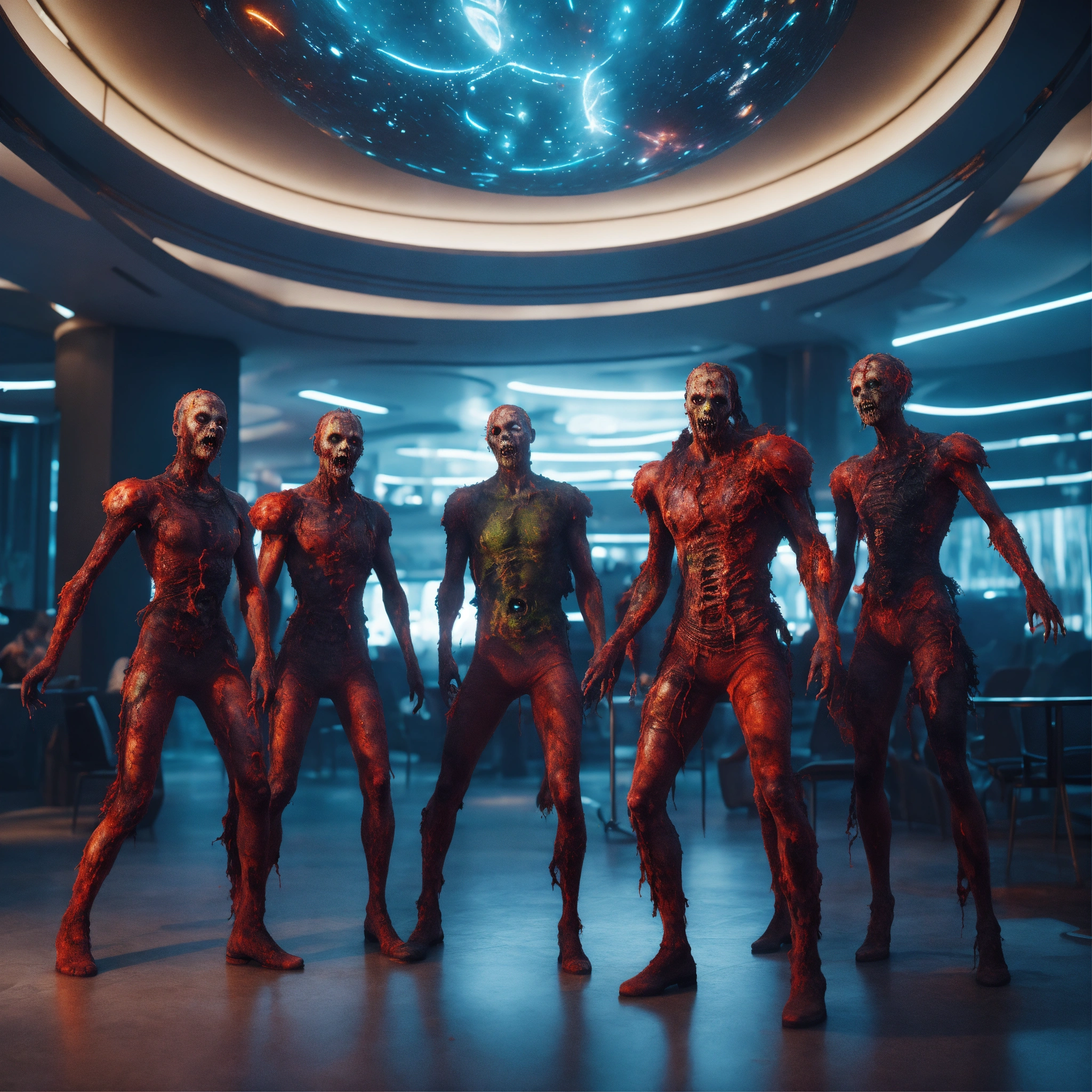 Group of humanoid zombies with rotting flesh wearing ripped futuristic space clothes dancing in a luxurious space port hotel reception area, realistic, futuristic, sci-fi, 8k, unreal engine, pixar, disney, zaha hadid