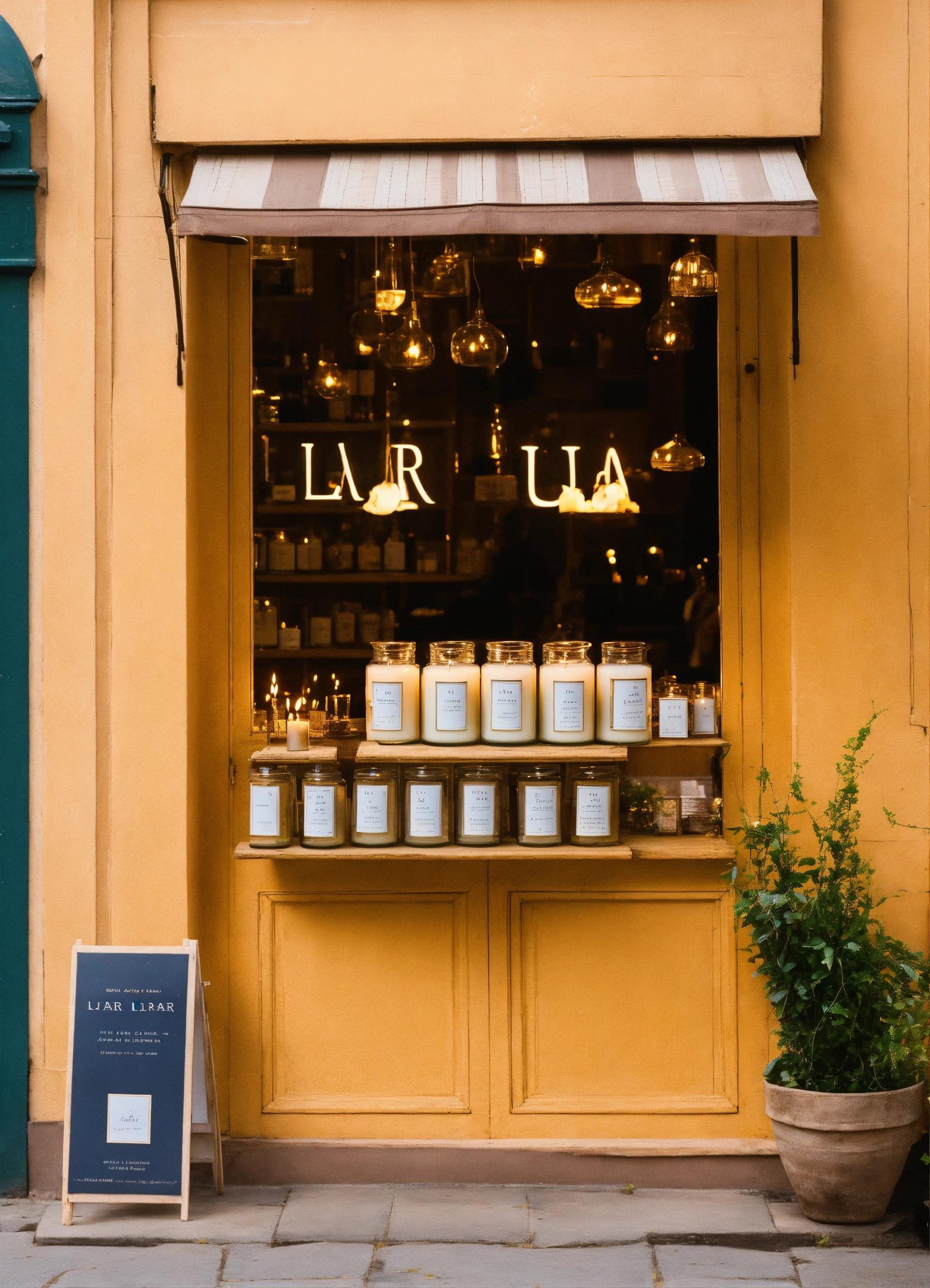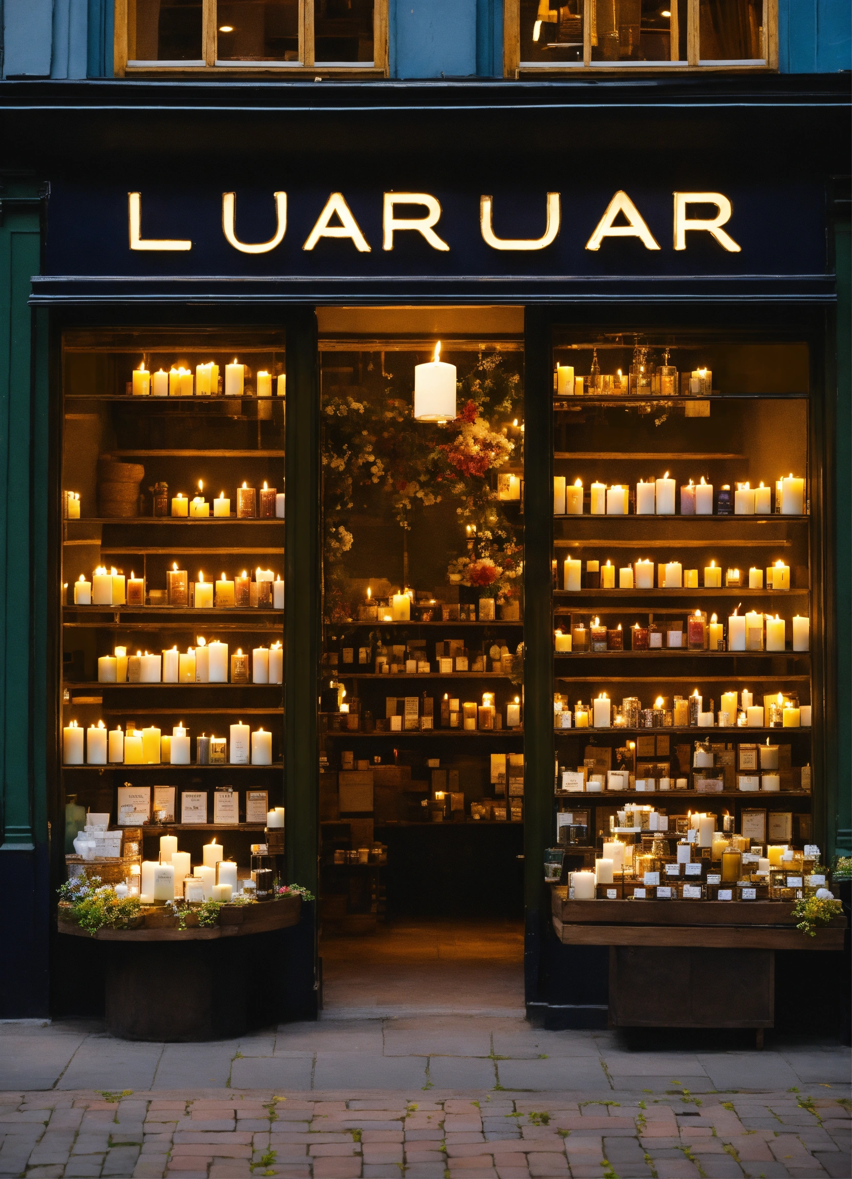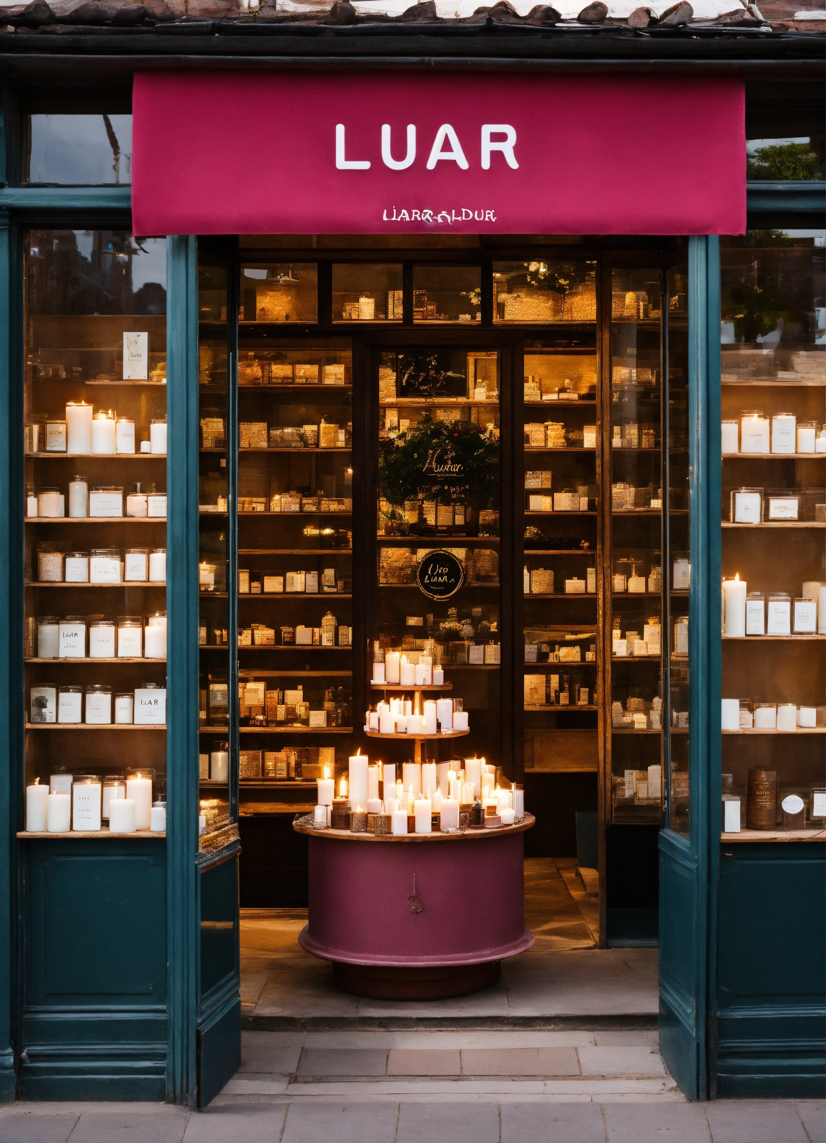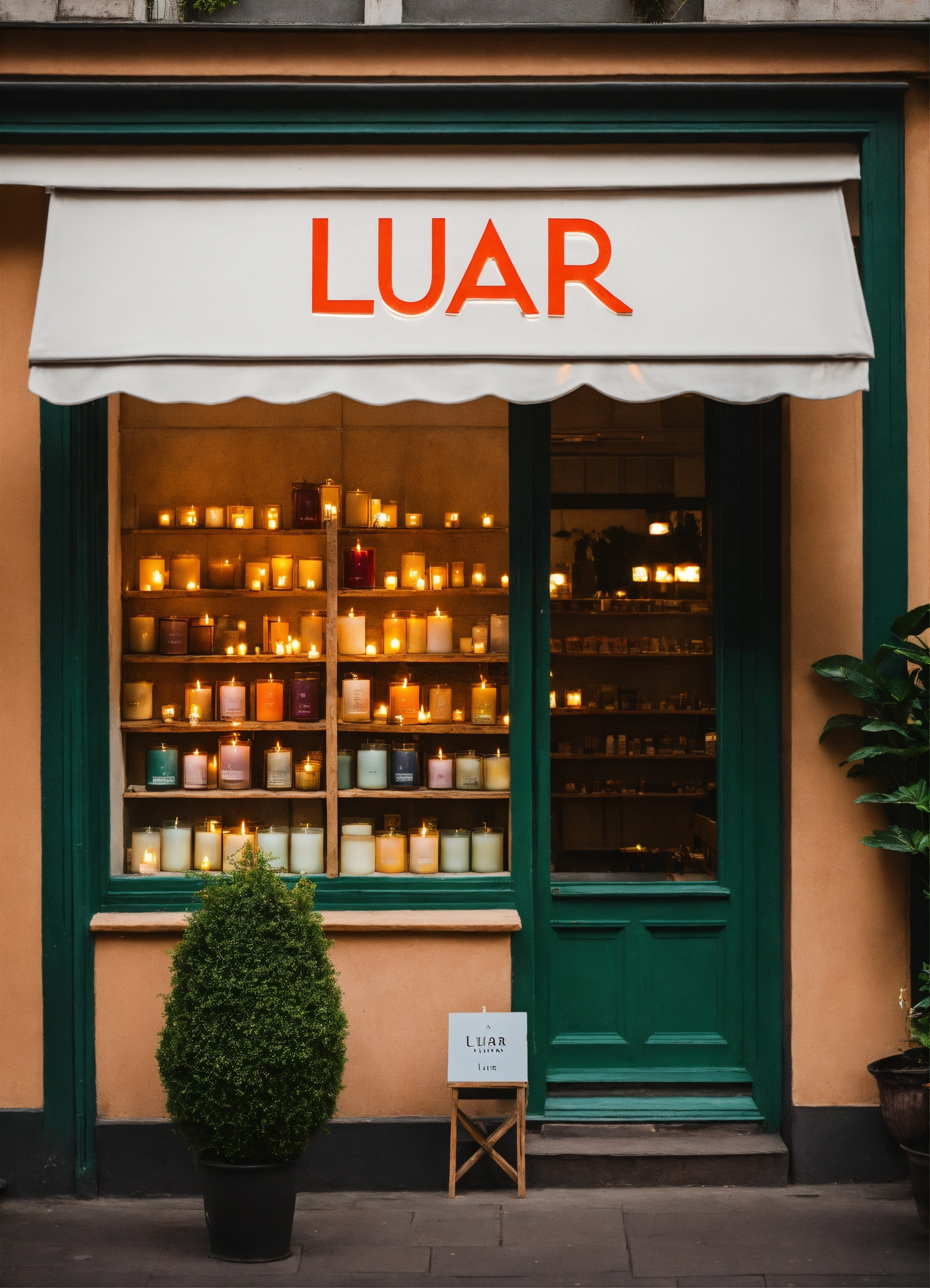 A scented candle shop front with several scented candle types and sizes, the name of the shop is "luar"