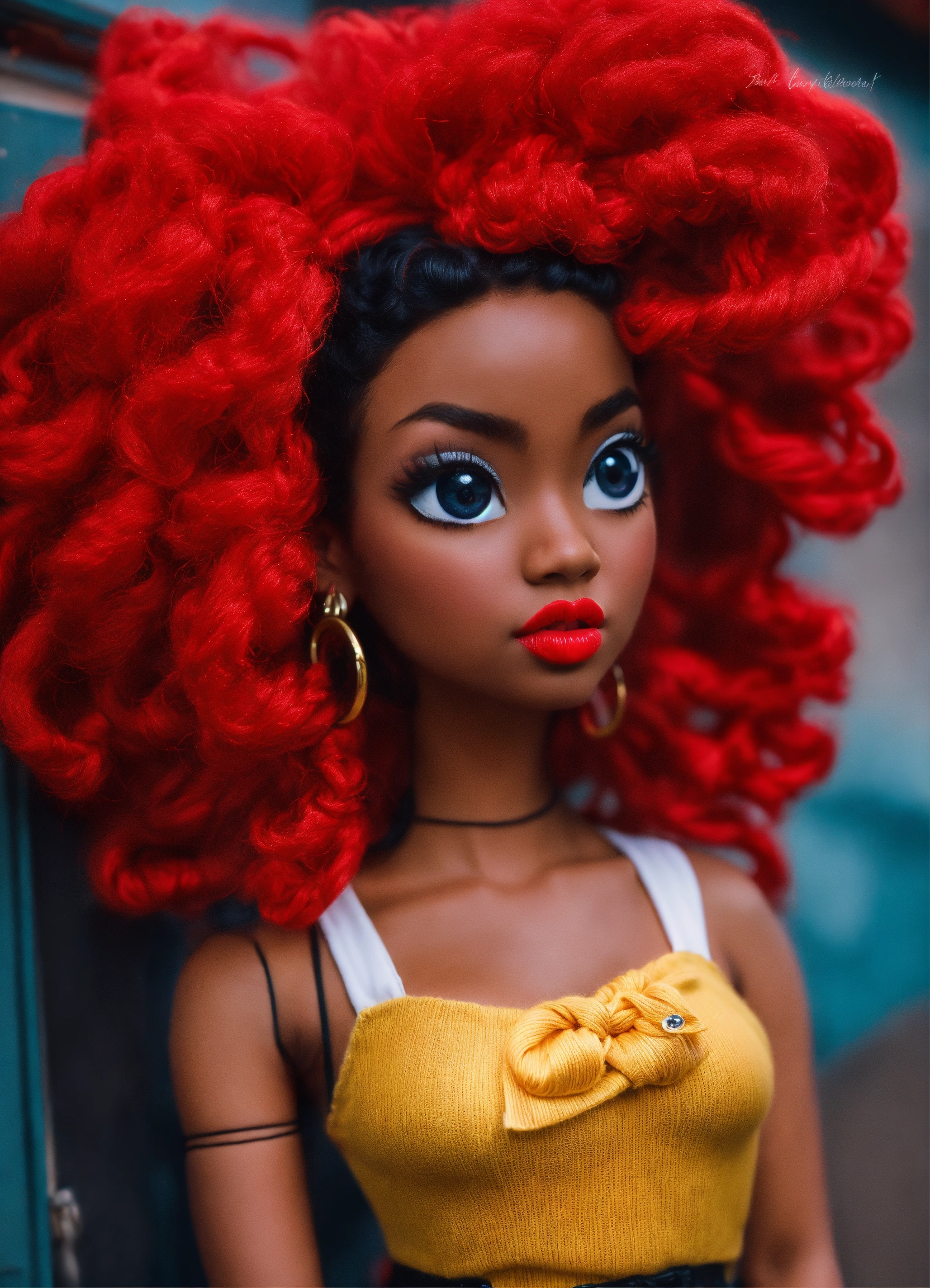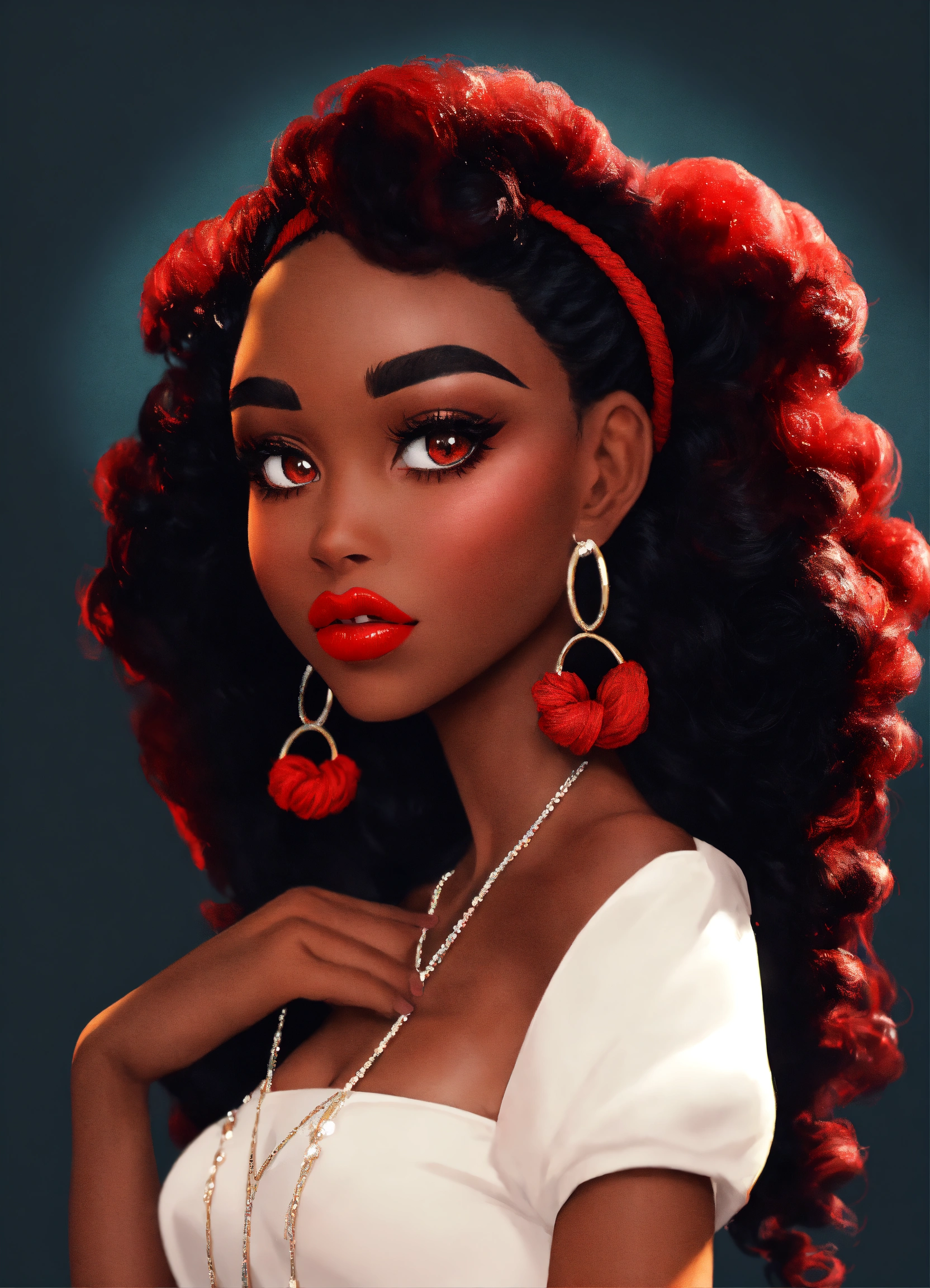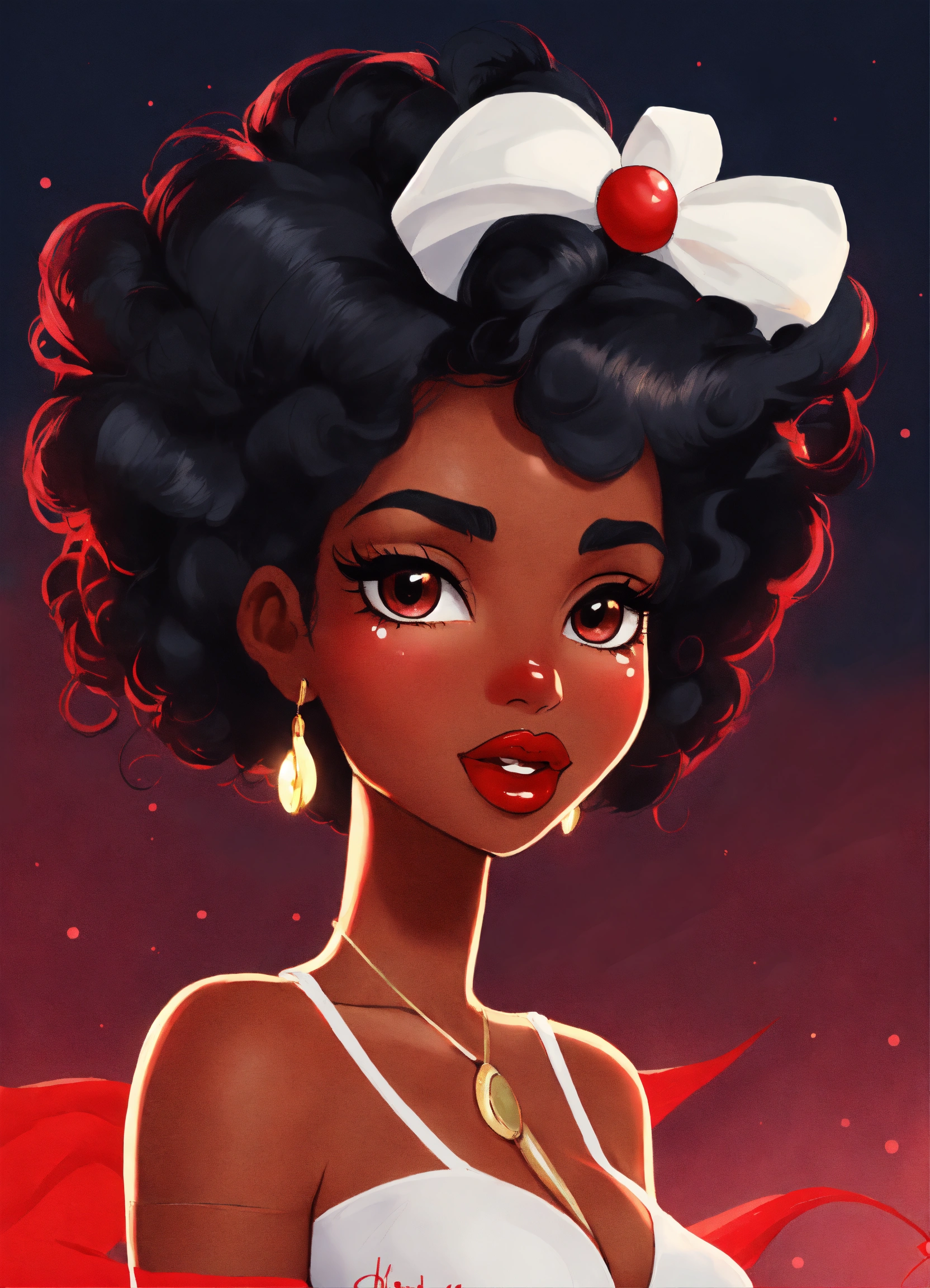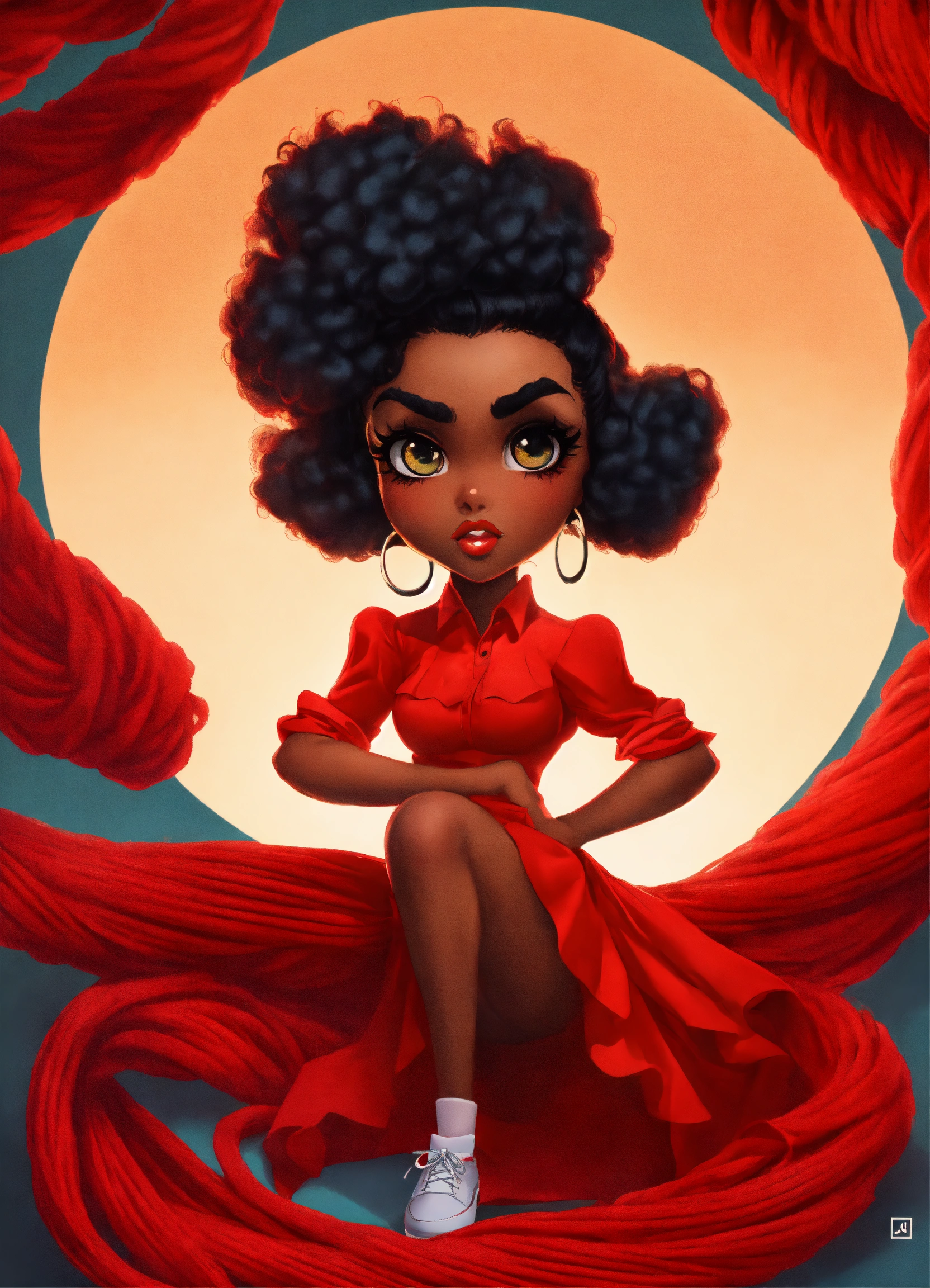 Create a stern powerpuff girl meets betty boop inspired black female character in white with oversized red flowing yarn hair and big gorgeous eyes, retro 1940’s anime